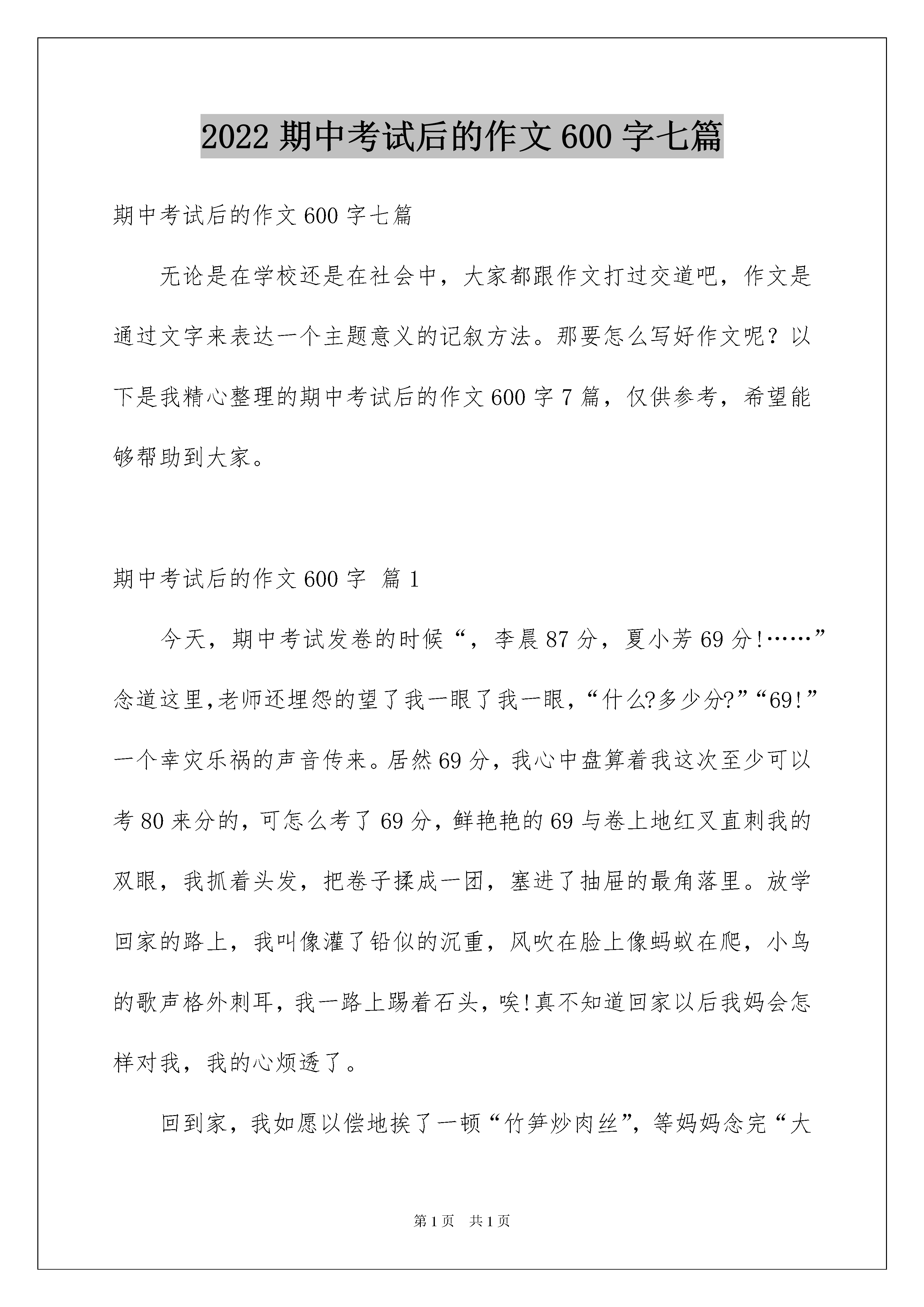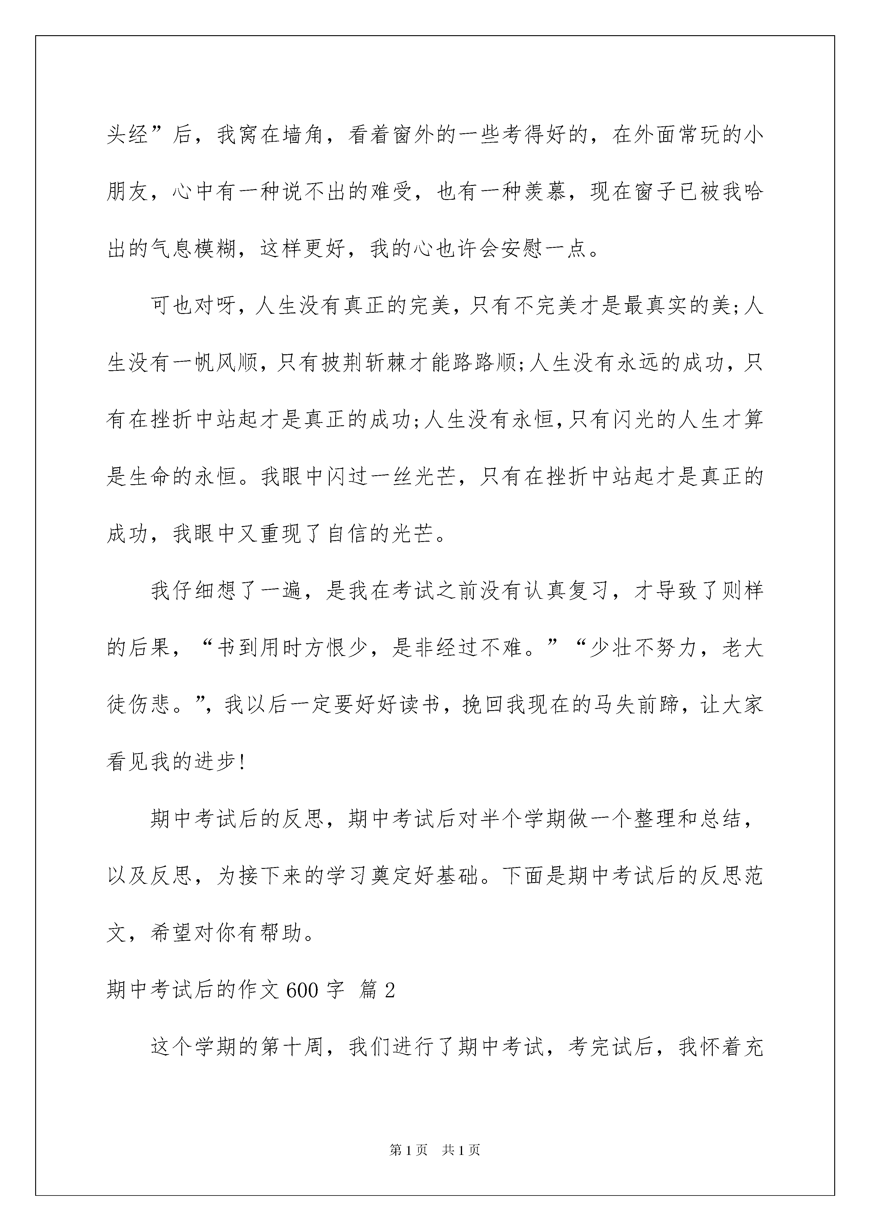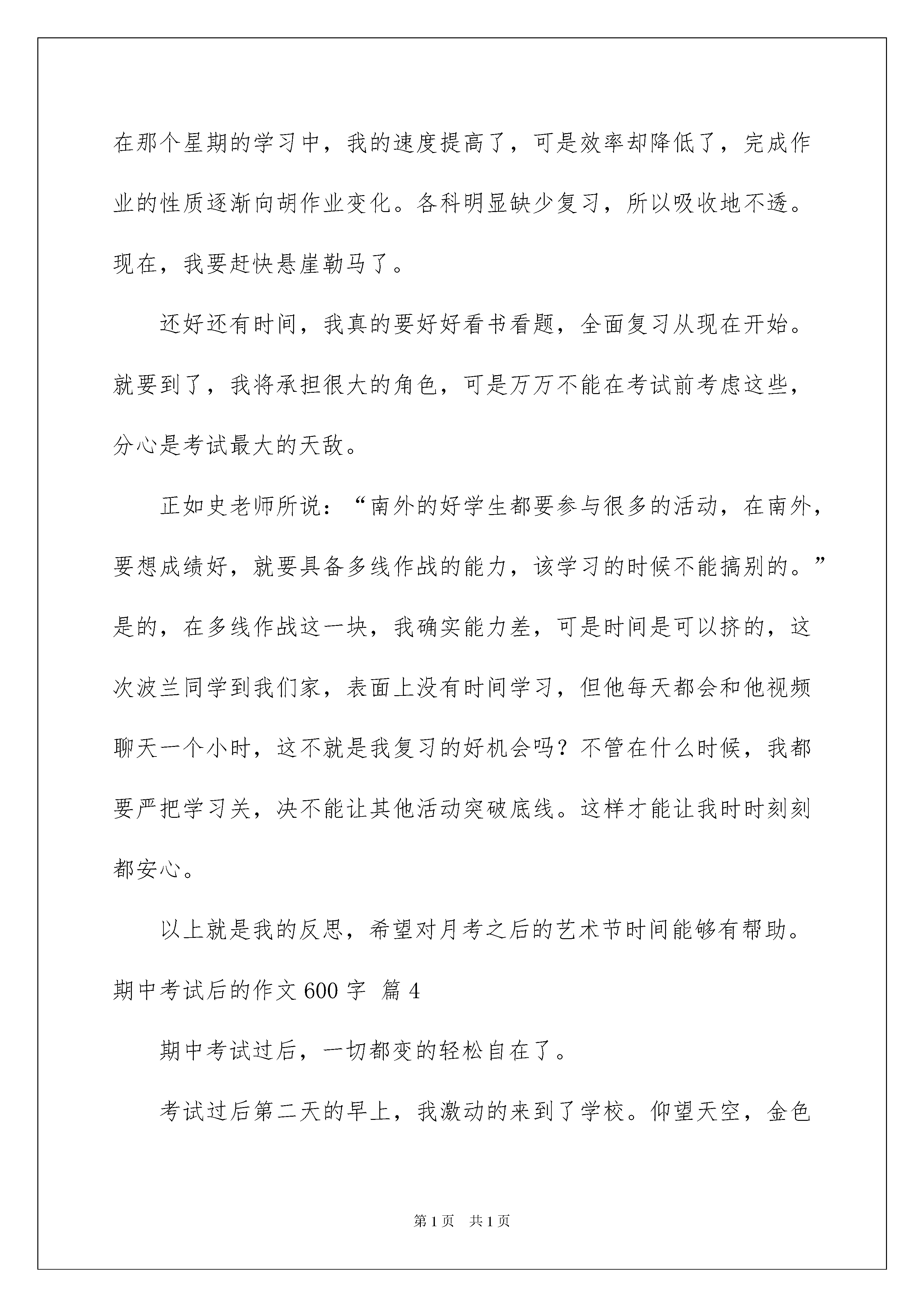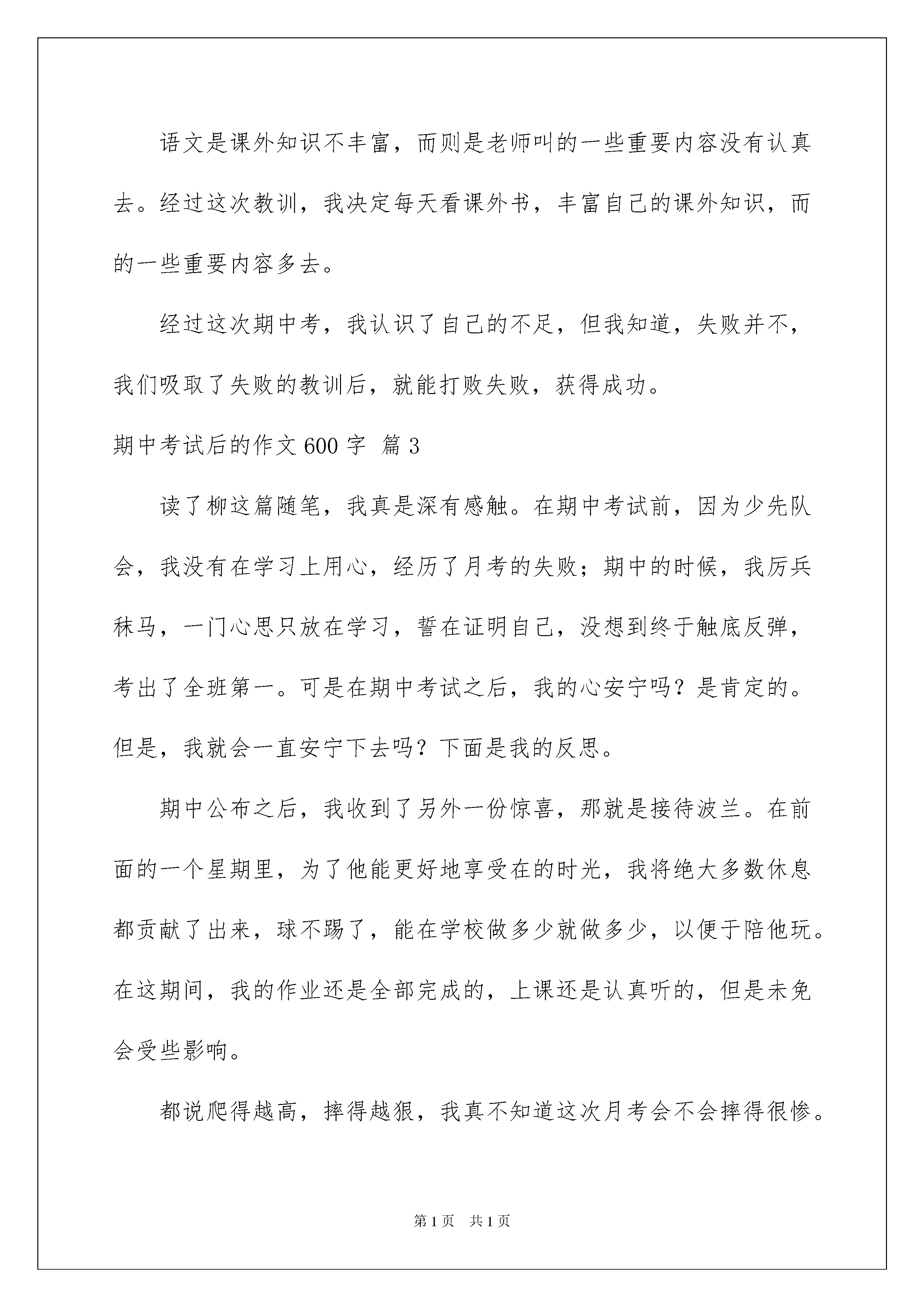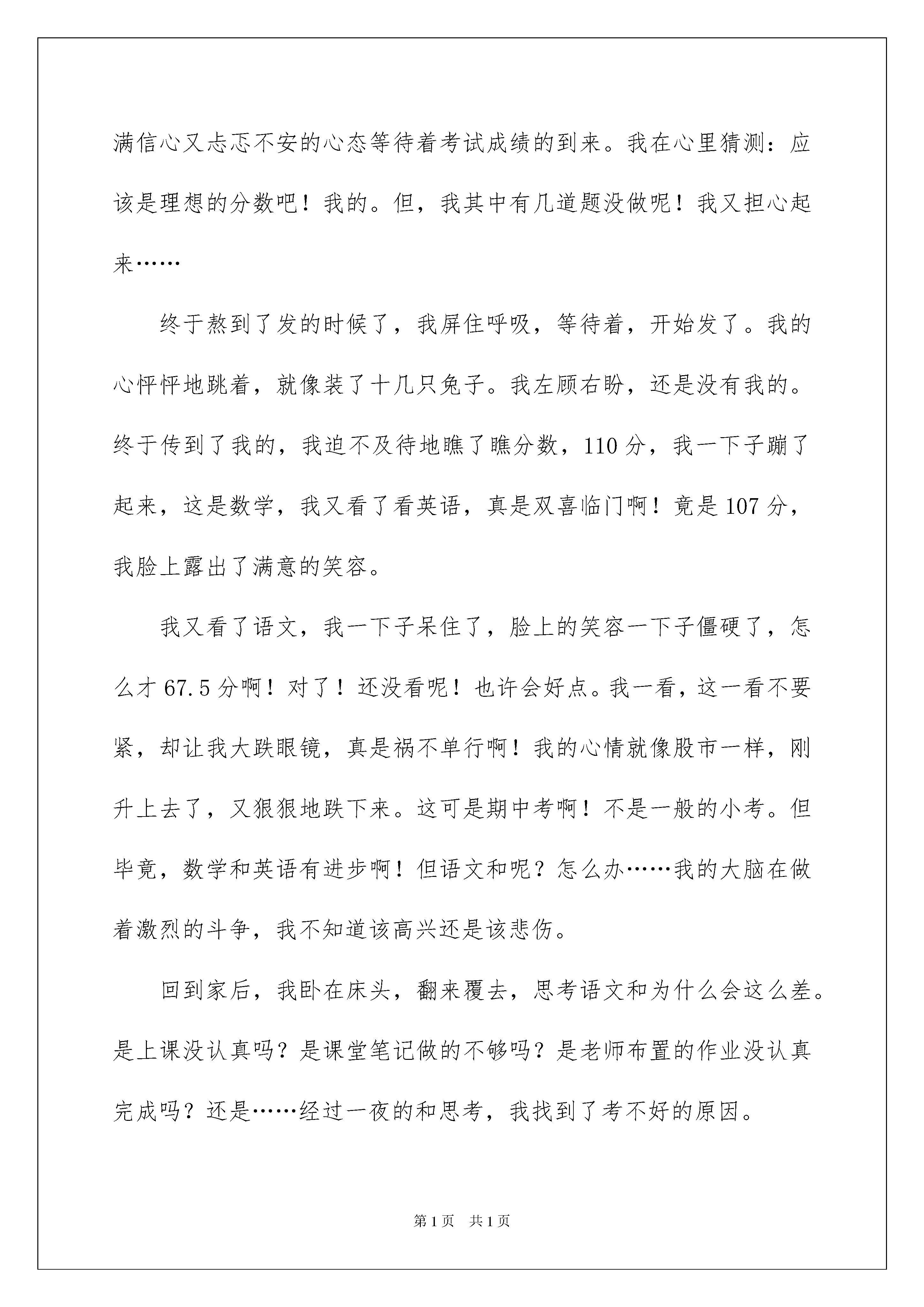 2022期中考试后的作文600字七篇期中考试后的作文600字七篇无论是在学校还是在社会中,大家都跟作文打过交道吧,作文是通过文字来表达一个主题意义的记叙方法。那要怎么写好作文呢?以下是我精心整理的期中考试后的作文600字7篇,仅供参考,希望能够帮助到大家。期中考试后的作文600字篇1今天,期中考试发卷的时候“,李晨87分,夏小芳69分!……”念道这里,老师还埋怨的望了我一眼了我一眼,“什么?多少分?”“69!”一个幸灾乐祸的声音传来。居然69分,我心中盘算着我这次至少可以考80来分的,可怎么考了69分,鲜艳艳的69与卷上地红叉直刺我的双眼,我抓着头发,把卷子揉成一团,塞进了抽屉的最角落里。放学回家的路上,我叫像灌了铅似的沉重,风吹在脸上像蚂蚁在爬,小鸟的歌声格外刺耳,我一路上踢着石头,唉!真不知道回家以后我妈会怎样对我,我的心烦透了。回到家,我如愿以偿地挨了一顿“竹笋炒肉丝”,等妈妈念完“大头经”后,我窝在墙角,看着窗外的一些考得好的,在外面常玩的小朋友,心中有一种说不出的难受,也有一种羡慕,现在窗子已被我哈出的气息模糊,这样更好,我的心也许会安慰一点。可也对呀,人生没有真正的完美,只有不完美才是最真实的美;人生没有一帆风顺,只有披荆斩棘才能路路顺;人生没有永远的成功,只有在挫折中站起才是真正的成功;人生没有永恒,只有闪光的人生才算是生命的永恒。我眼中闪过一丝光芒,只有在挫折中站起才是真正的成功,我眼中又重现了自信的光芒。我仔细想了一遍,是我在考试之前没有认真复习,才导致了则样的后果,“书到用时方恨少,是非经过不难。”“少壮不努力,老大徒伤悲。”,我以后一定要好好读书,挽回我现在的马失前蹄,让大家看见我的进步!期中考试后的反思,期中考试后对半个学期做一个整理和总结,以及反思,为接下来的学习奠定好基础。下面是期中考试后的反思范文,希望对你有帮助。期中考试后的作文600字篇2这个学期的第十周,我们进行了期中考试,考完试后,我怀着充满信心又忐忑不安的心态等待着考试成绩的到来。我在心里猜测:应该是理想的分数吧!我的。但,我其中有几道题没做呢!我又担心起来……终于熬到了发的时候了,我屏住呼吸,等待着,开始发了。我的心怦怦地跳着,就像装了十几只兔子。我左顾右盼,还是没有我的。终于传到了我的,我迫不及待地瞧了瞧分数,110分,我一下子蹦了起来,这是数学,我又看了看英语,真是双喜临门啊!竟是107分,我脸上露出了满意的笑容。我又看了语文,我一下子呆住了,脸上的笑容一下子僵硬了,怎么才67.5分啊!对了!还没看呢!也许会好点。我一看,这一看不要紧,却让我大跌眼镜,真是祸不单行啊!我的心情就像股市一样,刚升上去了,又狠狠地跌下来。这可是期中考啊!不是一般的小考。但毕竟,数学和英语有进步啊!但语文和呢?怎么办……我的大脑在做着激烈的斗争,我不知道该高兴还是该悲伤。回到家后,我卧在床头,翻来覆去,思考语文和为什么会这么差。是上课没认真吗?是课堂笔记做的不够吗?是老师布置的作业没认真完成吗?还是……经过一夜的和思考,我找到了考不好的原因。语文是课外知识不丰富,而则是老师叫的一些重要内容没有认真去。经过这次教训,我决定每天看课外书,丰富自己的课外知识,而的一些重要内容多去。经过这次期中考,我认识了自己的不足,但我知道,失败并不,我们吸取了失败的教训后,就能打败失败,获得成功。期中考试后的作文600字篇3读了柳这篇随笔,我真是深有感触。在期中考试前,因为少先队会,我没有在学习上用心,经历了月考的失败;期中的时候,我厉兵秣马,一门心思只放在学习,誓在证明自己,没想到终于触底反弹,考出了全班第一。可是在期中考试之后,我的心安宁吗?是肯定的。但是,我就会一直安宁下去吗?下面是我的反思。期中公布之后,我收到了另外一份惊喜,那就是接待波兰。在前面的一个星期里,为了他能更好地享受在的时光,我将绝大多数休息都贡献了出来,球不踢了,能在学校做多少就做多少,以便于陪他玩。在这期间,我的作业还是全部完成的,上课还是认真听的,但是未免会受些影响。都说爬得越高,摔得越狠,我真不知道这次月考会不会摔得很惨。在那个星期的学习中,我的速度提高了,可是效率却降低了,完成作业的性质逐渐向胡作业变化。各科明显缺少复习,所以吸收地不透。现在,我要赶快悬崖勒马了。还好还有时间,我真的要好好看书看题,全面复习从现在开始。就要到了,我将承担很大的角色,可是万万不能在考试前考虑这些,分心是考试最大的天敌。正如史老师所说:“南外的好学生都要参与很多的活动,在南外,要想成绩好,就要具备多线作战的能力,该学习的时候不能搞别的。”是的,在多线作战这一块,