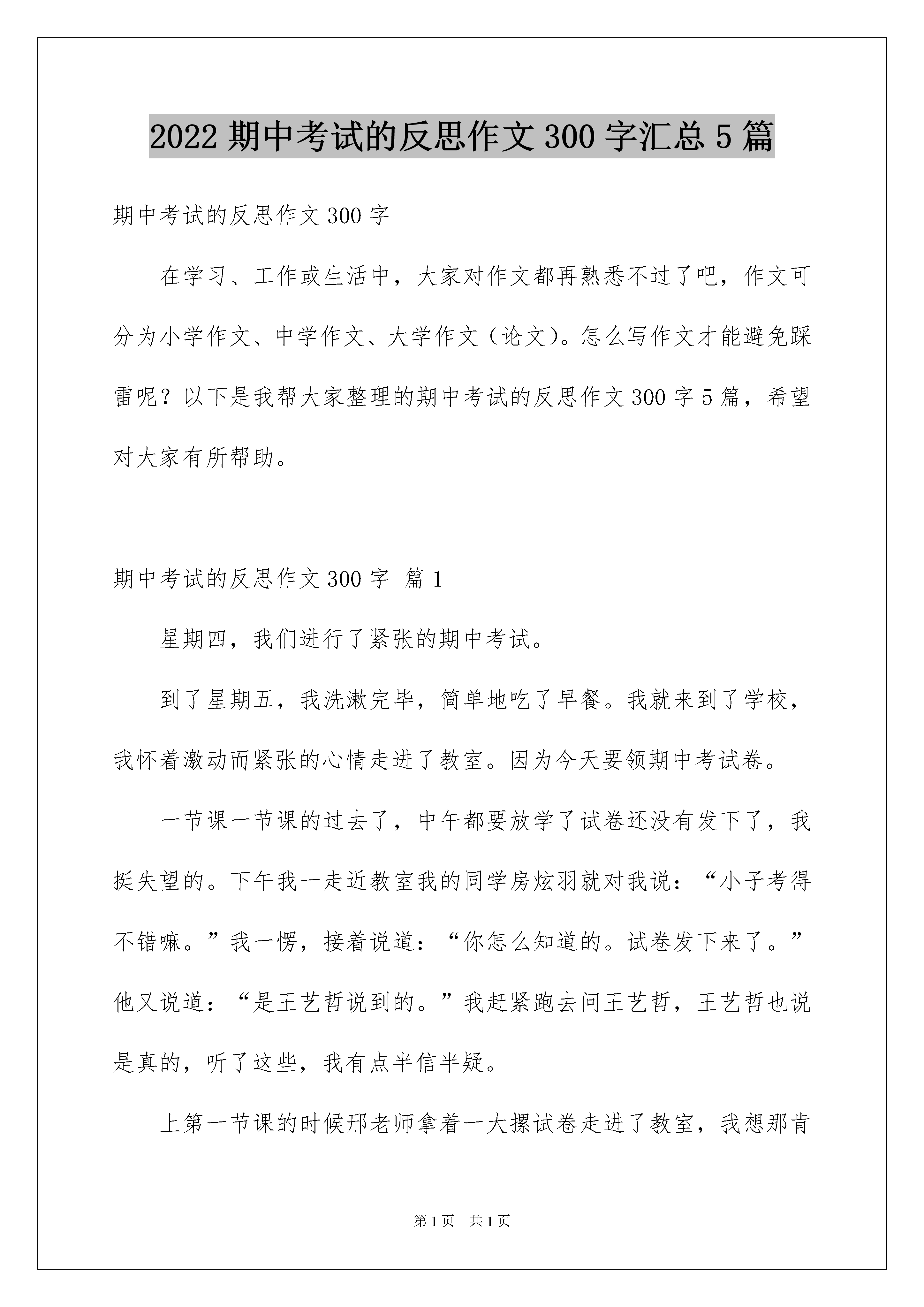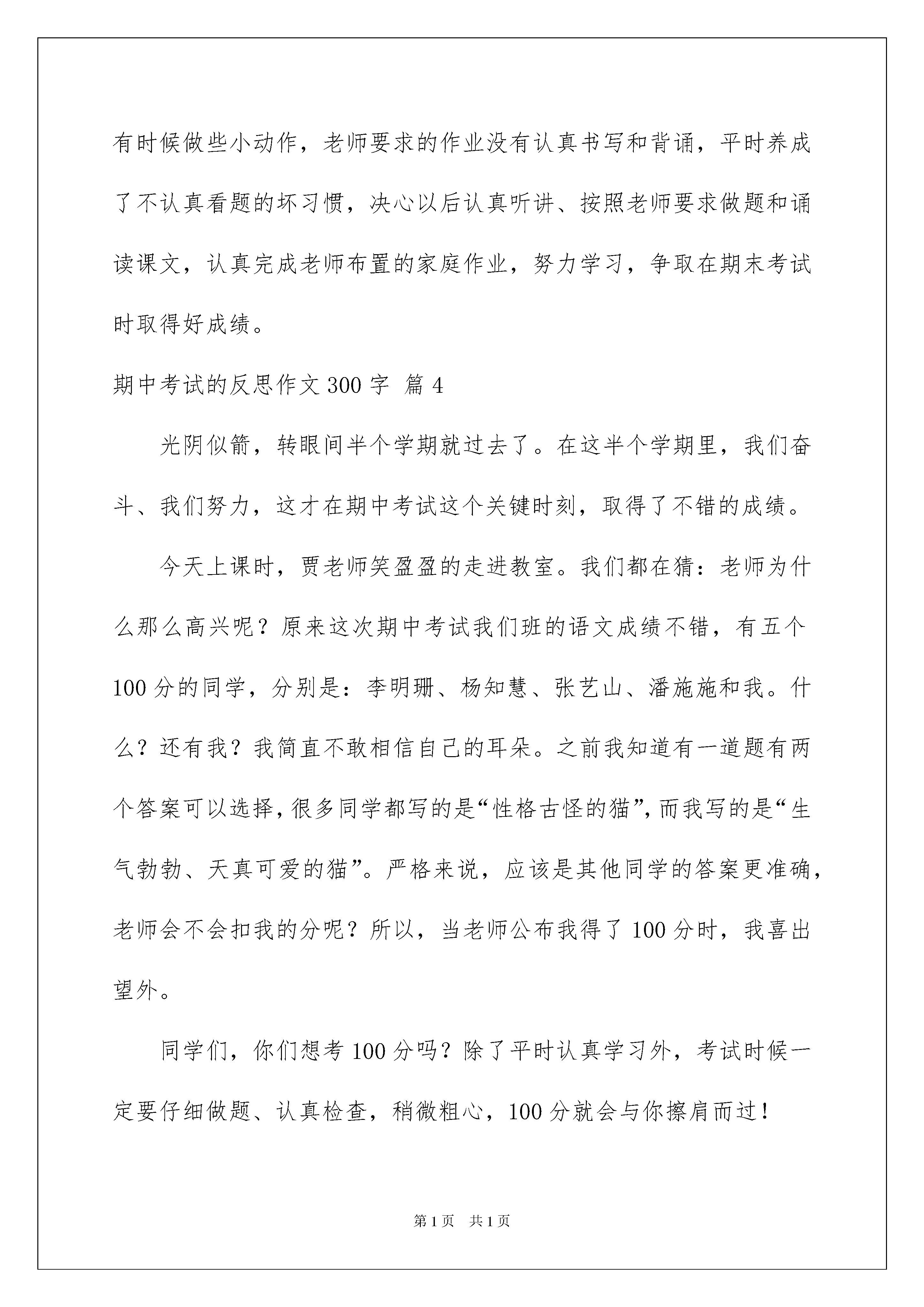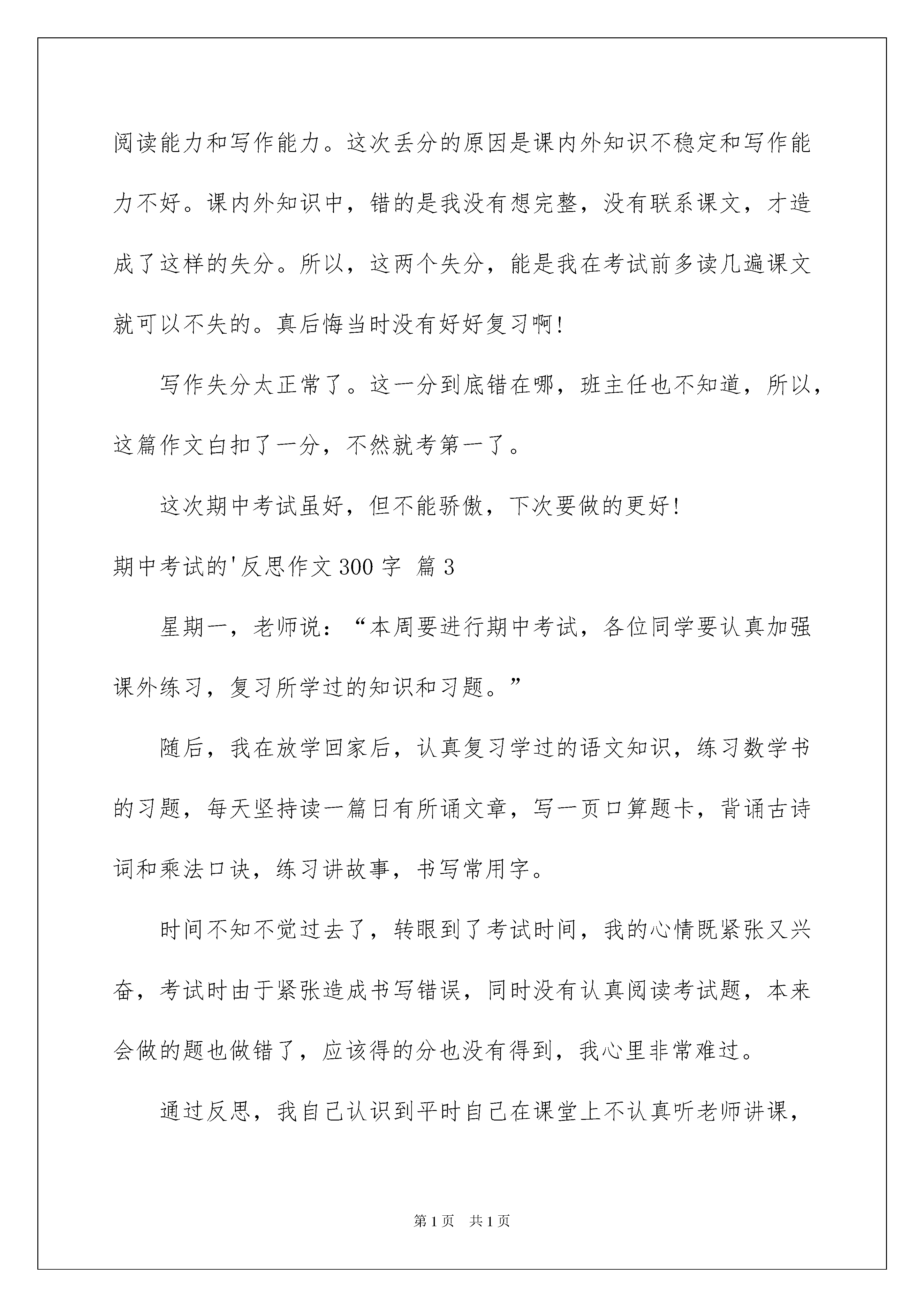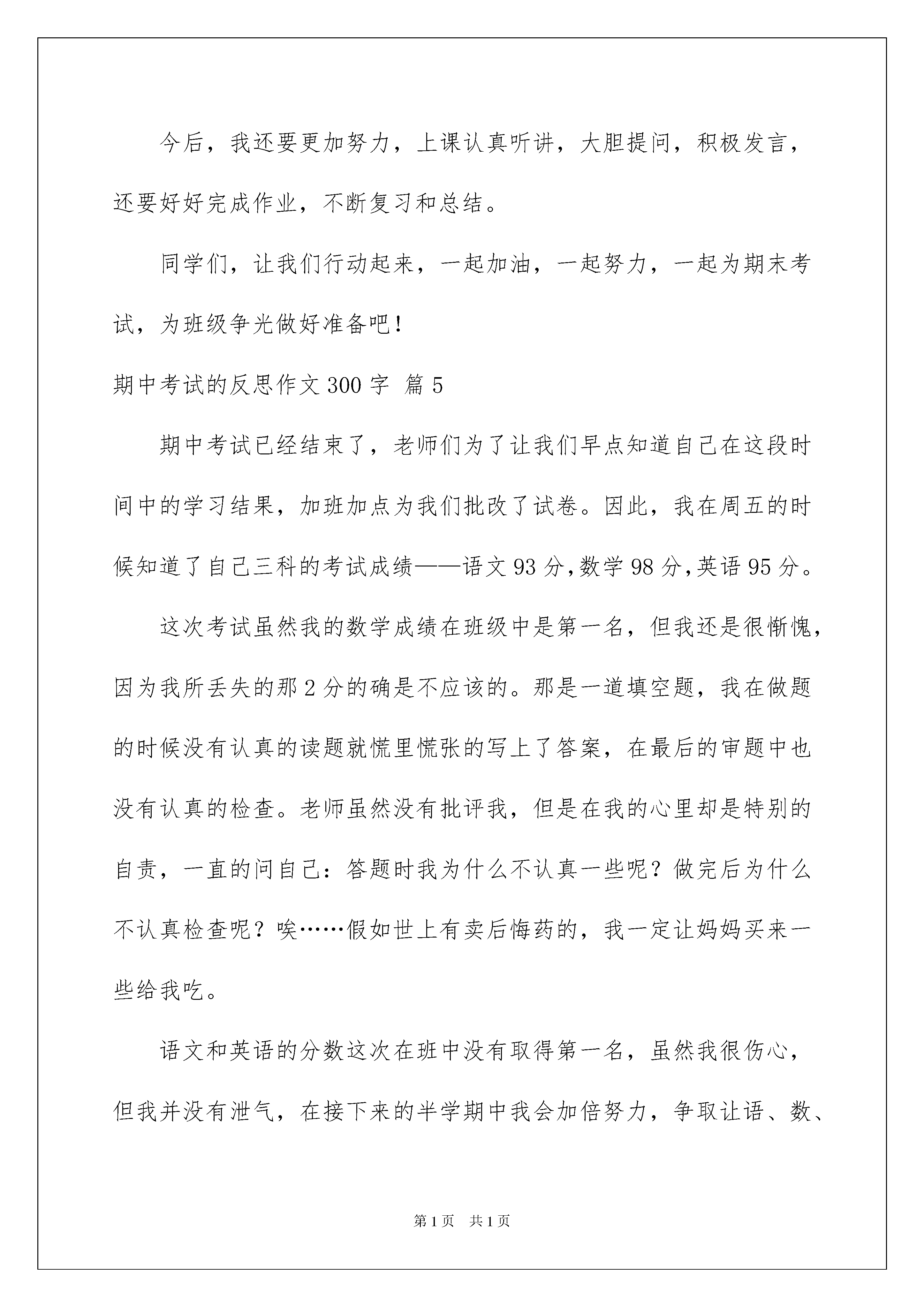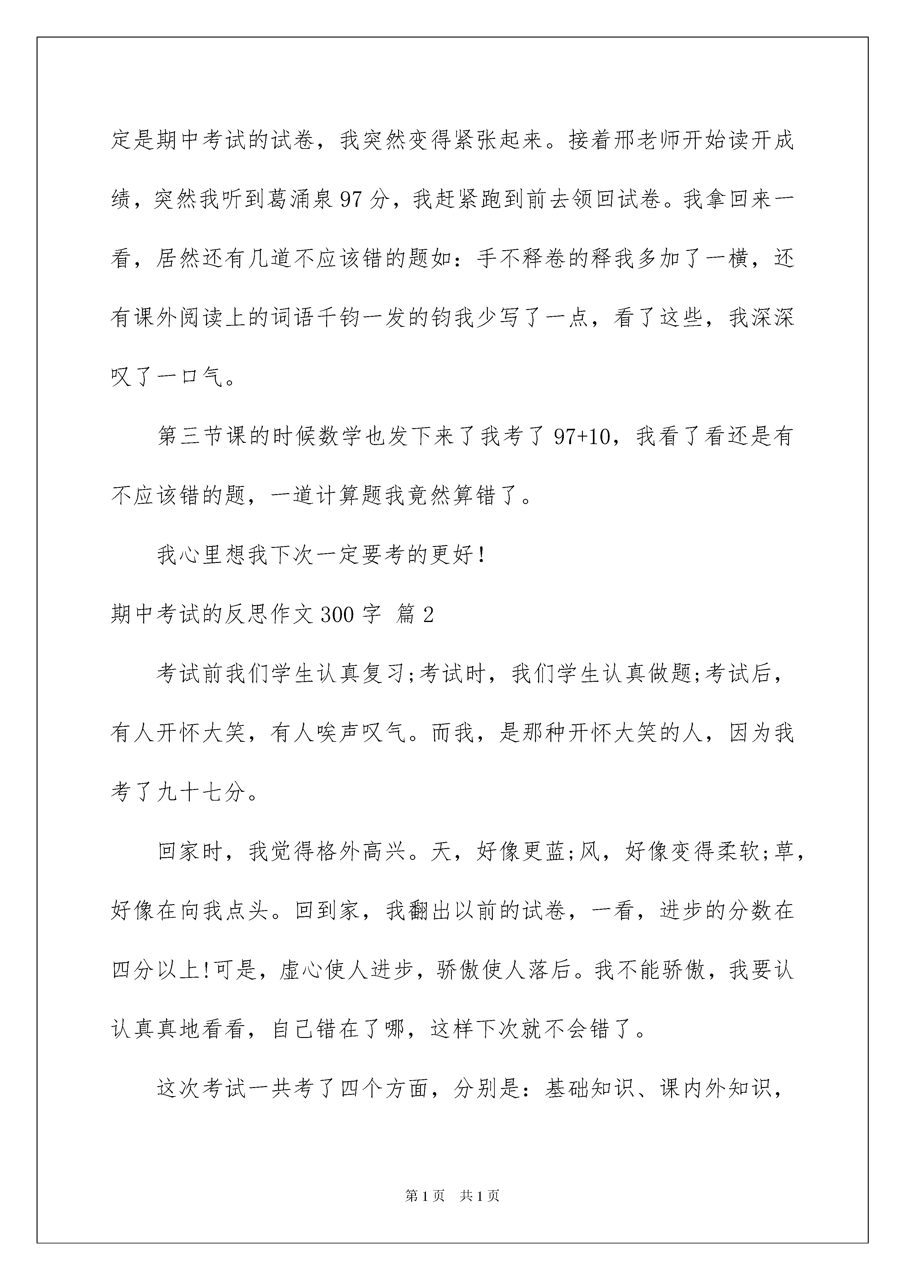 2022期中考试的反思作文300字汇总5篇期中考试的反思作文300字在学习、工作或生活中,大家对作文都再熟悉不过了吧,作文可分为小学作文、中学作文、大学作文(论文)。怎么写作文才能避免踩雷呢?以下是我帮大家整理的期中考试的反思作文300字5篇,希望对大家有所帮助。期中考试的反思作文300字篇1星期四,我们进行了紧张的期中考试。到了星期五,我洗漱完毕,简单地吃了早餐。我就来到了学校,我怀着激动而紧张的心情走进了教室。因为今天要领期中考试卷。一节课一节课的过去了,中午都要放学了试卷还没有发下了,我挺失望的。下午我一走近教室我的同学房炫羽就对我说:“小子考得不错嘛。”我一愣,接着说道:“你怎么知道的。试卷发下来了。”他又说道:“是王艺哲说到的。”我赶紧跑去问王艺哲,王艺哲也说是真的,听了这些,我有点半信半疑。上第一节课的时候邢老师拿着一大摞试卷走进了教室,我想那肯定是期中考试的试卷,我突然变得紧张起来。接着邢老师开始读开成绩,突然我听到葛涌泉97分,我赶紧跑到前去领回试卷。我拿回来一看,居然还有几道不应该错的题如:手不释卷的释我多加了一横,还有课外阅读上的词语千钧一发的钧我少写了一点,看了这些,我深深叹了一口气。第三节课的时候数学也发下来了我考了97+10,我看了看还是有不应该错的题,一道计算题我竟然算错了。我心里想我下次一定要考的更好!期中考试的反思作文300字篇2考试前我们学生认真复习;考试时,我们学生认真做题;考试后,有人开怀大笑,有人唉声叹气。而我,是那种开怀大笑的人,因为我考了九十七分。回家时,我觉得格外高兴。天,好像更蓝;风,好像变得柔软;草,好像在向我点头。回到家,我翻出以前的试卷,一看,进步的分数在四分以上!可是,虚心使人进步,骄傲使人落后。我不能骄傲,我要认认真真地看看,自己错在了哪,这样下次就不会错了。这次考试一共考了四个方面,分别是:基础知识、课内外知识,阅读能力和写作能力。这次丢分的原因是课内外知识不稳定和写作能力不好。课内外知识中,错的是我没有想完整,没有联系课文,才造成了这样的失分。所以,这两个失分,能是我在考试前多读几遍课文就可以不失的。真后悔当时没有好好复习啊!写作失分太正常了。这一分到底错在哪,班主任也不知道,所以,这篇作文白扣了一分,不然就考第一了。这次期中考试虽好,但不能骄傲,下次要做的更好!期中考试的'反思作文300字篇3星期一,老师说:“本周要进行期中考试,各位同学要认真加强课外练习,复习所学过的知识和习题。”随后,我在放学回家后,认真复习学过的语文知识,练习数学书的习题,每天坚持读一篇日有所诵文章,写一页口算题卡,背诵古诗词和乘法口诀,练习讲故事,书写常用字。时间不知不觉过去了,转眼到了考试时间,我的心情既紧张又兴奋,考试时由于紧张造成书写错误,同时没有认真阅读考试题,本来会做的题也做错了,应该得的分也没有得到,我心里非常难过。通过反思,我自己认识到平时自己在课堂上不认真听老师讲课,有时候做些小动作,老师要求的作业没有认真书写和背诵,平时养成了不认真看题的坏习惯,决心以后认真听讲、按照老师要求做题和诵读课文,认真完成老师布置的家庭作业,努力学习,争取在期末考试时取得好成绩。期中考试的反思作文300字篇4光阴似箭,转眼间半个学期就过去了。在这半个学期里,我们奋斗、我们努力,这才在期中考试这个关键时刻,取得了不错的成绩。今天上课时,贾老师笑盈盈的走进教室。我们都在猜:老师为什么那么高兴呢?原来这次期中考试我们班的语文成绩不错,有五个100分的同学,分别是:李明珊、杨知慧、张艺山、潘施施和我。什么?还有我?我简直不敢相信自己的耳朵。之前我知道有一道题有两个答案可以选择,很多同学都写的是“性格古怪的猫”,而我写的是“生气勃勃、天真可爱的猫”。严格来说,应该是其他同学的答案更准确,老师会不会扣我的分呢?所以,当老师公布我得了100分时,我喜出望外。同学们,你们想考100分吗?除了平时认真学习外,考试时候一定要仔细做题、认真检查,稍微粗心,100分就会与你擦肩而过!今后,我还要更加努力,上课认真听讲,大胆提问,积极发言,还要好好完成作业,不断复习和总结。同学们,让我们行动起来,一起加油,一起努力,一起为期末考试,为班级争光做好准备吧!期中考试的反思作文300字篇5期中考试已经结束了,老师们为了让我们早点知道自己在这段时间中的学习结果,加班加点为我们批改了试卷。因此,我在周五的时候知道了自己三科的考试成绩——语文93分,数学98分,英语95分。这次考试虽然我的数学成绩在班级中是第一名,但我还是很惭愧,因为我所丢失的那2分的确是不应该的。那是一道填空