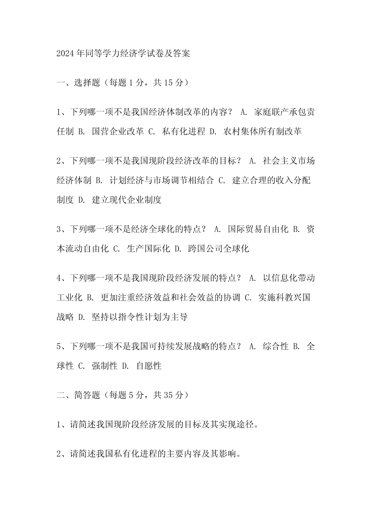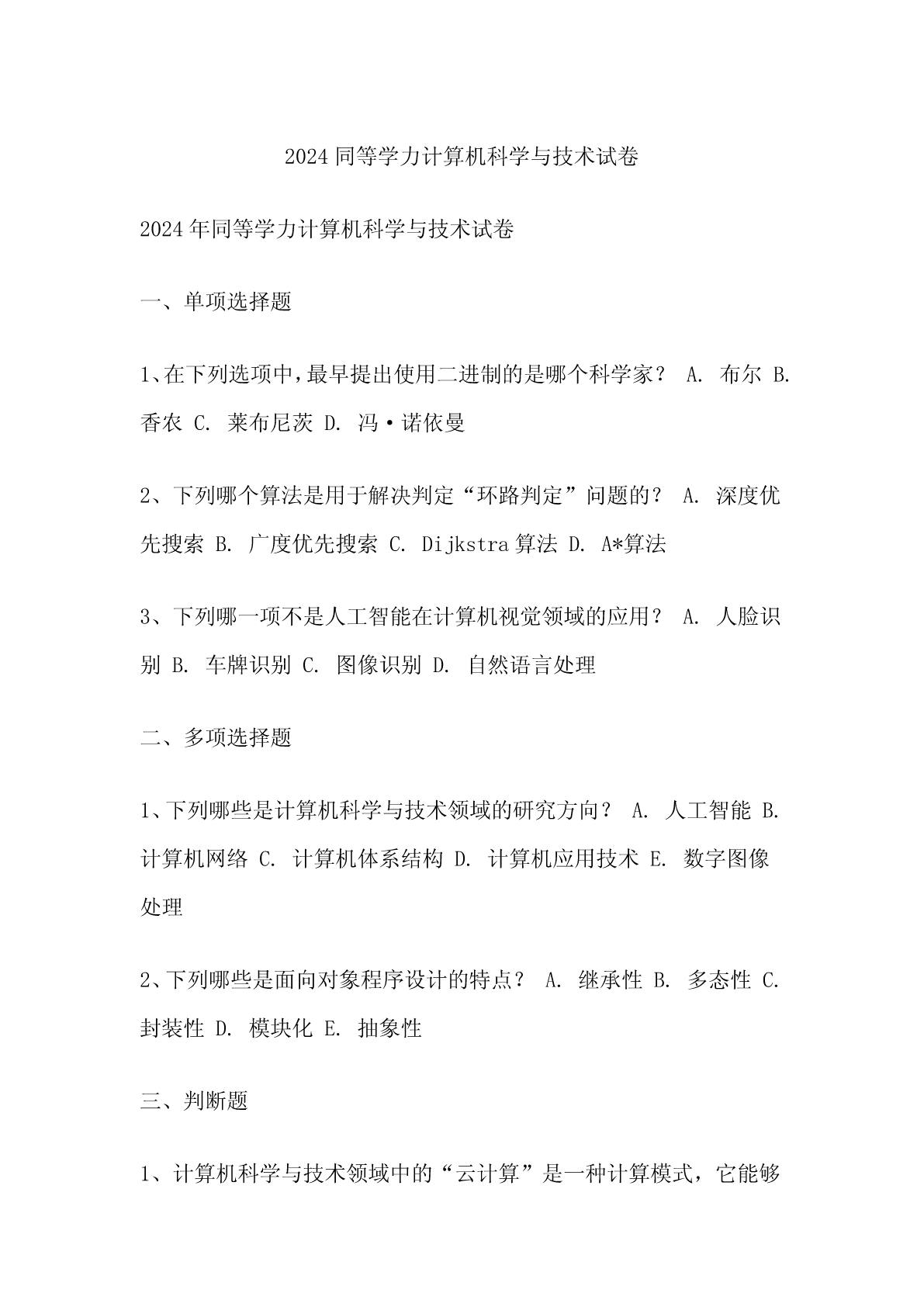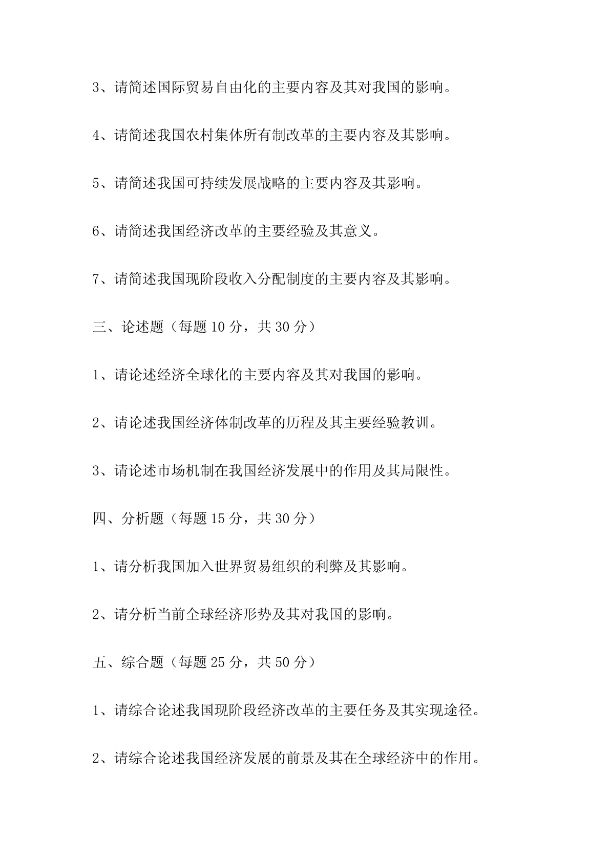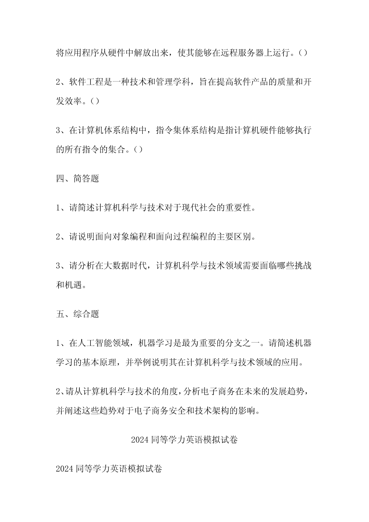 2024同等学力法语试卷 2024年同等学力法语试卷 同等学力是指具有相同水平的知识和技能,并具有同等学力的考生。 在2024年的法语考试中,将考察考生的法语语言水平、文化知识、 阅读理解、翻译和写作等方面的能力。 第一部分:选择题 1.下列哪个单词不是名词?A.tableB.chapeauC.amis D.ordinateur 2.下列哪个动词不是及物动词?A.trouverB.payerC.regarder D.boire 3.下列哪个词不是形容词?A.nouveauB.longC.facileD.aucune 4.下列哪个句子没有语病?A.Ilfaitbeauaujourd’hui.B.Je vaisààl'École.C.C'estunjolibeaupere.D.Jeparle françaiscouramment. 第二部分:填空题 5 2024同等学力经济学试卷及答案 2024年同等学力经济学试卷及答案 一、选择题(每题1分,共15分) 1、下列哪一项不是我国经济体制改革的内容?A.家庭联产承包责 任制B.国营企业改革C.私有化进程D.农村集体所有制改革 2、下列哪一项不是我国现阶段经济改革的目标?A.社会主义市场 经济体制B.计划经济与市场调节相结合C.建立合理的收入分配 制度D.建立现代企业制度 3、下列哪一项不是经济全球化的特点?A.国际贸易自由化B.资 本流动自由化C.生产国际化D.跨国公司全球化 4、下列哪一项不是我国现阶段经济发展的特点?A.以信息化带动 工业化B.更加注重经济效益和社会效益的协调C.实施科教兴国 战略D.坚持以指令性计划为主导 5、下列哪一项不是我国可持续发展战略的特点?A.综合性B.全 球性C.强制性D.自愿性 二、简答题(每题5分,共35分) 1、请简述我国现阶段经济发展的目标及其实现途径。 2、请简述我国私有化进程的主要内容及其影响。 3、请简述国际贸易自由化的主要内容及其对我国的影响。 4、请简述我国农村集体所有制改革的主要内容及其影响。 5、请简述我国可持续发展战略的主要内容及其影响。 6、请简述我国经济改革的主要经验及其意义。 7、请简述我国现阶段收入分配制度的主要内容及其影响。 三、论述题(每题10分,共30分) 1、请论述经济全球化的主要内容及其对我国的影响。 2、请论述我国经济体制改革的历程及其主要经验教训。 3、请论述市场机制在我国经济发展中的作用及其局限性。 四、分析题(每题15分,共30分) 1、请分析我国加入世界贸易组织的利弊及其影响。 2、请分析当前全球经济形势及其对我国的影响。 五、综合题(每题25分,共50分) 1、请综合论述我国现阶段经济改革的主要任务及其实现途径。 2、请综合论述我国经济发展的前景及其在全球经济中的作用。 2024同等学力计算机科学与技术试卷 2024年同等学力计算机科学与技术试卷 一、单项选择题 1、在下列选项中,最早提出使用二进制的是哪个科学家?A.布尔B. 香农C.莱布尼茨D.冯·诺依曼 2、下列哪个算法是用于解决判定“环路判定”问题的?A.深度优 先搜索B.广度优先搜索C.Dijkstra算法D.A*算法 3、下列哪一项不是人工智能在计算机视觉领域的应用?A.人脸识 别B.车牌识别C.图像识别D.自然语言处理 二、多项选择题 1、下列哪些是计算机科学与技术领域的研究方向?A.人工智能B. 计算机网络C.计算机体系结构D.计算机应用技术E.数字图像 处理 2、下列哪些是面向对象程序设计的特点?A.继承性B.多态性C. 封装性D.模块化E.抽象性 三、判断题 1、计算机科学与技术领域中的“云计算”是一种计算模式,它能够 将应用程序从硬件中解放出来,使其能够在远程服务器上运行。() 2、软件工程是一种技术和管理学科,旨在提高软件产品的质量和开 发效率。() 3、在计算机体系结构中,指令集体系结构是指计算机硬件能够执行 的所有指令的集合。() 四、简答题 1、请简述计算机科学与技术对于现代社会的重要性。 2、请说明面向对象编程和面向过程编程的主要区别。 3、请分析在大数据时代,计算机科学与技术领域需要面临哪些挑战 和机遇。 五、综合题 1、在人工智能领域,机器学习是最为重要的分支之一。请简述机器 学习的基本原理,并举例说明其在计算机科学与技术领域的应用。 2、请从计算机科学与技术的角度,分析电子商务在未来的发展趋势, 并阐述这些趋势对于电子商务安全和技术架构的影响。 2024同等学力英语模拟试卷 2024同等学力英语模拟试卷 一、写作部分 同等学力英语写作部分