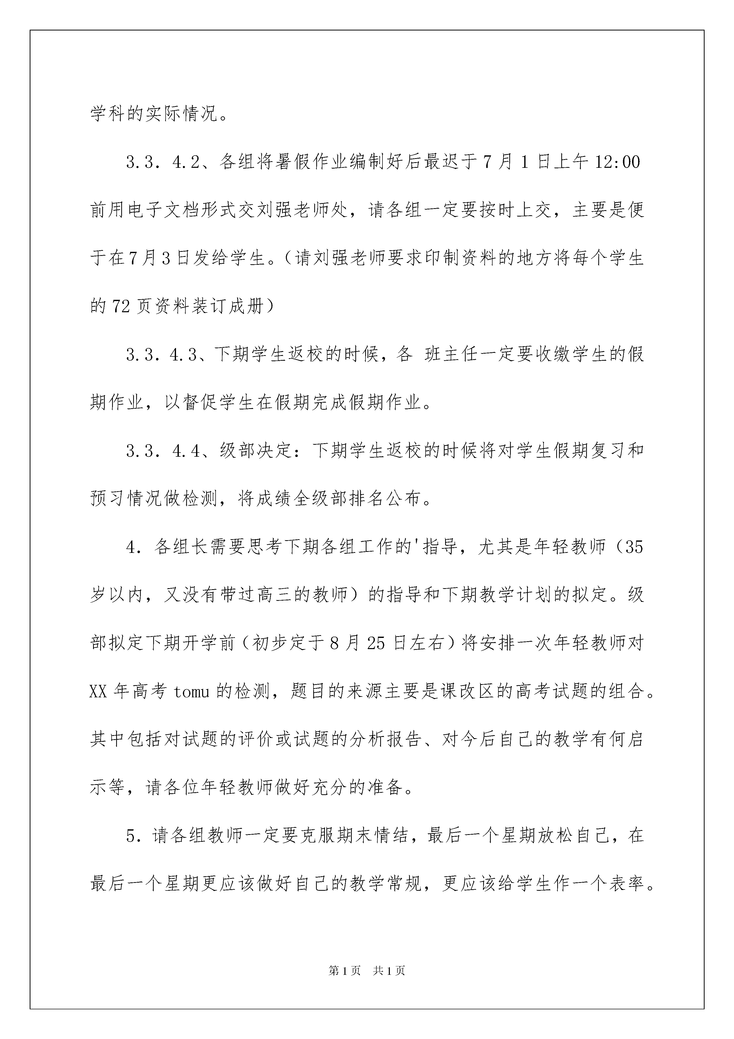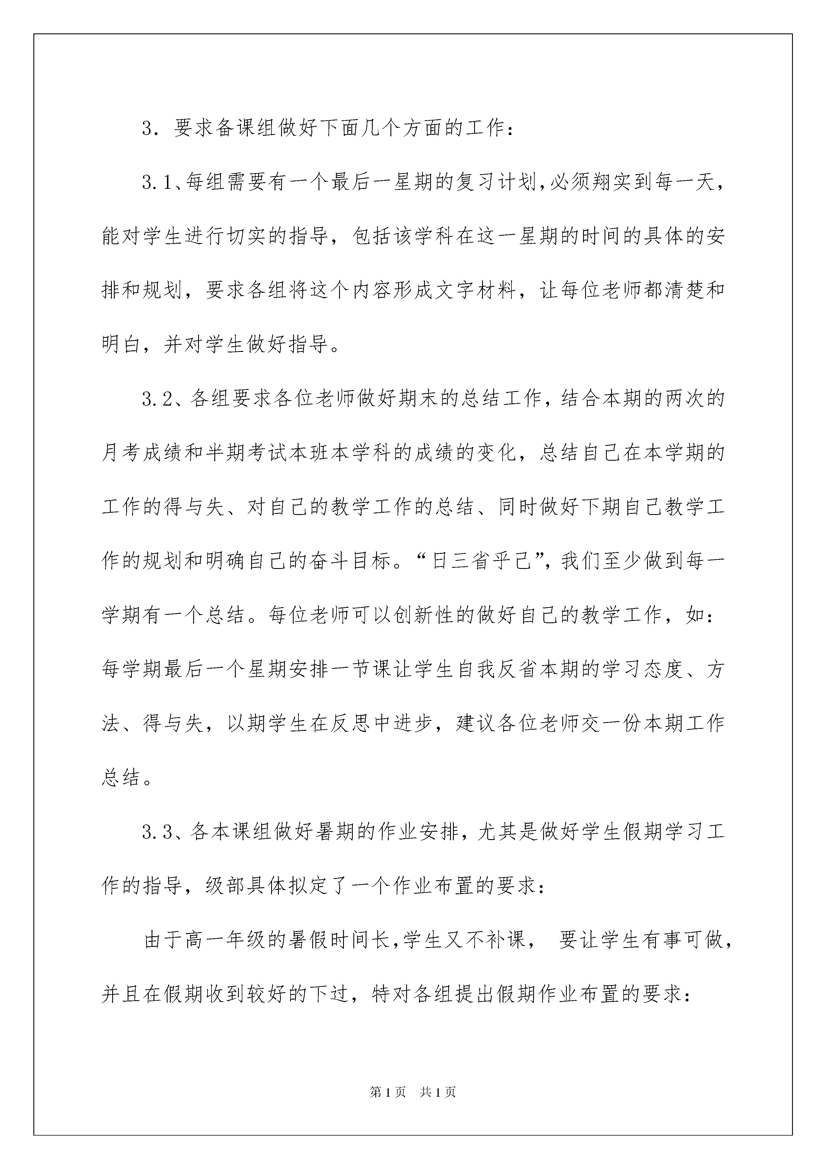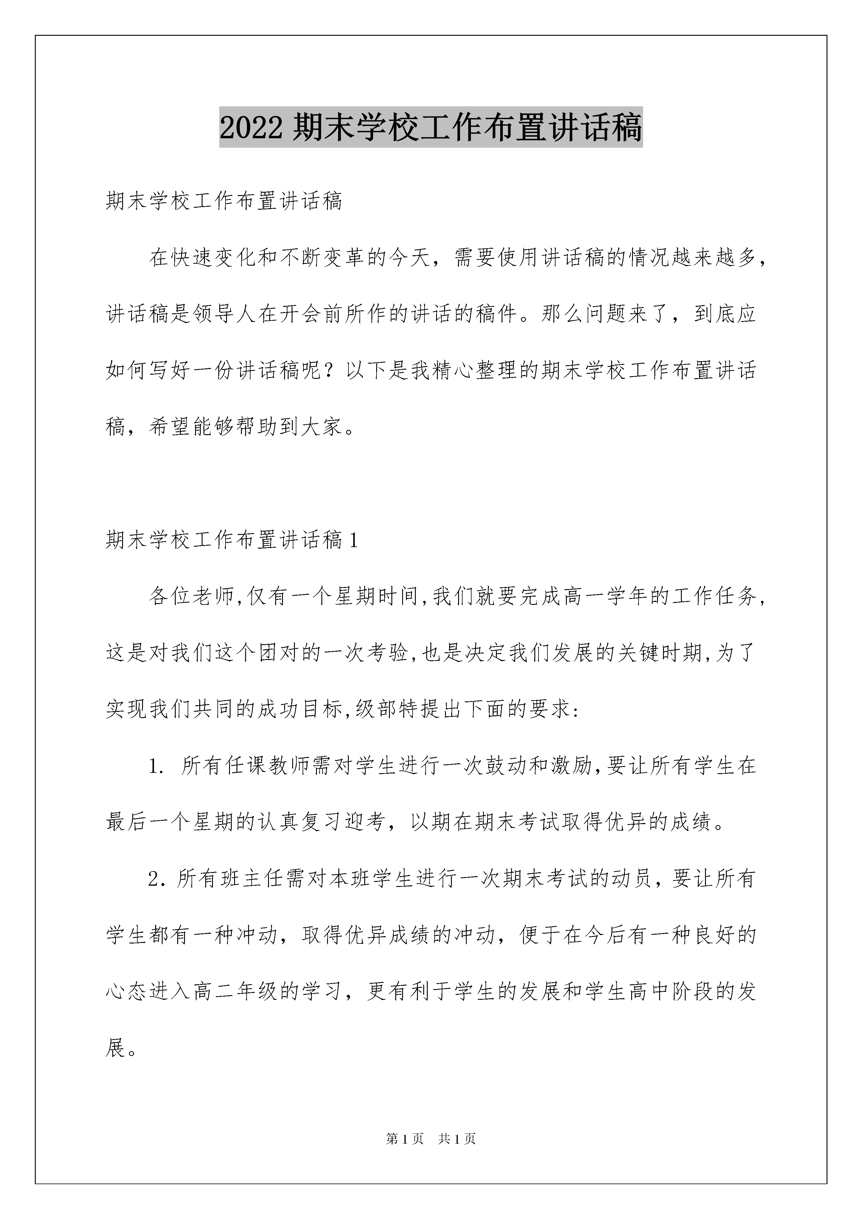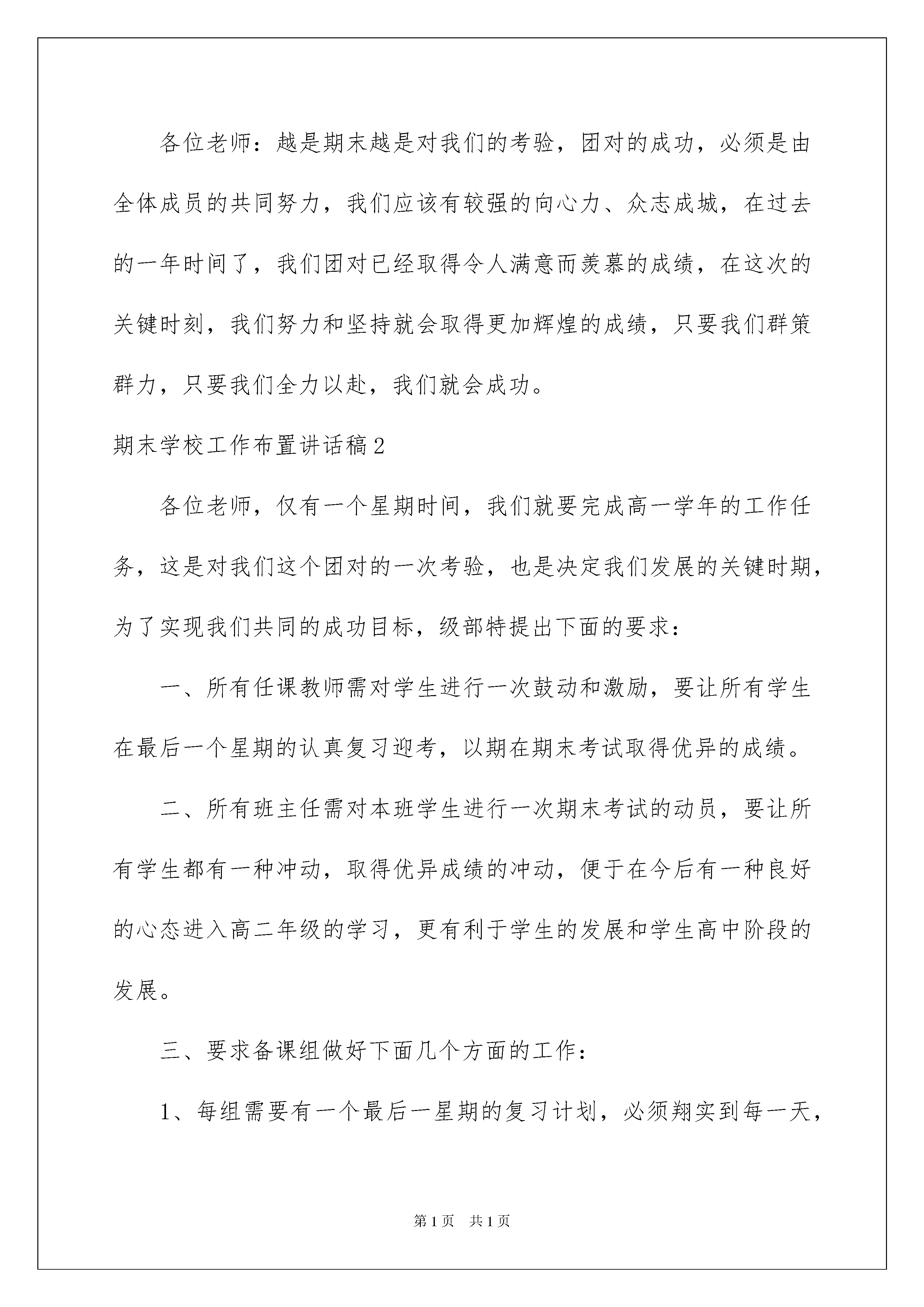 2022期末学校工作布置讲话稿期末学校工作布置讲话稿在快速变化和不断变革的今天,需要使用讲话稿的情况越来越多,讲话稿是领导人在开会前所作的讲话的稿件。那么问题来了,到底应如何写好一份讲话稿呢?以下是我精心整理的期末学校工作布置讲话稿,希望能够帮助到大家。期末学校工作布置讲话稿1各位老师,仅有一个星期时间,我们就要完成高一学年的工作任务,这是对我们这个团对的一次考验,也是决定我们发展的关键时期,为了实现我们共同的成功目标,级部特提出下面的要求:1.所有任课教师需对学生进行一次鼓动和激励,要让所有学生在最后一个星期的认真复习迎考,以期在期末考试取得优异的成绩。2.所有班主任需对本班学生进行一次期末考试的动员,要让所有学生都有一种冲动,取得优异成绩的冲动,便于在今后有一种良好的心态进入高二年级的学习,更有利于学生的发展和学生高中阶段的发展。3.要求备课组做好下面几个方面的工作:3.1、每组需要有一个最后一星期的复习计划,必须翔实到每一天,能对学生进行切实的指导,包括该学科在这一星期的时间的具体的安排和规划,要求各组将这个内容形成文字材料,让每位老师都清楚和明白,并对学生做好指导。3.2、各组要求各位老师做好期末的总结工作,结合本期的两次的月考成绩和半期考试本班本学科的成绩的变化,总结自己在本学期的工作的得与失、对自己的教学工作的总结、同时做好下期自己教学工作的规划和明确自己的奋斗目标。“日三省乎己”,我们至少做到每一学期有一个总结。每位老师可以创新性的做好自己的教学工作,如:每学期最后一个星期安排一节课让学生自我反省本期的学习态度、方法、得与失,以期学生在反思中进步,建议各位老师交一份本期工作总结。3.3、各本课组做好暑期的作业安排,尤其是做好学生假期学习工作的指导,级部具体拟定了一个作业布置的要求:由于高一年级的暑假时间长,学生又不补课,要让学生有事可做,并且在假期收到较好的下过,特对各组提出假期作业布置的要求:3.3.1.作业布置的原则:既要能照顾学生前面所学知识的复习,又要能对下期所学知识的提前自主学习。3.3.2.作业量:各学科所用的a4纸不得超过12页。(各组的老师们可以计算一下:学生的假期作业总量是72页,如果学生的作业量过多,效果不会太好,可能过多的作业等于没有布置,而且要照顾各学科的均衡发展)3.3.3.各科暑假作业布置的具体设想:3.3.3.1、复习高一所学知识中的重点和高考中常考知识点,可以通过试题练习的方式进行复习和回顾。所用的材料最好不要超过4页a4纸。3.3.3.2、编制下学期所学内容的自主学习提纲和练习题。各学科根据学科特点,将下学期所学的前两章内容进行知识分章进行整合,编制成学案形式。每章学案所涵盖的内容应该体现:学习提纲(预习问题的形式,让学生明白学习的目标)、章节重难点、预习检测试题、本章过关检测试题。要求每章所用的材料不得超过4页a4纸。3.3.4.注意事项:3.3.4.1、各学科在学案编写和试题的选取的时候一定要照顾本学科的实际情况。3.3.4.2、各组将暑假作业编制好后最迟于7月1日上午12:00前用电子文档形式交刘强老师处,请各组一定要按时上交,主要是便于在7月3日发给学生。(请刘强老师要求印制资料的地方将每个学生的72页资料装订成册)3.3.4.3、下期学生返校的时候,各班主任一定要收缴学生的假期作业,以督促学生在假期完成假期作业。3.3.4.4、级部决定:下期学生返校的时候将对学生假期复习和预习情况做检测,将成绩全级部排名公布。4.各组长需要思考下期各组工作的'指导,尤其是年轻教师(35岁以内,又没有带过高三的教师)的指导和下期教学计划的拟定。级部拟定下期开学前(初步定于8月25日左右)将安排一次年轻教师对XX年高考tomu的检测,题目的来源主要是课改区的高考试题的组合。其中包括对试题的评价或试题的分析报告、对今后自己的教学有何启示等,请各位年轻教师做好充分的准备。5.请各组教师一定要克服期末情结,最后一个星期放松自己,在最后一个星期更应该做好自己的教学常规,更应该给学生作一个表率。各位老师:越是期末越是对我们的考验,团对的成功,必须是由全体成员的共同努力,我们应该有较强的向心力、众志成城,在过去的一年时间了,我们团对已经取得令人满意而羡慕的成绩,在这次的关键时刻,我们努力和坚持就会取得更加辉煌的成绩,只要我们群策群力,只要我们全力以赴,我们就会成功。期末学校工作布置讲话稿2各位老师,仅有一个星期时间,我们就要完成高一学年的工作任务,这是对我们这个团对的一次考验,也是决定我们发展的关键时期,为了实现我们共同的成功目标,级部特提出下面