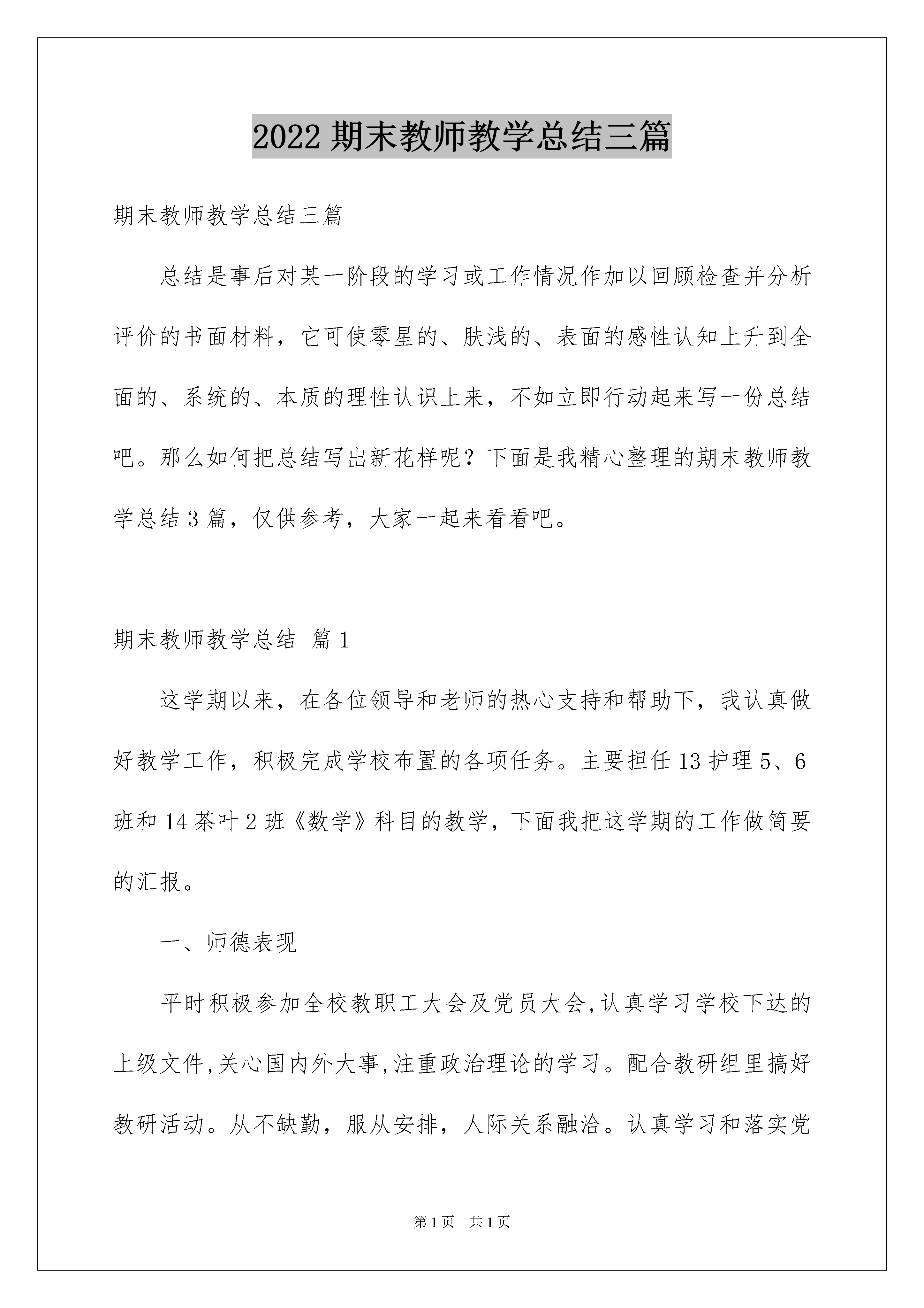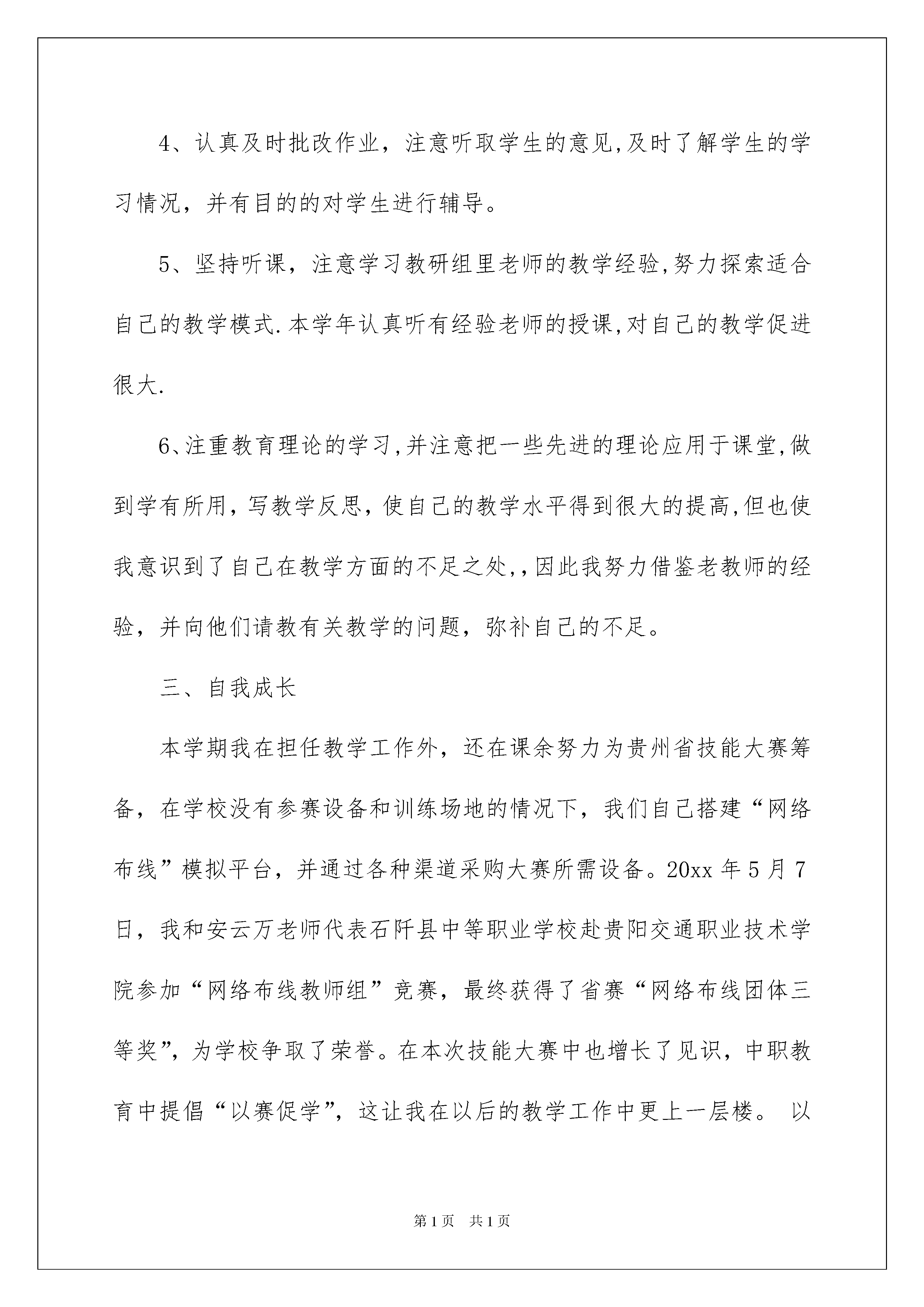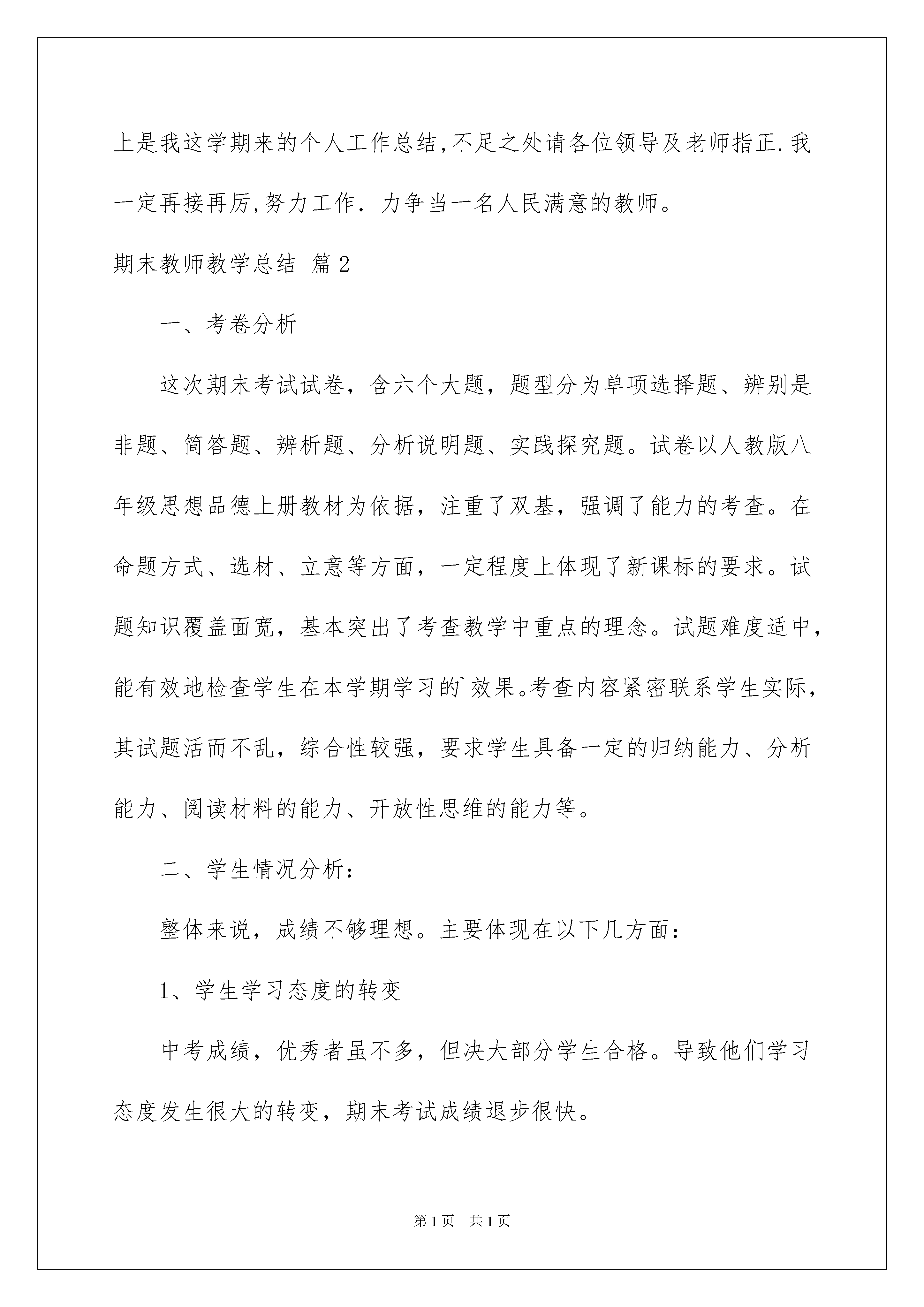 2022期末教师教学总结三篇期末教师教学总结三篇总结是事后对某一阶段的学习或工作情况作加以回顾检查并分析评价的书面材料,它可使零星的、肤浅的、表面的感性认知上升到全面的、系统的、本质的理性认识上来,不如立即行动起来写一份总结吧。那么如何把总结写出新花样呢?下面是我精心整理的期末教师教学总结3篇,仅供参考,大家一起来看看吧。期末教师教学总结篇1这学期以来,在各位领导和老师的热心支持和帮助下,我认真做好教学工作,积极完成学校布置的各项任务。主要担任13护理5、6班和14茶叶2班《数学》科目的教学,下面我把这学期的工作做简要的汇报。一、师德表现平时积极参加全校教职工大会及党员大会,认真学习学校下达的上级文件,关心国内外大事,注重政治理论的学习。配合教研组里搞好教研活动。从不缺勤,服从安排,人际关系融洽。认真学习和落实党的群众路线学习实践活动。认真学习新的教育理论,及时更新教育理念,注意从书本中汲取精华,认真学习仔细体会如何做好一名人民教师。二、教育教学情况在教学工作中,我注意做到以下几点:1、深入细致的备好每一节课。在备课中,我认真研究教材,力求准确把握难重点,难点.并注重参阅各种杂志,利用现代先进的网络科技技术,进行课堂教学的研究,制定符合学生认知规律的教学方法及教学形式。注意弱化难点强调重点。教案编写认真,并不断归纳总结提高教学水平,充分利用了网络教学资源。.2、认真上好每一节课。上课时注重学生主动性的发挥,发散学生的思维,注重综合能力的培养,有意识的培养学生的思维的严谨性及逻辑性,在教学中提高学生的思维素质.保证每一节课的质量.3、根据学生所学专业的特点,针对此特点,在授予学生理论知识外,比如在课堂上多举一些与其专业相符的问题作为课堂实例。除此之外,还对学生进行实践指导。让他们同时掌握理论与实践知识,这符合现今社会对此专业人才的需求。4、认真及时批改作业,注意听取学生的意见,及时了解学生的学习情况,并有目的的对学生进行辅导。5、坚持听课,注意学习教研组里老师的教学经验,努力探索适合自己的教学模式.本学年认真听有经验老师的授课,对自己的教学促进很大.6、注重教育理论的学习,并注意把一些先进的理论应用于课堂,做到学有所用,写教学反思,使自己的教学水平得到很大的提高,但也使我意识到了自己在教学方面的不足之处,,因此我努力借鉴老教师的经验,并向他们请教有关教学的问题,弥补自己的不足。三、自我成长本学期我在担任教学工作外,还在课余努力为贵州省技能大赛筹备,在学校没有参赛设备和训练场地的情况下,我们自己搭建“网络布线”模拟平台,并通过各种渠道采购大赛所需设备。20xx年5月7日,我和安云万老师代表石阡县中等职业学校赴贵阳交通职业技术学院参加“网络布线教师组”竞赛,最终获得了省赛“网络布线团体三等奖”,为学校争取了荣誉。在本次技能大赛中也增长了见识,中职教育中提倡“以赛促学”,这让我在以后的教学工作中更上一层楼。以上是我这学期来的个人工作总结,不足之处请各位领导及老师指正.我一定再接再厉,努力工作.力争当一名人民满意的教师。期末教师教学总结篇2一、考卷分析这次期末考试试卷,含六个大题,题型分为单项选择题、辨别是非题、简答题、辨析题、分析说明题、实践探究题。试卷以人教版八年级思想品德上册教材为依据,注重了双基,强调了能力的考查。在命题方式、选材、立意等方面,一定程度上体现了新课标的要求。试题知识覆盖面宽,基本突出了考查教学中重点的理念。试题难度适中,能有效地检查学生在本学期学习的`效果。考查内容紧密联系学生实际,其试题活而不乱,综合性较强,要求学生具备一定的归纳能力、分析能力、阅读材料的能力、开放性思维的能力等。二、学生情况分析:整体来说,成绩不够理想。主要体现在以下几方面:1、学生学习态度的转变中考成绩,优秀者虽不多,但决大部分学生合格。导致他们学习态度发生很大的转变,期末考试成绩退步很快。2、学生对基础知识的掌握和理解不够。教材中的重点内容,是对教材基础知识的考察,很多同学只是对其进行片面的个人分析,并没有运用教材所学的知识,这样是得不到高分的。3、学生运用课本主干知识分析问题、解决问题的能力不高。即学生不能根据材料从课本中提取出有效知识,也不会把课本知识和材料有机结台起来,要么只看到材料而忽视了课本知识,要么只单纯回答了课本知识而没有结合材料。这种现象在材料分析题里体现最为明显。4、学生辩证思维能力和发散性思维能力较弱,不能多角度地分析、解决问题。而考题需要学生具有较强的思维能力和发散性思维能力,可有些同学思考的过于拘泥,思路较狭窄,而导致失分较多。5、因时间紧和题量多的原因,学生