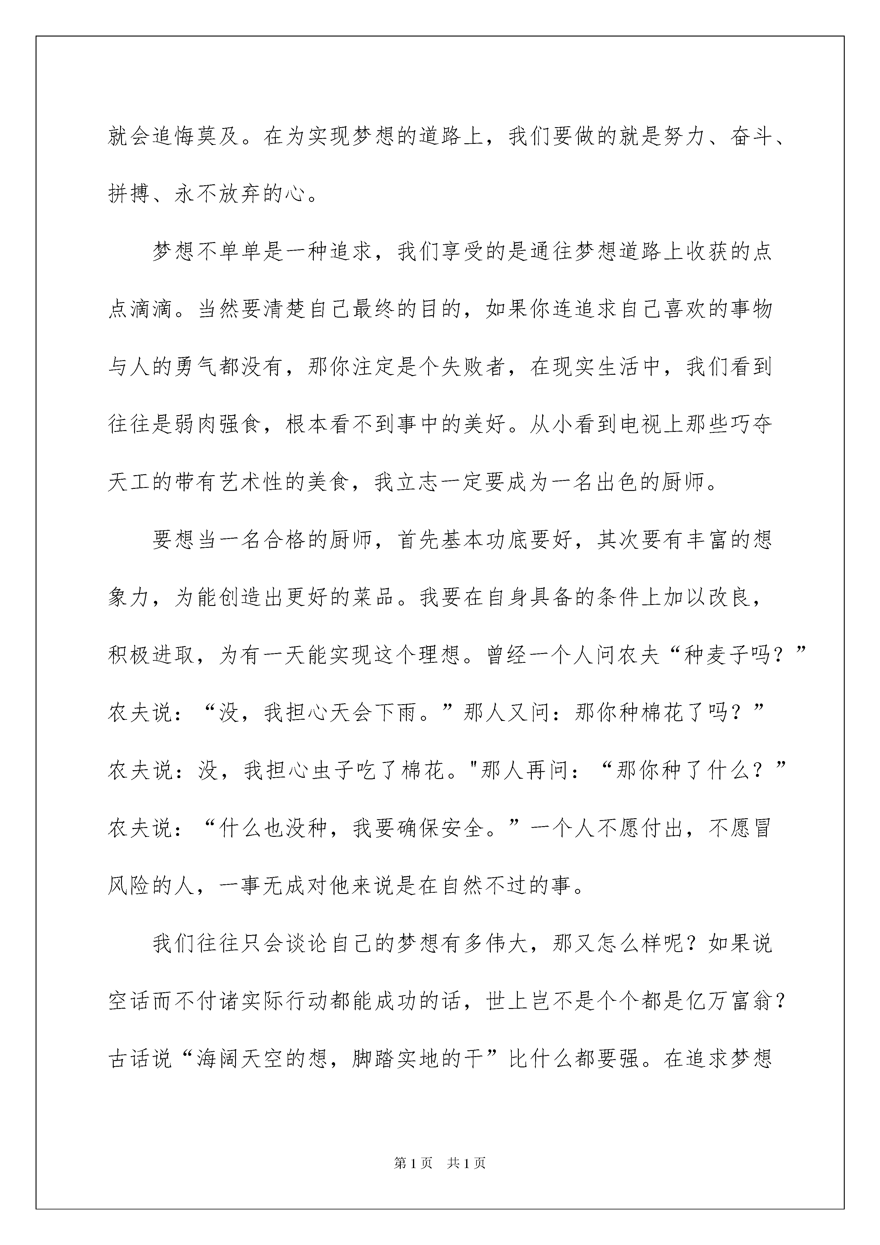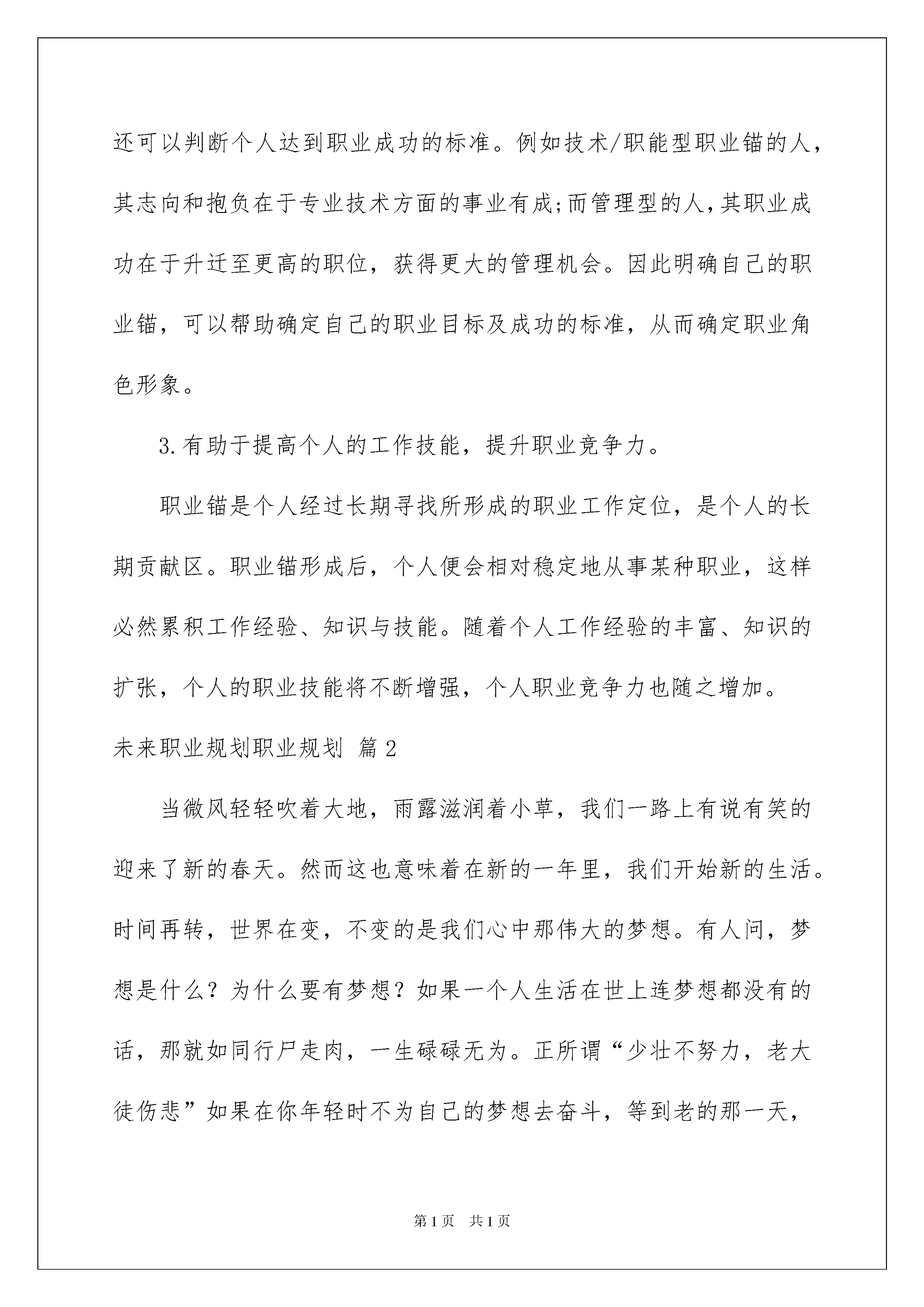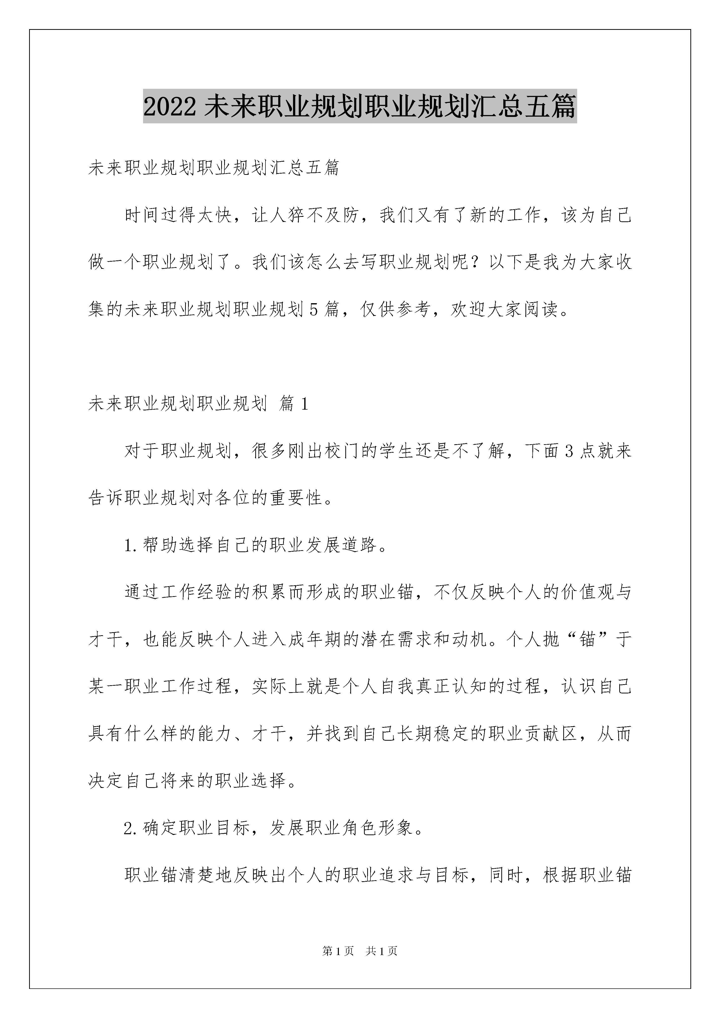 2022未来职业规划职业规划汇总五篇未来职业规划职业规划汇总五篇时间过得太快,让人猝不及防,我们又有了新的工作,该为自己做一个职业规划了。我们该怎么去写职业规划呢?以下是我为大家收集的未来职业规划职业规划5篇,仅供参考,欢迎大家阅读。未来职业规划职业规划篇1对于职业规划,很多刚出校门的学生还是不了解,下面3点就来告诉职业规划对各位的重要性。1.帮助选择自己的职业发展道路。通过工作经验的积累而形成的职业锚,不仅反映个人的价值观与才干,也能反映个人进入成年期的潜在需求和动机。个人抛“锚”于某一职业工作过程,实际上就是个人自我真正认知的过程,认识自己具有什么样的能力、才干,并找到自己长期稳定的职业贡献区,从而决定自己将来的职业选择。2.确定职业目标,发展职业角色形象。职业锚清楚地反映出个人的职业追求与目标,同时,根据职业锚还可以判断个人达到职业成功的标准。例如技术/职能型职业锚的人,其志向和抱负在于专业技术方面的事业有成;而管理型的人,其职业成功在于升迁至更高的职位,获得更大的管理机会。因此明确自己的职业锚,可以帮助确定自己的职业目标及成功的标准,从而确定职业角色形象。3.有助于提高个人的工作技能,提升职业竞争力。职业锚是个人经过长期寻找所形成的职业工作定位,是个人的长期贡献区。职业锚形成后,个人便会相对稳定地从事某种职业,这样必然累积工作经验、知识与技能。随着个人工作经验的丰富、知识的扩张,个人的职业技能将不断增强,个人职业竞争力也随之增加。未来职业规划职业规划篇2当微风轻轻吹着大地,雨露滋润着小草,我们一路上有说有笑的迎来了新的春天。然而这也意味着在新的一年里,我们开始新的生活。时间再转,世界在变,不变的是我们心中那伟大的梦想。有人问,梦想是什么?为什么要有梦想?如果一个人生活在世上连梦想都没有的话,那就如同行尸走肉,一生碌碌无为。正所谓“少壮不努力,老大徒伤悲”如果在你年轻时不为自己的梦想去奋斗,等到老的那一天,就会追悔莫及。在为实现梦想的道路上,我们要做的就是努力、奋斗、拼搏、永不放弃的心。梦想不单单是一种追求,我们享受的是通往梦想道路上收获的点点滴滴。当然要清楚自己最终的目的,如果你连追求自己喜欢的事物与人的勇气都没有,那你注定是个失败者,在现实生活中,我们看到往往是弱肉强食,根本看不到事中的美好。从小看到电视上那些巧夺天工的带有艺术性的美食,我立志一定要成为一名出色的厨师。要想当一名合格的厨师,首先基本功底要好,其次要有丰富的想象力,为能创造出更好的菜品。我要在自身具备的条件上加以改良,积极进取,为有一天能实现这个理想。曾经一个人问农夫“种麦子吗?”农夫说:“没,我担心天会下雨。”那人又问:那你种棉花了吗?”农夫说:没,我担心虫子吃了棉花。"那人再问:“那你种了什么?”农夫说:“什么也没种,我要确保安全。”一个人不愿付出,不愿冒风险的人,一事无成对他来说是在自然不过的事。我们往往只会谈论自己的梦想有多伟大,那又怎么样呢?如果说空话而不付诸实际行动都能成功的话,世上岂不是个个都是亿万富翁?古话说“海阔天空的想,脚踏实地的干”比什么都要强。在追求梦想的道路上,有谁没有吃过苦、摔过跤,有谁没有经过风霜雨雪,坑坑洼洼的呢?现在很痛苦,等过阵子回头看看,发现那都不算什么。更何况,在你的背后有着无数支持你、相信你的观众。即使惨痛的摔倒,也要华丽的站起来。人生没有如果,只要你有一份坚持、一份勤劳,付出总会有回报。不要记恨那些嘲笑我们的人,要有一颗宽容的心,去对待他们。当我们搬开别人脚下的绊脚石时,也许恰恰是在为自己铺路。从我十六岁开始摸刀的那一刻起,我的梦想就是要当一名厨师,直到二十出头了才踏上出发的道路,原因就是因为当初没有坚持自己内心的想法,没有为它付诸行动,所以现在有些后悔,但世上没有卖后悔药的,既然已经在路上了,就不需要再去提曾经。人气歌手庄心妍有一首歌里这样写道:“就带着梦想去旅行,背包里只装着憧憬,比阳光纯净,比蝴蝶轻盈,走过的背影是别人的风景”。这一段话我非常喜欢,我也正如这首歌里所说的在做。有一天等到它实现了,我会感谢所有支持我相信我的家人、老师以及朋友。谢谢你们在我沮丧的时候,给我温暖的怀抱,在我疲倦的时候给我依靠的臂膀,我一直坚信,别人能做到的我为什么不能做到,关键在于你肯不肯做,如果别人在苦苦学习时你无所事事的望着天空,那你将什么都得不到。一个真正为自己梦想坚持的人当他成功的那一天,他会说,其实我做的还不够好。人一辈子就是活到老学到老,不能认为自己有一技之长而忽略其他,总有一些事是你不会做的。所以不要以为自己做的比别人好,在别人学习的时候你不去学,那你做的再