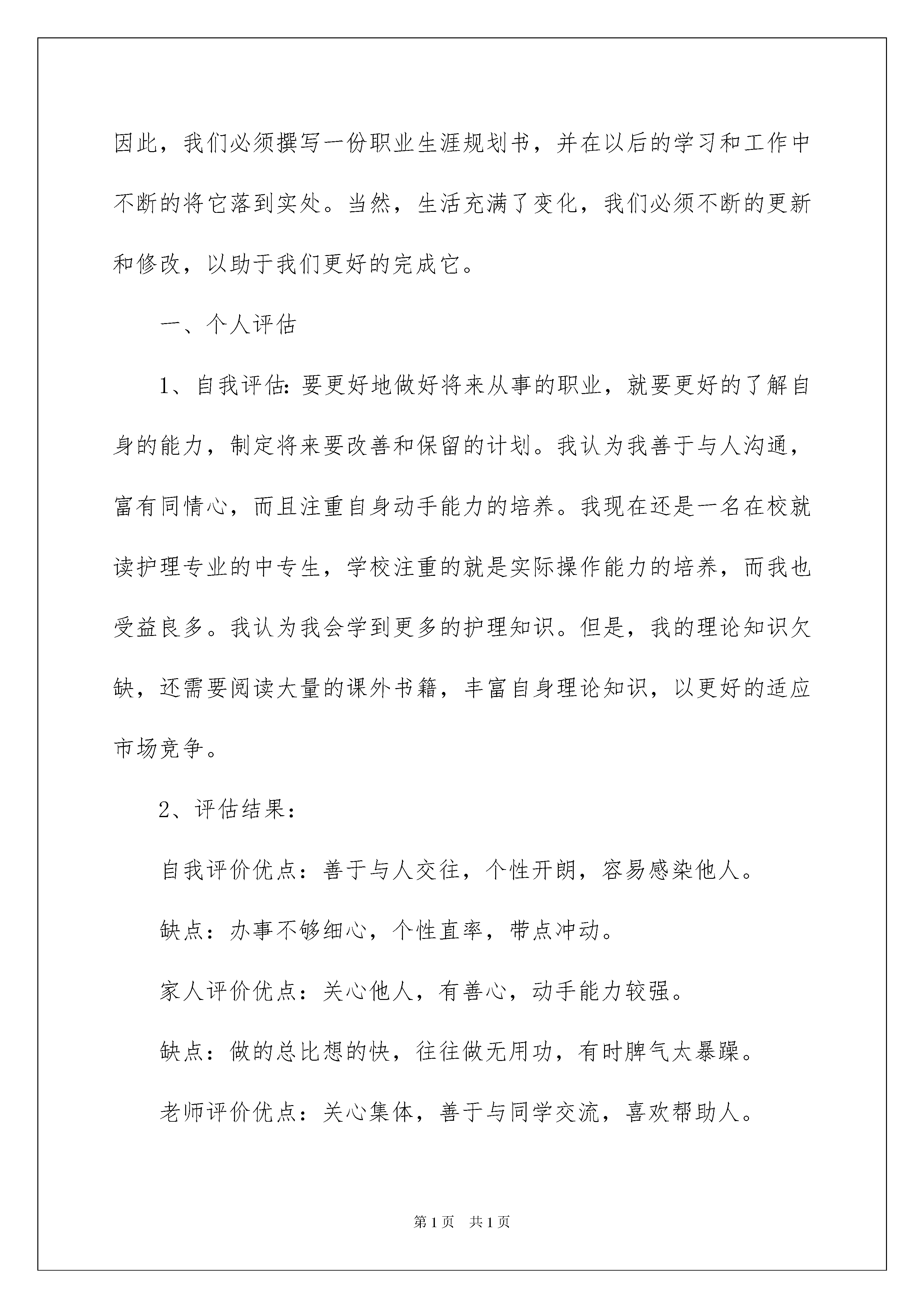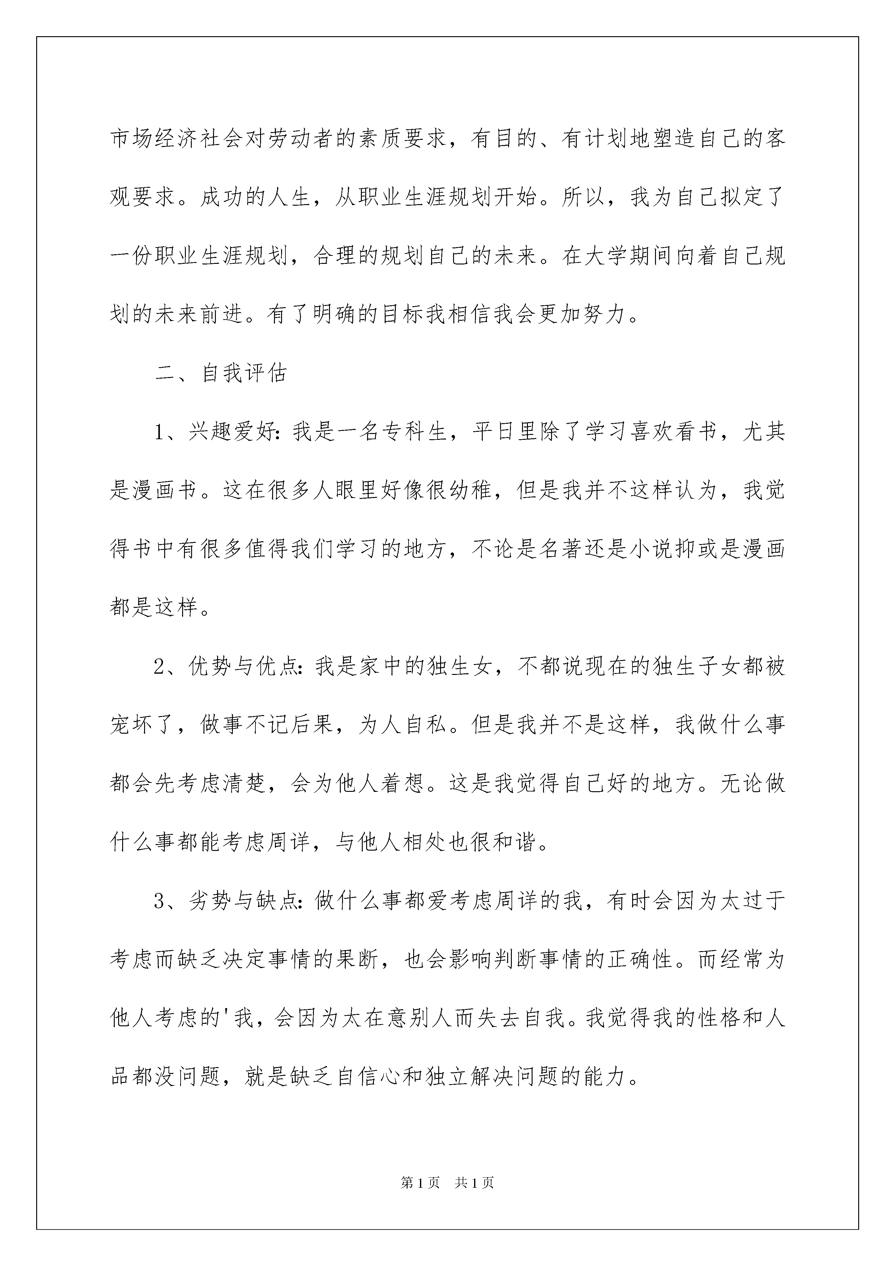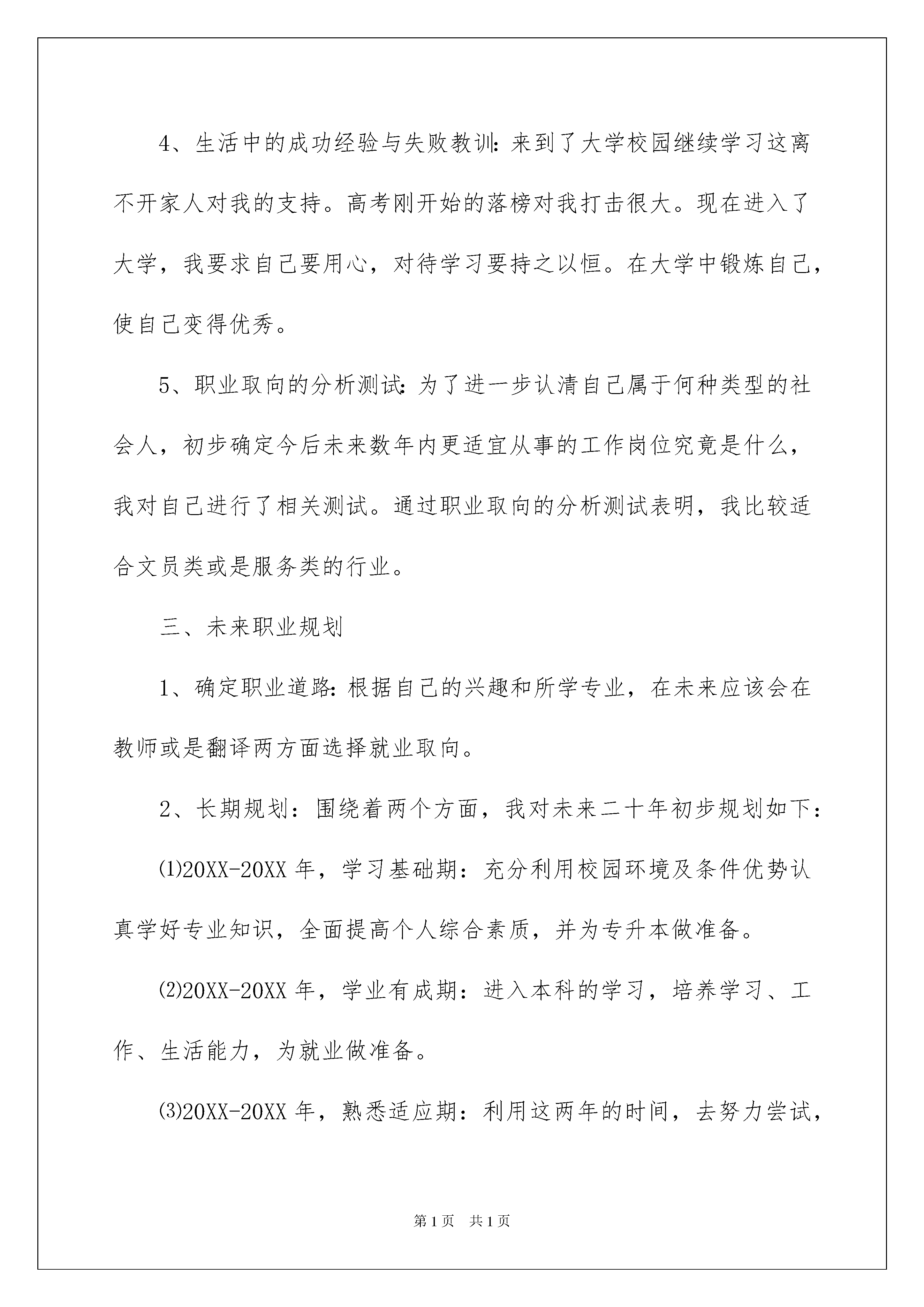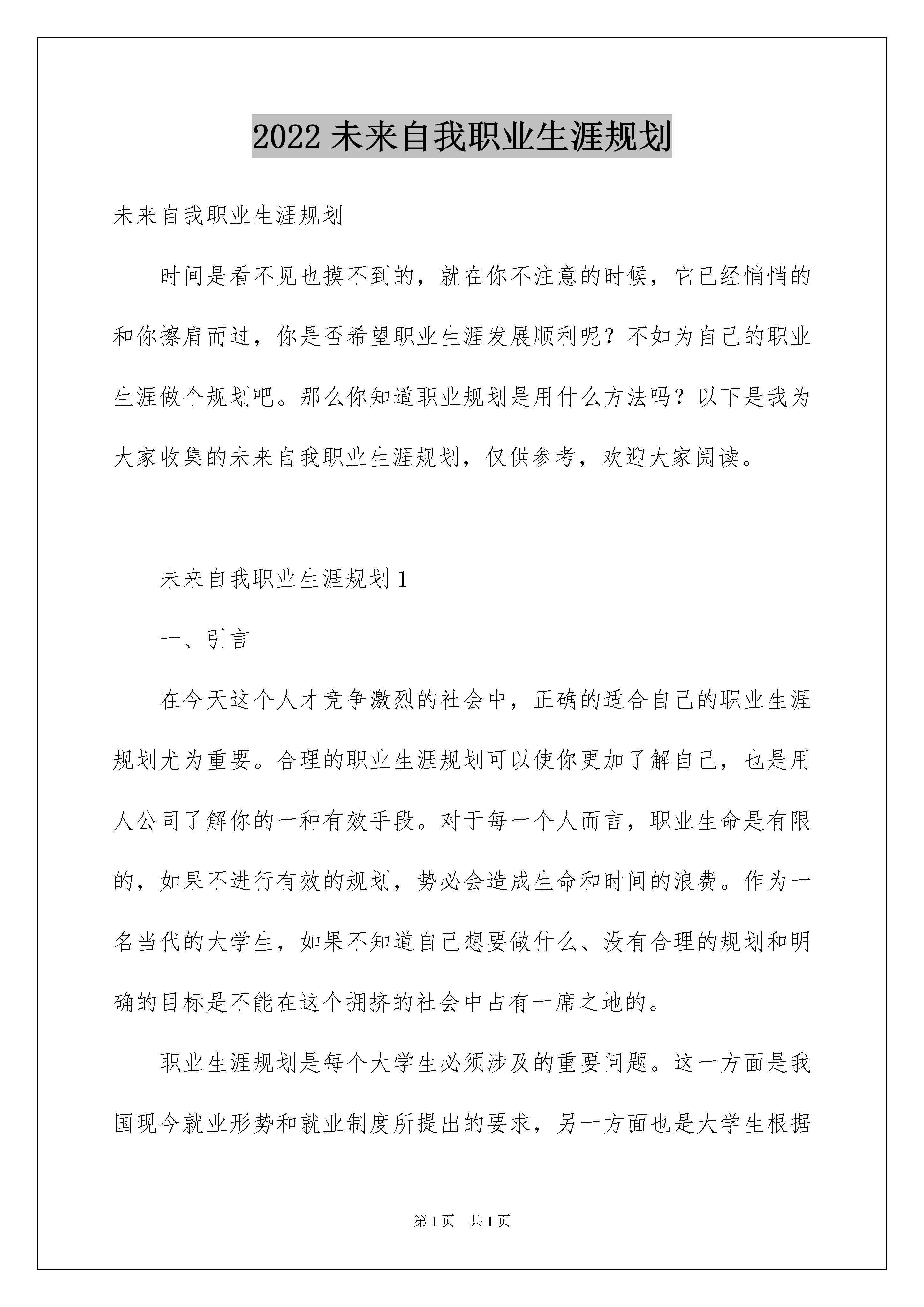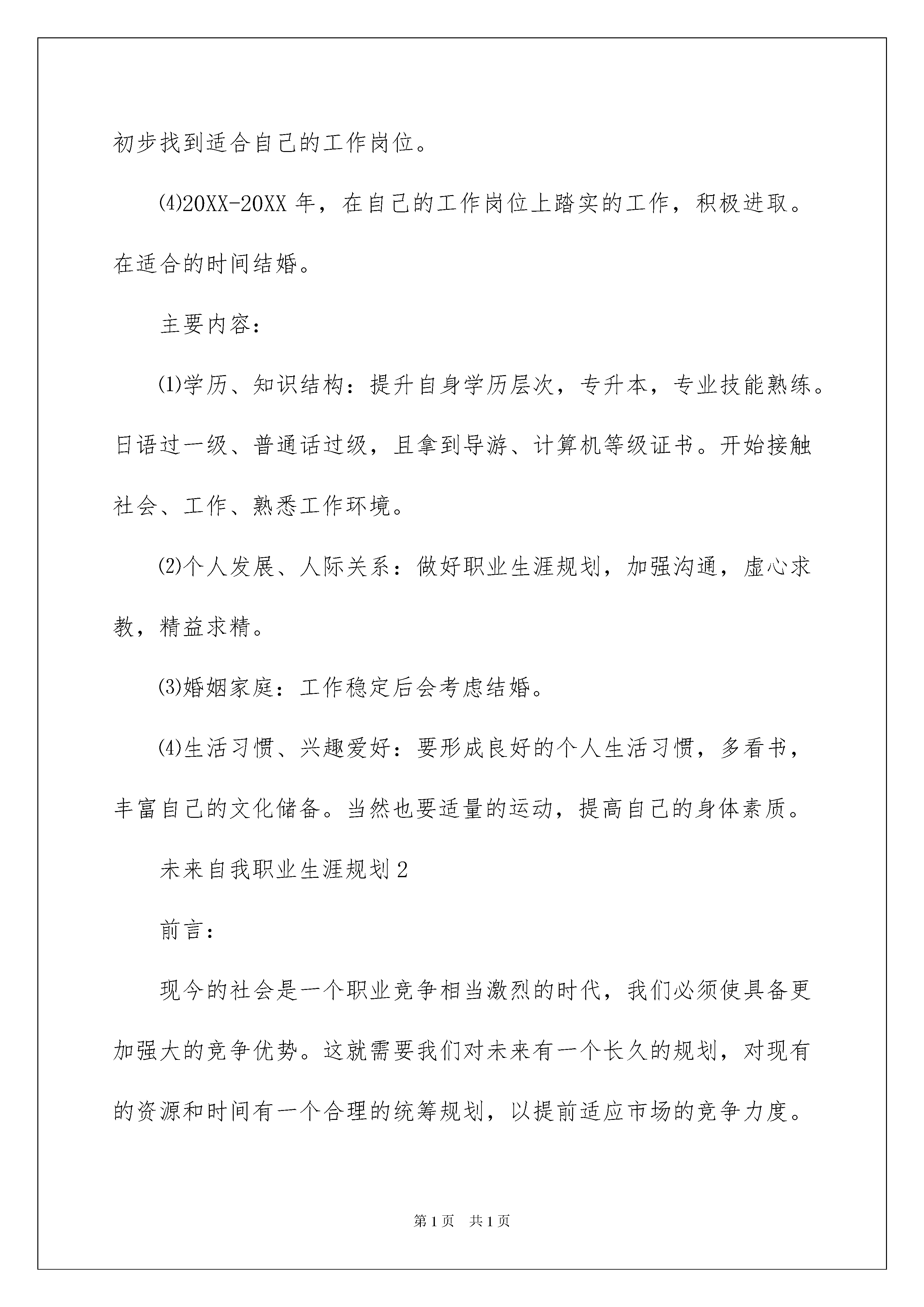 2022未来自我职业生涯规划未来自我职业生涯规划时间是看不见也摸不到的,就在你不注意的时候,它已经悄悄的和你擦肩而过,你是否希望职业生涯发展顺利呢?不如为自己的职业生涯做个规划吧。那么你知道职业规划是用什么方法吗?以下是我为大家收集的未来自我职业生涯规划,仅供参考,欢迎大家阅读。未来自我职业生涯规划1一、引言在今天这个人才竞争激烈的社会中,正确的适合自己的职业生涯规划尤为重要。合理的职业生涯规划可以使你更加了解自己,也是用人公司了解你的一种有效手段。对于每一个人而言,职业生命是有限的,如果不进行有效的规划,势必会造成生命和时间的浪费。作为一名当代的大学生,如果不知道自己想要做什么、没有合理的规划和明确的目标是不能在这个拥挤的社会中占有一席之地的。职业生涯规划是每个大学生必须涉及的重要问题。这一方面是我国现今就业形势和就业制度所提出的要求,另一方面也是大学生根据市场经济社会对劳动者的素质要求,有目的、有计划地塑造自己的客观要求。成功的人生,从职业生涯规划开始。所以,我为自己拟定了一份职业生涯规划,合理的规划自己的未来。在大学期间向着自己规划的未来前进。有了明确的目标我相信我会更加努力。二、自我评估1、兴趣爱好:我是一名专科生,平日里除了学习喜欢看书,尤其是漫画书。这在很多人眼里好像很幼稚,但是我并不这样认为,我觉得书中有很多值得我们学习的地方,不论是名著还是小说抑或是漫画都是这样。2、优势与优点:我是家中的独生女,不都说现在的独生子女都被宠坏了,做事不记后果,为人自私。但是我并不是这样,我做什么事都会先考虑清楚,会为他人着想。这是我觉得自己好的地方。无论做什么事都能考虑周详,与他人相处也很和谐。3、劣势与缺点:做什么事都爱考虑周详的我,有时会因为太过于考虑而缺乏决定事情的果断,也会影响判断事情的正确性。而经常为他人考虑的'我,会因为太在意别人而失去自我。我觉得我的性格和人品都没问题,就是缺乏自信心和独立解决问题的能力。4、生活中的成功经验与失败教训:来到了大学校园继续学习这离不开家人对我的支持。高考刚开始的落榜对我打击很大。现在进入了大学,我要求自己要用心,对待学习要持之以恒。在大学中锻炼自己,使自己变得优秀。5、职业取向的分析测试:为了进一步认清自己属于何种类型的社会人,初步确定今后未来数年内更适宜从事的工作岗位究竟是什么,我对自己进行了相关测试。通过职业取向的分析测试表明,我比较适合文员类或是服务类的行业。三、未来职业规划1、确定职业道路:根据自己的兴趣和所学专业,在未来应该会在教师或是翻译两方面选择就业取向。2、长期规划:围绕着两个方面,我对未来二十年初步规划如下:⑴20XX-20XX年,学习基础期:充分利用校园环境及条件优势认真学好专业知识,全面提高个人综合素质,并为专升本做准备。⑵20XX-20XX年,学业有成期:进入本科的学习,培养学习、工作、生活能力,为就业做准备。⑶20XX-20XX年,熟悉适应期:利用这两年的时间,去努力尝试,初步找到适合自己的工作岗位。⑷20XX-20XX年,在自己的工作岗位上踏实的工作,积极进取。在适合的时间结婚。主要内容:⑴学历、知识结构:提升自身学历层次,专升本,专业技能熟练。日语过一级、普通话过级,且拿到导游、计算机等级证书。开始接触社会、工作、熟悉工作环境。⑵个人发展、人际关系:做好职业生涯规划,加强沟通,虚心求教,精益求精。⑶婚姻家庭:工作稳定后会考虑结婚。⑷生活习惯、兴趣爱好:要形成良好的个人生活习惯,多看书,丰富自己的文化储备。当然也要适量的运动,提高自己的身体素质。未来自我职业生涯规划2前言:现今的社会是一个职业竞争相当激烈的时代,我们必须使具备更加强大的竞争优势。这就需要我们对未来有一个长久的规划,对现有的资源和时间有一个合理的统筹规划,以提前适应市场的竞争力度。因此,我们必须撰写一份职业生涯规划书,并在以后的学习和工作中不断的将它落到实处。当然,生活充满了变化,我们必须不断的更新和修改,以助于我们更好的完成它。一、个人评估1、自我评估:要更好地做好将来从事的职业,就要更好的了解自身的能力,制定将来要改善和保留的计划。我认为我善于与人沟通,富有同情心,而且注重自身动手能力的培养。我现在还是一名在校就读护理专业的中专生,学校注重的就是实际操作能力的培养,而我也受益良多。我认为我会学到更多的护理知识。但是,我的理论知识欠缺,还需要阅读大量的课外书籍,丰富自身理论知识,以更好的适应市场竞争。2、评估结果:自我评价优点:善于与人交往,个性开朗,容易感染他人。缺点:办事不够细心,个性直率,带点冲动。家人评价优点:关心他人,有善心
