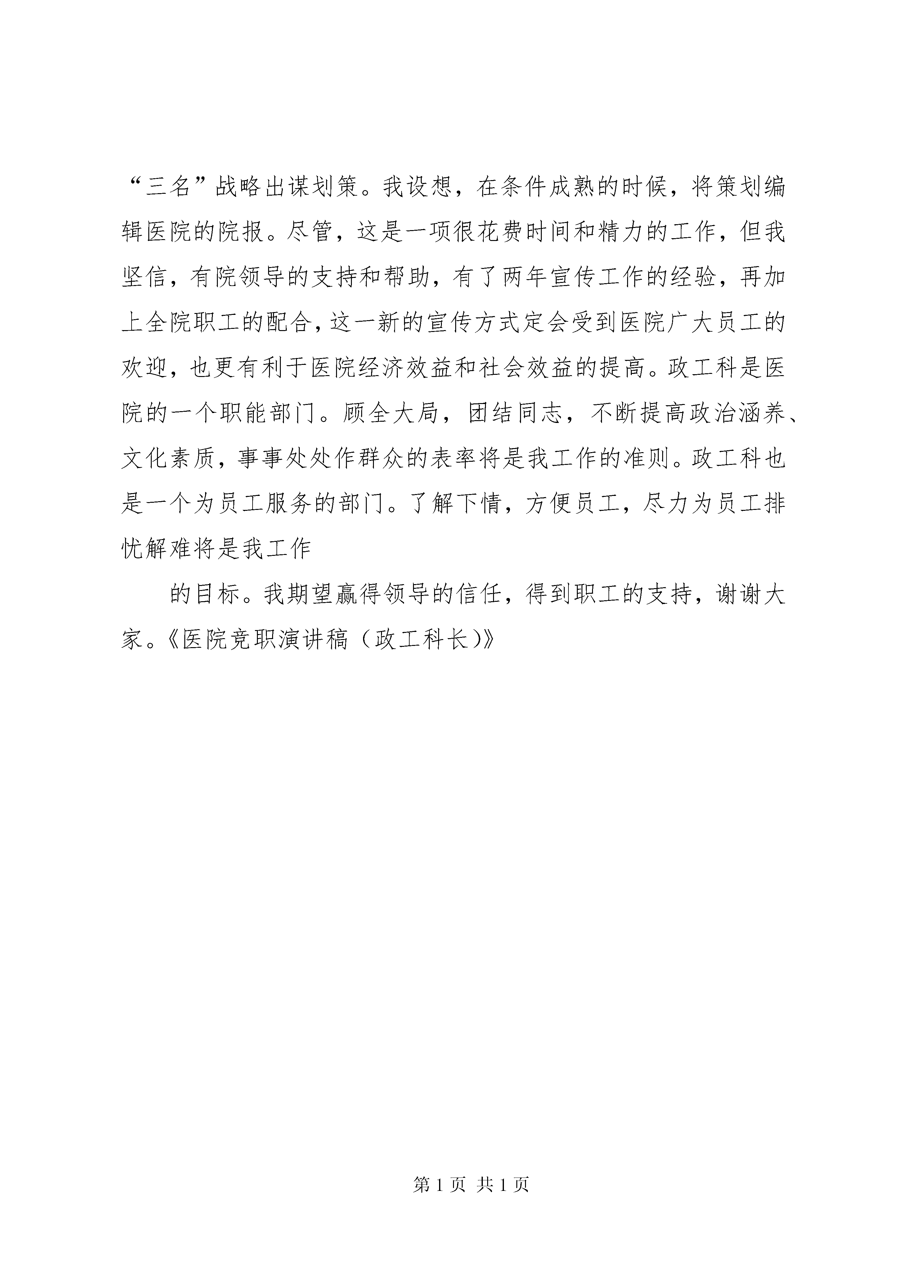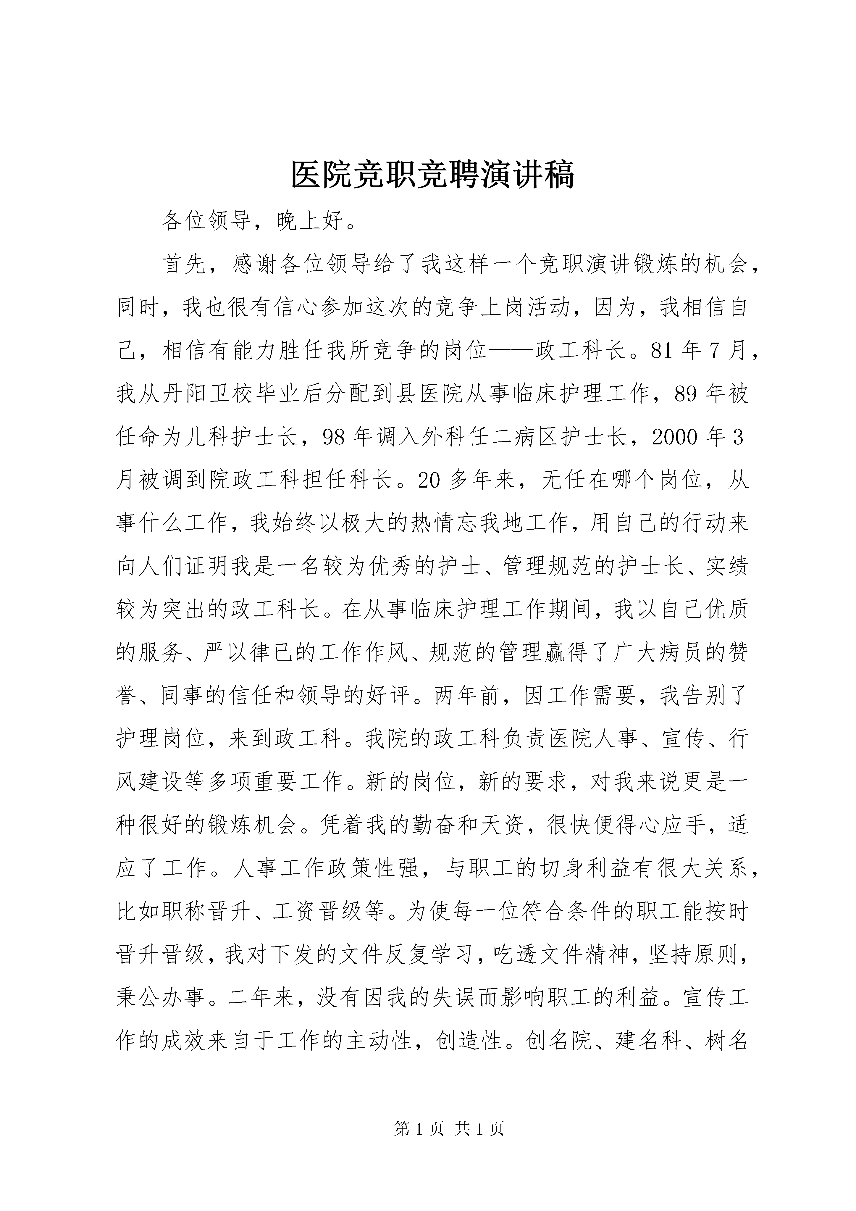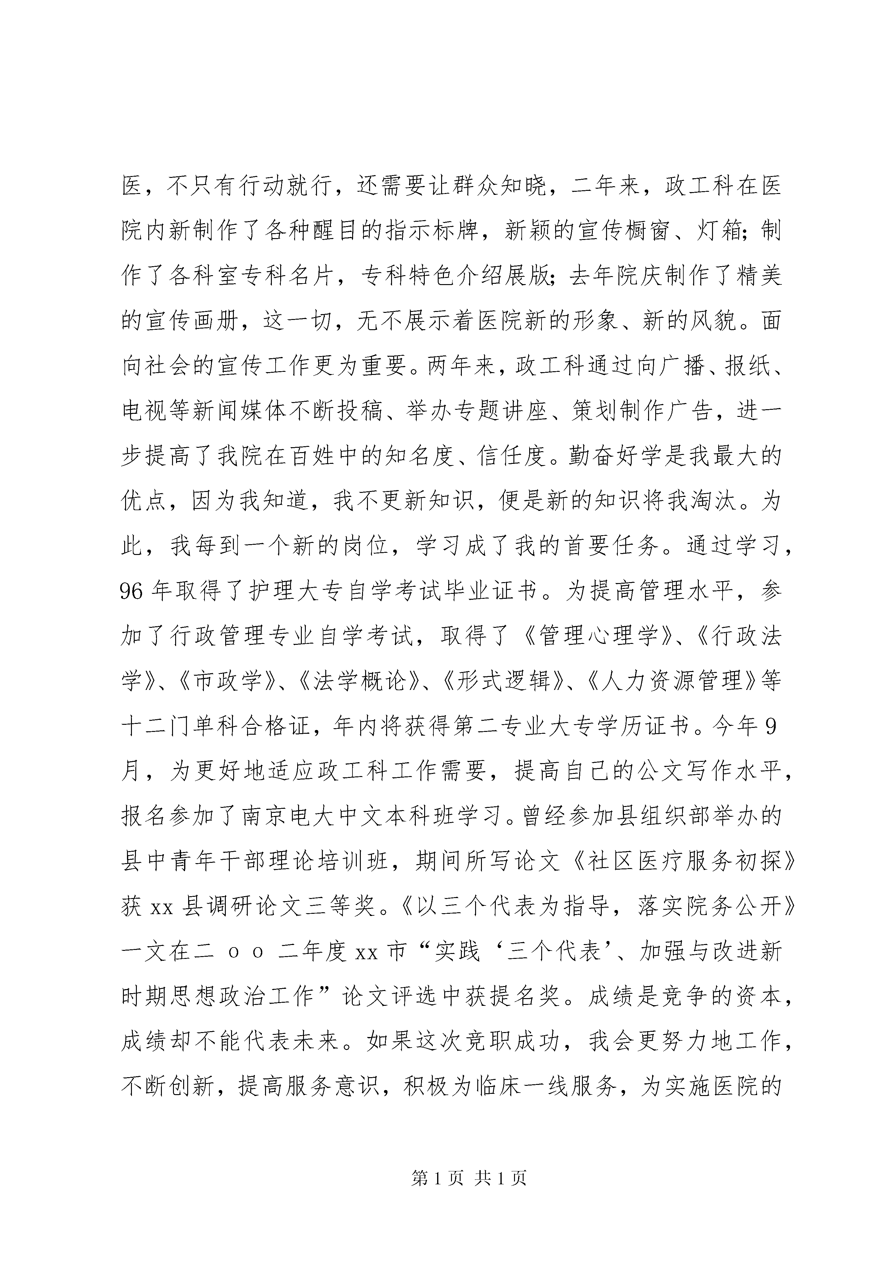 医院竞职竞聘演讲稿各位领导,晚上好。首先,感谢各位领导给了我这样一个竞职演讲锻炼的机会,同时,我也很有信心参加这次的竞争上岗活动,因为,我相信自己,相信有能力胜任我所竞争的岗位——政工科长。81年7月,我从丹阳卫校毕业后分配到县医院从事临床护理工作,89年被任命为儿科护士长,98年调入外科任二病区护士长,2000年3月被调到院政工科担任科长。20多年来,无任在哪个岗位,从事什么工作,我始终以极大的热情忘我地工作,用自己的行动来向人们证明我是一名较为优秀的护士、管理规范的护士长、实绩较为突出的政工科长。在从事临床护理工作期间,我以自己优质的服务、严以律已的工作作风、规范的管理赢得了广大病员的赞誉、同事的信任和领导的好评。两年前,因工作需要,我告别了护理岗位,来到政工科。我院的政工科负责医院人事、宣传、行风建设等多项重要工作。新的岗位,新的要求,对我来说更是一种很好的锻炼机会。凭着我的勤奋和天资,很快便得心应手,适应了工作。人事工作政策性强,与职工的切身利益有很大关系,比如职称晋升、工资晋级等。为使每一位符合条件的职工能按时晋升晋级,我对下发的文件反复学习,吃透文件精神,坚持原则,秉公办事。二年来,没有因我的失误而影响职工的利益。宣传工作的成效来自于工作的主动性,创造性。创名院、建名科、树名医,不只有行动就行,还需要让群众知晓,二年来,政工科在医院内新制作了各种醒目的指示标牌,新颖的宣传橱窗、灯箱;制作了各科室专科名片,专科特色介绍展版;去年院庆制作了精美的宣传画册,这一切,无不展示着医院新的形象、新的风貌。面向社会的宣传工作更为重要。两年来,政工科通过向广播、报纸、电视等新闻媒体不断投稿、举办专题讲座、策划制作广告,进一步提高了我院在百姓中的知名度、信任度。勤奋好学是我最大的优点,因为我知道,我不更新知识,便是新的知识将我淘汰。为此,我每到一个新的岗位,学习成了我的首要任务。通过学习,96年取得了护理大专自学考试毕业证书。为提高管理水平,参加了行政管理专业自学考试,取得了《管理心理学》、《行政法学》、《市政学》、《法学概论》、《形式逻辑》、《人力资源管理》等十二门单科合格证,年内将获得第二专业大专学历证书。今年9月,为更好地适应政工科工作需要,提高自己的公文写作水平,报名参加了南京电大中文本科班学习。曾经参加县组织部举办的县中青年干部理论培训班,期间所写论文《社区医疗服务初探》获xx县调研论文三等奖。《以三个代表为指导,落实院务公开》一文在二оо二年度xx市“实践‘三个代表’、加强与改进新时期思想政治工作”论文评选中获提名奖。成绩是竞争的资本,成绩却不能代表未来。如果这次竞职成功,我会更努力地工作,不断创新,提高服务意识,积极为临床一线服务,为实施医院的“三名”战略出谋划策。我设想,在条件成熟的时候,将策划编辑医院的院报。尽管,这是一项很花费时间和精力的工作,但我坚信,有院领导的支持和帮助,有了两年宣传工作的经验,再加上全院职工的配合,这一新的宣传方式定会受到医院广大员工的欢迎,也更有利于医院经济效益和社会效益的提高。政工科是医院的一个职能部门。顾全大局,团结同志,不断提高政治涵养、文化素质,事事处处作群众的表率将是我工作的准则。政工科也是一个为员工服务的部门。了解下情,方便员工,尽力为员工排忧解难将是我工作的目标。我期望赢得领导的信任,得到职工的支持,谢谢大家。《医院竞职演讲稿(政工科长)》