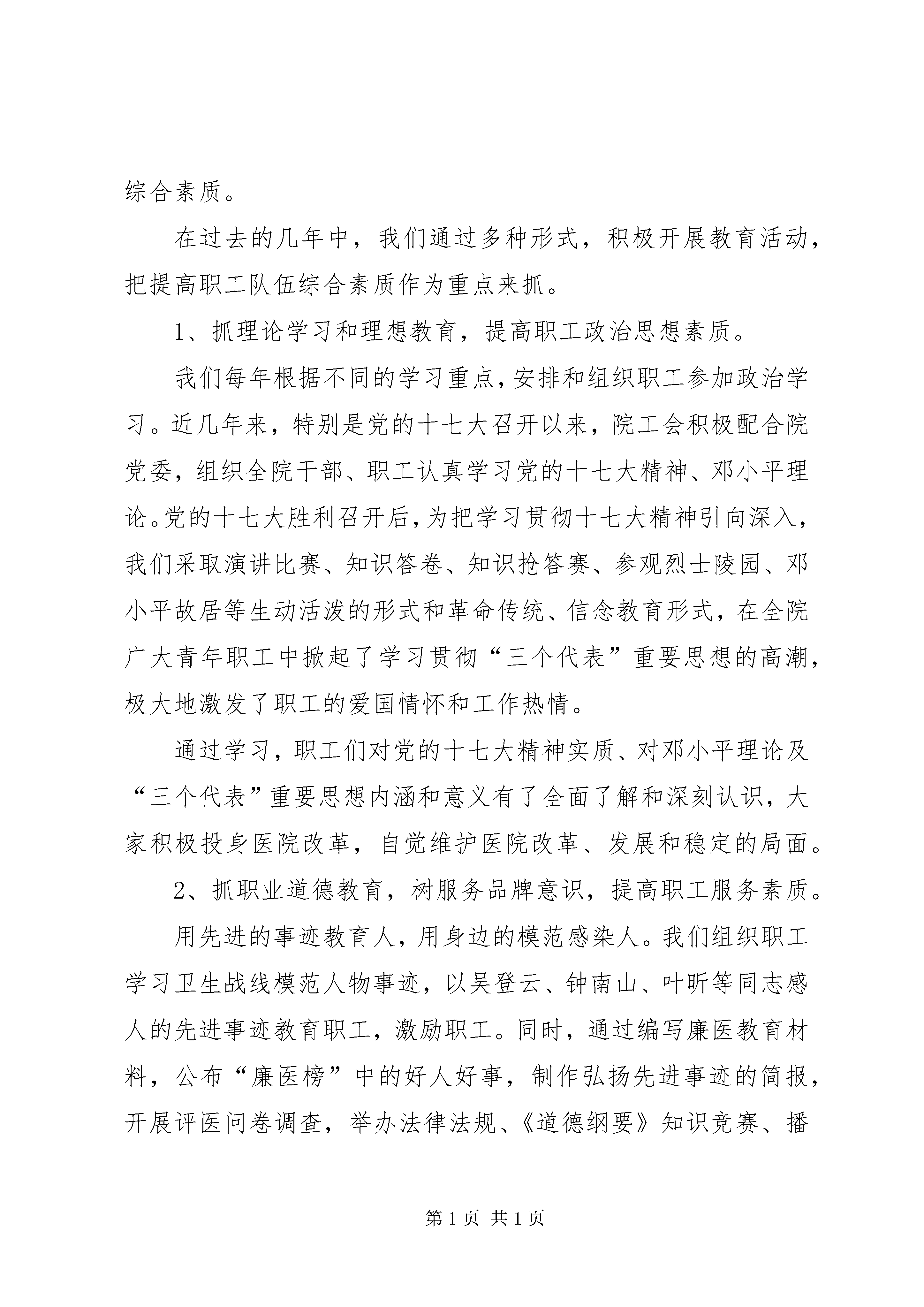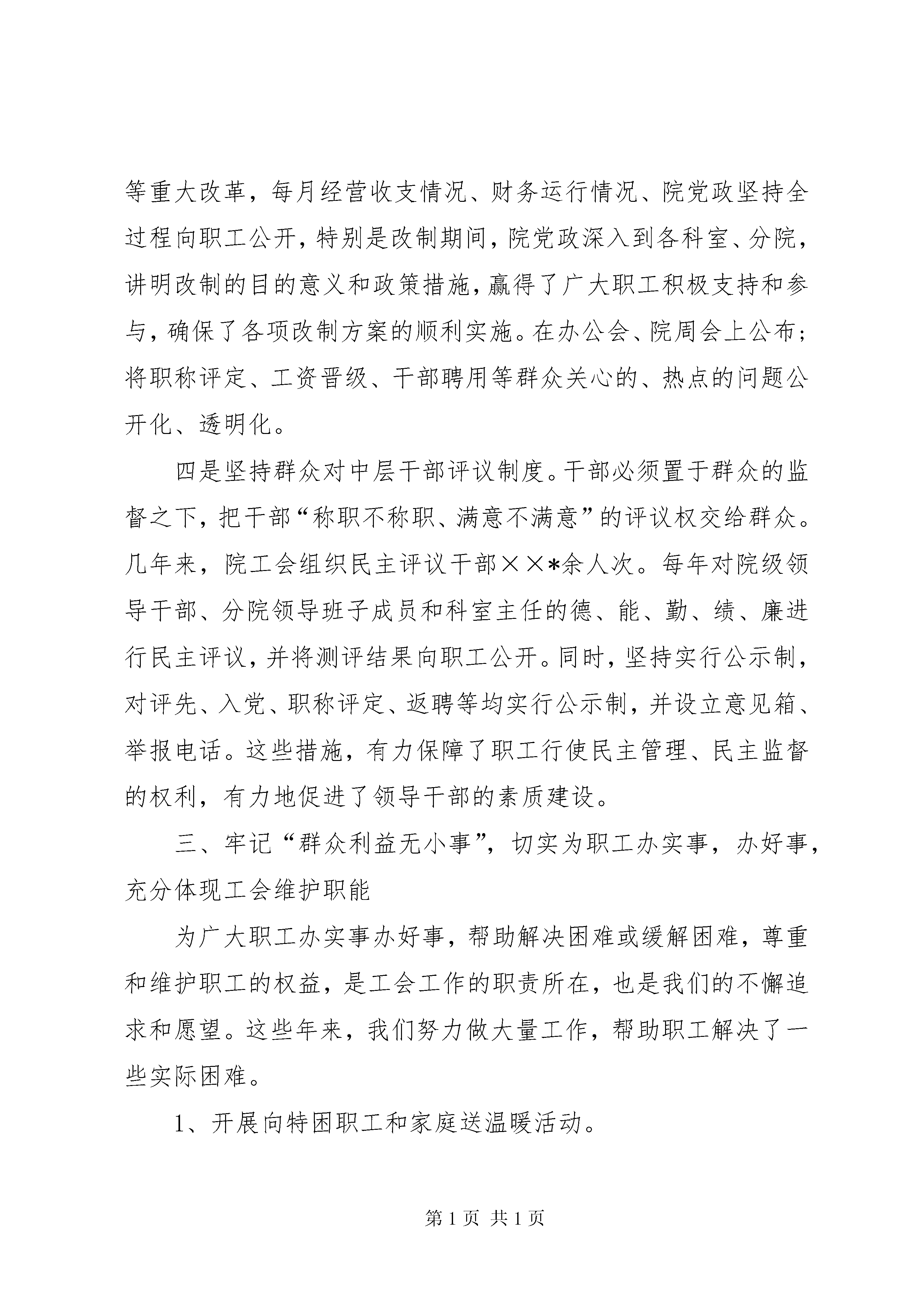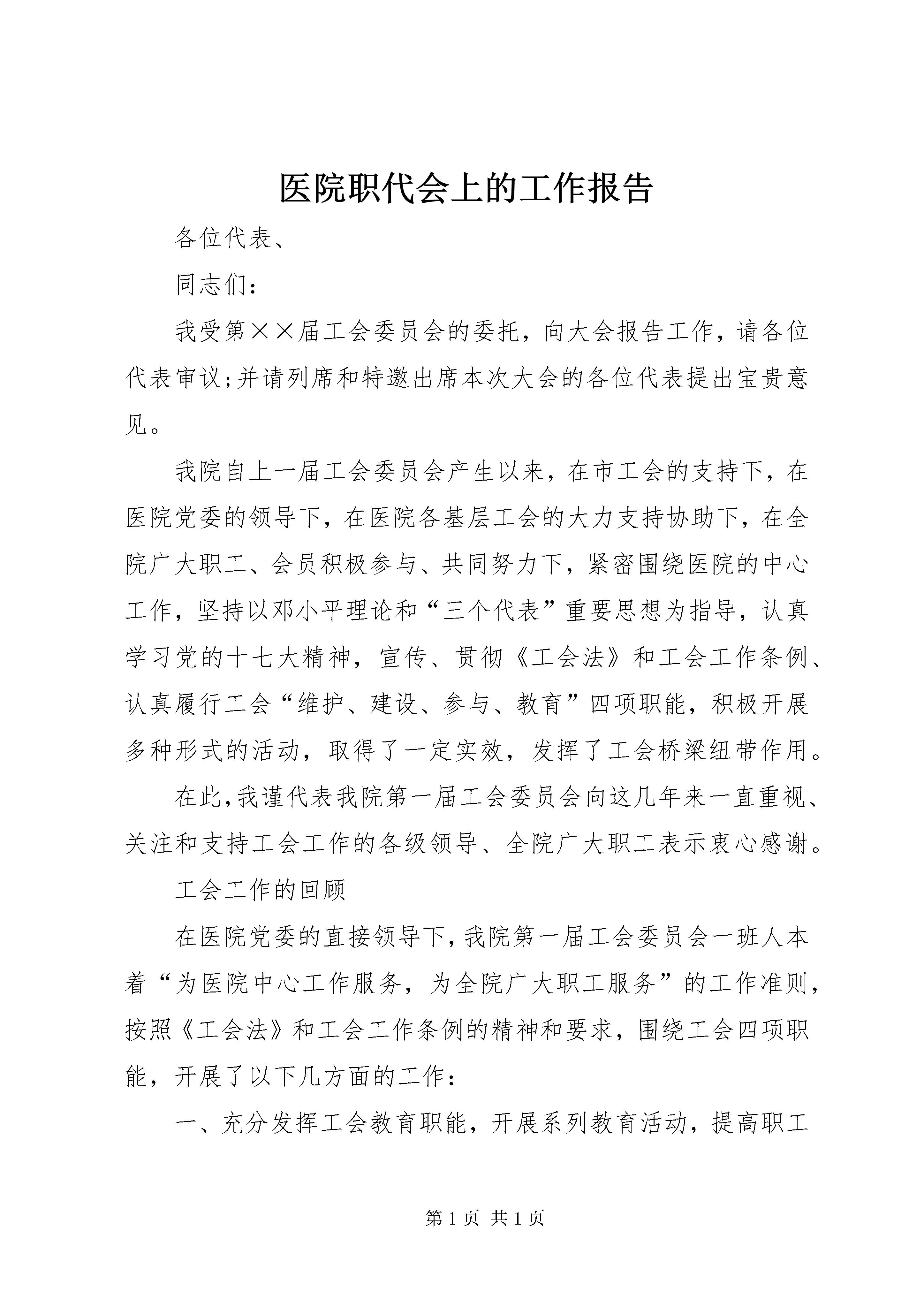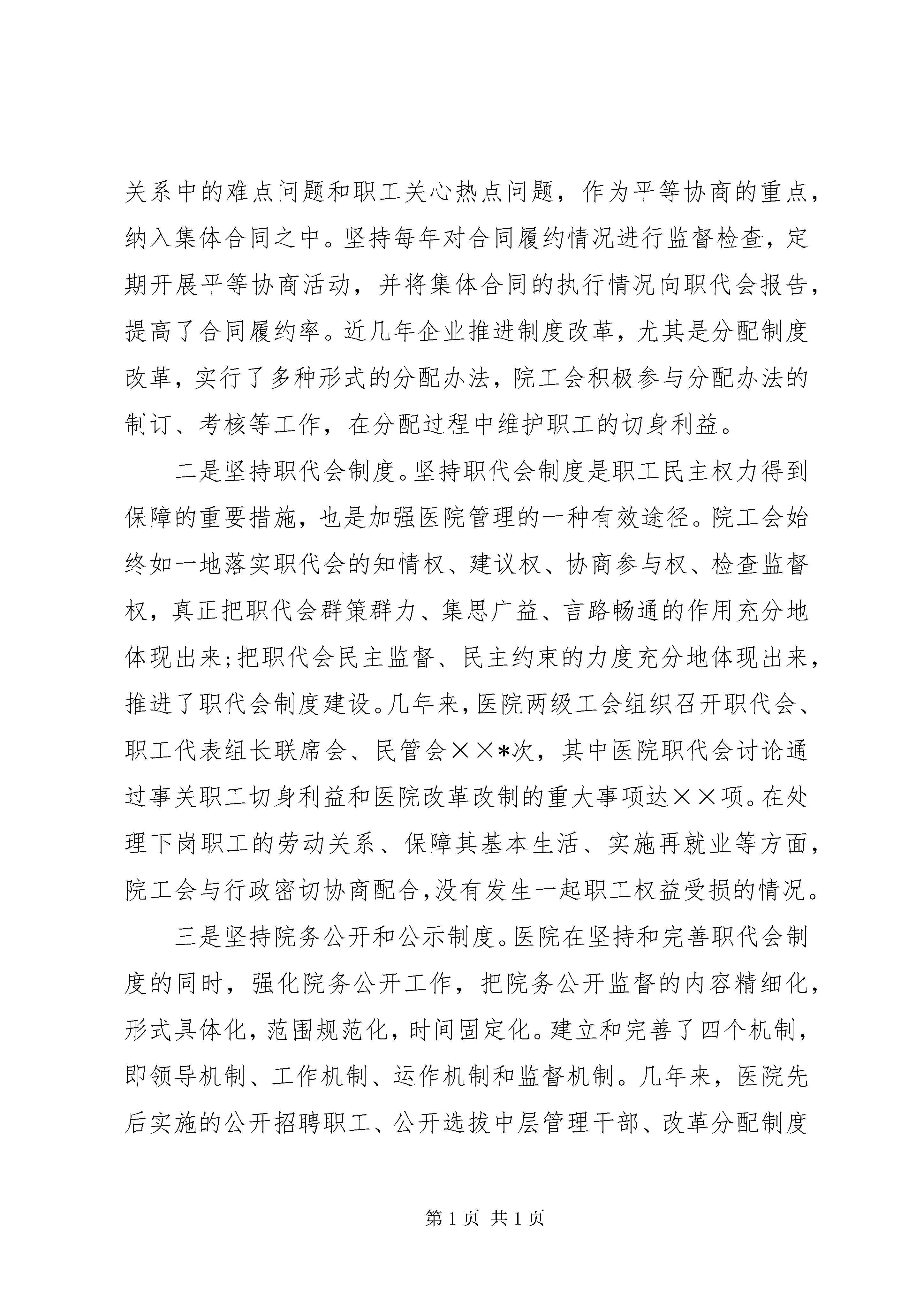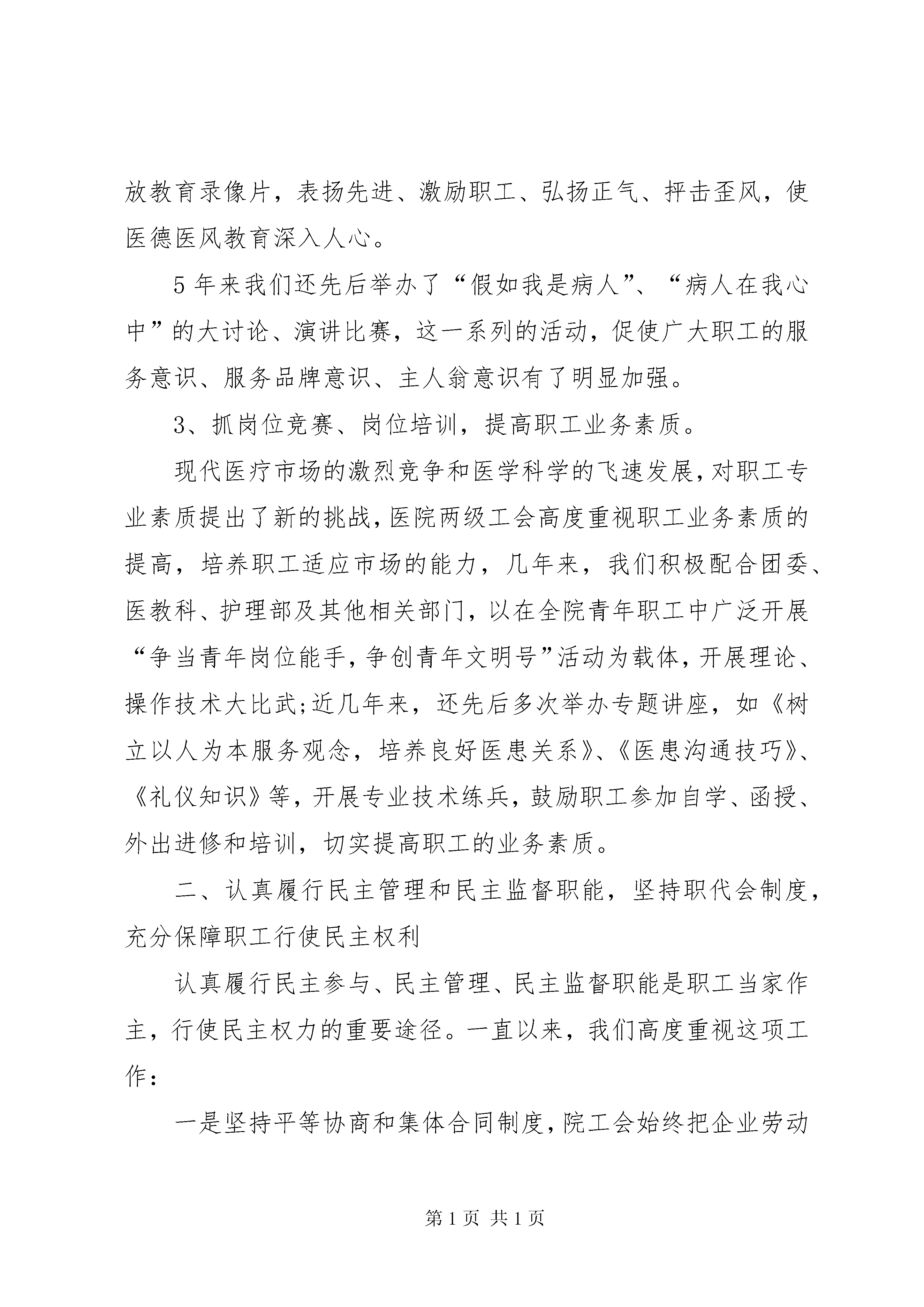 医院职代会上的工作报告各位代表、同志们:我受第××届工会委员会的委托,向大会报告工作,请各位代表审议;并请列席和特邀出席本次大会的各位代表提出宝贵意见。我院自上一届工会委员会产生以来,在市工会的支持下,在医院党委的领导下,在医院各基层工会的大力支持协助下,在全院广大职工、会员积极参与、共同努力下,紧密围绕医院的中心工作,坚持以邓小平理论和“三个代表”重要思想为指导,认真学习党的十七大精神,宣传、贯彻《工会法》和工会工作条例、认真履行工会“维护、建设、参与、教育”四项职能,积极开展多种形式的活动,取得了一定实效,发挥了工会桥梁纽带作用。在此,我谨代表我院第一届工会委员会向这几年来一直重视、关注和支持工会工作的各级领导、全院广大职工表示衷心感谢。工会工作的回顾在医院党委的直接领导下,我院第一届工会委员会一班人本着“为医院中心工作服务,为全院广大职工服务”的工作准则,按照《工会法》和工会工作条例的精神和要求,围绕工会四项职能,开展了以下几方面的工作:一、充分发挥工会教育职能,开展系列教育活动,提高职工综合素质。在过去的几年中,我们通过多种形式,积极开展教育活动,把提高职工队伍综合素质作为重点来抓。1、抓理论学习和理想教育,提高职工政治思想素质。我们每年根据不同的学习重点,安排和组织职工参加政治学习。近几年来,特别是党的十七大召开以来,院工会积极配合院党委,组织全院干部、职工认真学习党的十七大精神、邓小平理论。党的十七大胜利召开后,为把学习贯彻十七大精神引向深入,我们采取演讲比赛、知识答卷、知识抢答赛、参观烈士陵园、邓小平故居等生动活泼的形式和革命传统、信念教育形式,在全院广大青年职工中掀起了学习贯彻“三个代表”重要思想的高潮,极大地激发了职工的爱国情怀和工作热情。通过学习,职工们对党的十七大精神实质、对邓小平理论及“三个代表”重要思想内涵和意义有了全面了解和深刻认识,大家积极投身医院改革,自觉维护医院改革、发展和稳定的局面。2、抓职业道德教育,树服务品牌意识,提高职工服务素质。用先进的事迹教育人,用身边的模范感染人。我们组织职工学习卫生战线模范人物事迹,以吴登云、钟南山、叶昕等同志感人的先进事迹教育职工,激励职工。同时,通过编写廉医教育材料,公布“廉医榜”中的好人好事,制作弘扬先进事迹的简报,开展评医问卷调查,举办法律法规、《道德纲要》知识竞赛、播放教育录像片,表扬先进、激励职工、弘扬正气、抨击歪风,使医德医风教育深入人心。5年来我们还先后举办了“假如我是病人”、“病人在我心中”的大讨论、演讲比赛,这一系列的活动,促使广大职工的服务意识、服务品牌意识、主人翁意识有了明显加强。3、抓岗位竞赛、岗位培训,提高职工业务素质。现代医疗市场的激烈竞争和医学科学的飞速发展,对职工专业素质提出了新的挑战,医院两级工会高度重视职工业务素质的提高,培养职工适应市场的能力,几年来,我们积极配合团委、医教科、护理部及其他相关部门,以在全院青年职工中广泛开展“争当青年岗位能手,争创青年文明号”活动为载体,开展理论、操作技术大比武;近几年来,还先后多次举办专题讲座,如《树立以人为本服务观念,培养良好医患关系》、《医患沟通技巧》、《礼仪知识》等,开展专业技术练兵,鼓励职工参加自学、函授、外出进修和培训,切实提高职工的业务素质。二、认真履行民主管理和民主监督职能,坚持职代会制度,充分保障职工行使民主权利认真履行民主参与、民主管理、民主监督职能是职工当家作主,行使民主权力的重要途径。一直以来,我们高度重视这项工作:一是坚持平等协商和集体合同制度,院工会始终把企业劳动关系中的难点问题和职工关心热点问题,作为平等协商的重点,纳入集体合同之中。坚持每年对合同履约情况进行监督检查,定期开展平等协商活动,并将集体合同的执行情况向职代会报告,提高了合同履约率。近几年企业推进制度改革,尤其是分配制度改革,实行了多种形式的分配办法,院工会积极参与分配办法的制订、考核等工作,在分配过程中维护职工的切身利益。二是坚持职代会制度。坚持职代会制度是职工民主权力得到保障的重要措施,也是加强医院管理的一种有效途径。院工会始终如一地落实职代会的知情权、建议权、协商参与权、检查监督权,真正把职代会群策群力、集思广益、言路畅通的作用充分地体现出来;把职代会民主监督、民主约束的力度充分地体现出来,推进了职代会制度建设。几年来,医院两级工会组织召开职代会、职工代表组长联席会、民管会××*次,其中医院职代会讨论通过事关职工切身利益和医院改革改制的重大事项达××项。在处理下岗职工的劳动关系、保障其基本生活、实施再就业等方面,院工会与行政密切协商配合,没有发生一起职工权益受损的情况。三是坚持院务公开和公示制度。医院在坚持和完善职代会制度的同时,强化院务公开工作,把院务公开监督的内容