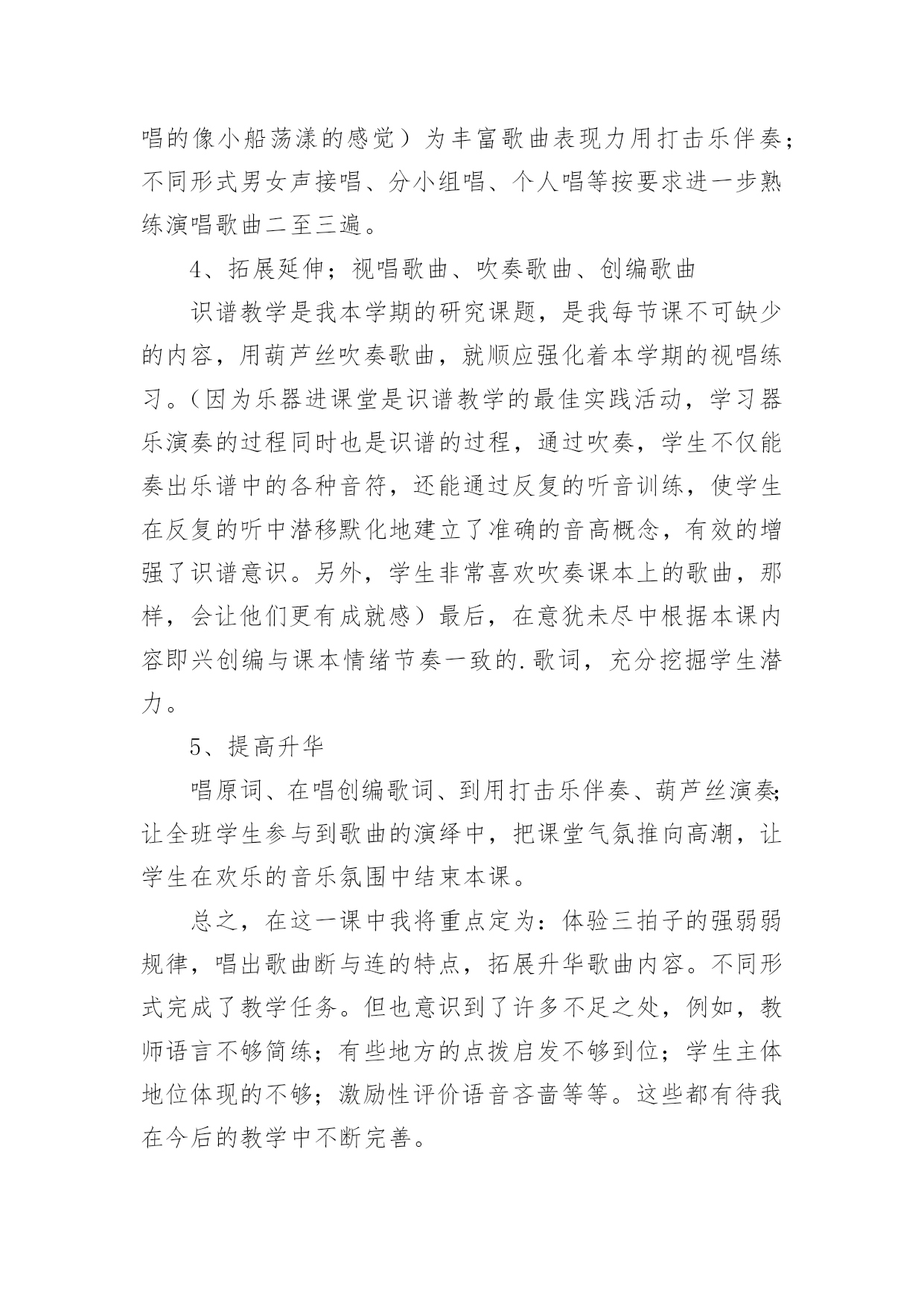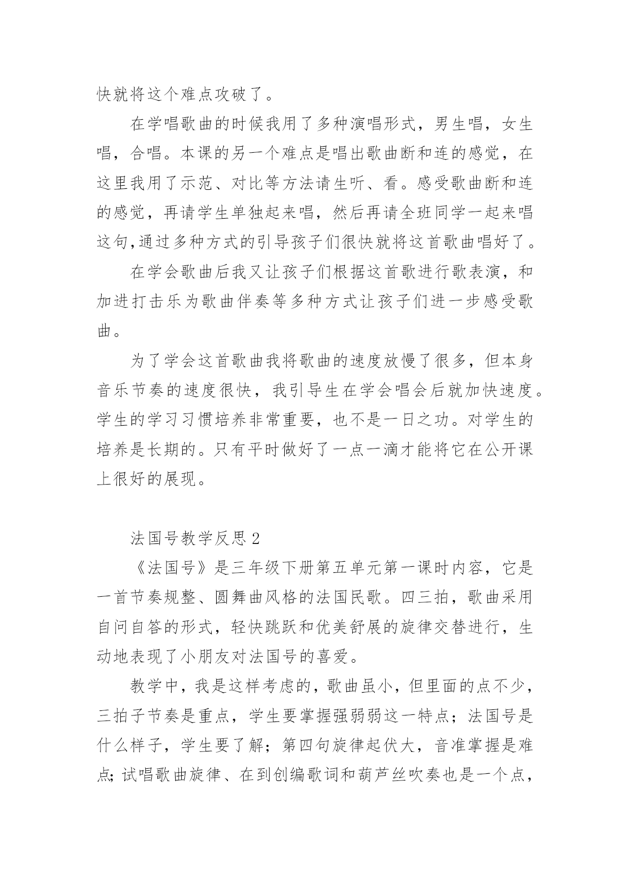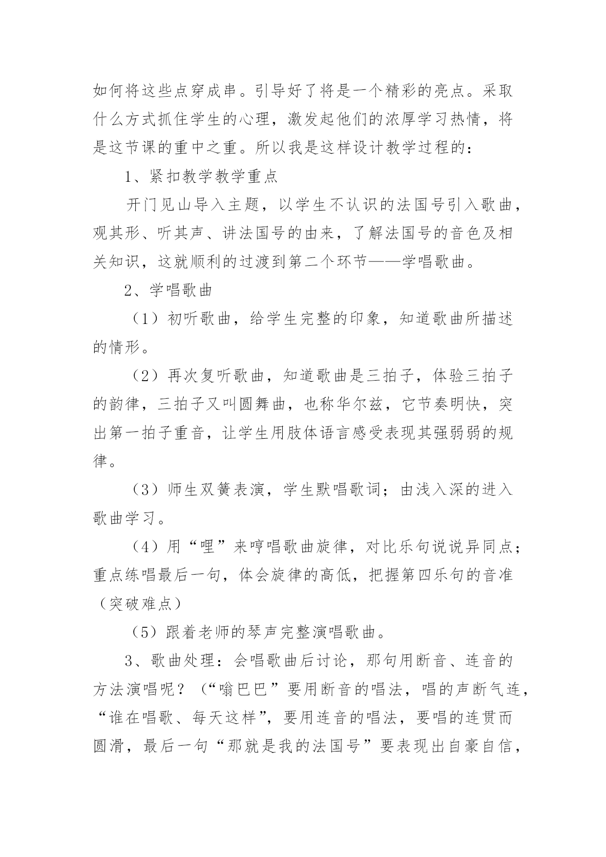 法国号教学反思 法国号教学反思范文(精选3篇)作为一位刚到岗的人民教师,我们要在课堂教学中快速成长,写教学反思能总结我们的教学经验,来参考自己需要的教学反思吧!以下是小编为大家收集的法国号教学反思范文(精选3篇),欢迎阅读与收藏。法国号教学反思1《法国号》这一歌曲短小精练,朗朗上口,歌词和音调很形象的模仿了法国号,深深的吸引了孩子们。在这一课中我将重点定为:唱出三拍子的强弱弱规律。并唱出歌曲断与连的特点。首先我请学生为歌曲拍出它的强弱,大部分的孩子都能准确的拍出强弱弱的规律。为了让他们更好的掌握强弱拍,我引导他们用多种形式去拍弱拍,如:拍腿、拍肩、拍肚子等。学生掌握的非常好,兴致也很高。但在这里我忽略了一点,没有恰到好处的去引导他们让他们带上表情去拍手。其次,在读歌词的环节,带入强弱朗读歌词,带入难点:“那就是我的法国号”。提出来单独的读出来请学生听我将哪2个字读的长些。通过听他们很快就发现了“我”、“法”字拖的长些。当他们找出来后我再请全班同学一起来读一读,让孩子们重视到这个地方的节奏应该是怎样的。这样他们很快就将这个难点攻破了。在学唱歌曲的时候我用了多种演唱形式,男生唱,女生唱,合唱。本课的另一个难点是唱出歌曲断和连的感觉,在这里我用了示范、对比等方法请生听、看。感受歌曲断和连的感觉,再请学生单独起来唱,然后再请全班同学一起来唱这句,通过多种方式的引导孩子们很快就将这首歌曲唱好了。在学会歌曲后我又让孩子们根据这首歌进行歌表演,和加进打击乐为歌曲伴奏等多种方式让孩子们进一步感受歌曲。为了学会这首歌曲我将歌曲的速度放慢了很多,但本身音乐节奏的速度很快,我引导生在学会唱会后就加快速度。学生的学习习惯培养非常重要,也不是一日之功。对学生的培养是长期的。只有平时做好了一点一滴才能将它在公开课上很好的展现。法国号教学反思2《法国号》是三年级下册第五单元第一课时内容,它是一首节奏规整、圆舞曲风格的法国民歌。四三拍,歌曲采用自问自答的形式,轻快跳跃和优美舒展的旋律交替进行,生动地表现了小朋友对法国号的喜爱。教学中,我是这样考虑的,歌曲虽小,但里面的点不少,三拍子节奏是重点,学生要掌握强弱弱这一特点;法国号是什么样子,学生要了解;第四句旋律起伏大,音准掌握是难点;试唱歌曲旋律、在到创编歌词和葫芦丝吹奏也是一个点,如何将这些点穿成串。引导好了将是一个精彩的亮点。采取什么方式抓住学生的心理,激发起他们的浓厚学习热情,将是这节课的重中之重。所以我是这样设计教学过程的:1、紧扣教学教学重点开门见山导入主题,以学生不认识的法国号引入歌曲,观其形、听其声、讲法国号的由来,了解法国号的音色及相关知识,这就顺利的过渡到第二个环节——学唱歌曲。2、学唱歌曲(1)初听歌曲,给学生完整的印象,知道歌曲所描述的情形。(2)再次复听歌曲,知道歌曲是三拍子,体验三拍子的韵律,三拍子又叫圆舞曲,也称华尔兹,它节奏明快,突出第一拍子重音,让学生用肢体语言感受表现其强弱弱的规律。(3)师生双簧表演,学生默唱歌词;由浅入深的进入歌曲学习。(4)用“哩”来哼唱歌曲旋律,对比乐句说说异同点;重点练唱最后一句,体会旋律的高低,把握第四乐句的音准(突破难点)(5)跟着老师的琴声完整演唱歌曲。3、歌曲处理:会唱歌曲后讨论,那句用断音、连音的方法演唱呢?(“嗡巴巴”要用断音的唱法,唱的声断气连,“谁在唱歌、每天这样”,要用连音的唱法,要唱的连贯而圆滑,最后一句“那就是我的法国号”要表现出自豪自信,唱的像小船荡漾的感觉)为丰富歌曲表现力用打击乐伴奏;不同形式男女声接唱、分小组唱、个人唱等按要求进一步熟练演唱歌曲二至三遍。4、拓展延伸;视唱歌曲、吹奏歌曲、创编歌曲识谱教学是我本学期的研究课题,是我每节课不可缺少的内容,用葫芦丝吹奏歌曲,就顺应强化着本学期的视唱练习。(因为乐器进课堂是识谱教学的最佳实践活动,学习器乐演奏的过程同时也是识谱的过程,通过吹奏,学生不仅能奏出乐谱中的各种音符,还能通过反复的听音训练,使学生在反复的听中潜移默化地建立了准确的音高概念,有效的增强了识谱意识。另外,学生非常喜欢吹奏课本上的歌曲,那样,会让他们更有成就感)最后,在意犹未尽中根据本课内容即兴创编与课本情绪节奏一致的.歌词,充分挖掘学生潜力。5、提高升华唱原词、在唱创编歌词、到用打击乐伴奏、葫芦丝演奏;让全班学生参与到歌曲的演绎中,把课堂气氛推向高潮,让学生在欢乐的音乐氛围中结束本课。总之,在这一课中我将重点定为:体验三拍子的强弱弱规律,唱出歌曲断与连的特点,拓展升华歌曲内容。不同形式完成了教学任务。但也意识到了许多不足之处,例如,教师语言不够简练;有些地方的点拨启发不够到位;学生主体地位体现的不够;激励性评价语音吝啬等等。这些都有待我在今后的教学中不断完善。法国号教学反思3音乐是听觉的艺术,通过不同方式、不