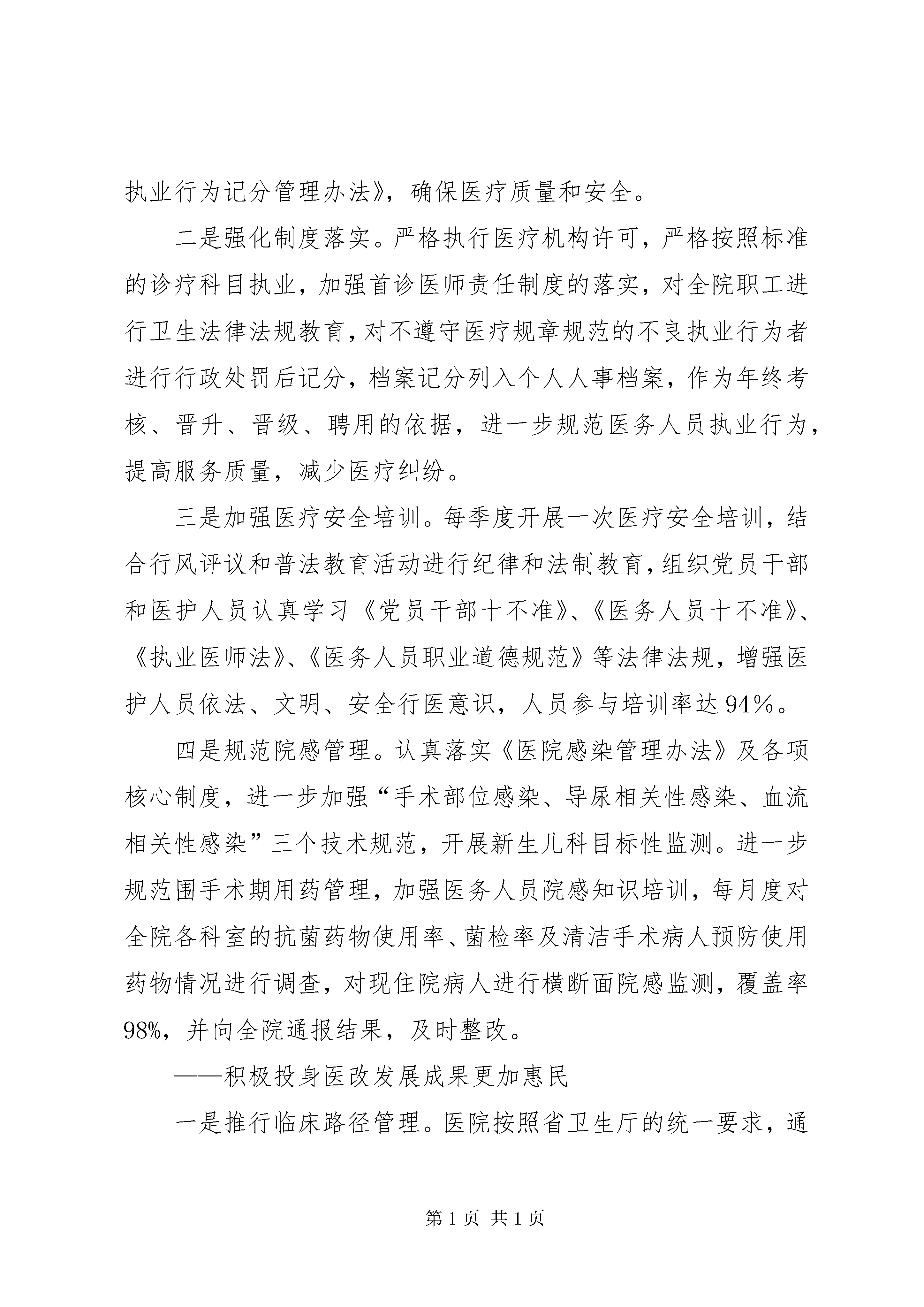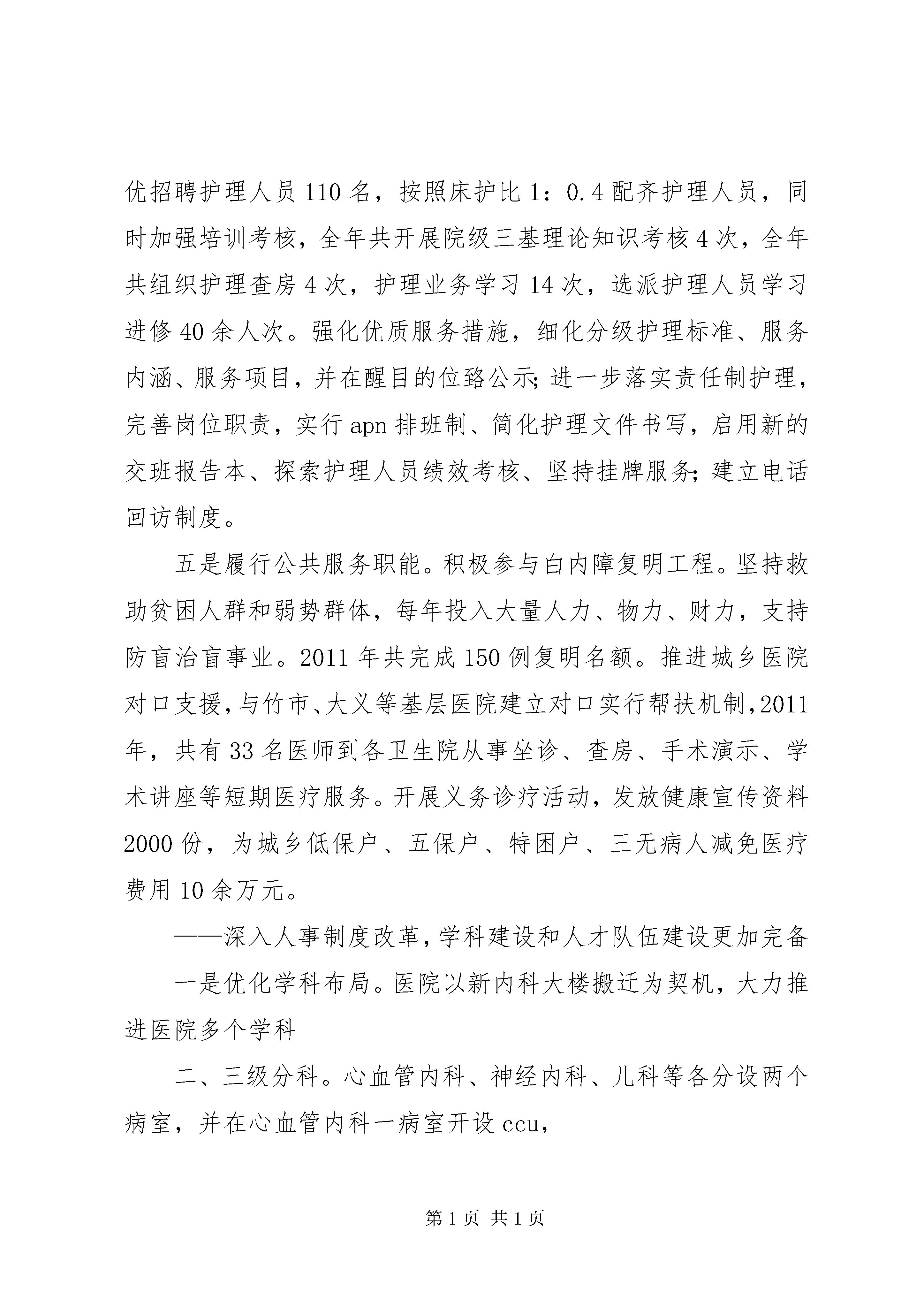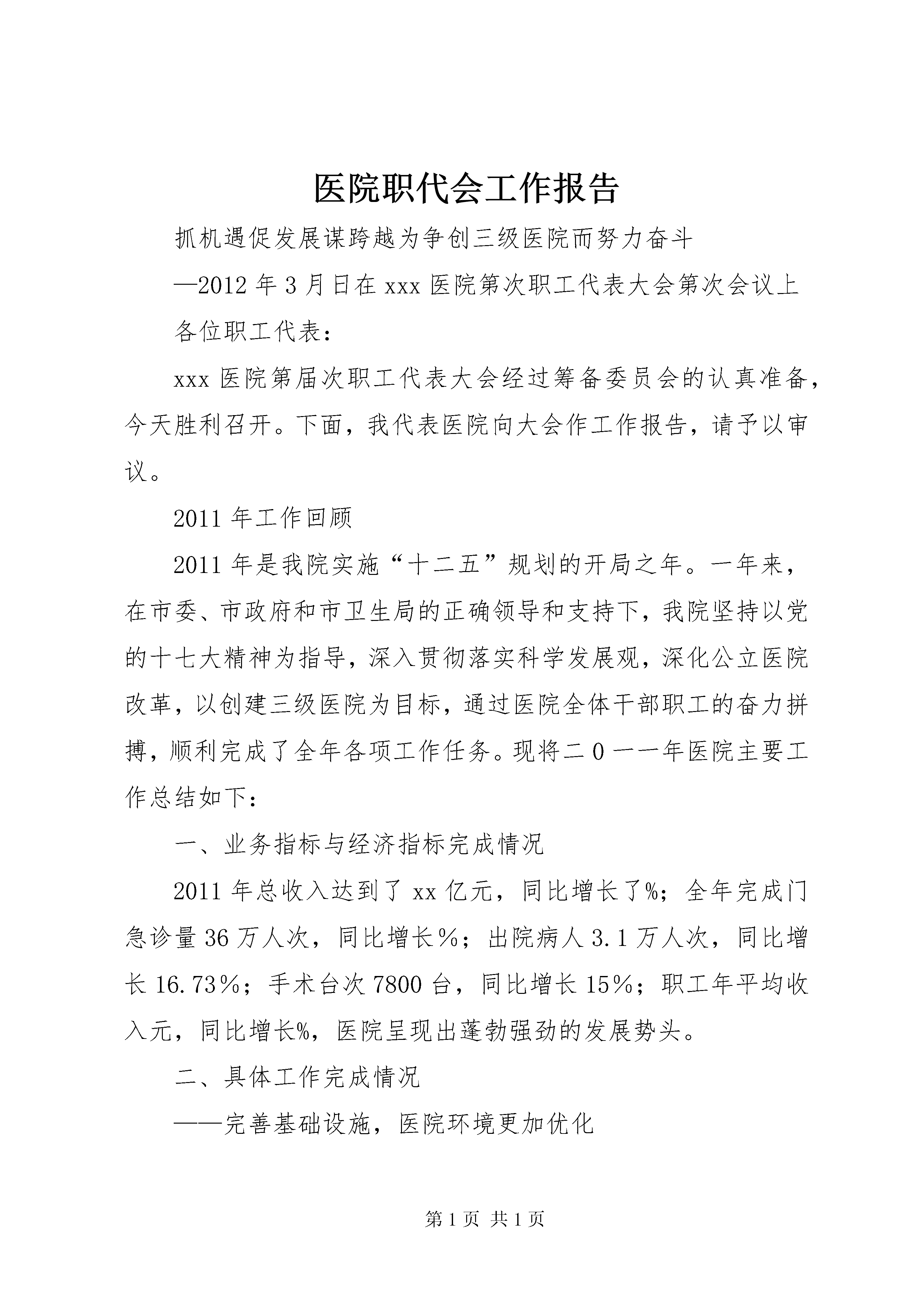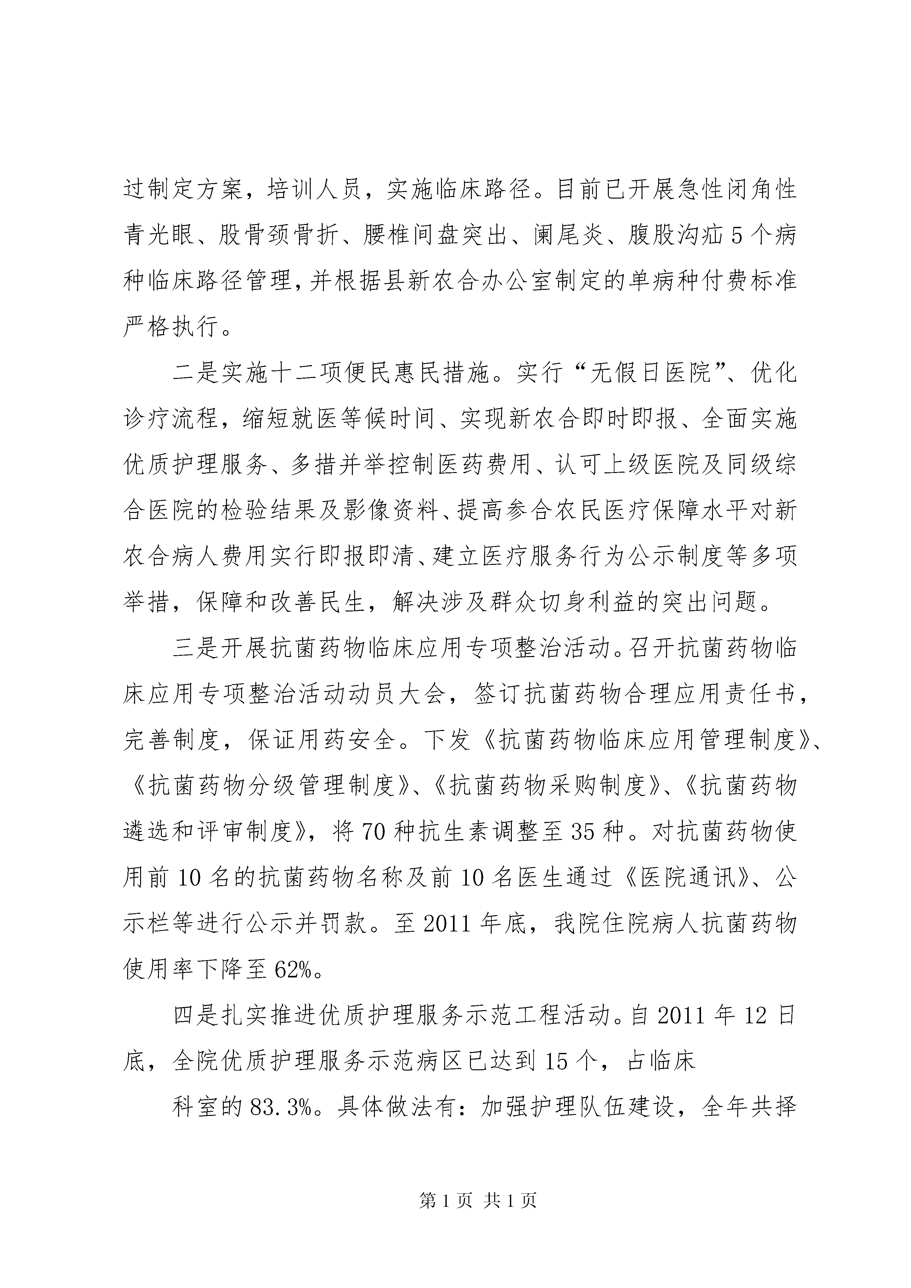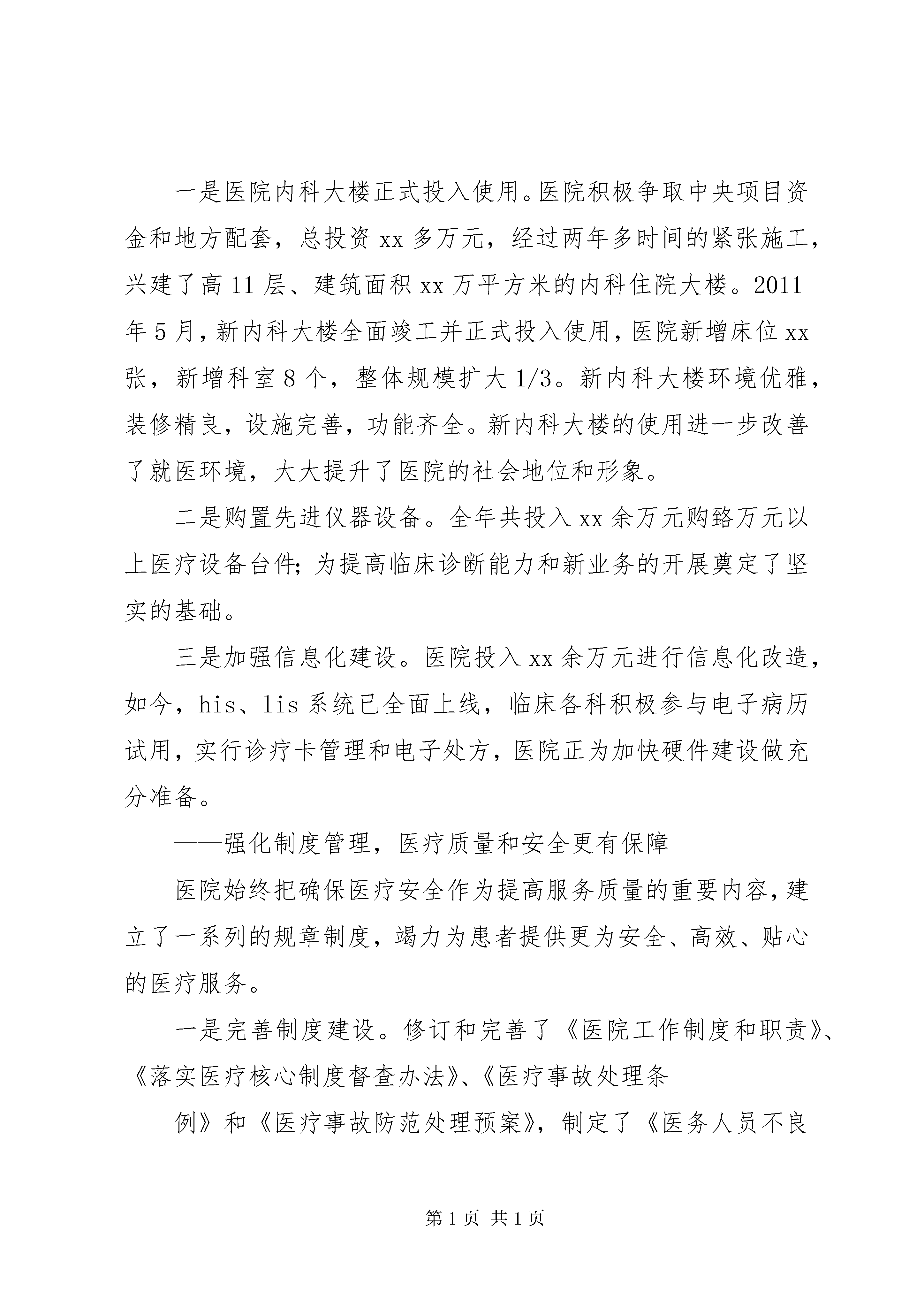 医院职代会工作报告抓机遇促发展谋跨越为争创三级医院而努力奋斗—2012年3月日在xxx医院第次职工代表大会第次会议上各位职工代表:xxx医院第届次职工代表大会经过筹备委员会的认真准备,今天胜利召开。下面,我代表医院向大会作工作报告,请予以审议。2011年工作回顾2011年是我院实施“十二五”规划的开局之年。一年来,在市委、市政府和市卫生局的正确领导和支持下,我院坚持以党的十七大精神为指导,深入贯彻落实科学发展观,深化公立医院改革,以创建三级医院为目标,通过医院全体干部职工的奋力拼搏,顺利完成了全年各项工作任务。现将二0一一年医院主要工作总结如下:一、业务指标与经济指标完成情况2011年总收入达到了xx亿元,同比增长了%;全年完成门急诊量36万人次,同比增长%;出院病人3.1万人次,同比增长16.73%;手术台次7800台,同比增长15%;职工年平均收入元,同比增长%,医院呈现出蓬勃强劲的发展势头。二、具体工作完成情况——完善基础设施,医院环境更加优化一是医院内科大楼正式投入使用。医院积极争取中央项目资金和地方配套,总投资xx多万元,经过两年多时间的紧张施工,兴建了高11层、建筑面积xx万平方米的内科住院大楼。2011年5月,新内科大楼全面竣工并正式投入使用,医院新增床位xx张,新增科室8个,整体规模扩大1/3。新内科大楼环境优雅,装修精良,设施完善,功能齐全。新内科大楼的使用进一步改善了就医环境,大大提升了医院的社会地位和形象。二是购置先进仪器设备。全年共投入xx余万元购臵万元以上医疗设备台件;为提高临床诊断能力和新业务的开展奠定了坚实的基础。三是加强信息化建设。医院投入xx余万元进行信息化改造,如今,his、lis系统已全面上线,临床各科积极参与电子病历试用,实行诊疗卡管理和电子处方,医院正为加快硬件建设做充分准备。——强化制度管理,医疗质量和安全更有保障医院始终把确保医疗安全作为提高服务质量的重要内容,建立了一系列的规章制度,竭力为患者提供更为安全、高效、贴心的医疗服务。一是完善制度建设。修订和完善了《医院工作制度和职责》、《落实医疗核心制度督查办法》、《医疗事故处理条例》和《医疗事故防范处理预案》,制定了《医务人员不良执业行为记分管理办法》,确保医疗质量和安全。二是强化制度落实。严格执行医疗机构许可,严格按照标准的诊疗科目执业,加强首诊医师责任制度的落实,对全院职工进行卫生法律法规教育,对不遵守医疗规章规范的不良执业行为者进行行政处罚后记分,档案记分列入个人人事档案,作为年终考核、晋升、晋级、聘用的依据,进一步规范医务人员执业行为,提高服务质量,减少医疗纠纷。三是加强医疗安全培训。每季度开展一次医疗安全培训,结合行风评议和普法教育活动进行纪律和法制教育,组织党员干部和医护人员认真学习《党员干部十不准》、《医务人员十不准》、《执业医师法》、《医务人员职业道德规范》等法律法规,增强医护人员依法、文明、安全行医意识,人员参与培训率达94%。四是规范院感管理。认真落实《医院感染管理办法》及各项核心制度,进一步加强“手术部位感染、导尿相关性感染、血流相关性感染”三个技术规范,开展新生儿科目标性监测。进一步规范围手术期用药管理,加强医务人员院感知识培训,每月度对全院各科室的抗菌药物使用率、菌检率及清洁手术病人预防使用药物情况进行调查,对现住院病人进行横断面院感监测,覆盖率98%,并向全院通报结果,及时整改。——积极投身医改发展成果更加惠民一是推行临床路径管理。医院按照省卫生厅的统一要求,通过制定方案,培训人员,实施临床路径。目前已开展急性闭角性青光眼、股骨颈骨折、腰椎间盘突出、阑尾炎、腹股沟疝5个病种临床路径管理,并根据县新农合办公室制定的单病种付费标准严格执行。二是实施十二项便民惠民措施。实行“无假日医院”、优化诊疗流程,缩短就医等候时间、实现新农合即时即报、全面实施优质护理服务、多措并举控制医药费用、认可上级医院及同级综合医院的检验结果及影像资料、提高参合农民医疗保障水平对新农合病人费用实行即报即清、建立医疗服务行为公示制度等多项举措,保障和改善民生,解决涉及群众切身利益的突出问题。三是开展抗菌药物临床应用专项整治活动。召开抗菌药物临床应用专项整治活动动员大会,签订抗菌药物合理应用责任书,完善制度,保证用药安全。下发《抗菌药物临床应用管理制度》、《抗菌药物分级管理制度》、《抗菌药物采购制度》、《抗菌药物遴选和评审制度》,将70种抗生素调整至35种。对抗菌药物使用前10名的抗菌药物名称及前10名医生通过《医院通讯》、公示栏等进行公示并罚款。至2011年底,我院住院病人抗菌药物使用率下降至62%。四是扎实推进优质护理服务示范工程活动。自2011年12日底,全院优质护理服务示范病区已达到15个,占临床科室的8