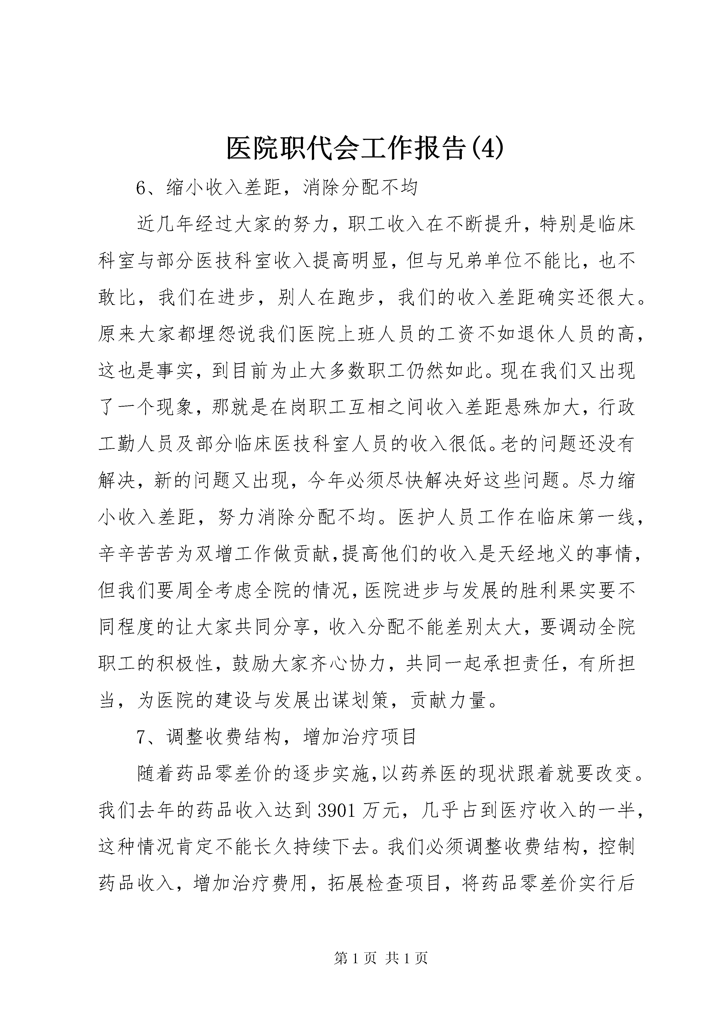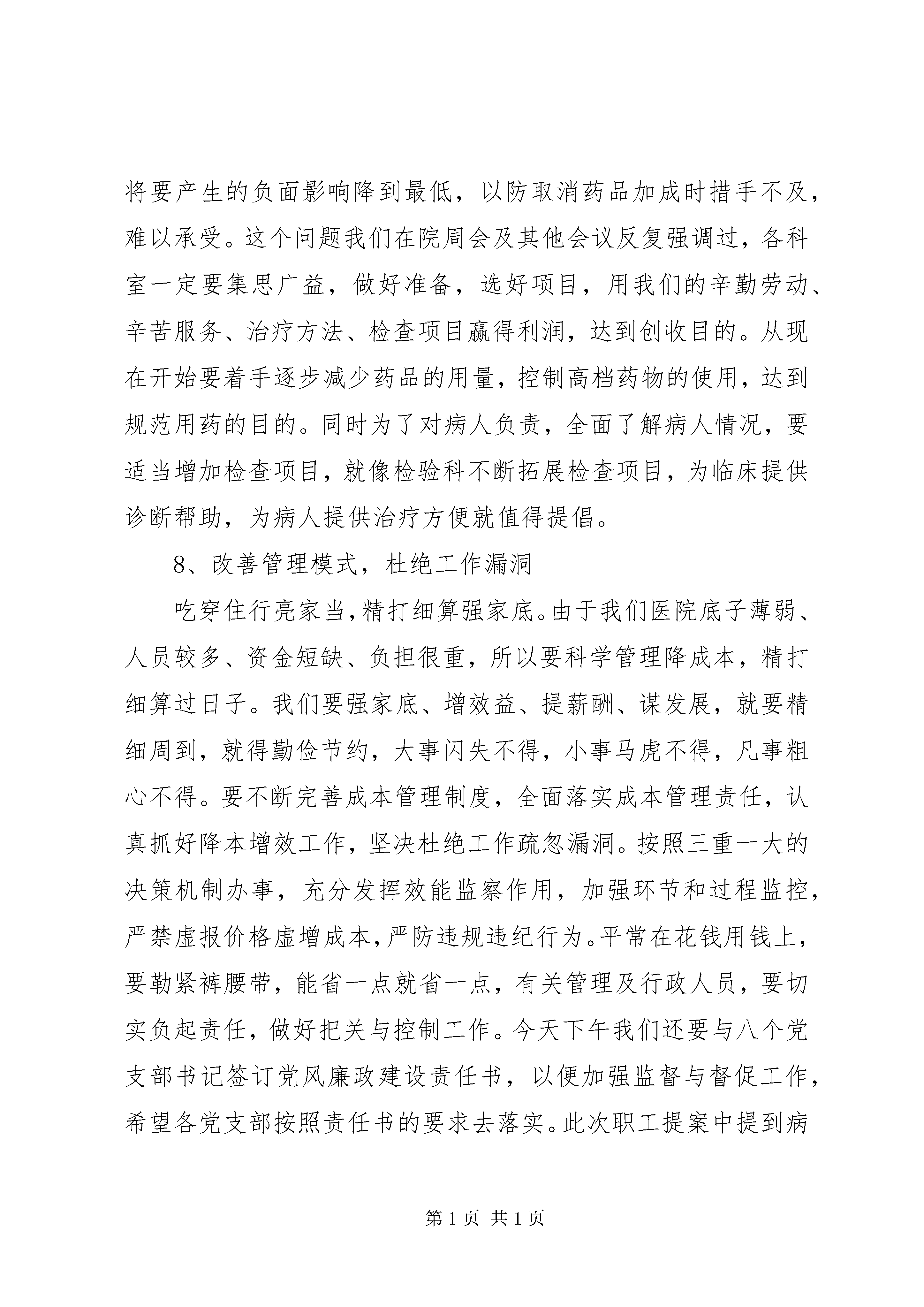 医院职代会工作报告(4)6、缩小收入差距,消除分配不均近几年经过大家的努力,职工收入在不断提升,特别是临床科室与部分医技科室收入提高明显,但与兄弟单位不能比,也不敢比,我们在进步,别人在跑步,我们的收入差距确实还很大。原来大家都埋怨说我们医院上班人员的工资不如退休人员的高,这也是事实,到目前为止大多数职工仍然如此。现在我们又出现了一个现象,那就是在岗职工互相之间收入差距悬殊加大,行政工勤人员及部分临床医技科室人员的收入很低。老的问题还没有解决,新的问题又出现,今年必须尽快解决好这些问题。尽力缩小收入差距,努力消除分配不均。医护人员工作在临床第一线,辛辛苦苦为双增工作做贡献,提高他们的收入是天经地义的事情,但我们要周全考虑全院的情况,医院进步与发展的胜利果实要不同程度的让大家共同分享,收入分配不能差别太大,要调动全院职工的积极性,鼓励大家齐心协力,共同一起承担责任,有所担当,为医院的建设与发展出谋划策,贡献力量。7、调整收费结构,增加治疗项目随着药品零差价的逐步实施,以药养医的现状跟着就要改变。我们去年的药品收入达到3901万元,几乎占到医疗收入的一半,这种情况肯定不能长久持续下去。我们必须调整收费结构,控制药品收入,增加治疗费用,拓展检查项目,将药品零差价实行后将要产生的负面影响降到最低,以防取消药品加成时措手不及,难以承受。这个问题我们在院周会及其他会议反复强调过,各科室一定要集思广益,做好准备,选好项目,用我们的辛勤劳动、辛苦服务、治疗方法、检查项目赢得利润,达到创收目的。从现在开始要着手逐步减少药品的用量,控制高档药物的使用,达到规范用药的目的。同时为了对病人负责,全面了解病人情况,要适当增加检查项目,就像检验科不断拓展检查项目,为临床提供诊断帮助,为病人提供治疗方便就值得提倡。8、改善管理模式,杜绝工作漏洞吃穿住行亮家当,精打细算强家底。由于我们医院底子薄弱、人员较多、资金短缺、负担很重,所以要科学管理降成本,精打细算过日子。我们要强家底、增效益、提薪酬、谋发展,就要精细周到,就得勤俭节约,大事闪失不得,小事马虎不得,凡事粗心不得。要不断完善成本管理制度,全面落实成本管理责任,认真抓好降本增效工作,坚决杜绝工作疏忽漏洞。按照三重一大的决策机制办事,充分发挥效能监察作用,加强环节和过程监控,严禁虚报价格虚增成本,严防违规违纪行为。平常在花钱用钱上,要勒紧裤腰带,能省一点就省一点,有关管理及行政人员,要切实负起责任,做好把关与控制工作。今天下午我们还要与八个党支部书记签订党风廉政建设责任书,以便加强监督与督促工作,希望各党支部按照责任书的要求去落实。此次职工提案中提到病区装修存在浪费很大、装修粗糙、材料劣质、省工减料、价钱昂贵等,结果造成大家辛辛苦苦赚来的钱轻而易举的流入别人的腰包,这要引起我们高度重视,引以为戒。各位代表、同志们:xx年摆在我们面前的任务相当繁重,我们要继续深入贯彻落实党的十八大精神,以科学发展观为指导,在集团总公司的正确领导下,在全院职工的坚定支持下,统一思想认识,创新工作思路,转变工作作风,强化质量管理,提升服务水平,继续开拓进取,不断攻坚克难,团结一条心,凝聚正能量,为顺利完成今年的各项目标任务,为建设小康社会、创建美丽医院而努力奋斗。