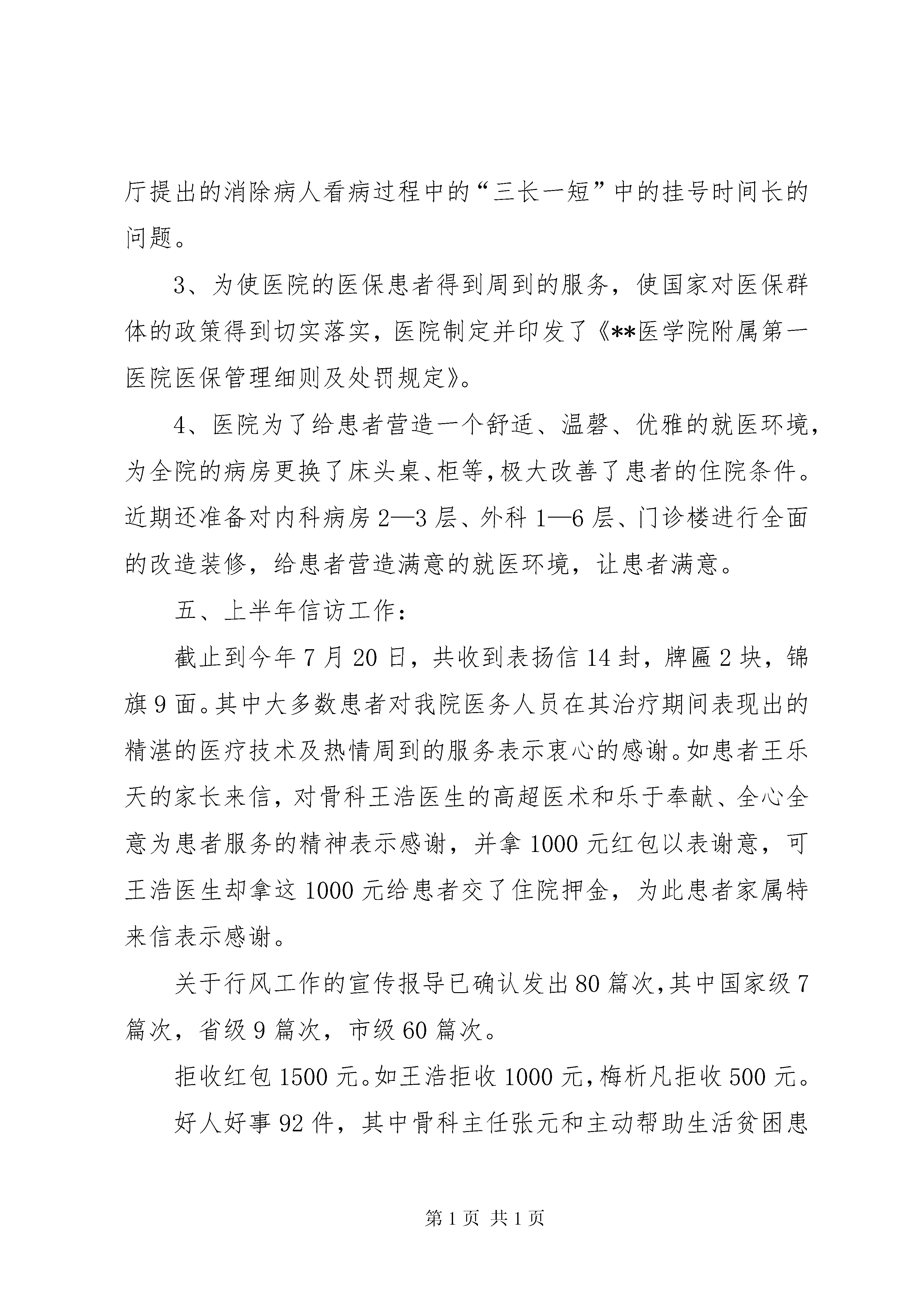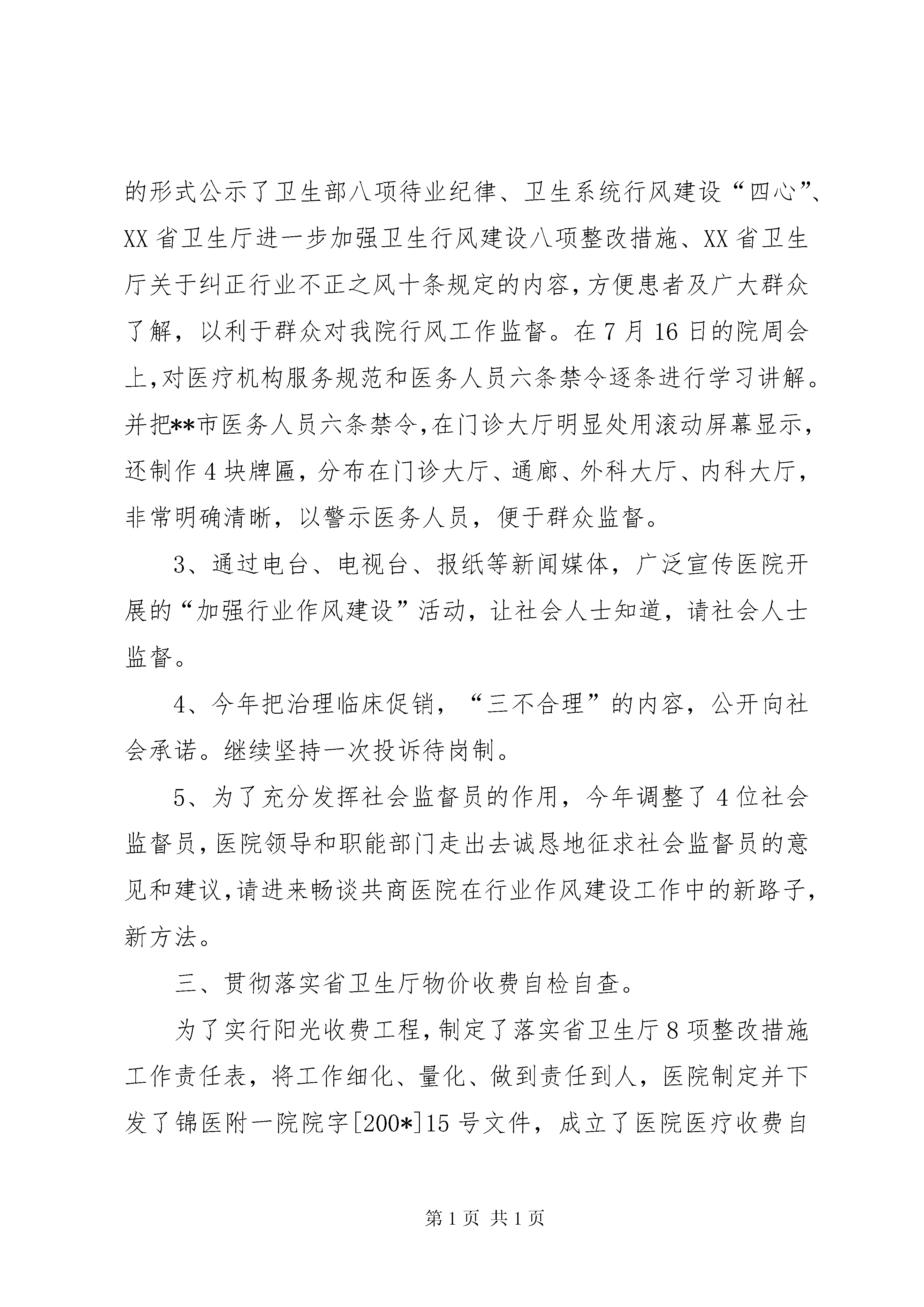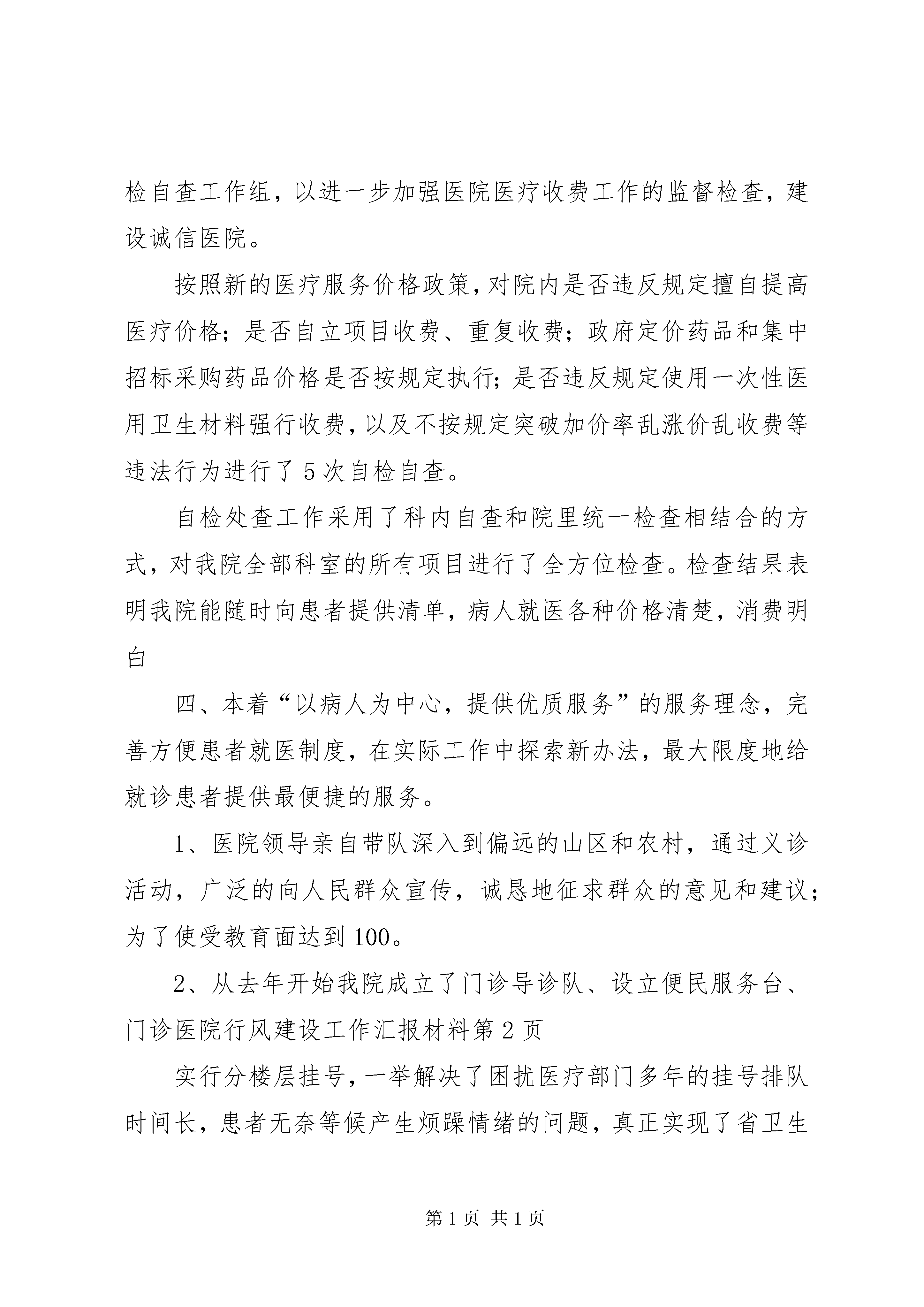 医院行风建设工作汇报材料文章标题:医院行风建设工作汇报材料**医学院附属第一医院新一届领导班子,以开拓创新、求真务实的态度,结合我院实际,将行风建设工作落实到医疗卫生管理工作的各个环节。使行风工作思路清晰,方向明确,抓出实效。一、认真贯彻落实卫生部、省委、省政府、省卫生厅关于行风建设工作的部署和要求,加强党风廉政建设,深入开展行风建设工作,形成统一领导,分工负责的态势,全面启动行风建设工作。为了加快医院行风建设的步伐,进一步提高服务质量,完善服务内涵,切实提高医院服务品位和职工的服务素质,我院党委多次立会研究如何贯彻落实《XX省卫生系统加强行业作风建设工作实施意见》。把开展加强行业作风建设活动纳入20XX年医院的重点工作。1、成立“开展加强行业作风建设活动”领导小组,组长由党、政一把手担任,在医德医风建设中实行了一把手工程。分别成立了:门诊、内科、外科、医技、后勤组、监督检查等6个工作组。形成了分工细致,责任明确、协同管理、整体推进的工作局面。2、先后四次召开了全体中层干部参加的行业作风建设专题工作会议,举办中层干部行业作风建设学习班。3、医院向各部、处、室印发了《**医学院附属第一医院20XX年开展加强行业作风建设工作实施方案》,使该项活动人人知道,人人参与,人人监督,形成一种良好的工作氛围。4、转发了XX省卫生厅关于纠正行业不正之风规定、20XX年XX省卫生系统加强行业作风建设工作实施意见,制定下发了锦医附属第一医院贯彻落实XX省卫生厅8项整改方案及整改措施工作责任表。5、为了保证活动的顺利开展,党委研究决定下发了锦医附一院党字[200*]7号、锦医附一院院字[200*]23号文件《**医学院附属第一医院20XX年开展加强行业作风建设工作实施方案》,为使行风工作抓出成效,经党委研究任命一名主抓此项工作的副主任,负责日常工作,做到有专人抓,专人管。二、加大宣传力度,加强监督和管理机制。1、院党委认真落实20XX年行风工作实施方案,坚持教育先行,陶冶情操。组织全院职工认真学习了卫生部副部长高强同志谈纠正不正之风《重拳直指卫生行业不正之风》等材料,结合省人民医院乱收费受处罚事件,开展了抵制红包现象、杜绝乱收费及临床促销的专题讨论。2、在门诊大厅悬挂三块标准的标示牌(1是向社会公开承诺的十项内容;2是卫生行风建设32字方针;3是XX省医德规范,上面公布了投诉电话)。在内外科病房的通廊上以宣传橱窗的形式公示了卫生部八项待业纪律、卫生系统行风建设“四心”、XX省卫生厅进一步加强卫生行风建设八项整改措施、XX省卫生厅关于纠正行业不正之风十条规定的内容,方便患者及广大群众了解,以利于群众对我院行风工作监督。在7月16日的院周会上,对医疗机构服务规范和医务人员六条禁令逐条进行学习讲解。并把**市医务人员六条禁令,在门诊大厅明显处用滚动屏幕显示,还制作4块牌匾,分布在门诊大厅、通廊、外科大厅、内科大厅,非常明确清晰,以警示医务人员,便于群众监督。3、通过电台、电视台、报纸等新闻媒体,广泛宣传医院开展的“加强行业作风建设”活动,让社会人士知道,请社会人士监督。4、今年把治理临床促销,“三不合理”的内容,公开向社会承诺。继续坚持一次投诉待岗制。5、为了充分发挥社会监督员的作用,今年调整了4位社会监督员,医院领导和职能部门走出去诚恳地征求社会监督员的意见和建议,请进来畅谈共商医院在行业作风建设工作中的新路子,新方法。三、贯彻落实省卫生厅物价收费自检自查。为了实行阳光收费工程,制定了落实省卫生厅8项整改措施工作责任表,将工作细化、量化、做到责任到人,医院制定并下发了锦医附一院院字[200*]15号文件,成立了医院医疗收费自检自查工作组,以进一步加强医院医疗收费工作的监督检查,建设诚信医院。按照新的医疗服务价格政策,对院内是否违反规定擅自提高医疗价格;是否自立项目收费、重复收费;政府定价药品和集中招标采购药品价格是否按规定执行;是否违反规定使用一次性医用卫生材料强行收费,以及不按规定突破加价率乱涨价乱收费等违法行为进行了5次自检自查。自检处查工作采用了科内自查和院里统一检查相结合的方式,对我院全部科室的所有项目进行了全方位检查。检查结果表明我院能随时向患者提供清单,病人就医各种价格清楚,消费明白四、本着“以病人为中心,提供优质服务”的服务理念,完善方便患者就医制度,在实际工作中探索新办法,最大限度地给就诊患者提供最便捷的服务。1、医院领导亲自带队深入到偏远的山区和农村,通过义诊活动,广泛的向人民群众宣传,诚恳地征求群众的意见和建议;为了使受教育面达到100。2、从去年开始我院成立了门诊导诊队、设立便民服务台、门诊医院行风建设工作汇报材料实行分楼层挂号,一举解决了困扰医疗部门多年的挂号排队时间长,患者无奈等候产生烦躁情绪的