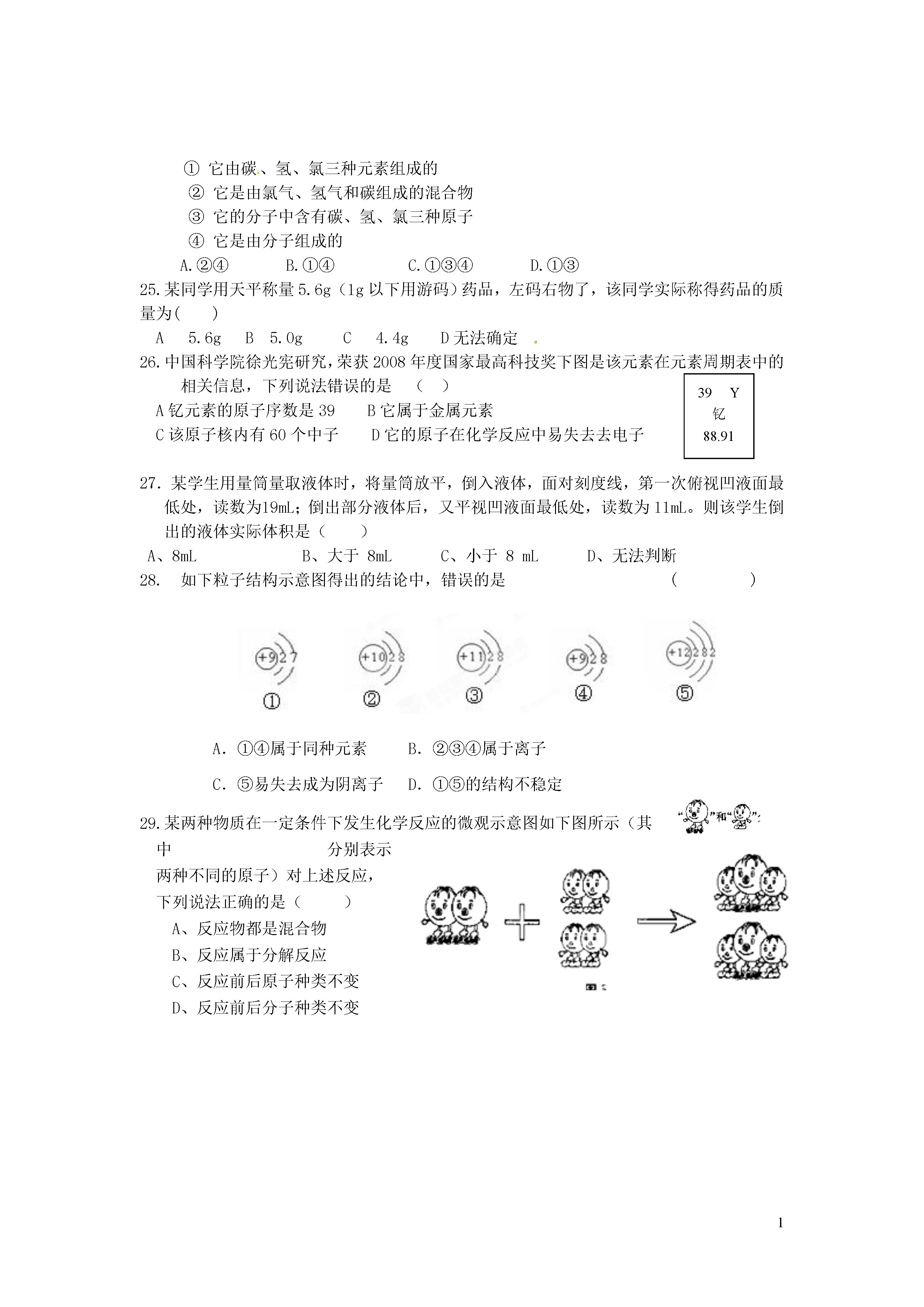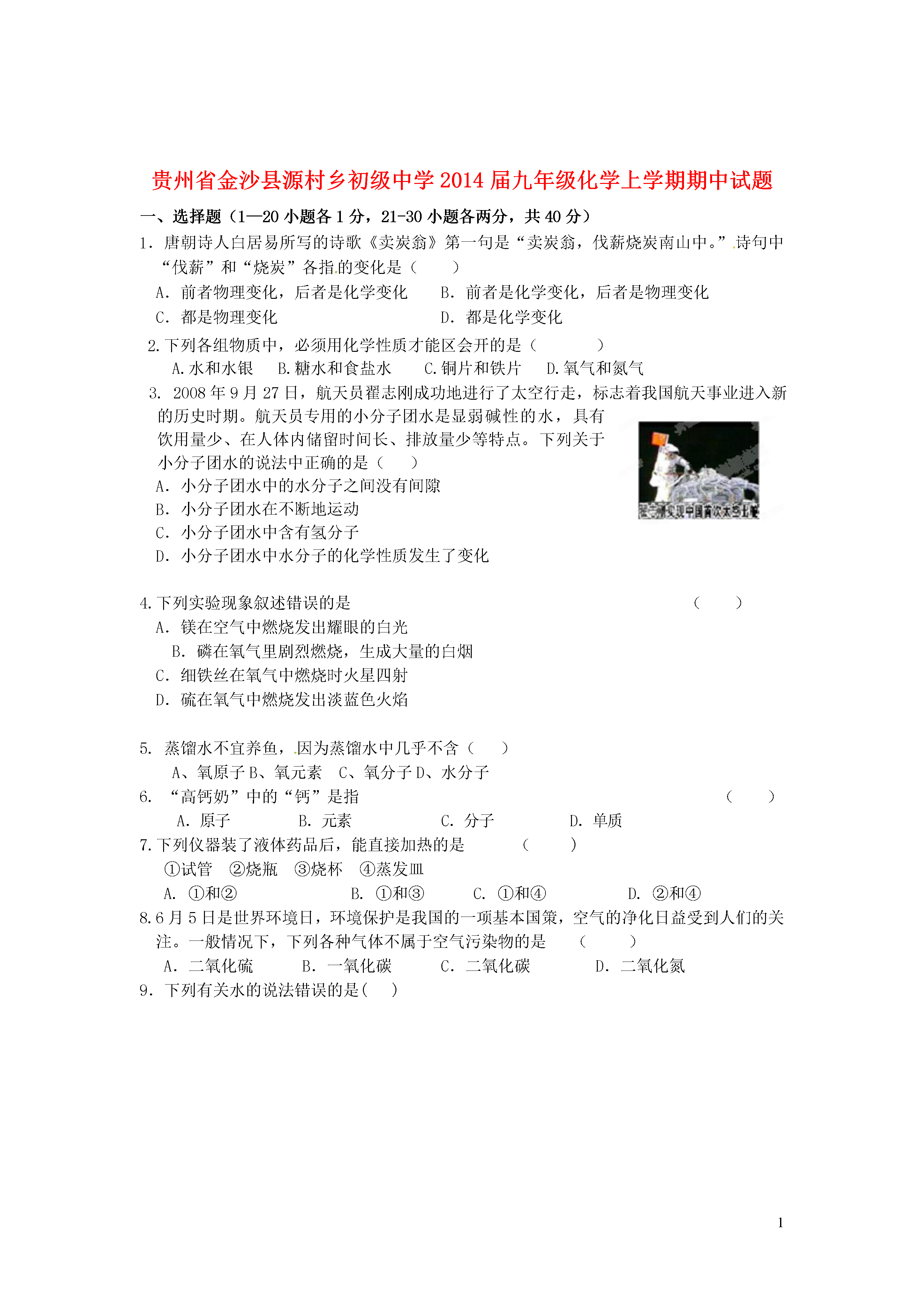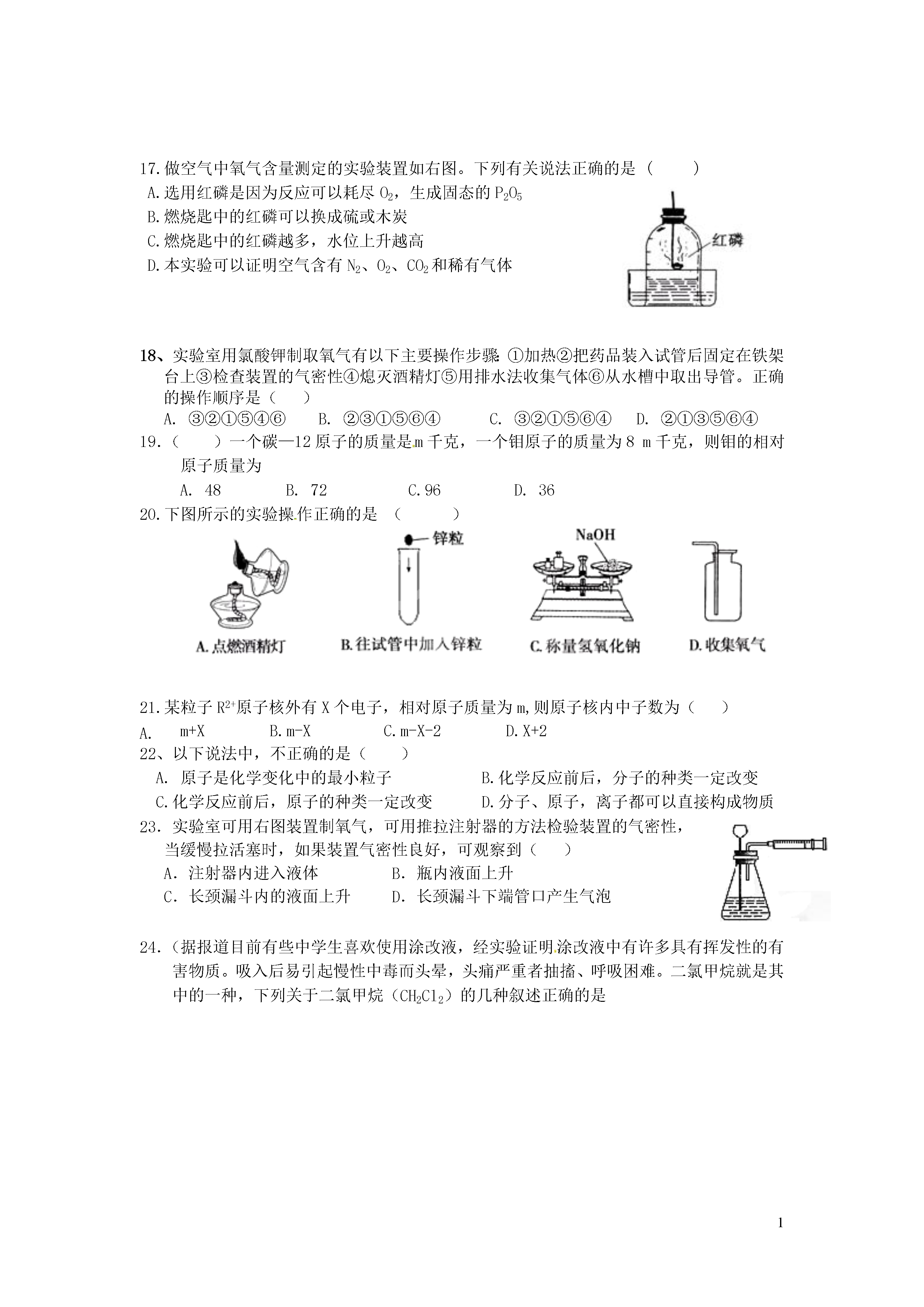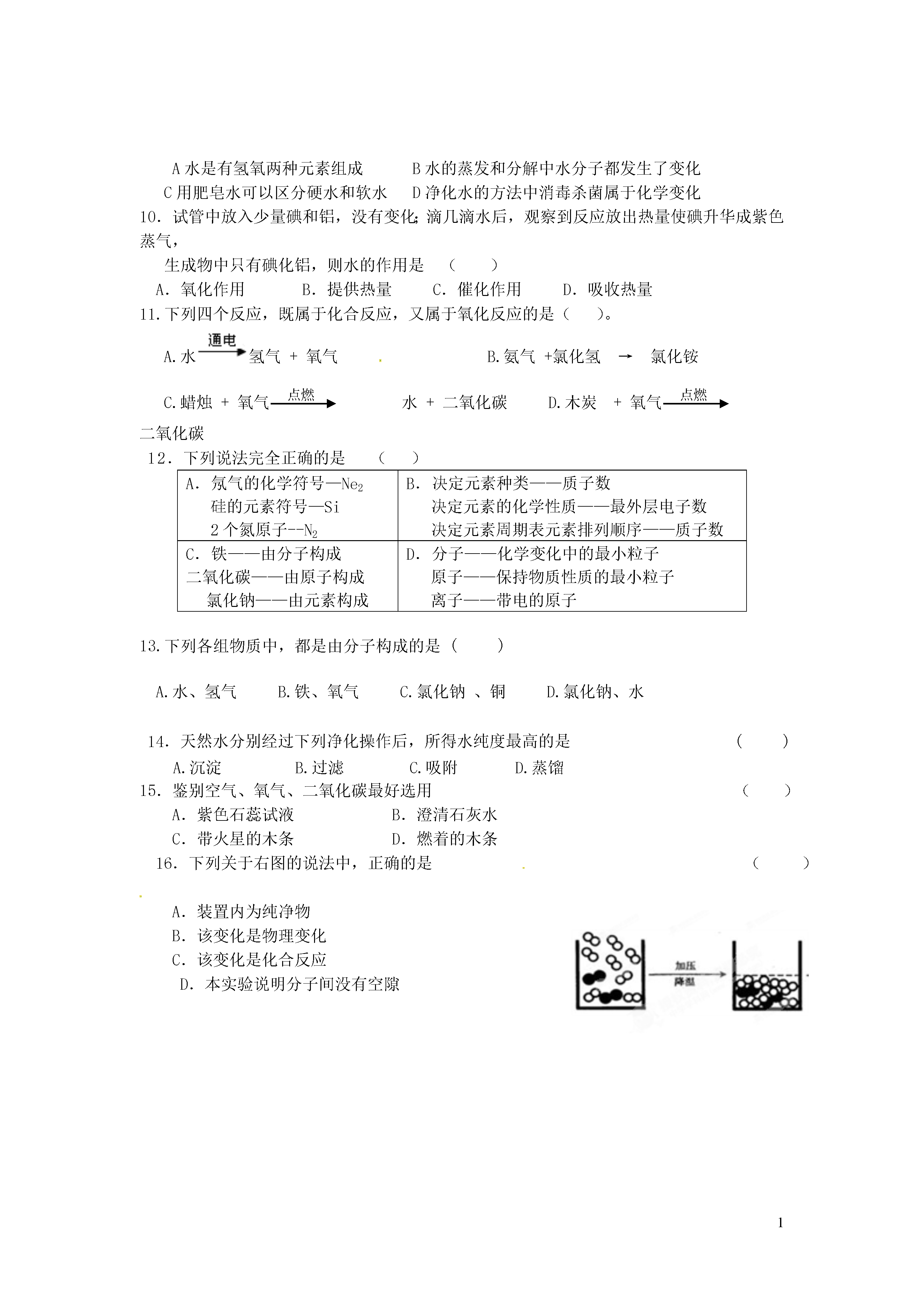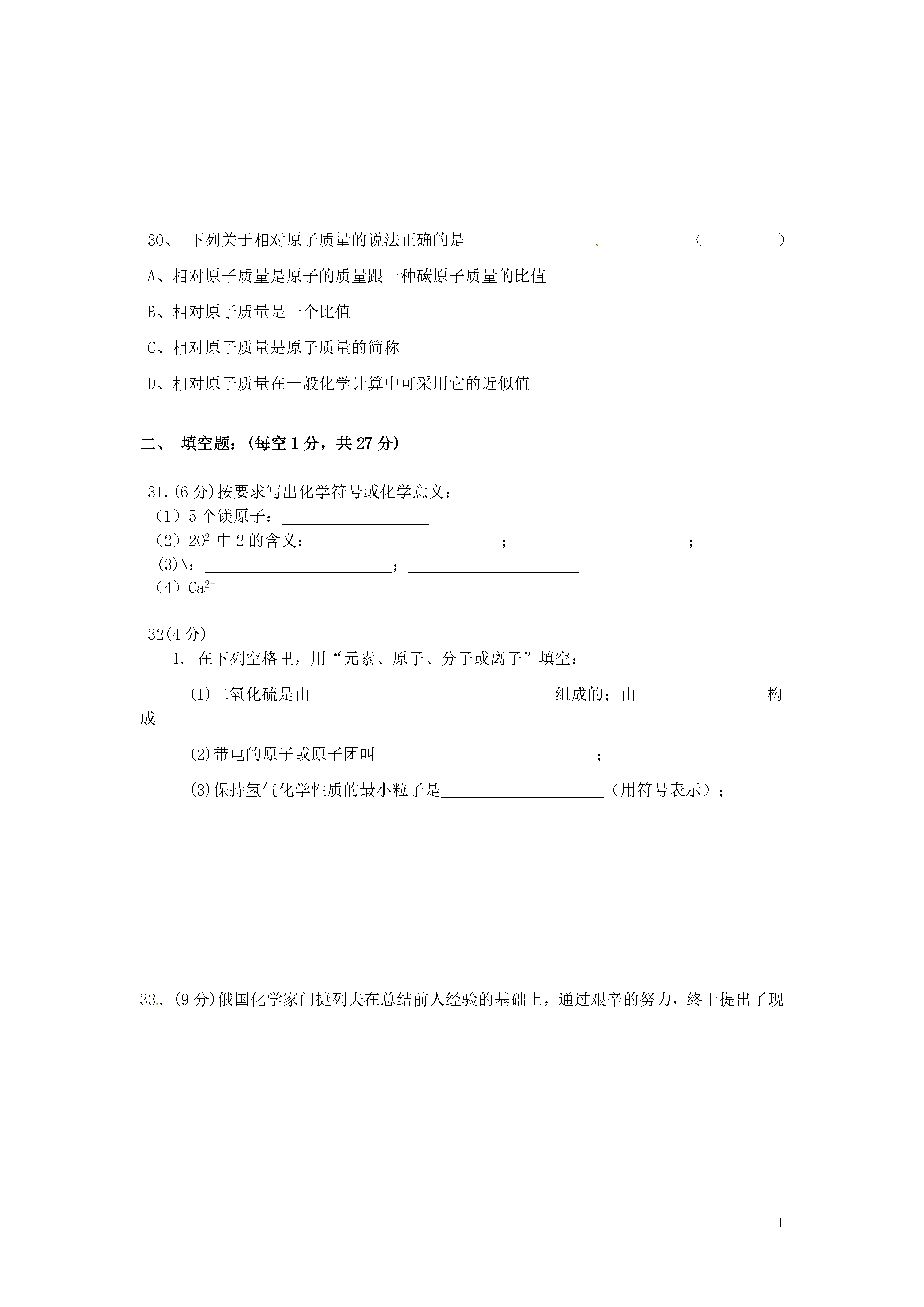 1贵州省金沙县源村乡初级中学2014届九年级化学上学期期中试题一、选择题(1—20小题各1分,21-30小题各两分,共40分)1.唐朝诗人白居易所写的诗歌《卖炭翁》第一句是“卖炭翁,伐薪烧炭南山中。”诗句中“伐薪”和“烧炭”各指的变化是()A.前者物理变化,后者是化学变化B.前者是化学变化,后者是物理变化C.都是物理变化D.都是化学变化2.下列各组物质中,必须用化学性质才能区会开的是()A.水和水银B.糖水和食盐水C.铜片和铁片D.氧气和氮气3.2008年9月27日,航天员翟志刚成功地进行了太空行走,标志着我国航天事业进入新的历史时期。航天员专用的小分子团水是显弱碱性的水,具有饮用量少、在人体内储留时间长、排放量少等特点。下列关于小分子团水的说法中正确的是()A.小分子团水中的水分子之间没有间隙B.小分子团水在不断地运动C.小分子团水中含有氢分子D.小分子团水中水分子的化学性质发生了变化4.下列实验现象叙述错误的是()A.镁在空气中燃烧发出耀眼的白光B.磷在氧气里剧烈燃烧,生成大量的白烟C.细铁丝在氧气中燃烧时火星四射D.硫在氧气中燃烧发出淡蓝色火焰5.蒸馏水不宜养鱼,因为蒸馏水中几乎不含()A、氧原子B、氧元素C、氧分子D、水分子6.“高钙奶”中的“钙”是指()A.原子B.元素C.分子D.单质7.下列仪器装了液体药品后,能直接加热的是()①试管②烧瓶③烧杯④蒸发皿A.①和②B.①和③C.①和④D.②和④8.6月5日是世界环境日,环境保护是我国的一项基本国策,空气的净化日益受到人们的关注。一般情况下,下列各种气体不属于空气污染物的是()A.二氧化硫B.一氧化碳C.二氧化碳D.二氧化氮9.下列有关水的说法错误的是()A水是有氢氧两种元素组成B水的蒸发和分解中水分子都发生了变化C用肥皂水可以区分硬水和软水D净化水的方法中消毒杀菌属于化学变化10.试管中放入少量碘和铝,没有变化;滴几滴水后,观察到反应放出热量使碘升华成紫色蒸气,生成物中只有碘化铝,则水的作用是()A.氧化作用B.提供热量C.催化作用D.吸收热量11.下列四个反应,既属于化合反应,又属于氧化反应的是()。A.水氢气+氧气B.氨气+氯化氢→氯化铵C.蜡烛+氧气点燃水+二氧化碳D.木炭+氧气点燃二氧化碳12.下列说法完全正确的是()A.氖气的化学符号—Ne2硅的元素符号—Si2个氮原子--N2B.决定元素种类——质子数决定元素的化学性质——最外层电子数决定元素周期表元素排列顺序——质子数C.铁——由分子构成二氧化碳——由原子构成氯化钠——由元素构成D.分子——化学变化中的最小粒子原子——保持物质性质的最小粒子离子——带电的原子13.下列各组物质中,都是由分子构成的是()A.水、氢气B.铁、氧气C.氯化钠、铜D.氯化钠、水14.天然水分别经过下列净化操作后,所得水纯度最高的是()A.沉淀B.过滤C.吸附D.蒸馏15.鉴别空气、氧气、二氧化碳最好选用()A.紫色石蕊试液B.澄清石灰水C.带火星的木条D.燃着的木条16.下列关于右图的说法中,正确的是()A.装置内为纯净物B.该变化是物理变化C.该变化是化合反应D.本实验说明分子间没有空隙17.做空气中氧气含量测定的实验装置如右图。下列有关说法正确的是()A.选用红磷是因为反应可以耗尽O2,生成固态的P2O5B.燃烧匙中的红磷可以换成硫或木炭C.燃烧匙中的红磷越多,水位上升越高D.本实验可以证明空气含有N2、O2、CO2和稀有气体18、实验室用氯酸钾制取氧气有以下主要操作步骤:①加热②把药品装入试管后固定在铁架台上③检查装置的气密性④熄灭酒精灯⑤用排水法收集气体⑥从水槽中取出导管。正确的操作顺序是()A.③②①⑤④⑥B.②③①⑤⑥④C.③②①⑤⑥④D.②①③⑤⑥④19.()一个碳—12原子的质量是m千克,一个钼原子的质量为8m千克,则钼的相对原子质量为A.48B.72C.96D.3620.下图所示的实验操作正确的是()21.某粒子R2+原子核外有X个电子,相对原子质量为m,则原子核内中子数为()m+XB.m-XC.m-X-2D.X+222、以下说法中,不正确的是()A.原子是化学变化中的最小粒子B.化学反应前后,分子的种类一定改变C.化学反应前后,原子的种类一定改变D.分子、原子,离子都可以直接构成物质23.实验室可用右图装置制氧气,可用推拉注射器的方法检验装置的气密性,当缓慢拉活塞时,如果装置气密性良好,可观察到()A.注射器内进入液体B.瓶内液面上升C.长颈漏斗内的液面上升D.长颈漏斗下端管口产生气泡
