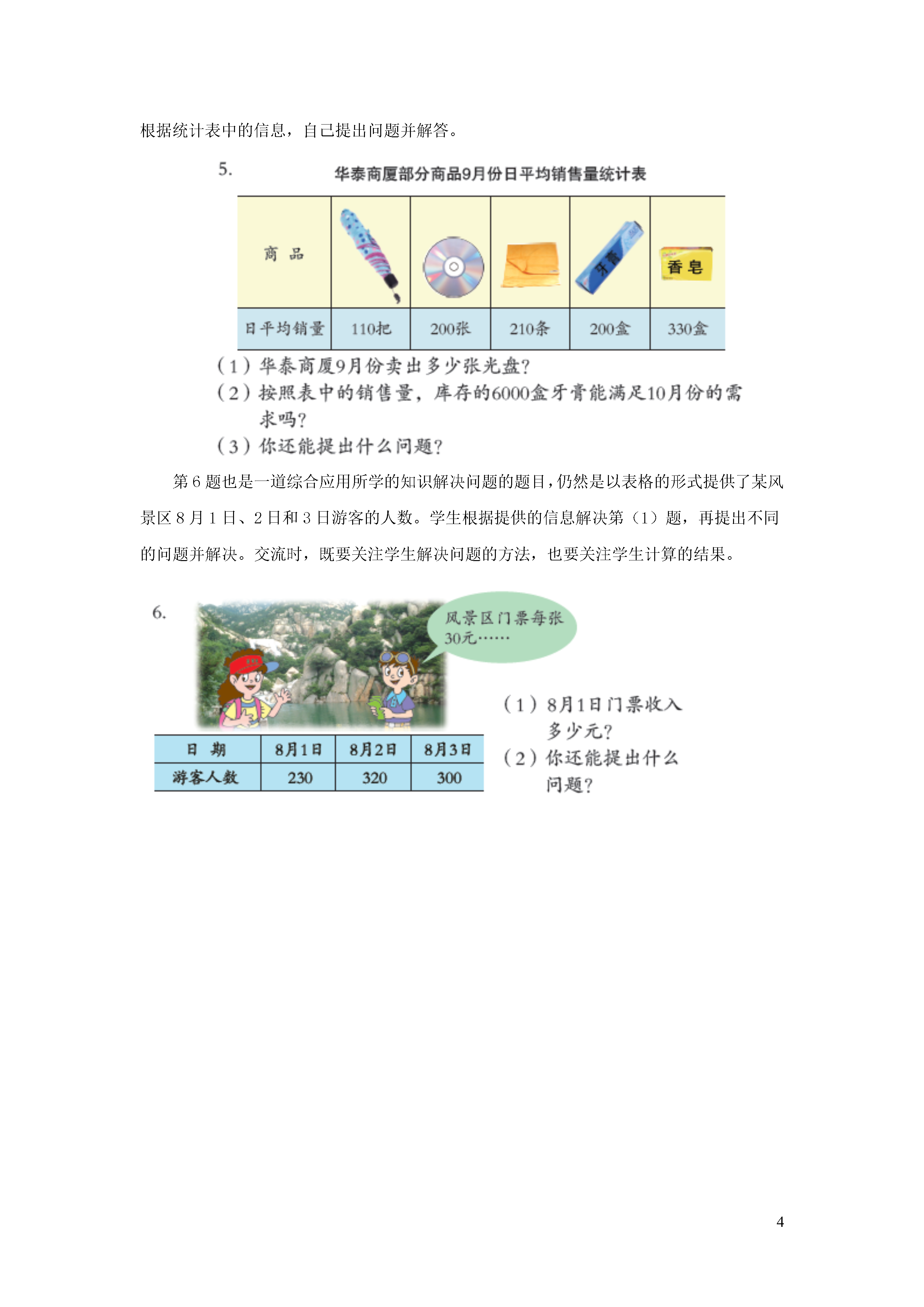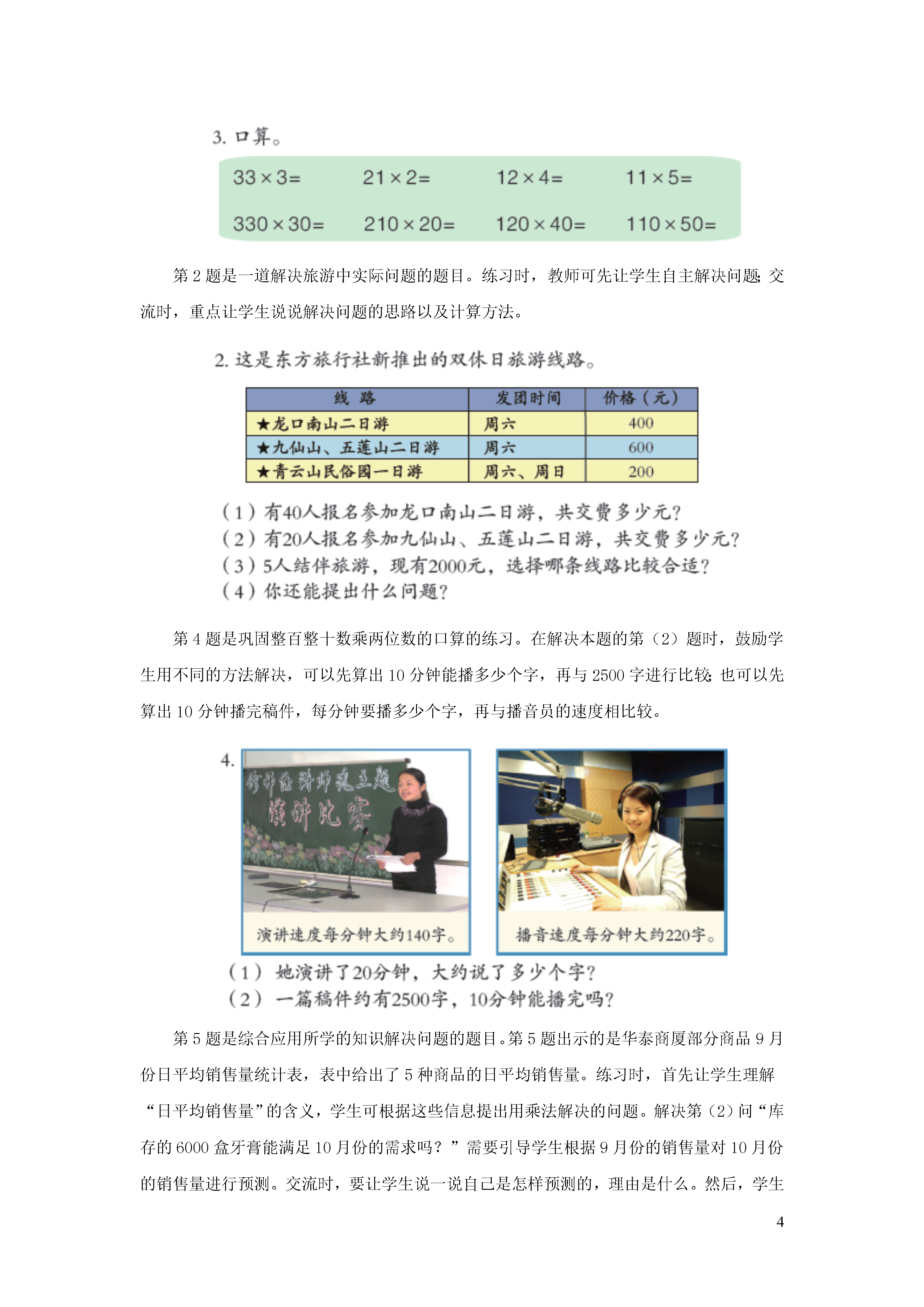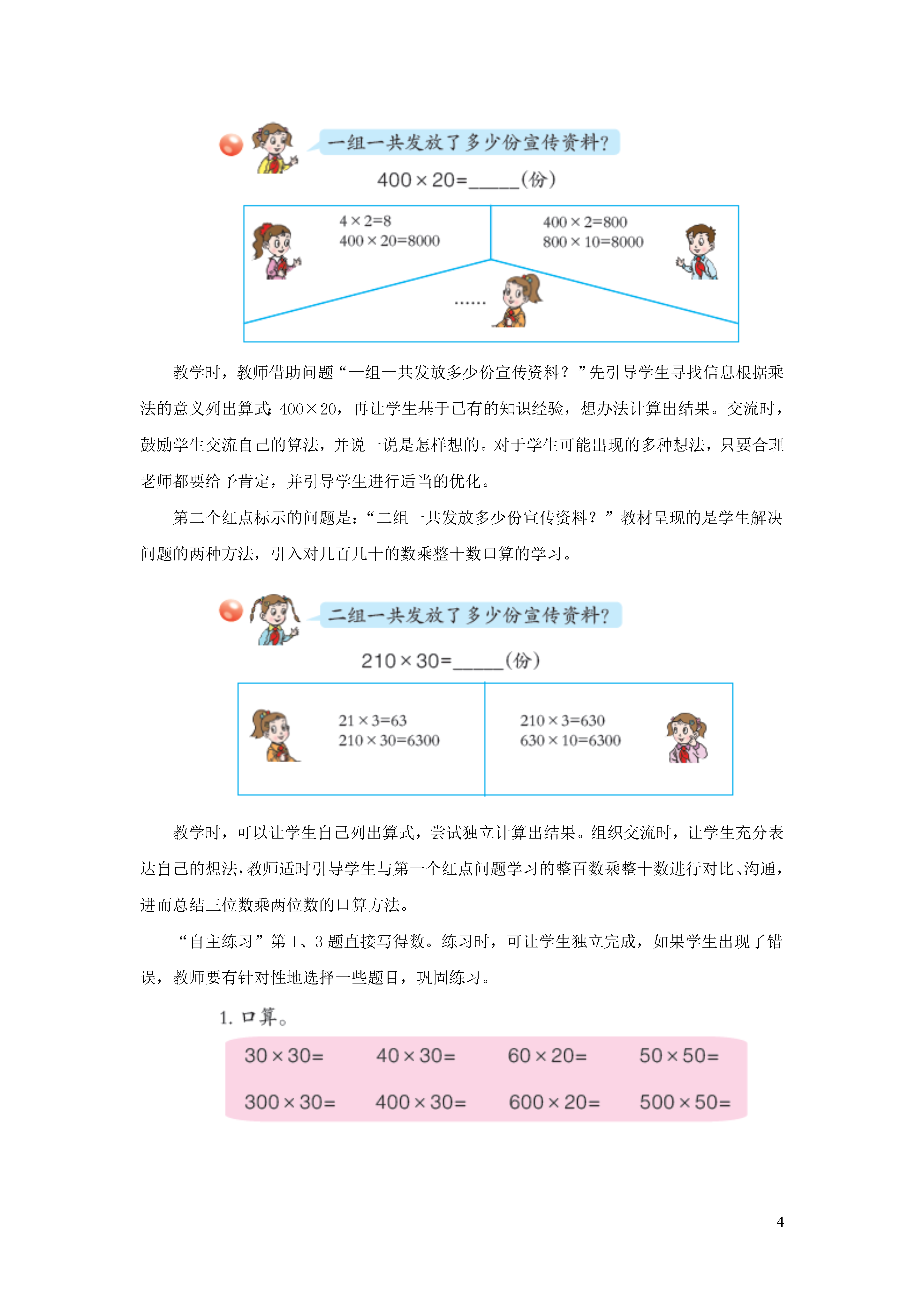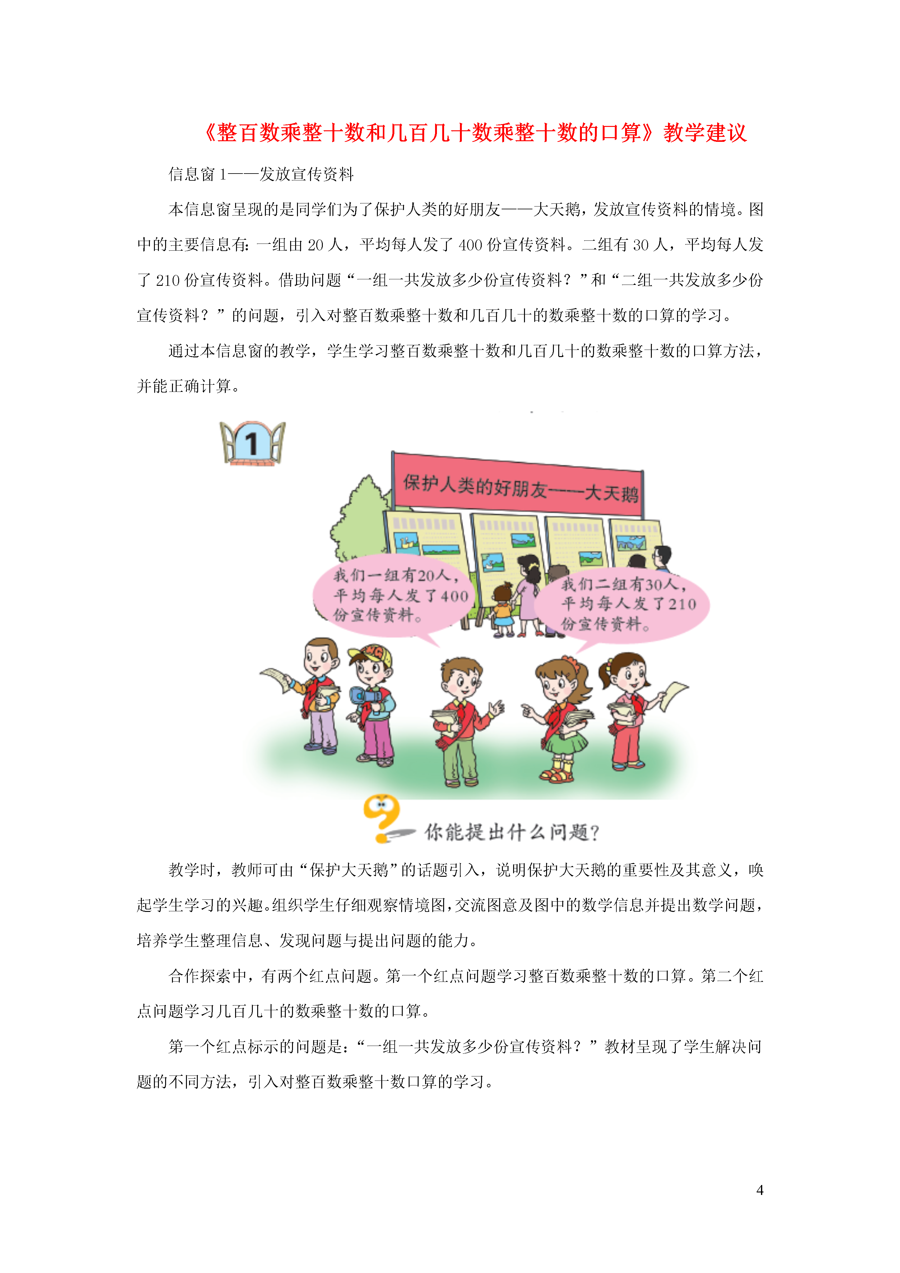 4《整百数乘整十数和几百几十数乘整十数的口算》教学建议信息窗1——发放宣传资料本信息窗呈现的是同学们为了保护人类的好朋友——大天鹅,发放宣传资料的情境。图中的主要信息有:一组由20人,平均每人发了400份宣传资料。二组有30人,平均每人发了210份宣传资料。借助问题“一组一共发放多少份宣传资料?”和“二组一共发放多少份宣传资料?”的问题,引入对整百数乘整十数和几百几十的数乘整十数的口算的学习。通过本信息窗的教学,学生学习整百数乘整十数和几百几十的数乘整十数的口算方法,并能正确计算。教学时,教师可由“保护大天鹅”的话题引入,说明保护大天鹅的重要性及其意义,唤起学生学习的兴趣。组织学生仔细观察情境图,交流图意及图中的数学信息并提出数学问题,培养学生整理信息、发现问题与提出问题的能力。合作探索中,有两个红点问题。第一个红点问题学习整百数乘整十数的口算。第二个红点问题学习几百几十的数乘整十数的口算。第一个红点标示的问题是:“一组一共发放多少份宣传资料?”教材呈现了学生解决问题的不同方法,引入对整百数乘整十数口算的学习。教学时,教师借助问题“一组一共发放多少份宣传资料?”先引导学生寻找信息根据乘法的意义列出算式:400×20,再让学生基于已有的知识经验,想办法计算出结果。交流时,鼓励学生交流自己的算法,并说一说是怎样想的。对于学生可能出现的多种想法,只要合理老师都要给予肯定,并引导学生进行适当的优化。第二个红点标示的问题是:“二组一共发放多少份宣传资料?”教材呈现的是学生解决问题的两种方法,引入对几百几十的数乘整十数口算的学习。教学时,可以让学生自己列出算式,尝试独立计算出结果。组织交流时,让学生充分表达自己的想法,教师适时引导学生与第一个红点问题学习的整百数乘整十数进行对比、沟通,进而总结三位数乘两位数的口算方法。“自主练习”第1、3题直接写得数。练习时,可让学生独立完成,如果学生出现了错误,教师要有针对性地选择一些题目,巩固练习。第2题是一道解决旅游中实际问题的题目。练习时,教师可先让学生自主解决问题;交流时,重点让学生说说解决问题的思路以及计算方法。第4题是巩固整百整十数乘两位数的口算的练习。在解决本题的第(2)题时,鼓励学生用不同的方法解决,可以先算出10分钟能播多少个字,再与2500字进行比较;也可以先算出10分钟播完稿件,每分钟要播多少个字,再与播音员的速度相比较。第5题是综合应用所学的知识解决问题的题目。第5题出示的是华泰商厦部分商品9月份日平均销售量统计表,表中给出了5种商品的日平均销售量。练习时,首先让学生理解“日平均销售量”的含义,学生可根据这些信息提出用乘法解决的问题。解决第(2)问“库存的6000盒牙膏能满足10月份的需求吗?”需要引导学生根据9月份的销售量对10月份的销售量进行预测。交流时,要让学生说一说自己是怎样预测的,理由是什么。然后,学生根据统计表中的信息,自己提出问题并解答。第6题也是一道综合应用所学的知识解决问题的题目,仍然是以表格的形式提供了某风景区8月1日、2日和3日游客的人数。学生根据提供的信息解决第(1)题,再提出不同的问题并解决。交流时,既要关注学生解决问题的方法,也要关注学生计算的结果。