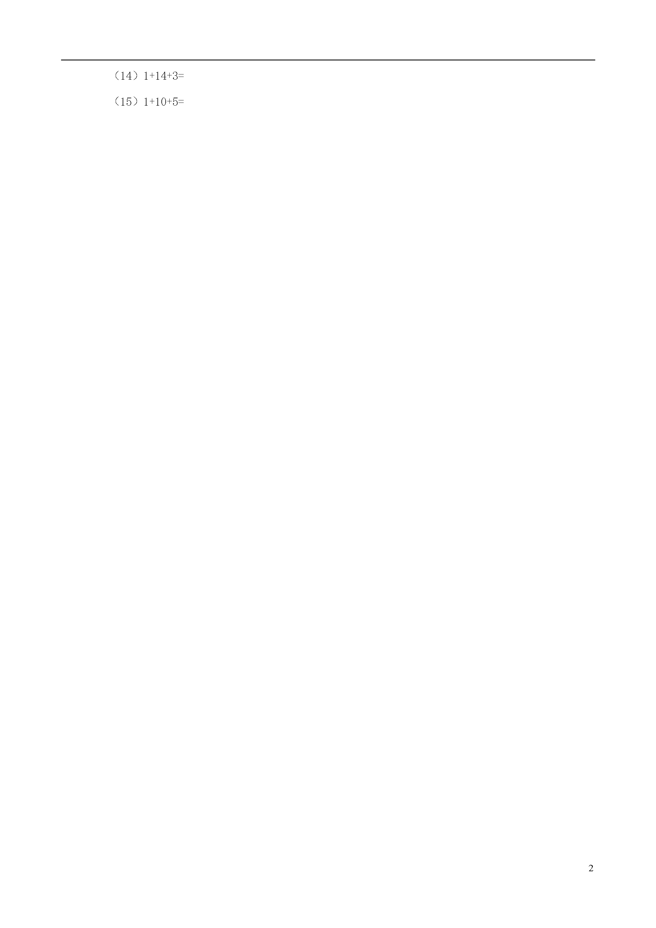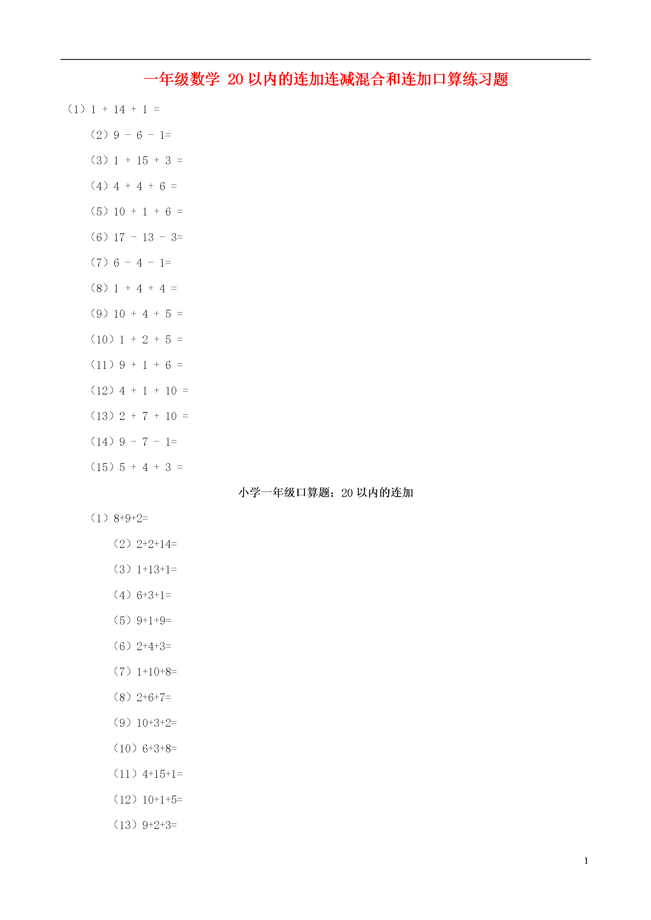 2一年级数学20以内的连加连减混合和连加口算练习题(1)1+14+1=(2)9-6-1=(3)1+15+3=(4)4+4+6=(5)10+1+6=(6)17-13-3=(7)6-4-1=(8)1+4+4=(9)10+4+5=(10)1+2+5=(11)9+1+6=(12)4+1+10=(13)2+7+10=(14)9-7-1=(15)5+4+3=小学一年级口算题:20以内的连加(1)8+9+2=(2)2+2+14=(3)1+13+1=(4)6+3+1=(5)9+1+9=(6)2+4+3=(7)1+10+8=(8)2+6+7=(9)10+3+2=(10)6+3+8=(11)4+15+1=(12)10+1+5=(13)9+2+3=(14)1+14+3=(15)1+10+5=