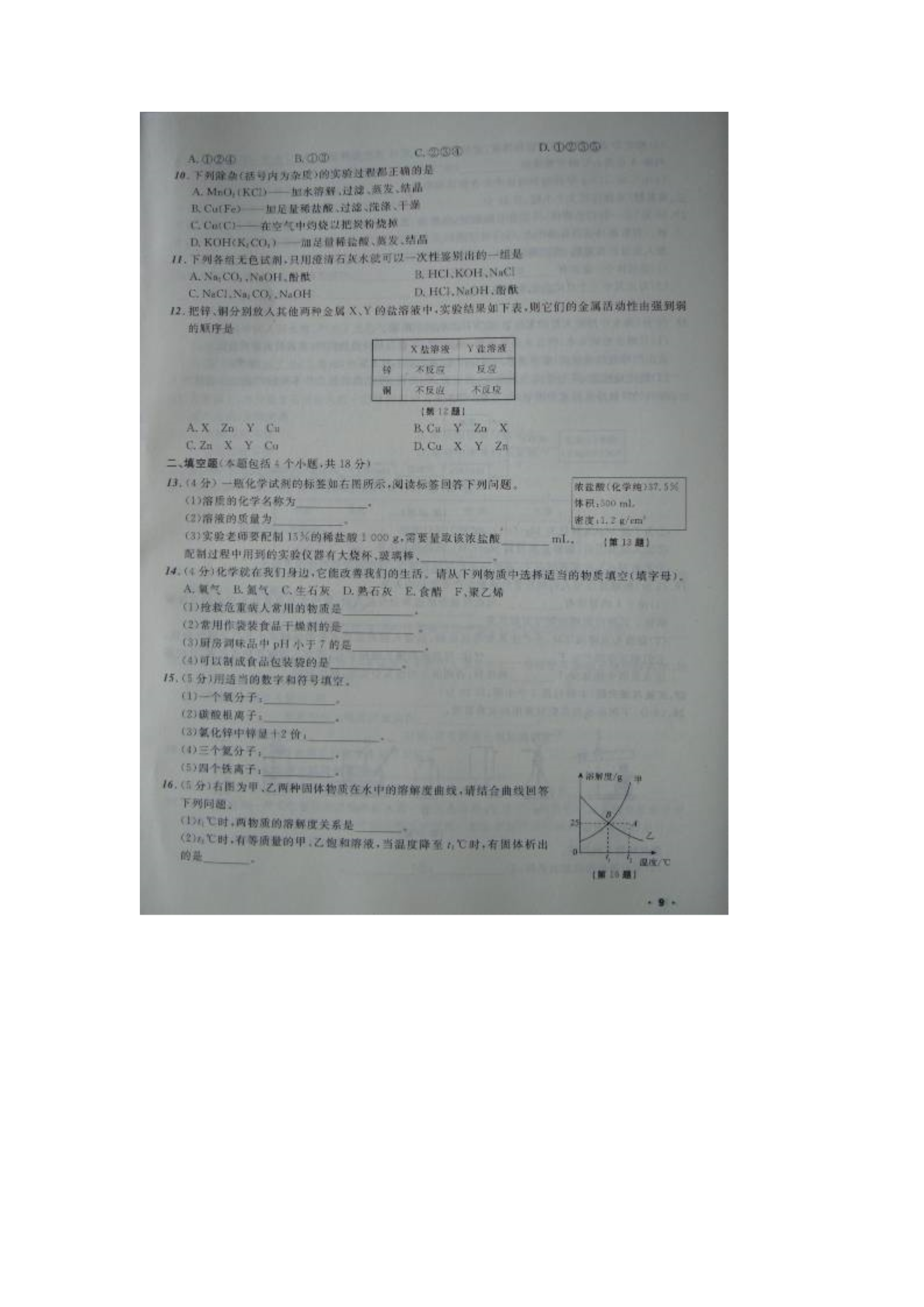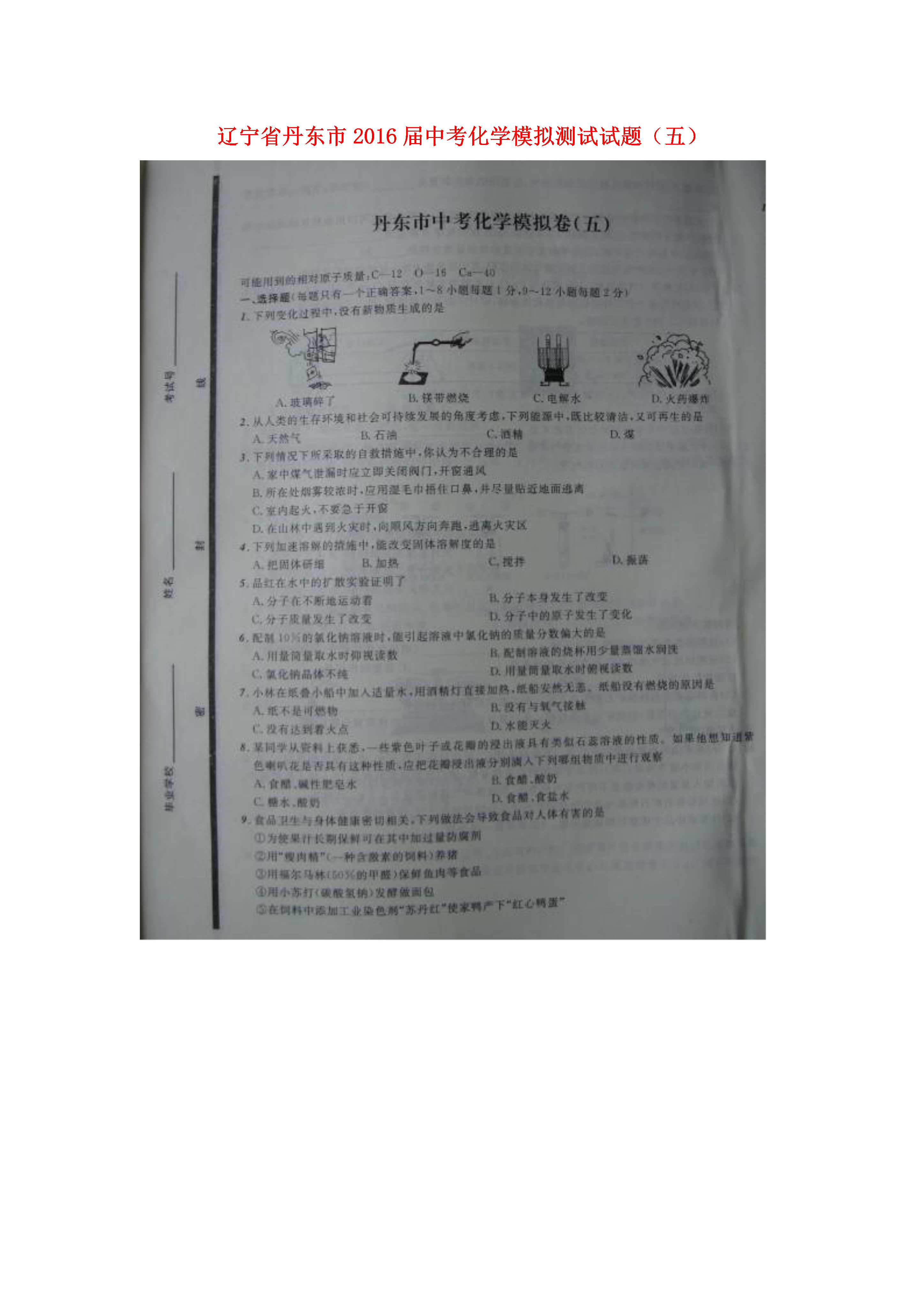 辽宁省丹东市2016届中考化学模拟测试试题(五)