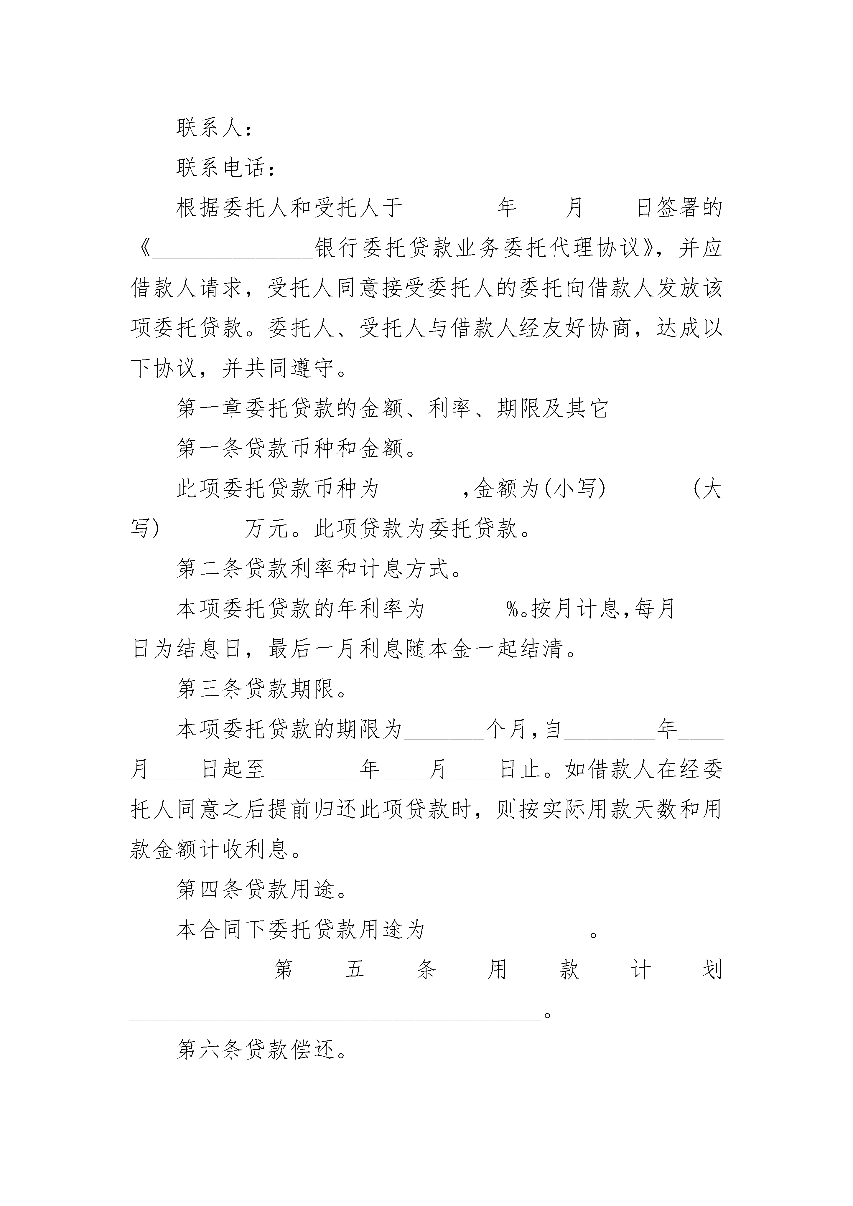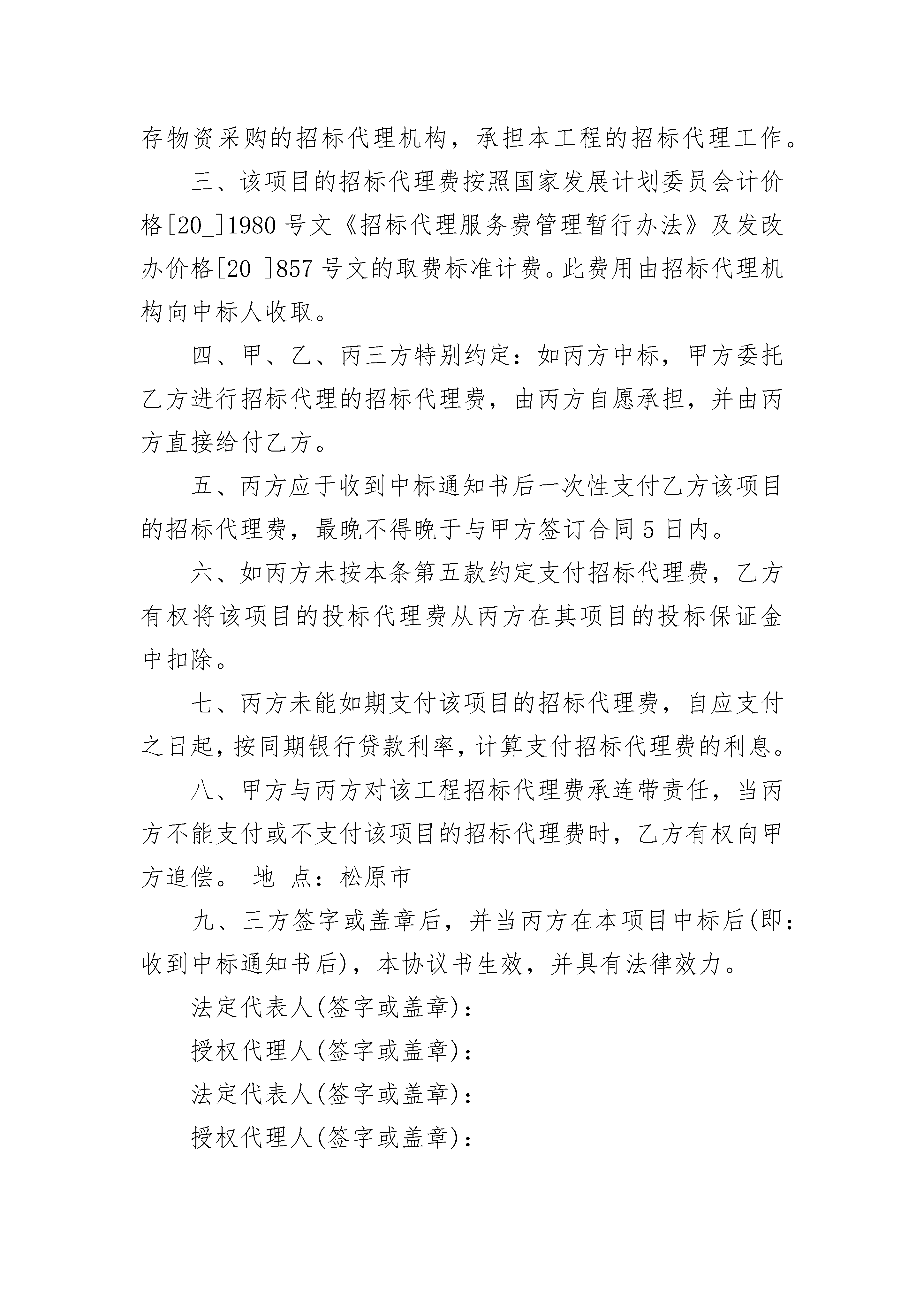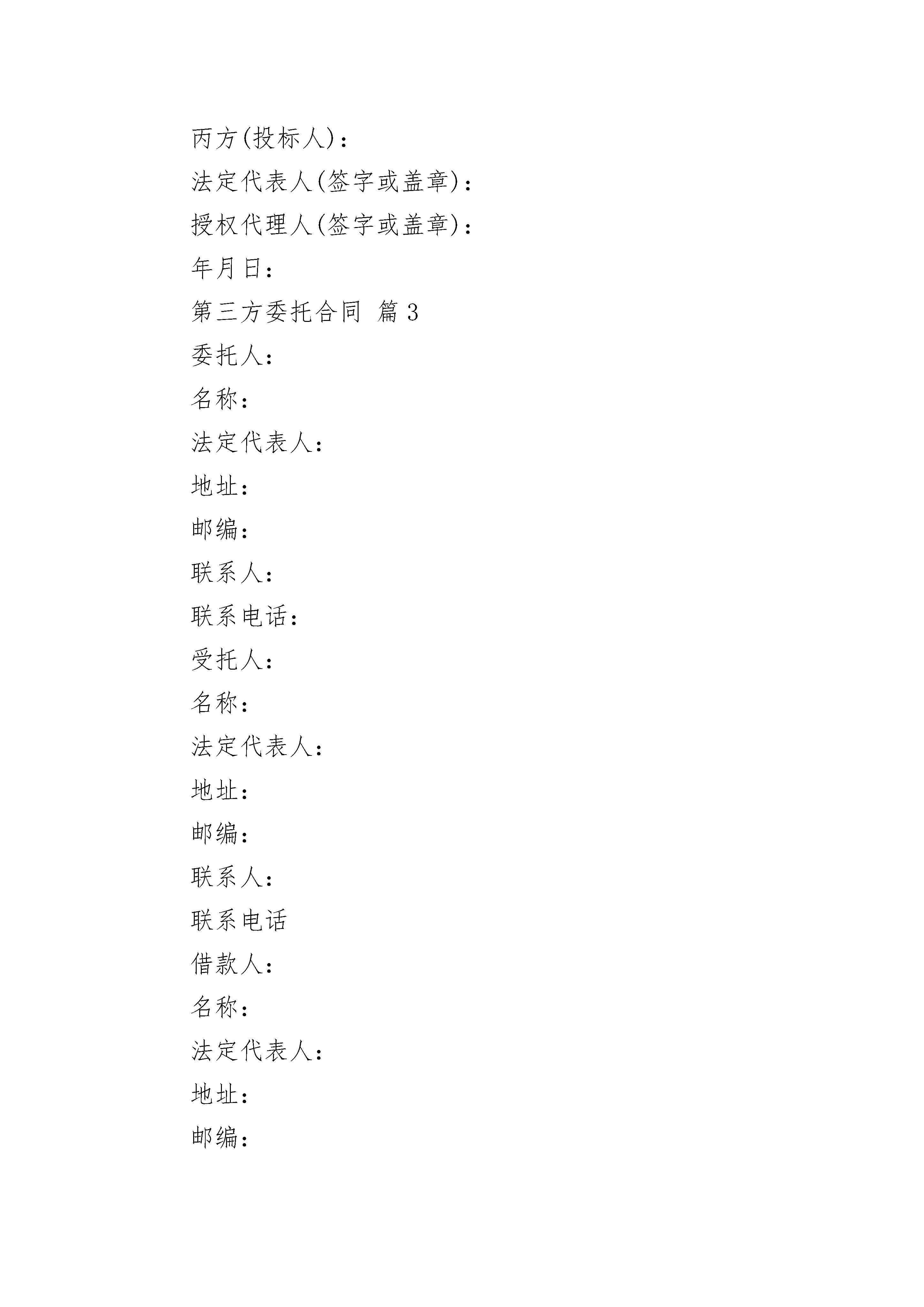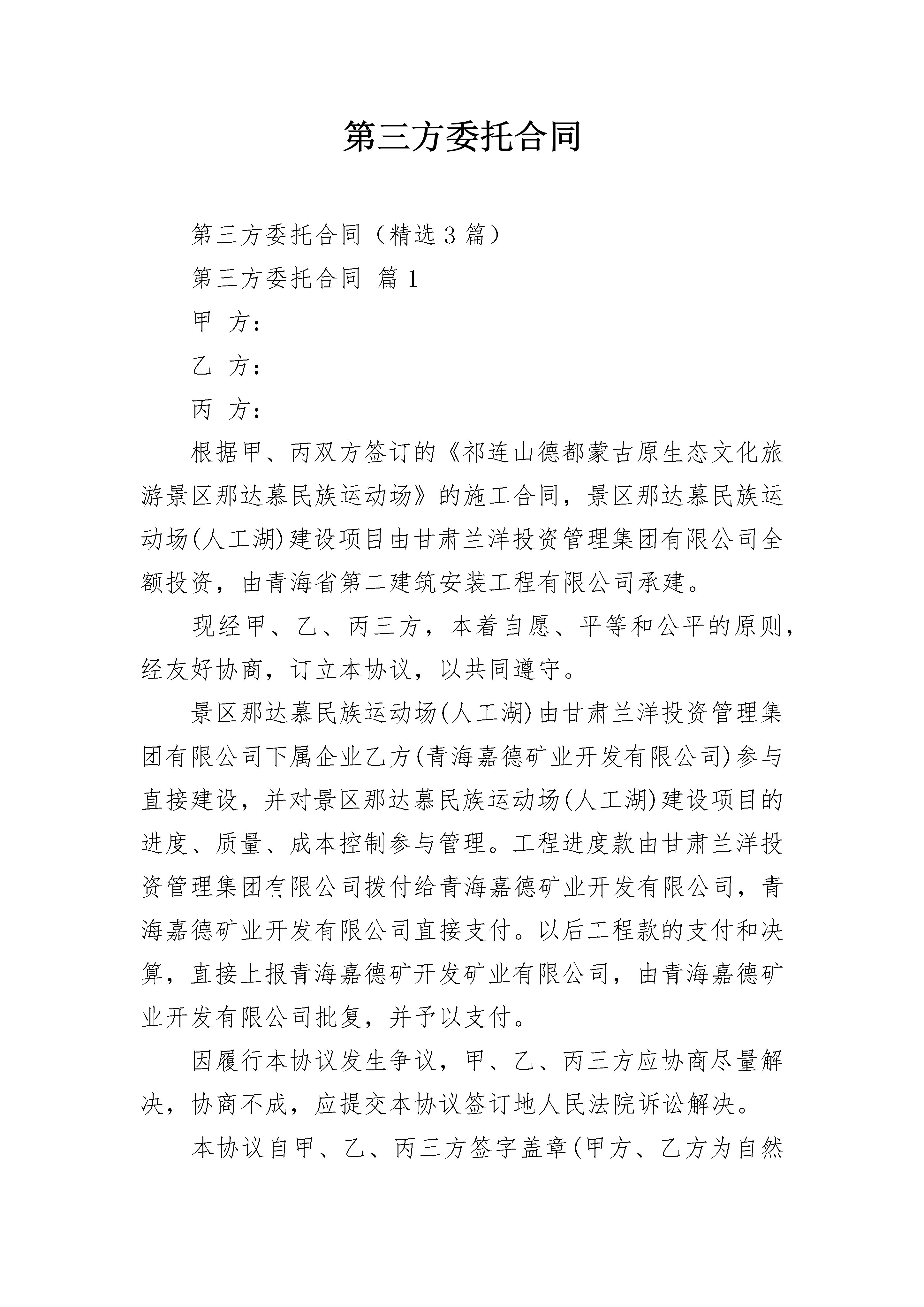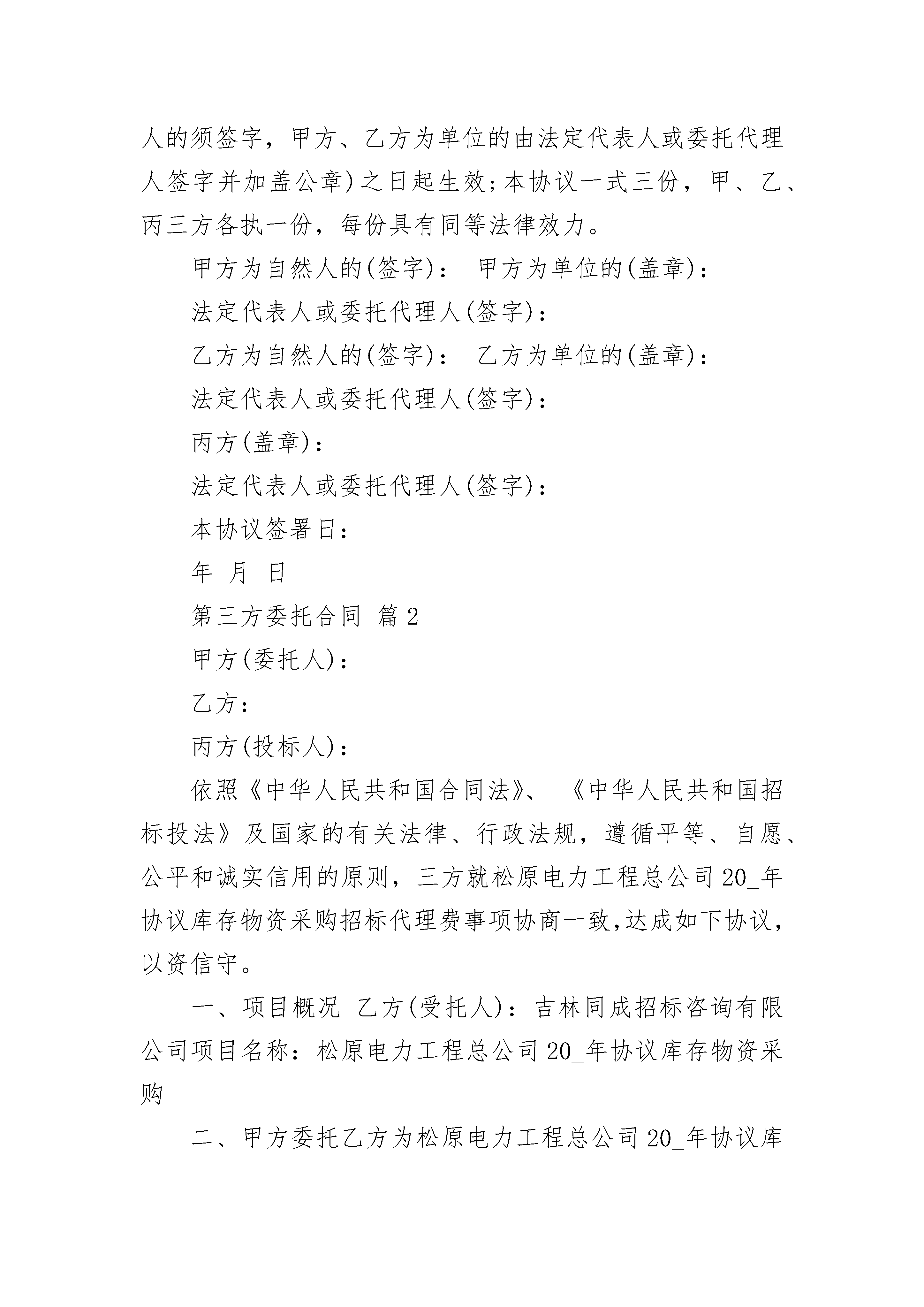 第三方委托合同第三方委托合同(精选3篇)第三方委托合同篇1甲方:乙方:丙方:根据甲、丙双方签订的《祁连山德都蒙古原生态文化旅游景区那达慕民族运动场》的施工合同,景区那达慕民族运动场(人工湖)建设项目由甘肃兰洋投资管理集团有限公司全额投资,由青海省第二建筑安装工程有限公司承建。现经甲、乙、丙三方,本着自愿、平等和公平的原则,经友好协商,订立本协议,以共同遵守。景区那达慕民族运动场(人工湖)由甘肃兰洋投资管理集团有限公司下属企业乙方(青海嘉德矿业开发有限公司)参与直接建设,并对景区那达慕民族运动场(人工湖)建设项目的进度、质量、成本控制参与管理。工程进度款由甘肃兰洋投资管理集团有限公司拨付给青海嘉德矿业开发有限公司,青海嘉德矿业开发有限公司直接支付。以后工程款的支付和决算,直接上报青海嘉德矿开发矿业有限公司,由青海嘉德矿业开发有限公司批复,并予以支付。因履行本协议发生争议,甲、乙、丙三方应协商尽量解决,协商不成,应提交本协议签订地人民法院诉讼解决。本协议自甲、乙、丙三方签字盖章(甲方、乙方为自然人的须签字,甲方、乙方为单位的由法定代表人或委托代理人签字并加盖公章)之日起生效;本协议一式三份,甲、乙、丙三方各执一份,每份具有同等法律效力。甲方为自然人的(签字):甲方为单位的(盖章):法定代表人或委托代理人(签字):乙方为自然人的(签字):乙方为单位的(盖章):法定代表人或委托代理人(签字):丙方(盖章):法定代表人或委托代理人(签字):本协议签署日:年月日第三方委托合同篇2甲方(委托人):乙方:丙方(投标人):依照《中华人民共和国合同法》、《中华人民共和国招标投法》及国家的有关法律、行政法规,遵循平等、自愿、公平和诚实信用的原则,三方就松原电力工程总公司20_年协议库存物资采购招标代理费事项协商一致,达成如下协议,以资信守。一、项目概况乙方(受托人):吉林同成招标咨询有限公司项目名称:松原电力工程总公司20_年协议库存物资采购二、甲方委托乙方为松原电力工程总公司20_年协议库存物资采购的招标代理机构,承担本工程的招标代理工作。三、该项目的招标代理费按照国家发展计划委员会计价格[20_]1980号文《招标代理服务费管理暂行办法》及发改办价格[20_]857号文的取费标准计费。此费用由招标代理机构向中标人收取。四、甲、乙、丙三方特别约定:如丙方中标,甲方委托乙方进行招标代理的招标代理费,由丙方自愿承担,并由丙方直接给付乙方。五、丙方应于收到中标通知书后一次性支付乙方该项目的招标代理费,最晚不得晚于与甲方签订合同5日内。六、如丙方未按本条第五款约定支付招标代理费,乙方有权将该项目的投标代理费从丙方在其项目的投标保证金中扣除。七、丙方未能如期支付该项目的招标代理费,自应支付之日起,按同期银行贷款利率,计算支付招标代理费的利息。八、甲方与丙方对该工程招标代理费承连带责任,当丙方不能支付或不支付该项目的招标代理费时,乙方有权向甲方追偿。地点:松原市九、三方签字或盖章后,并当丙方在本项目中标后(即:收到中标通知书后),本协议书生效,并具有法律效力。法定代表人(签字或盖章):授权代理人(签字或盖章):法定代表人(签字或盖章):授权代理人(签字或盖章):丙方(投标人):法定代表人(签字或盖章):授权代理人(签字或盖章):年月日:第三方委托合同篇3委托人:名称:法定代表人:地址:邮编:联系人:联系电话:受托人:名称:法定代表人:地址:邮编:联系人:联系电话借款人:名称:法定代表人:地址:邮编:联系人:联系电话:根据委托人和受托人于________年____月____日签署的《______________银行委托贷款业务委托代理协议》,并应借款人请求,受托人同意接受委托人的委托向借款人发放该项委托贷款。委托人、受托人与借款人经友好协商,达成以下协议,并共同遵守。第一章委托贷款的金额、利率、期限及其它第一条贷款币种和金额。此项委托贷款币种为_______,金额为(小写)_______(大写)_______万元。此项贷款为委托贷款。第二条贷款利率和计息方式。本项委托贷款的年利率为_______%。按月计息,每月____日为结息日,最后一月利息随本金一起结清。第三条贷款期限。本项委托贷款的期限为_______个月,自________年____月____日起至________年____月____日止。如借款人在经委托人同意之后提前归还此项贷款时,则按实际用款天数和用款金额计收利息。第四条贷款用途。本合同下委托贷款用途为______________。第五条用款计划____________________________________。第六条贷款偿还。借款人的还款计划和还款方式约定如下:_____________________本贷款的本息按期由受托人负责从借