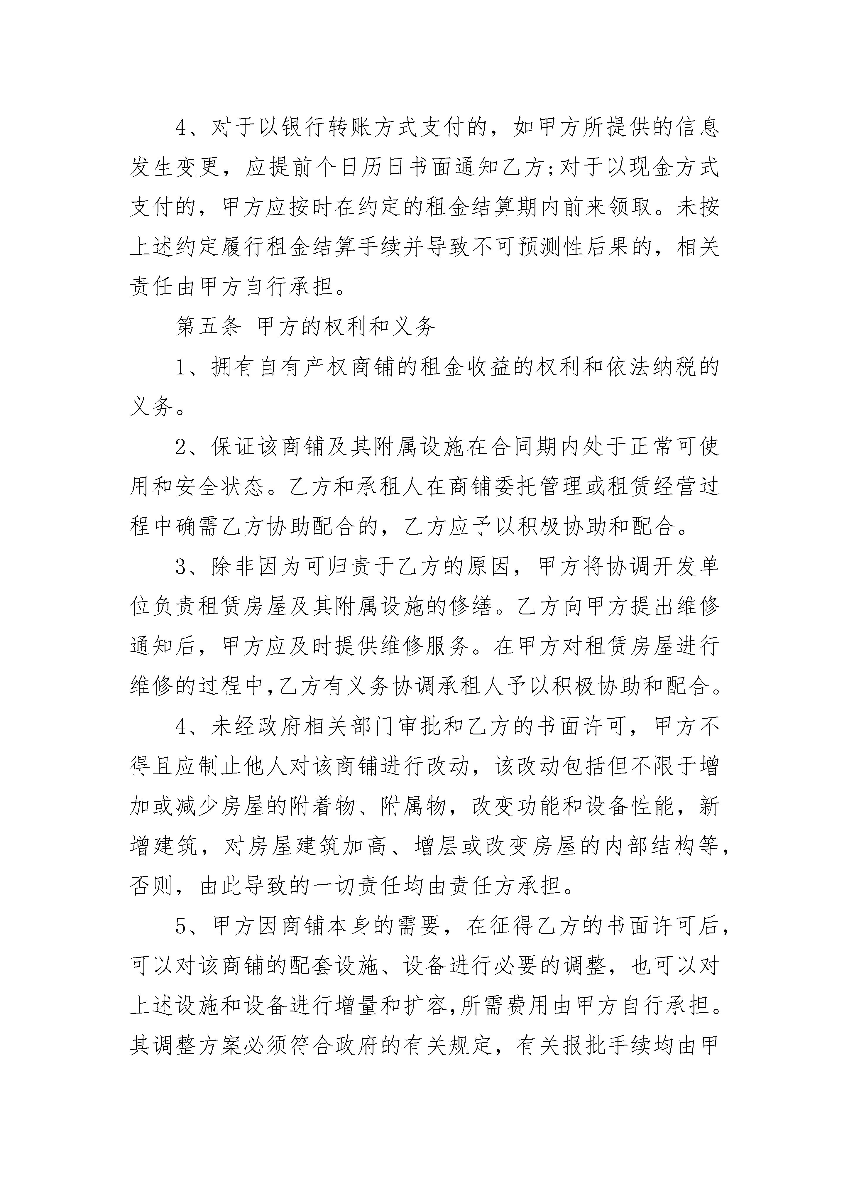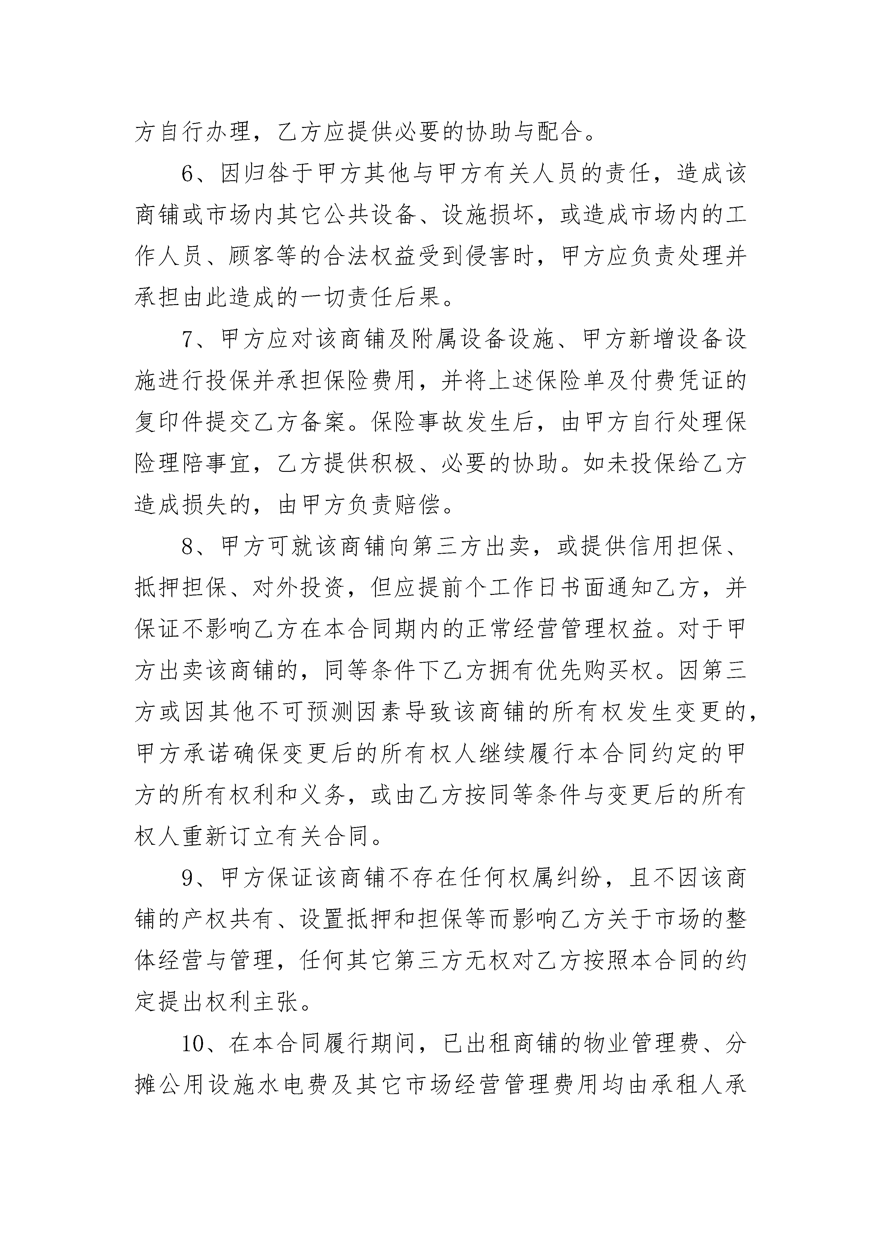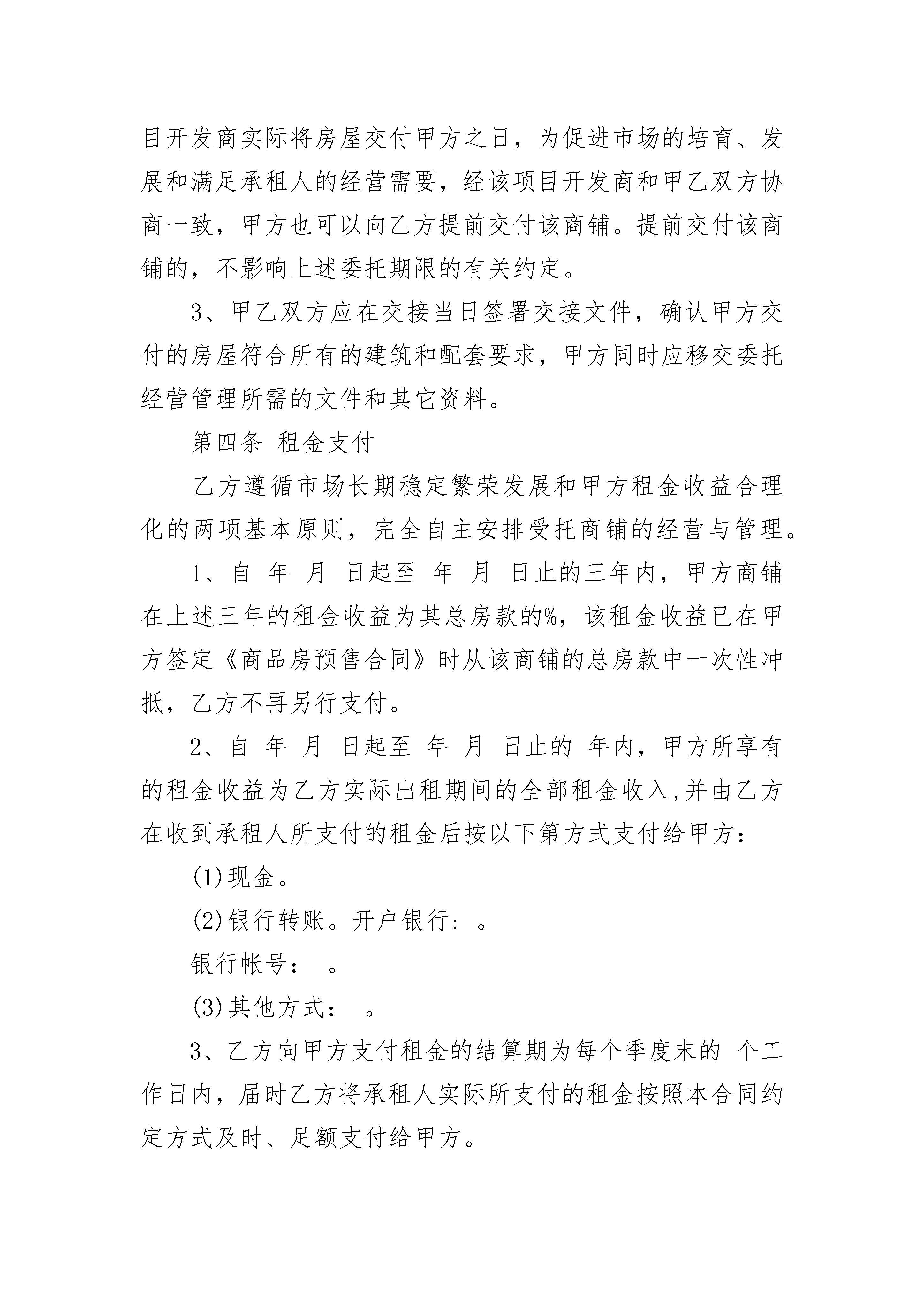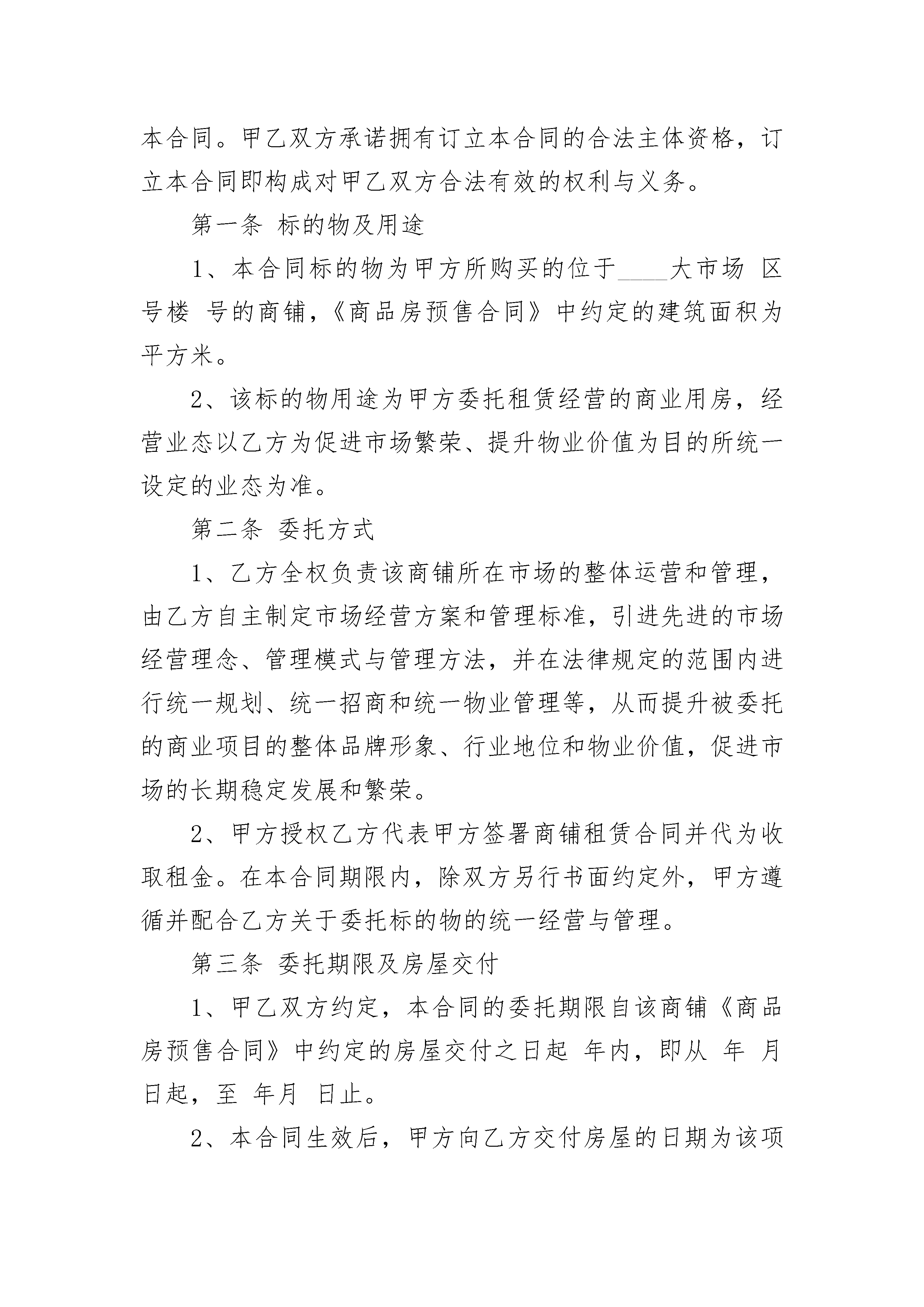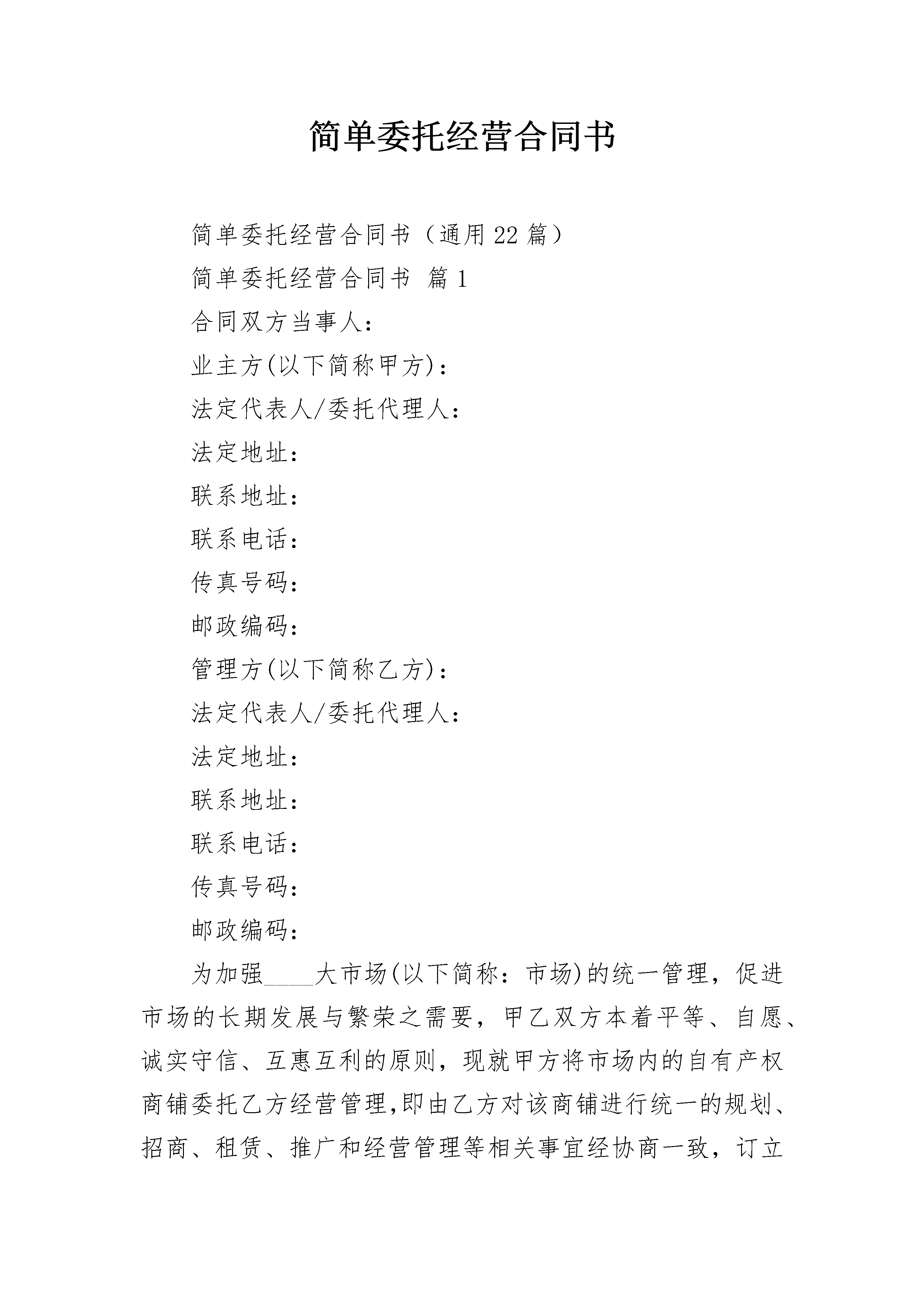 简单委托经营合同书简单委托经营合同书(通用22篇)简单委托经营合同书篇1合同双方当事人:业主方(以下简称甲方):法定代表人/委托代理人:法定地址:联系地址:联系电话:传真号码:邮政编码:管理方(以下简称乙方):法定代表人/委托代理人:法定地址:联系地址:联系电话:传真号码:邮政编码:为加强____大市场(以下简称:市场)的统一管理,促进市场的长期发展与繁荣之需要,甲乙双方本着平等、自愿、诚实守信、互惠互利的原则,现就甲方将市场内的自有产权商铺委托乙方经营管理,即由乙方对该商铺进行统一的规划、招商、租赁、推广和经营管理等相关事宜经协商一致,订立本合同。甲乙双方承诺拥有订立本合同的合法主体资格,订立本合同即构成对甲乙双方合法有效的权利与义务。第一条标的物及用途1、本合同标的物为甲方所购买的位于____大市场区号楼号的商铺,《商品房预售合同》中约定的建筑面积为平方米。2、该标的物用途为甲方委托租赁经营的商业用房,经营业态以乙方为促进市场繁荣、提升物业价值为目的所统一设定的业态为准。第二条委托方式1、乙方全权负责该商铺所在市场的整体运营和管理,由乙方自主制定市场经营方案和管理标准,引进先进的市场经营理念、管理模式与管理方法,并在法律规定的范围内进行统一规划、统一招商和统一物业管理等,从而提升被委托的商业项目的整体品牌形象、行业地位和物业价值,促进市场的长期稳定发展和繁荣。2、甲方授权乙方代表甲方签署商铺租赁合同并代为收取租金。在本合同期限内,除双方另行书面约定外,甲方遵循并配合乙方关于委托标的物的统一经营与管理。第三条委托期限及房屋交付1、甲乙双方约定,本合同的委托期限自该商铺《商品房预售合同》中约定的房屋交付之日起年内,即从年月日起,至年月日止。2、本合同生效后,甲方向乙方交付房屋的日期为该项目开发商实际将房屋交付甲方之日,为促进市场的培育、发展和满足承租人的经营需要,经该项目开发商和甲乙双方协商一致,甲方也可以向乙方提前交付该商铺。提前交付该商铺的,不影响上述委托期限的有关约定。3、甲乙双方应在交接当日签署交接文件,确认甲方交付的房屋符合所有的建筑和配套要求,甲方同时应移交委托经营管理所需的文件和其它资料。第四条租金支付乙方遵循市场长期稳定繁荣发展和甲方租金收益合理化的两项基本原则,完全自主安排受托商铺的经营与管理。1、自年月日起至年月日止的三年内,甲方商铺在上述三年的租金收益为其总房款的%,该租金收益已在甲方签定《商品房预售合同》时从该商铺的总房款中一次性冲抵,乙方不再另行支付。2、自年月日起至年月日止的年内,甲方所享有的租金收益为乙方实际出租期间的全部租金收入,并由乙方在收到承租人所支付的租金后按以下第方式支付给甲方:(1)现金。(2)银行转账。开户银行:。银行帐号:。(3)其他方式:。3、乙方向甲方支付租金的结算期为每个季度末的个工作日内,届时乙方将承租人实际所支付的租金按照本合同约定方式及时、足额支付给甲方。4、对于以银行转账方式支付的,如甲方所提供的信息发生变更,应提前个日历日书面通知乙方;对于以现金方式支付的,甲方应按时在约定的租金结算期内前来领取。未按上述约定履行租金结算手续并导致不可预测性后果的,相关责任由甲方自行承担。第五条甲方的权利和义务1、拥有自有产权商铺的租金收益的权利和依法纳税的义务。2、保证该商铺及其附属设施在合同期内处于正常可使用和安全状态。乙方和承租人在商铺委托管理或租赁经营过程中确需乙方协助配合的,乙方应予以积极协助和配合。3、除非因为可归责于乙方的原因,甲方将协调开发单位负责租赁房屋及其附属设施的修缮。乙方向甲方提出维修通知后,甲方应及时提供维修服务。在甲方对租赁房屋进行维修的过程中,乙方有义务协调承租人予以积极协助和配合。4、未经政府相关部门审批和乙方的书面许可,甲方不得且应制止他人对该商铺进行改动,该改动包括但不限于增加或减少房屋的附着物、附属物,改变功能和设备性能,新增建筑,对房屋建筑加高、增层或改变房屋的内部结构等,否则,由此导致的一切责任均由责任方承担。5、甲方因商铺本身的需要,在征得乙方的书面许可后,可以对该商铺的配套设施、设备进行必要的调整,也可以对上述设施和设备进行增量和扩容,所需费用由甲方自行承担。其调整方案必须符合政府的有关规定,有关报批手续均由甲方自行办理,乙方应提供必要的协助与配合。6、因归咎于甲方其他与甲方有关人员的责任,造成该商铺或市场内其它公共设备、设施损坏,或造成市场内的工作人员、顾客等的合法权益受到侵害时,甲方应负责处理并承担由此造成的一切责任后果。7、甲方应对该商铺及附属设备设施、甲方新增设备设施进行投保并承担保险费用,并将上述保险单及付费凭证的复印件提交乙方备案。保险事故发生后,由甲方自行处理保险理陪事宜,乙方提供积极、必要的协助。如未投保给乙方造成损失