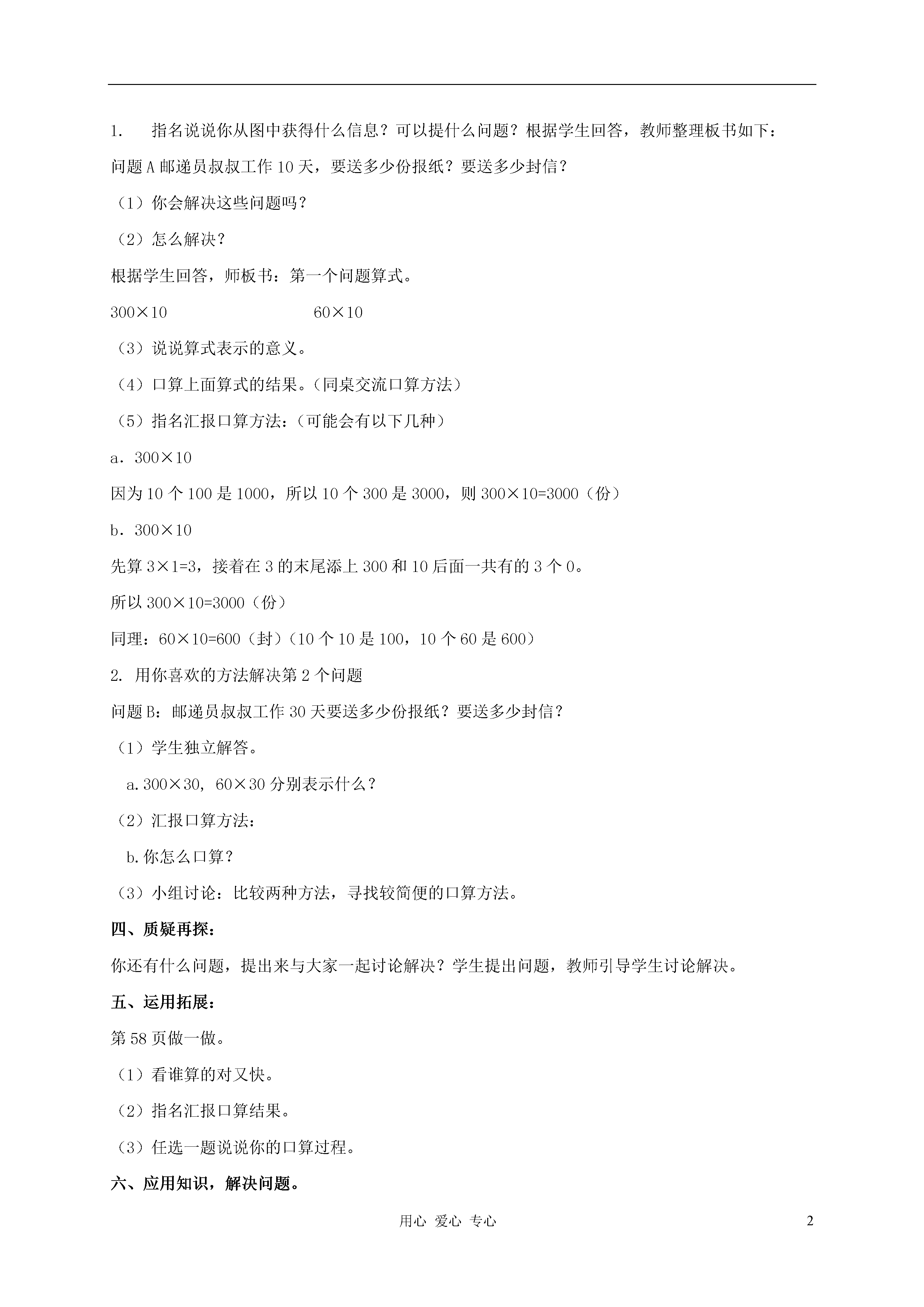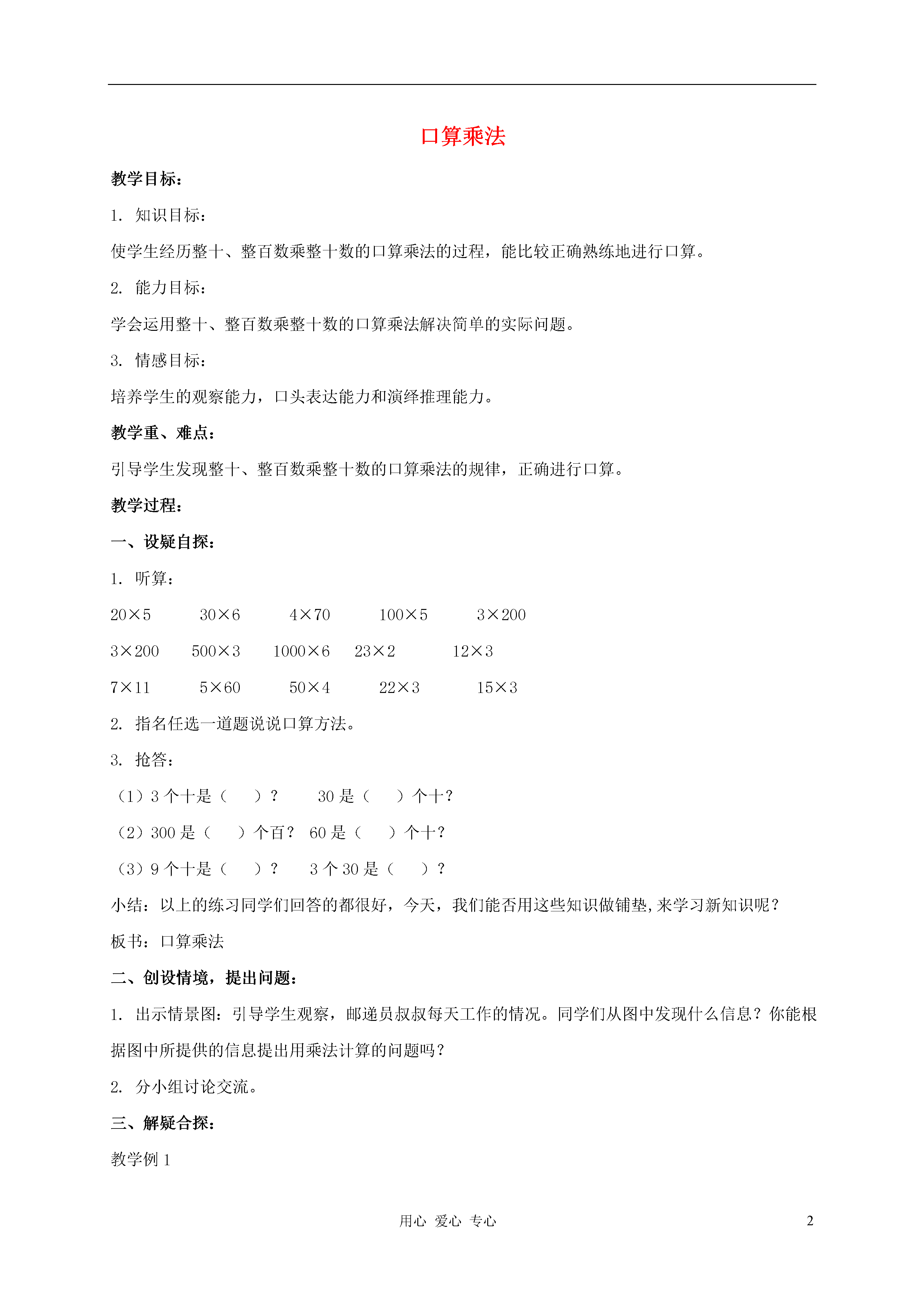 2用心爱心专心口算乘法教学目标:1.知识目标:使学生经历整十、整百数乘整十数的口算乘法的过程,能比较正确熟练地进行口算。2.能力目标:学会运用整十、整百数乘整十数的口算乘法解决简单的实际问题。3.情感目标:培养学生的观察能力,口头表达能力和演绎推理能力。教学重、难点:引导学生发现整十、整百数乘整十数的口算乘法的规律,正确进行口算。教学过程:一、设疑自探:1.听算:20×530×64×70100×53×2003×200500×31000×623×212×37×115×6050×422×315×32.指名任选一道题说说口算方法。3.抢答:(1)3个十是()?30是()个十?(2)300是()个百?60是()个十?(3)9个十是()?3个30是()?小结:以上的练习同学们回答的都很好,今天,我们能否用这些知识做铺垫,来学习新知识呢?板书:口算乘法二、创设情境,提出问题:1.出示情景图:引导学生观察,邮递员叔叔每天工作的情况。同学们从图中发现什么信息?你能根据图中所提供的信息提出用乘法计算的问题吗?2.分小组讨论交流。三、解疑合探:教学例11.指名说说你从图中获得什么信息?可以提什么问题?根据学生回答,教师整理板书如下:问题A邮递员叔叔工作10天,要送多少份报纸?要送多少封信?(1)你会解决这些问题吗?(2)怎么解决?根据学生回答,师板书:第一个问题算式。300×1060×10(3)说说算式表示的意义。(4)口算上面算式的结果。(同桌交流口算方法)(5)指名汇报口算方法:(可能会有以下几种)a.300×10因为10个100是1000,所以10个300是3000,则300×10=3000(份)b.300×10先算3×1=3,接着在3的末尾添上300和10后面一共有的3个0。所以300×10=3000(份)同理:60×10=600(封)(10个10是100,10个60是600)2.用你喜欢的方法解决第2个问题问题B:邮递员叔叔工作30天要送多少份报纸?要送多少封信?(1)学生独立解答。a.300×30,60×30分别表示什么?(2)汇报口算方法:b.你怎么口算?(3)小组讨论:比较两种方法,寻找较简便的口算方法。四、质疑再探:你还有什么问题,提出来与大家一起讨论解决?学生提出问题,教师引导学生讨论解决。五、运用拓展:做一做。(1)看谁算的对又快。(2)指名汇报口算结果。(3)任选一题说说你的口算过程。六、应用知识,解决问题。1.第60第3题。(1)独立完成。(2)同桌交流。2.开火车口算比赛。第1、2两题。(得数答错的学生自己编一题再答,若学习有困难的可请其他同学帮助)作业:第5、6题。小结:本节课你有什么收获?还有不明白的或需要提醒大家的吗?