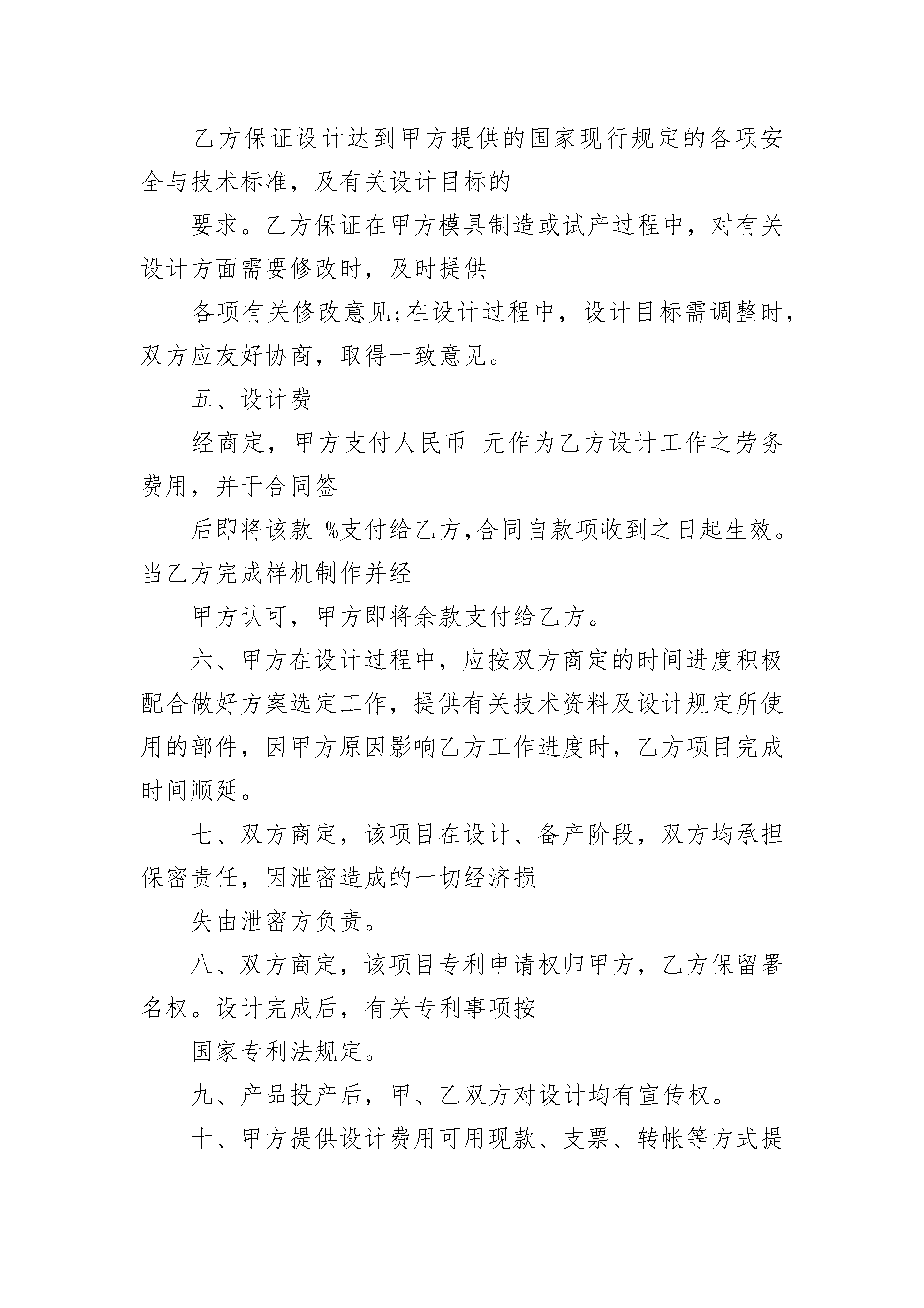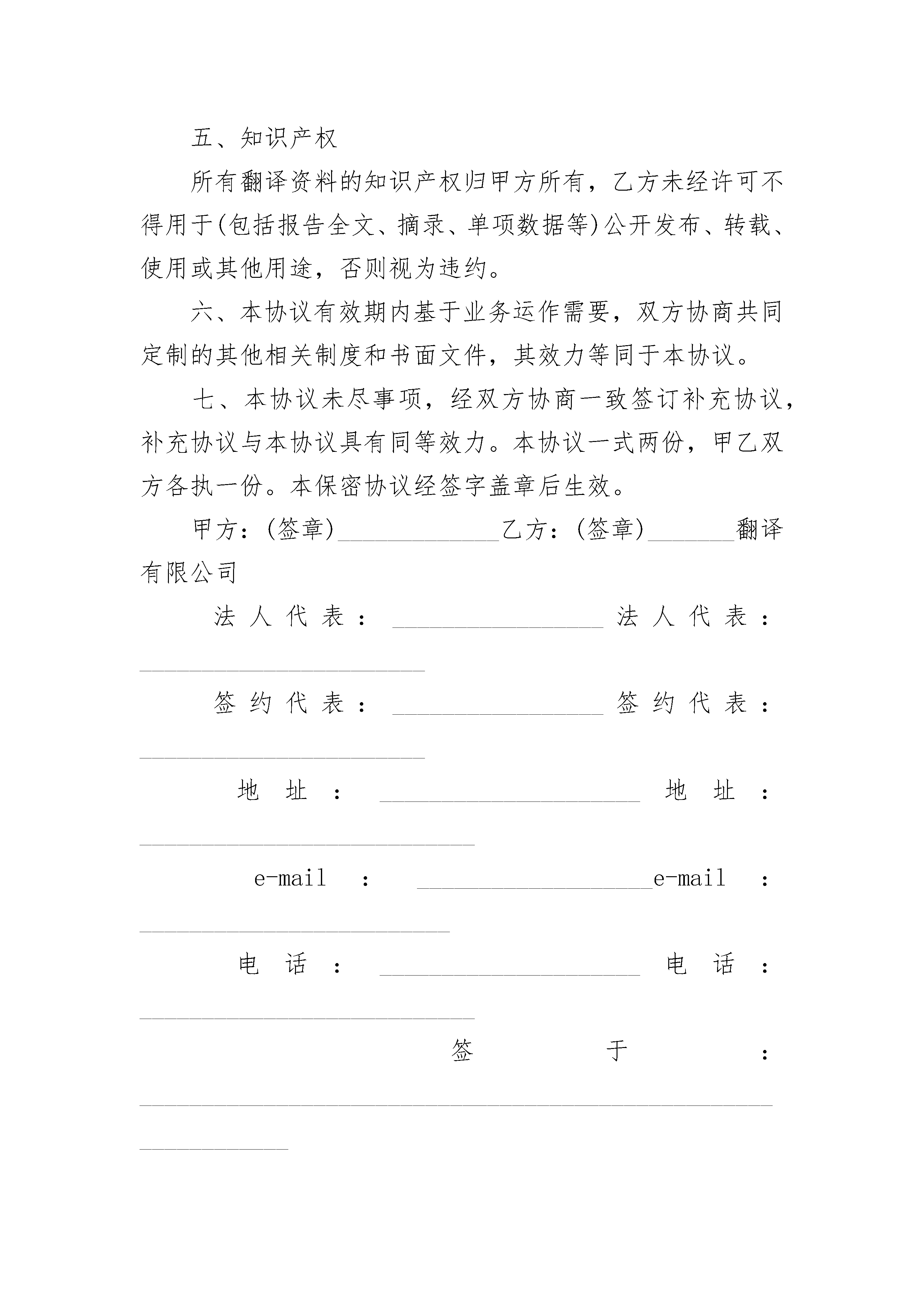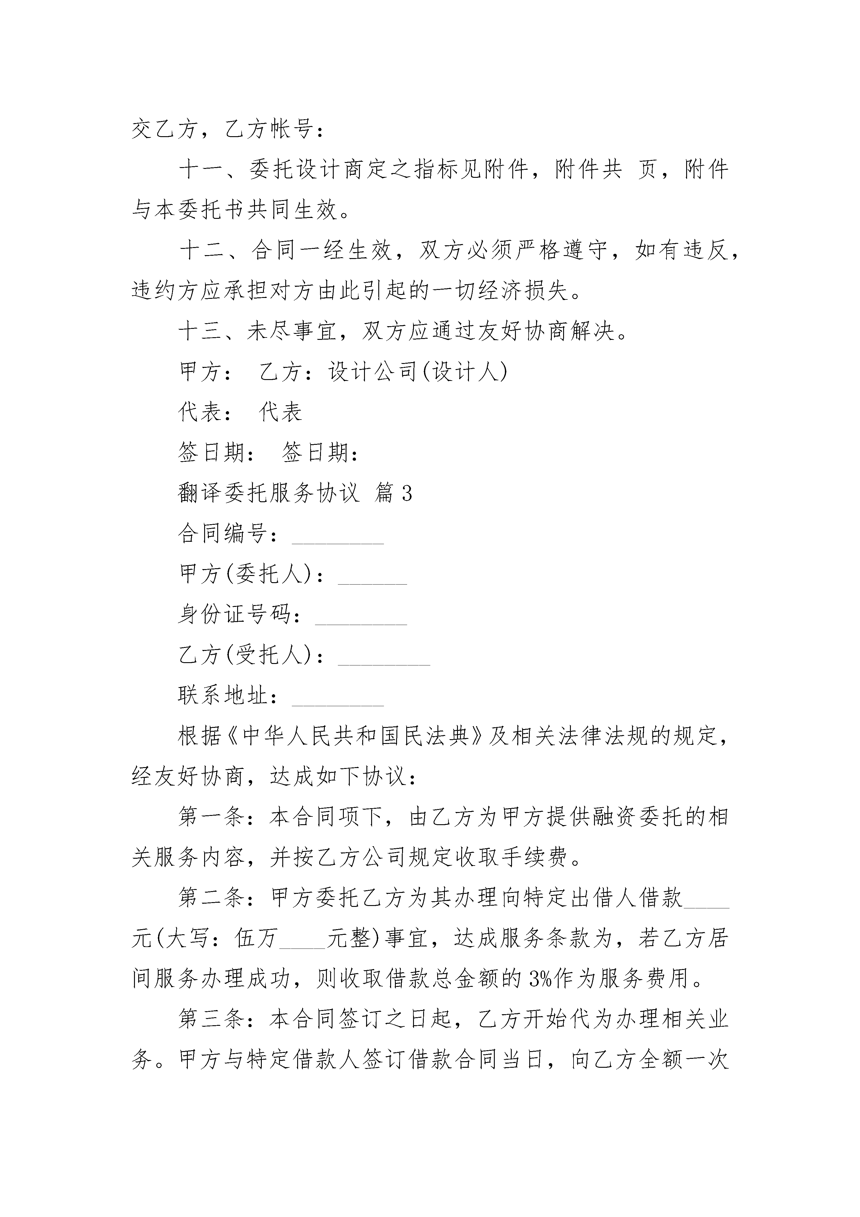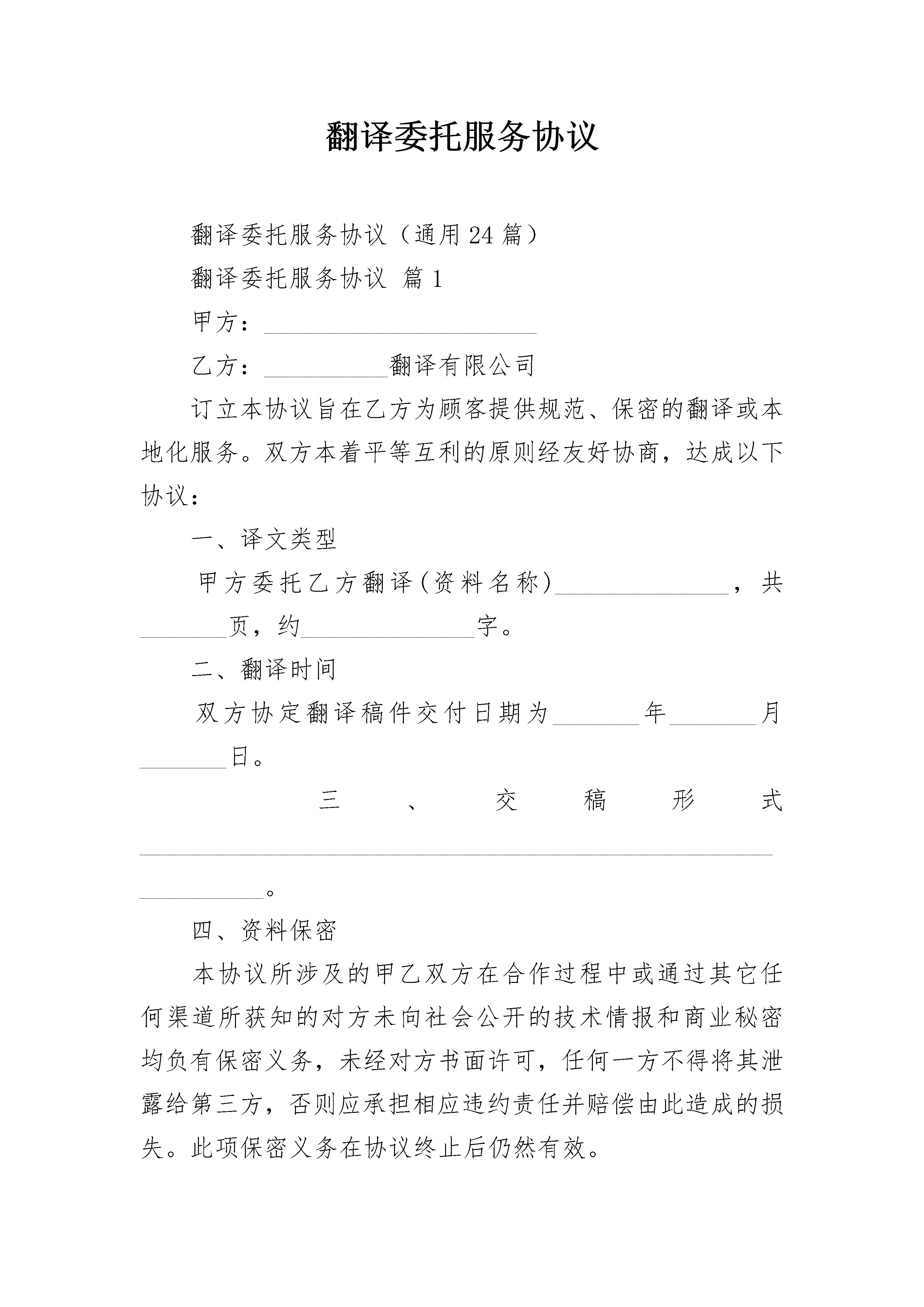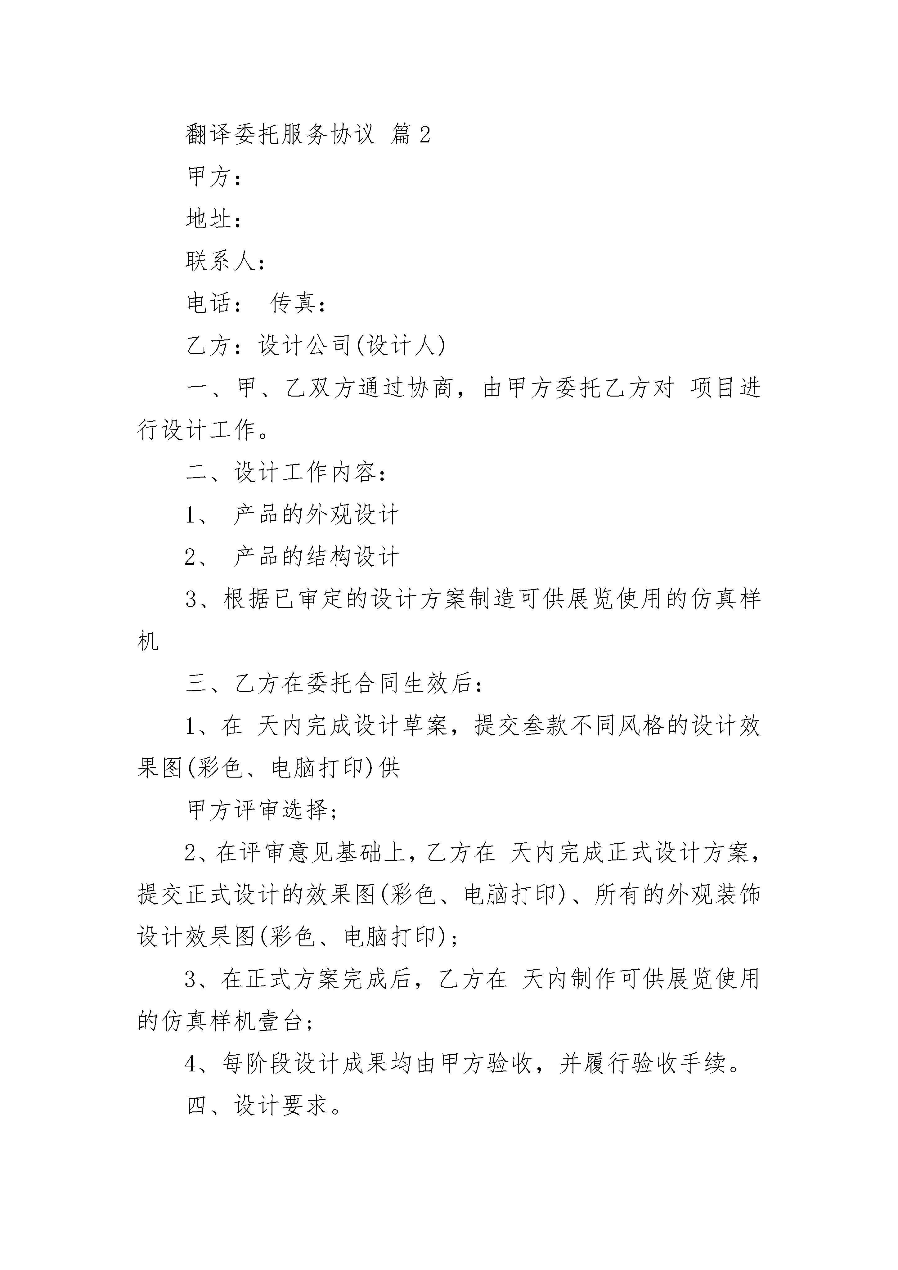 翻译委托服务协议翻译委托服务协议(通用24篇)翻译委托服务协议篇1甲方:______________________乙方:__________翻译有限公司订立本协议旨在乙方为顾客提供规范、保密的翻译或本地化服务。双方本着平等互利的原则经友好协商,达成以下协议:一、译文类型甲方委托乙方翻译(资料名称)______________,共_______页,约______________字。二、翻译时间双方协定翻译稿件交付日期为_______年_______月_______日。三、交稿形式_____________________________________________________________。四、资料保密本协议所涉及的甲乙双方在合作过程中或通过其它任何渠道所获知的对方未向社会公开的技术情报和商业秘密均负有保密义务,未经对方书面许可,任何一方不得将其泄露给第三方,否则应承担相应违约责任并赔偿由此造成的损失。此项保密义务在协议终止后仍然有效。五、知识产权所有翻译资料的知识产权归甲方所有,乙方未经许可不得用于(包括报告全文、摘录、单项数据等)公开发布、转载、使用或其他用途,否则视为违约。六、本协议有效期内基于业务运作需要,双方协商共同定制的其他相关制度和书面文件,其效力等同于本协议。七、本协议未尽事项,经双方协商一致签订补充协议,补充协议与本协议具有同等效力。本协议一式两份,甲乙双方各执一份。本保密协议经签字盖章后生效。甲方:(签章)_____________乙方:(签章)_______翻译有限公司法人代表:_________________法人代表:_______________________签约代表:_________________签约代表:_______________________地址:_____________________地址:___________________________e-mail:___________________e-mail:_________________________电话:_____________________电话:___________________________签于:_______________________________________________________________翻译委托服务协议篇2甲方:地址:联系人:电话:传真:乙方:设计公司(设计人)一、甲、乙双方通过协商,由甲方委托乙方对项目进行设计工作。二、设计工作内容:1、产品的外观设计2、产品的结构设计3、根据已审定的设计方案制造可供展览使用的仿真样机三、乙方在委托合同生效后:1、在天内完成设计草案,提交叁款不同风格的设计效果图(彩色、电脑打印)供甲方评审选择;2、在评审意见基础上,乙方在天内完成正式设计方案,提交正式设计的效果图(彩色、电脑打印)、所有的外观装饰设计效果图(彩色、电脑打印);3、在正式方案完成后,乙方在天内制作可供展览使用的仿真样机壹台;4、每阶段设计成果均由甲方验收,并履行验收手续。四、设计要求。乙方保证设计达到甲方提供的国家现行规定的各项安全与技术标准,及有关设计目标的要求。乙方保证在甲方模具制造或试产过程中,对有关设计方面需要修改时,及时提供各项有关修改意见;在设计过程中,设计目标需调整时,双方应友好协商,取得一致意见。五、设计费经商定,甲方支付人民币元作为乙方设计工作之劳务费用,并于合同签后即将该款%支付给乙方,合同自款项收到之日起生效。当乙方完成样机制作并经甲方认可,甲方即将余款支付给乙方。六、甲方在设计过程中,应按双方商定的时间进度积极配合做好方案选定工作,提供有关技术资料及设计规定所使用的部件,因甲方原因影响乙方工作进度时,乙方项目完成时间顺延。七、双方商定,该项目在设计、备产阶段,双方均承担保密责任,因泄密造成的一切经济损失由泄密方负责。八、双方商定,该项目专利申请权归甲方,乙方保留署名权。设计完成后,有关专利事项按国家专利法规定。九、产品投产后,甲、乙双方对设计均有宣传权。十、甲方提供设计费用可用现款、支票、转帐等方式提交乙方,乙方帐号:十一、委托设计商定之指标见附件,附件共页,附件与本委托书共同生效。十二、合同一经生效,双方必须严格遵守,如有违反,违约方应承担对方由此引起的一切经济损失。十三、未尽事宜,双方应通过友好协商解决。甲方:乙方:设计公司(设计人)代表:代表签日期:签日期:翻译委托服务协议篇3合同编号:________甲方(委托人):______身份证号码:________乙方(受托人):________联系地址:________根据《中华人民共和国民法典》及相关法律法规的规定,经友好协商,达成如下协议:第一条:本合同项下,由乙方为甲方提供融资
