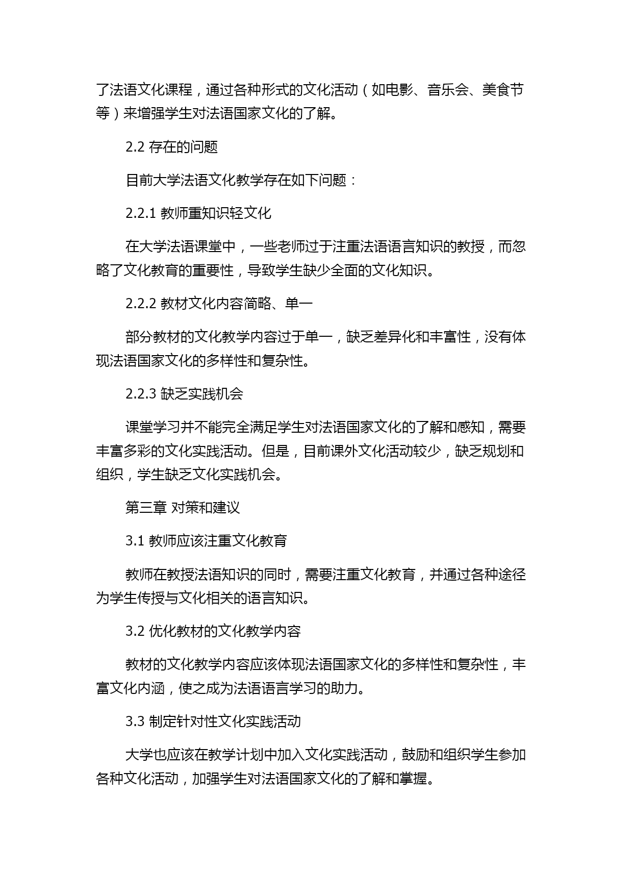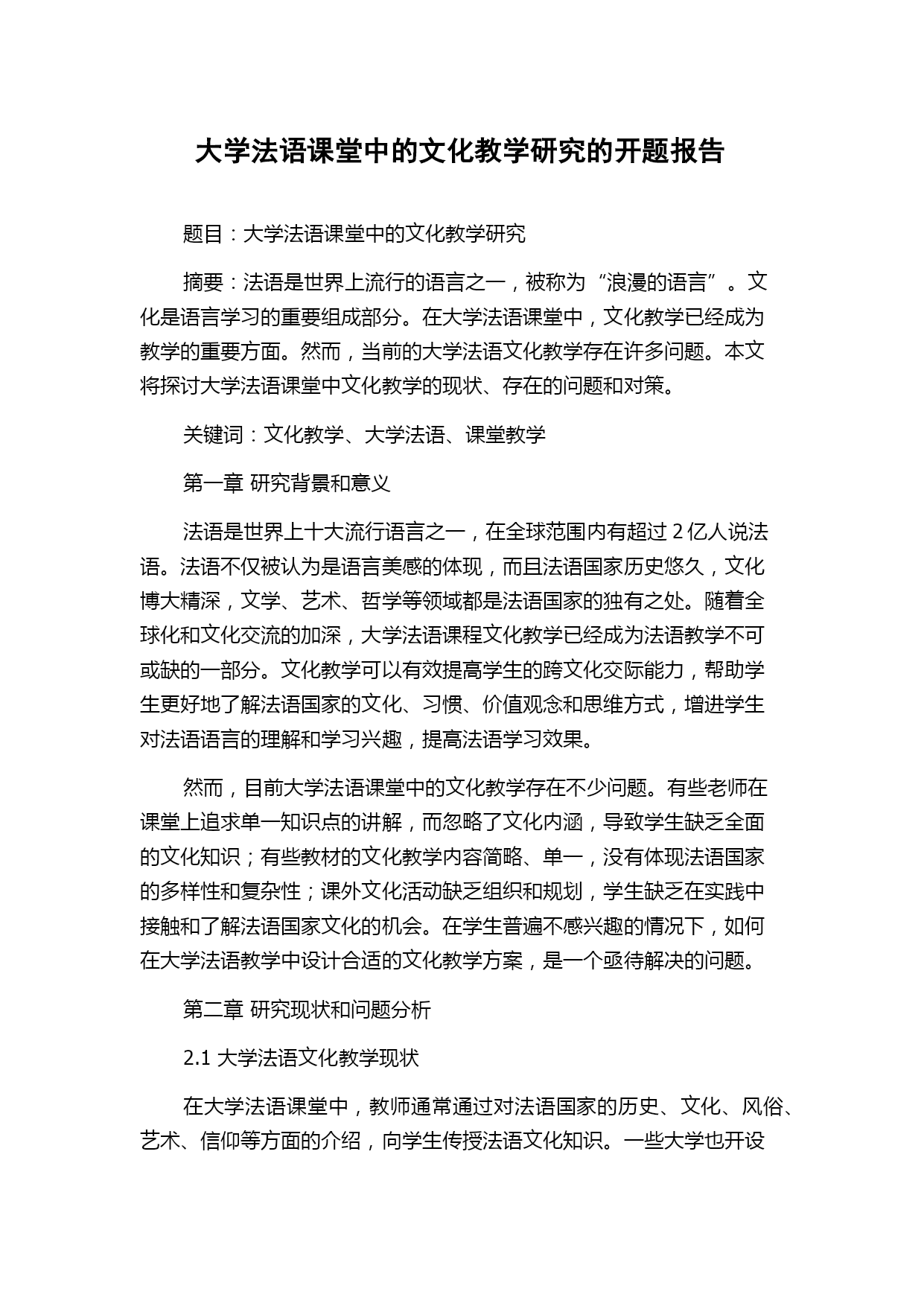 大学法语课堂中的文化教学研究的开题报告 题目:大学法语课堂中的文化教学研究 摘要:法语是世界上流行的语言之一,被称为“浪漫的语言”。文化是语言学习的重要组成部分。在大学法语课堂中,文化教学已经成为教学的重要方面。然而,当前的大学法语文化教学存在许多问题。本文将探讨大学法语课堂中文化教学的现状、存在的问题和对策。 关键词:文化教学、大学法语、课堂教学 第一章研究背景和意义 法语是世界上十大流行语言之一,在全球范围内有超过2亿人说法语。法语不仅被认为是语言美感的体现,而且法语国家历史悠久,文化博大精深,文学、艺术、哲学等领域都是法语国家的独有之处。随着全球化和文化交流的加深,大学法语课程文化教学已经成为法语教学不可或缺的一部分。文化教学可以有效提高学生的跨文化交际能力,帮助学生更好地了解法语国家的文化、习惯、价值观念和思维方式,增进学生对法语语言的理解和学习兴趣,提高法语学习效果。 然而,目前大学法语课堂中的文化教学存在不少问题。有些老师在课堂上追求单一知识点的讲解,而忽略了文化内涵,导致学生缺乏全面的文化知识;有些教材的文化教学内容简略、单一,没有体现法语国家的多样性和复杂性;课外文化活动缺乏组织和规划,学生缺乏在实践中接触和了解法语国家文化的机会。在学生普遍不感兴趣的情况下,如何在大学法语教学中设计合适的文化教学方案,是一个亟待解决的问题。 第二章研究现状和问题分析 2.1大学法语文化教学现状 在大学法语课堂中,教师通常通过对法语国家的历史、文化、风俗、艺术、信仰等方面的介绍,向学生传授法语文化知识。一些大学也开设了法语文化课程,通过各种形式的文化活动(如电影、音乐会、美食节等)来增强学生对法语国家文化的了解。 2.2存在的问题 目前大学法语文化教学存在如下问题: 2.2.1教师重知识轻文化 在大学法语课堂中,一些老师过于注重法语语言知识的教授,而忽略了文化教育的重要性,导致学生缺少全面的文化知识。 2.2.2教材文化内容简略、单一 部分教材的文化教学内容过于单一,缺乏差异化和丰富性,没有体现法语国家文化的多样性和复杂性。 2.2.3缺乏实践机会 课堂学习并不能完全满足学生对法语国家文化的了解和感知,需要丰富多彩的文化实践活动。但是,目前课外文化活动较少,缺乏规划和组织,学生缺乏文化实践机会。 第三章对策和建议 3.1教师应该注重文化教育 教师在教授法语知识的同时,需要注重文化教育,并通过各种途径为学生传授与文化相关的语言知识。 3.2优化教材的文化教学内容 教材的文化教学内容应该体现法语国家文化的多样性和复杂性,丰富文化内涵,使之成为法语语言学习的助力。 3.3制定针对性文化实践活动 大学也应该在教学计划中加入文化实践活动,鼓励和组织学生参加各种文化活动,加强学生对法语国家文化的了解和掌握。 第四章结论 大学法语课堂中的文化教学已经成为重要的教学课程。本文探讨了大学法语文化教学的现状、存在的问题以及对策和建议。各方应紧密合作,充分利用教学方法和学习资源,优化文化教学设计,从根本上增强学生法语文化的学习兴趣和跨文化交际能力,推动大学法语课堂中的文化教学迈上新的台阶。
