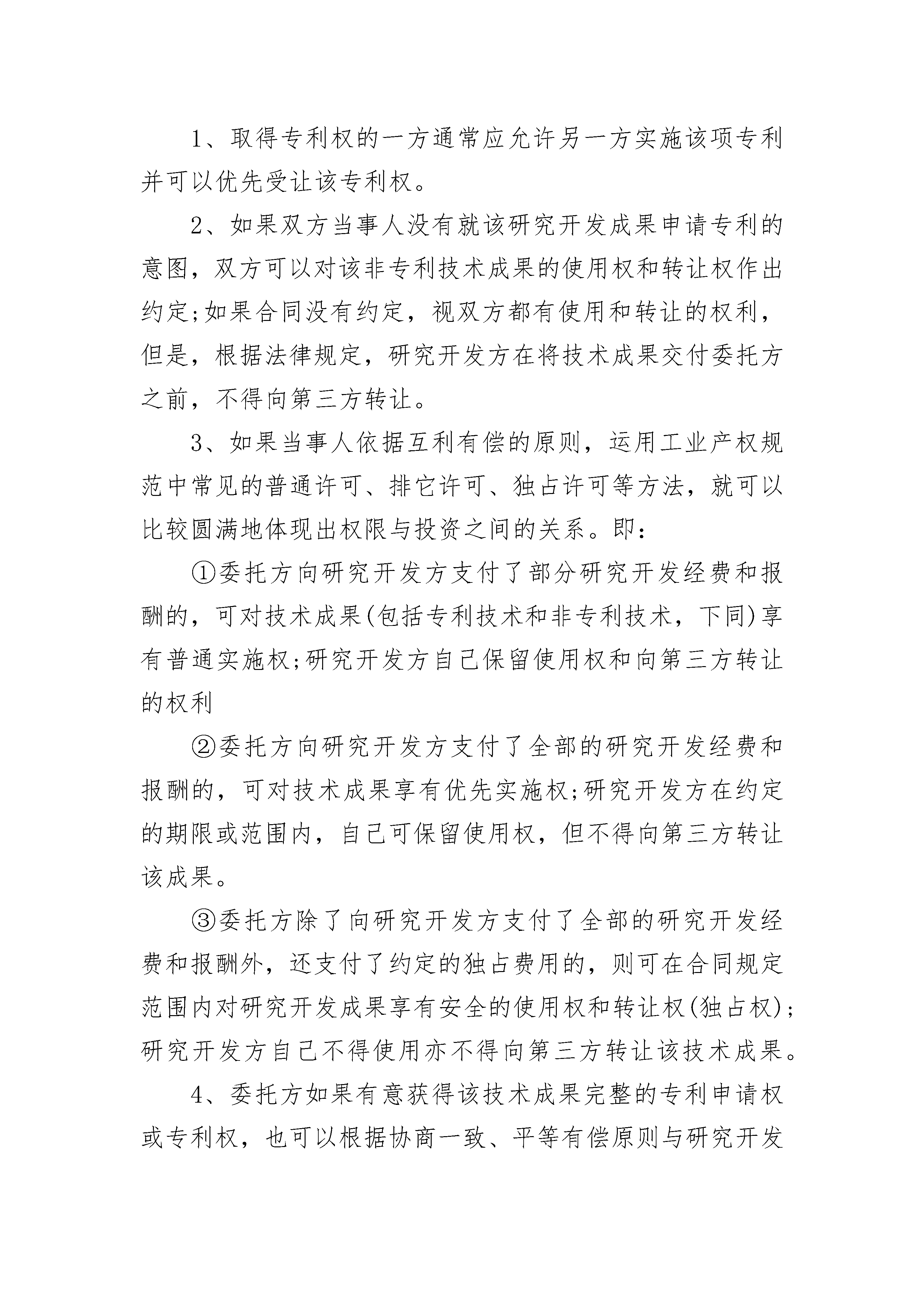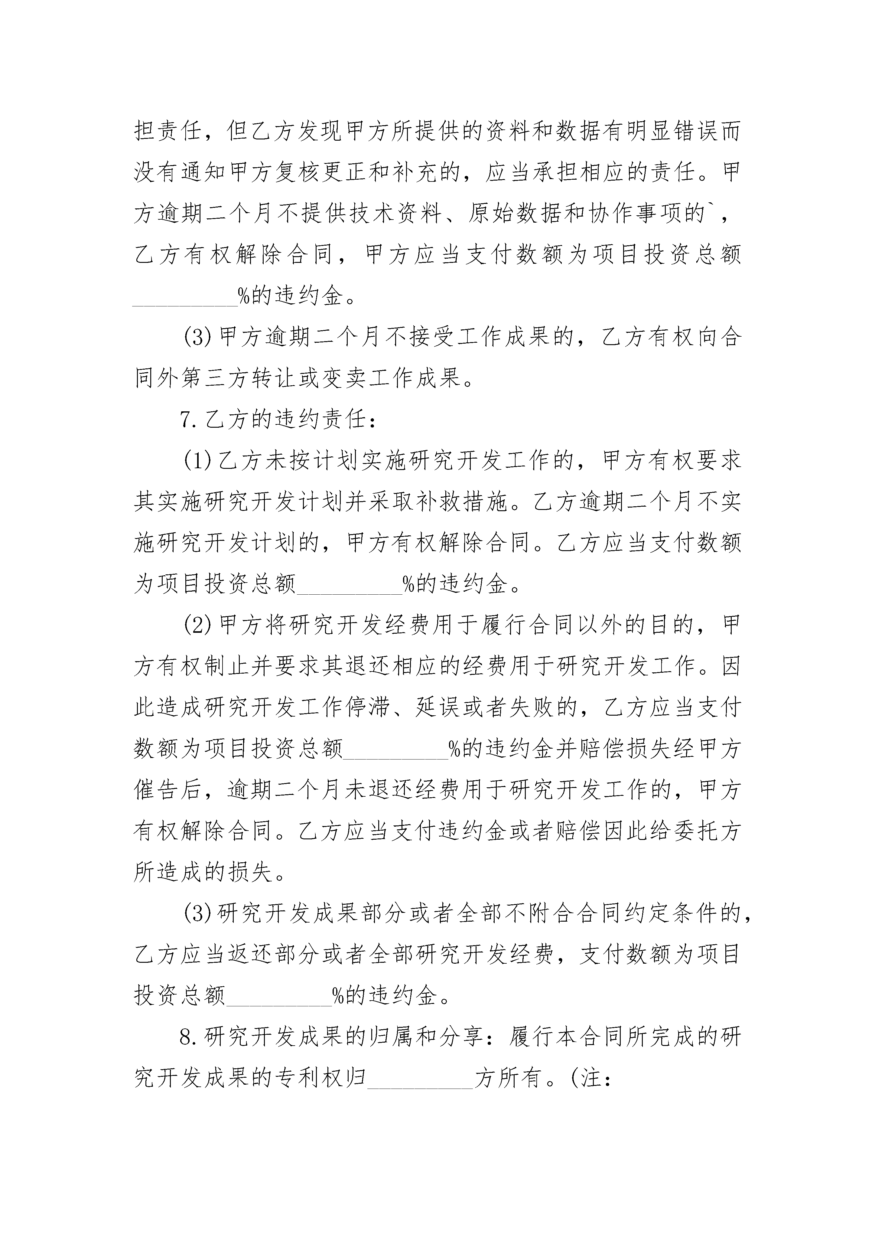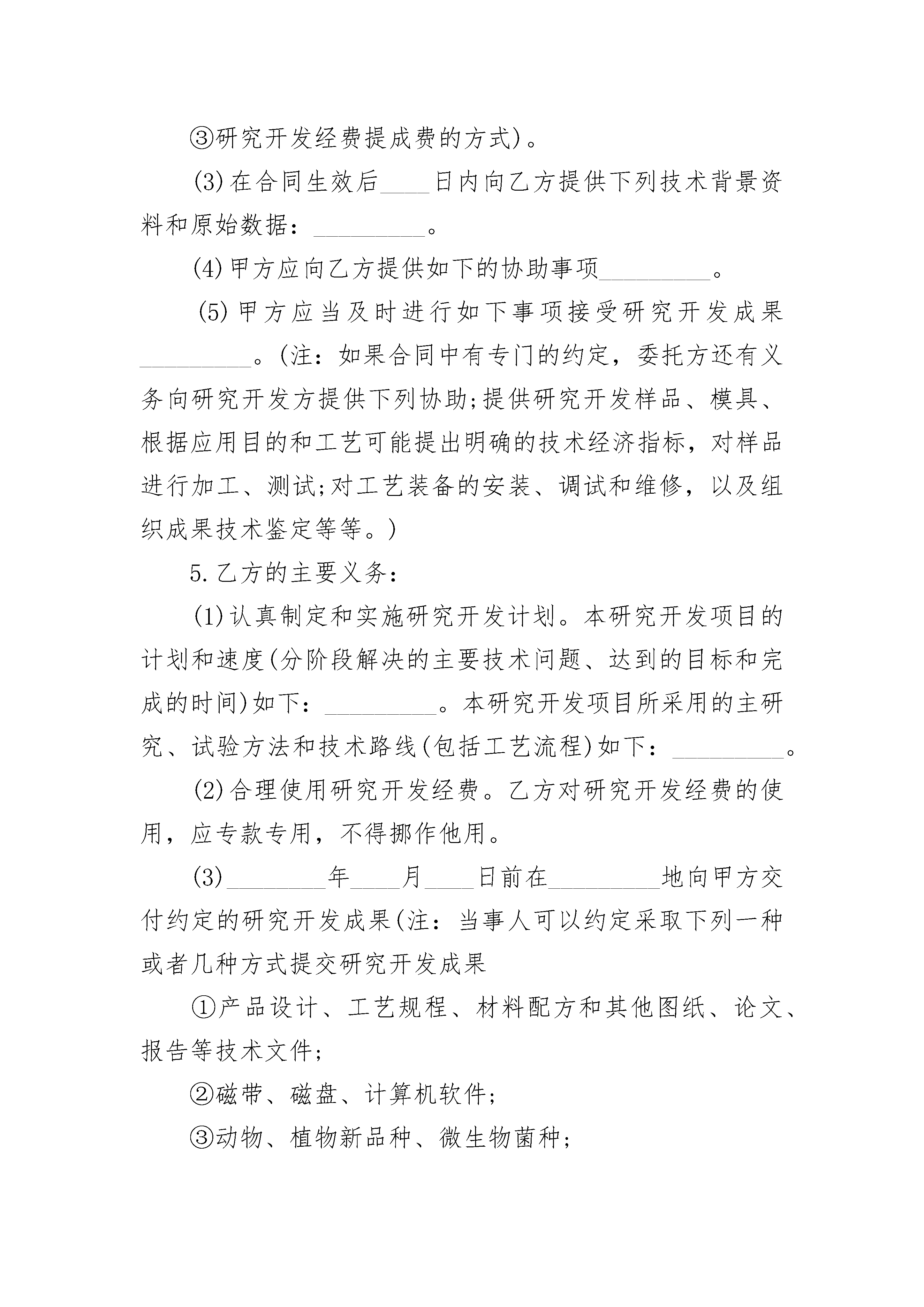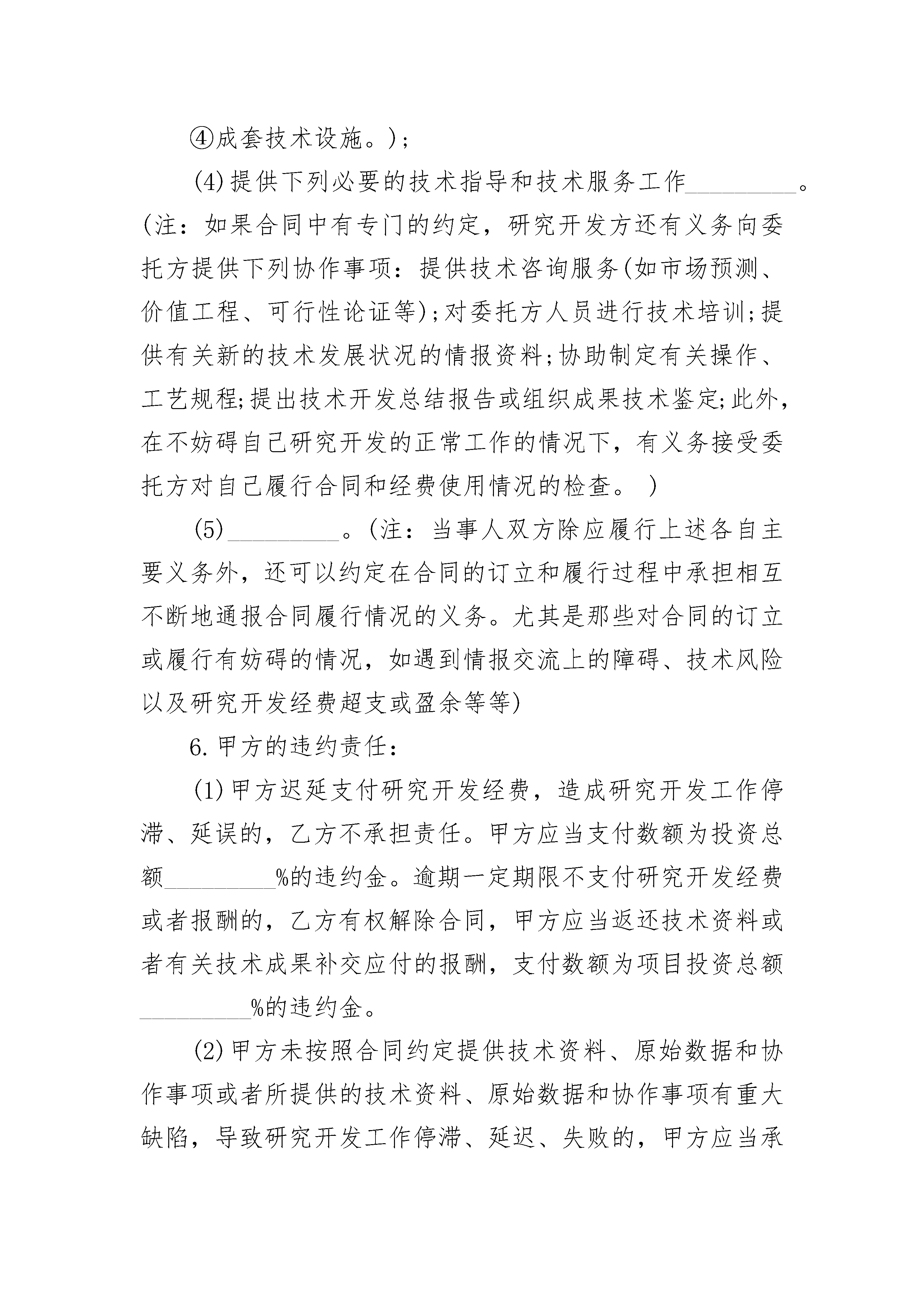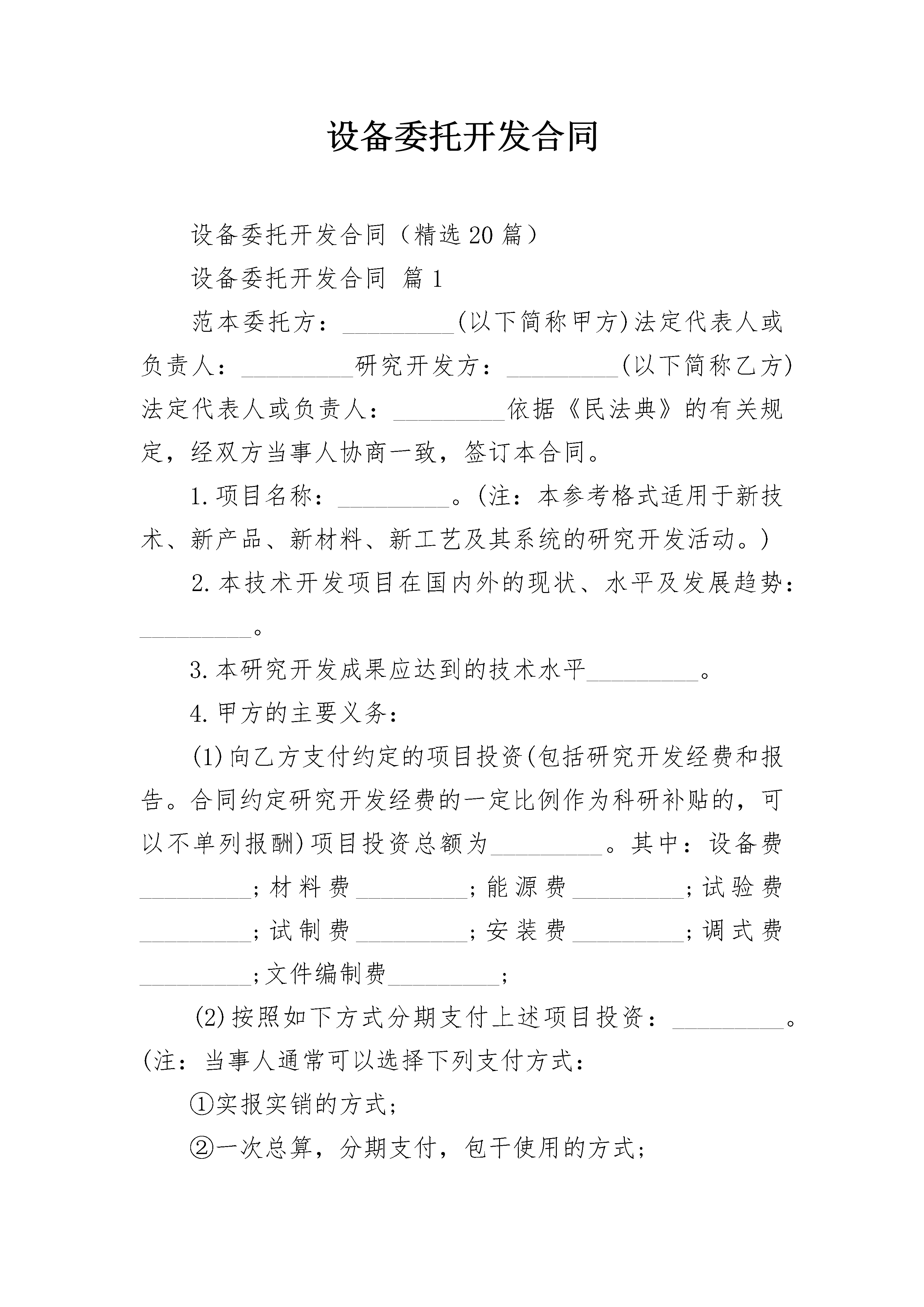 设备委托开发合同设备委托开发合同(精选20篇)设备委托开发合同篇1范本委托方:_________(以下简称甲方)法定代表人或负责人:_________研究开发方:_________(以下简称乙方)法定代表人或负责人:_________依据《民法典》的有关规定,经双方当事人协商一致,签订本合同。1.项目名称:_________。(注:本参考格式适用于新技术、新产品、新材料、新工艺及其系统的研究开发活动。)2.本技术开发项目在国内外的现状、水平及发展趋势:_________。3.本研究开发成果应达到的技术水平_________。4.甲方的主要义务:(1)向乙方支付约定的项目投资(包括研究开发经费和报告。合同约定研究开发经费的一定比例作为科研补贴的,可以不单列报酬)项目投资总额为_________。其中:设备费_________;材料费_________;能源费_________;试验费_________;试制费_________;安装费_________;调式费_________;文件编制费_________;(2)按照如下方式分期支付上述项目投资:_________。(注:当事人通常可以选择下列支付方式:①实报实销的方式;②一次总算,分期支付,包干使用的方式;③研究开发经费提成费的方式)。(3)在合同生效后____日内向乙方提供下列技术背景资料和原始数据:_________。(4)甲方应向乙方提供如下的协助事项_________。(5)甲方应当及时进行如下事项接受研究开发成果_________。(注:如果合同中有专门的约定,委托方还有义务向研究开发方提供下列协助;提供研究开发样品、模具、根据应用目的和工艺可能提出明确的技术经济指标,对样品进行加工、测试;对工艺装备的安装、调试和维修,以及组织成果技术鉴定等等。)5.乙方的主要义务:(1)认真制定和实施研究开发计划。本研究开发项目的计划和速度(分阶段解决的主要技术问题、达到的目标和完成的时间)如下:_________。本研究开发项目所采用的主研究、试验方法和技术路线(包括工艺流程)如下:_________。(2)合理使用研究开发经费。乙方对研究开发经费的使用,应专款专用,不得挪作他用。(3)________年____月____日前在_________地向甲方交付约定的研究开发成果(注:当事人可以约定采取下列一种或者几种方式提交研究开发成果①产品设计、工艺规程、材料配方和其他图纸、论文、报告等技术文件;②磁带、磁盘、计算机软件;③动物、植物新品种、微生物菌种;④成套技术设施。);(4)提供下列必要的技术指导和技术服务工作_________。(注:如果合同中有专门的约定,研究开发方还有义务向委托方提供下列协作事项:提供技术咨询服务(如市场预测、价值工程、可行性论证等);对委托方人员进行技术培训;提供有关新的技术发展状况的情报资料;协助制定有关操作、工艺规程;提出技术开发总结报告或组织成果技术鉴定;此外,在不妨碍自己研究开发的正常工作的情况下,有义务接受委托方对自己履行合同和经费使用情况的检查。)(5)_________。(注:当事人双方除应履行上述各自主要义务外,还可以约定在合同的订立和履行过程中承担相互不断地通报合同履行情况的义务。尤其是那些对合同的订立或履行有妨碍的情况,如遇到情报交流上的障碍、技术风险以及研究开发经费超支或盈余等等)6.甲方的违约责任:(1)甲方迟延支付研究开发经费,造成研究开发工作停滞、延误的,乙方不承担责任。甲方应当支付数额为投资总额_________%的违约金。逾期一定期限不支付研究开发经费或者报酬的,乙方有权解除合同,甲方应当返还技术资料或者有关技术成果补交应付的报酬,支付数额为项目投资总额_________%的违约金。(2)甲方未按照合同约定提供技术资料、原始数据和协作事项或者所提供的技术资料、原始数据和协作事项有重大缺陷,导致研究开发工作停滞、延迟、失败的,甲方应当承担责任,但乙方发现甲方所提供的资料和数据有明显错误而没有通知甲方复核更正和补充的,应当承担相应的责任。甲方逾期二个月不提供技术资料、原始数据和协作事项的`,乙方有权解除合同,甲方应当支付数额为项目投资总额_________%的违约金。(3)甲方逾期二个月不接受工作成果的,乙方有权向合同外第三方转让或变卖工作成果。7.乙方的违约责任:(1)乙方未按计划实施研究开发工作的,甲方有权要求其实施研究开发计划并采取补救措施。乙方逾期二个月不实施研究开发计划的,甲方有权解除合同。乙方应当支付数额为项目投资总额_________%的违约金。(2)甲方将研究开发经费用于履行合同以外的目的,甲方有权制止并要求其退还相应的经费用于研究开发工作。因此造成研究开发工作停滞、延误或者失败的,乙方应当支付数额为项