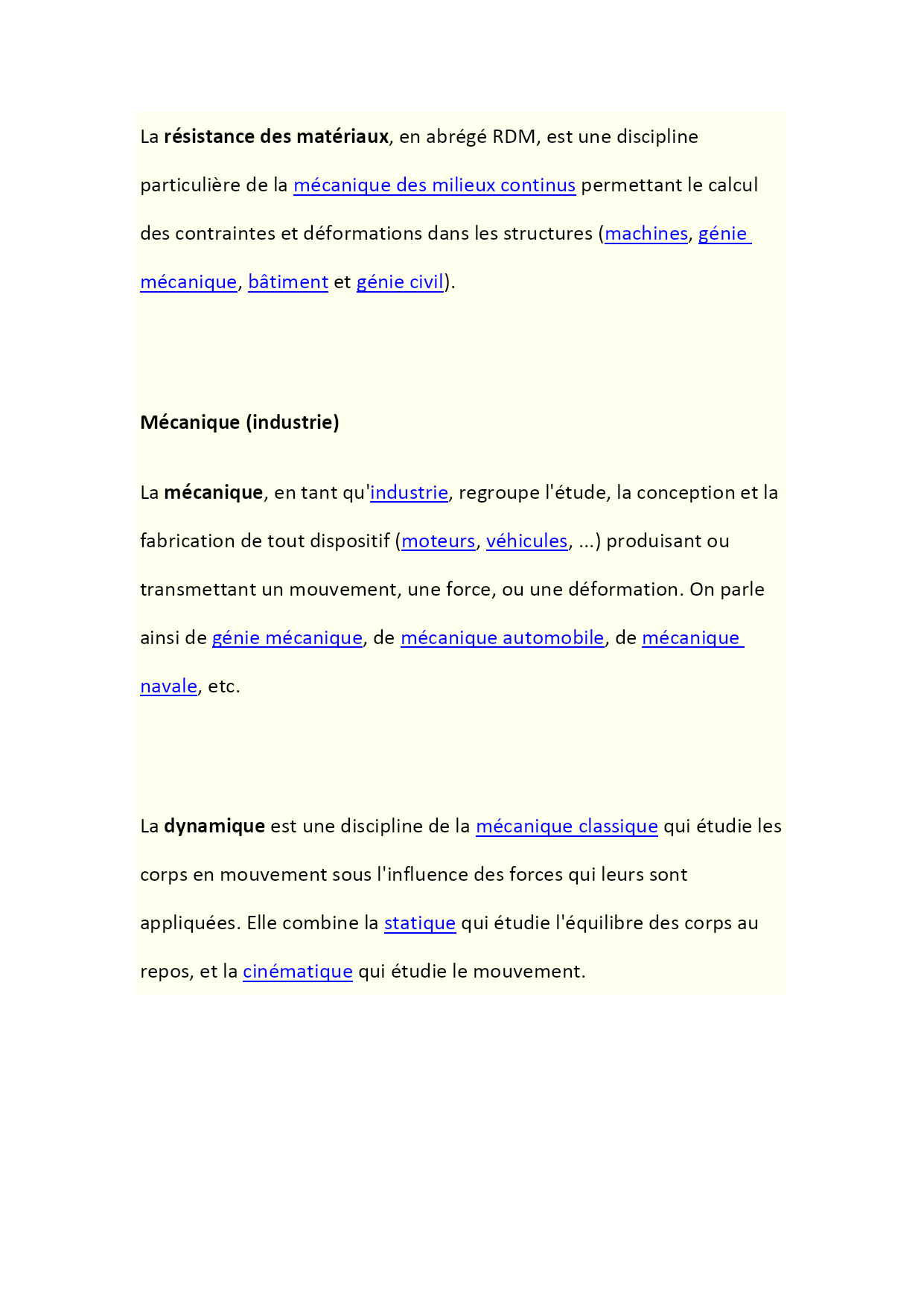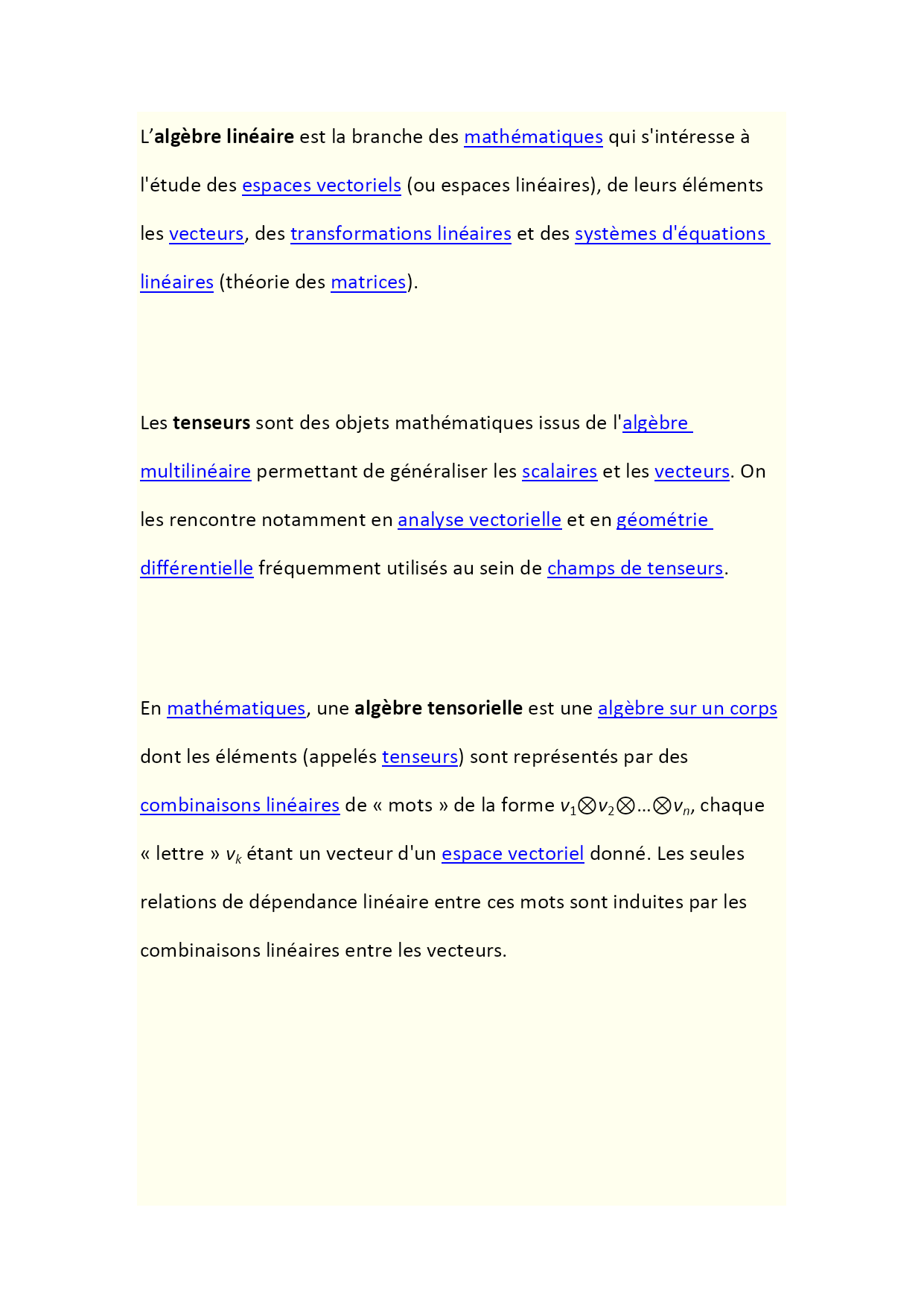 LamécaniquedesmilieuxcontinusestledomainedelaHYPERLINK"http://fr.wikipedia.org/wiki/M%C3%A9canique_(science)"\o"Mécanique(science)"mécaniquequis'intéresseàladéformationdessolidesetàl'écoulementdesfluides—cedernierpointfaitl'objetdel'articleHYPERLINK"http://fr.wikipedia.org/wiki/M%C3%A9canique_des_fluides"\o"Mécaniquedesfluides"mécaniquedesfluides,nousnousintéresseronsdonciciessentiellementàladéformationdessolides. Lamécanique(dugrecΜηχανική,«quiconcernelesmachines»)estunebranchedelaHYPERLINK"http://fr.wikipedia.org/wiki/Physique"\o"Physique"physiquedontl'objetestl'étudeduHYPERLINK"http://fr.wikipedia.org/wiki/Mouvement"\o"Mouvement"mouvements,desHYPERLINK"http://fr.wikipedia.org/wiki/D%C3%A9formation"\o"Déformation"déformationsoudesétatsd'HYPERLINK"http://fr.wikipedia.org/wiki/%C3%89quilibre"\o"Équilibre"équilibredesHYPERLINK"http://fr.wikipedia.org/wiki/Syst%C3%A8me_physique"\o"Systèmephysique"systèmesphysiques.CetteHYPERLINK"http://fr.wikipedia.org/wiki/Science"\o"Science"scienceviseainsiàéluciderlesloisgouvernantlesmouvementsdedifférentessortesdecorps Lamécaniquedesfluidesestl’étudeducomportementdesfluides(HYPERLINK"http://fr.wikipedia.org/wiki/Liquide"\o"Liquide"liquidesetHYPERLINK"http://fr.wikipedia.org/wiki/Gaz"\o"Gaz"gaz)etdesforcesinternesassociées.C’estunebranchedelaHYPERLINK"http://fr.wikipedia.org/wiki/M%C3%A9canique_des_milieux_continus"\o"Mécaniquedesmilieuxcontinus"mécaniquedesmilieuxcontinus Lamécaniquedusolideestlapartiedelamécaniquequis'intéresseauxobjetsquel'onnepeutréduireenunHYPERLINK"http://fr.wikipedia.org/wiki/Point_mat%C3%A9riel"\o"Pointmatériel"pointmatériel.Celapermetnotammentdedécrireetmodéliserlesrotationsdel'objetsurlui-même. L’algèbrelinéaireestlabranchedesHYPERLINK"http://fr.wikipedia.org/wiki/Math%C3%A9matiques"\o"Mathématiques"mathématiquesquis'intéresseàl'étudedesHYPERLINK"http://fr.wikipedia.org/wiki/Espace_vectoriel"\o"Espacevectoriel"espacesvectoriels(ouespaceslinéaires),deleursélém