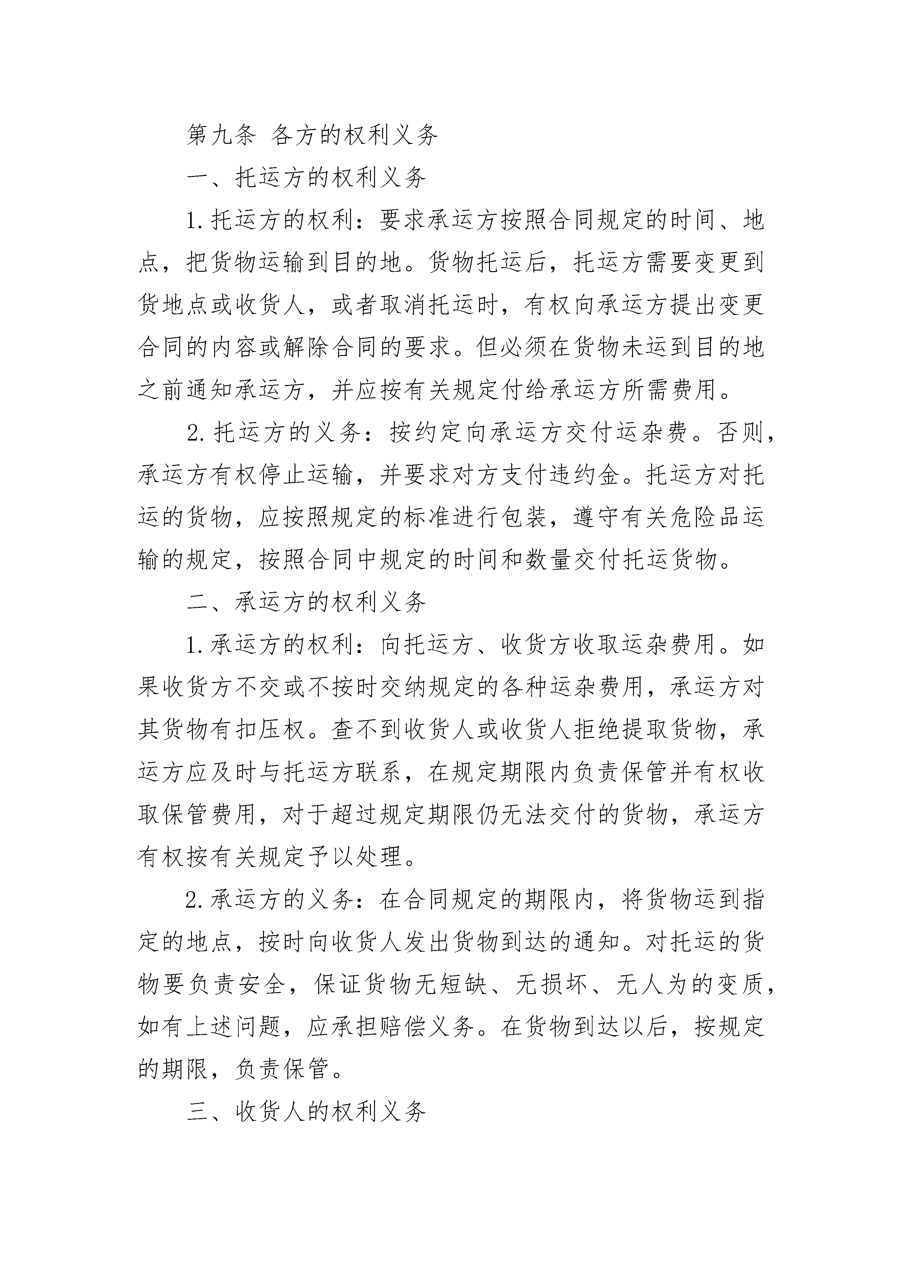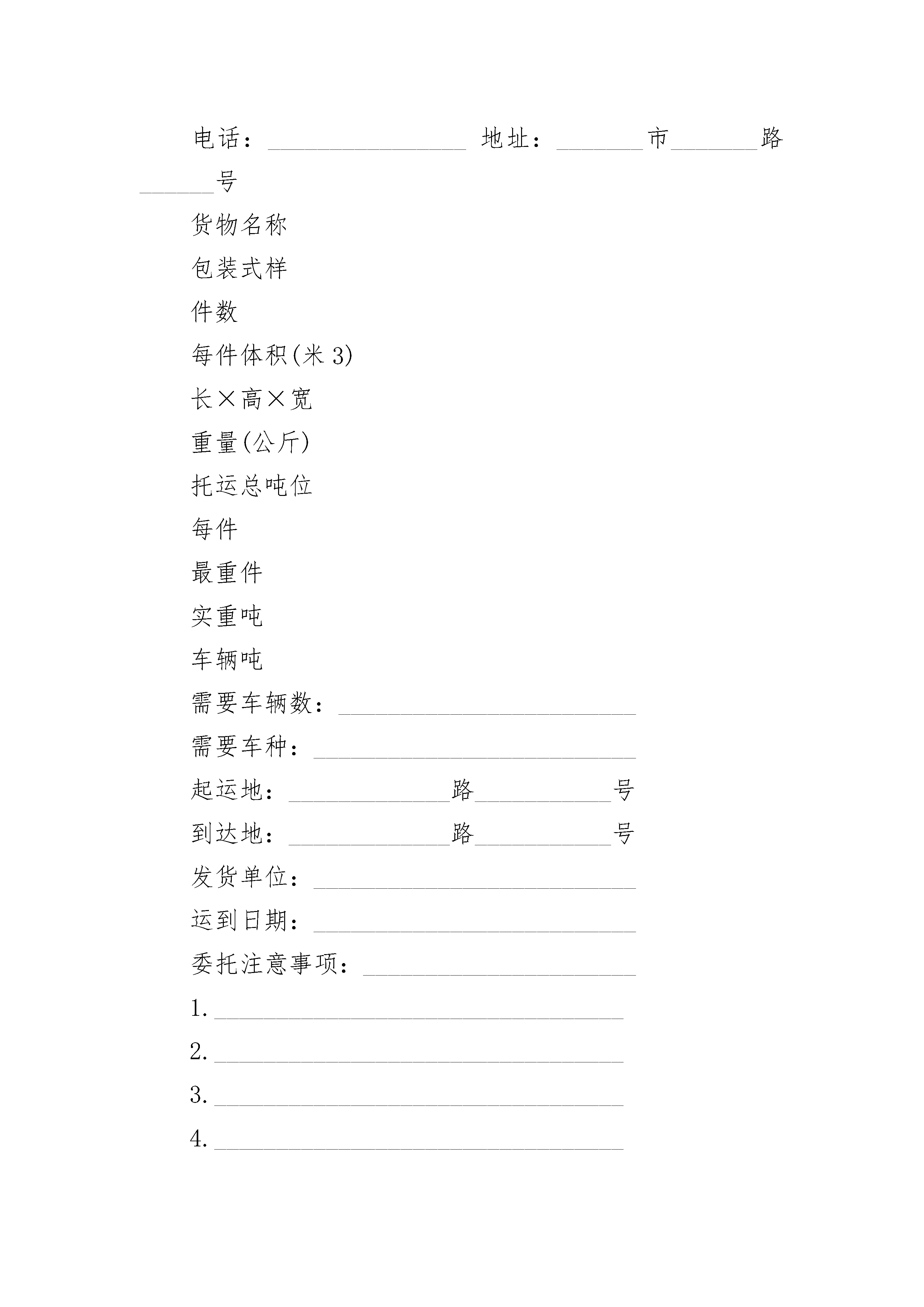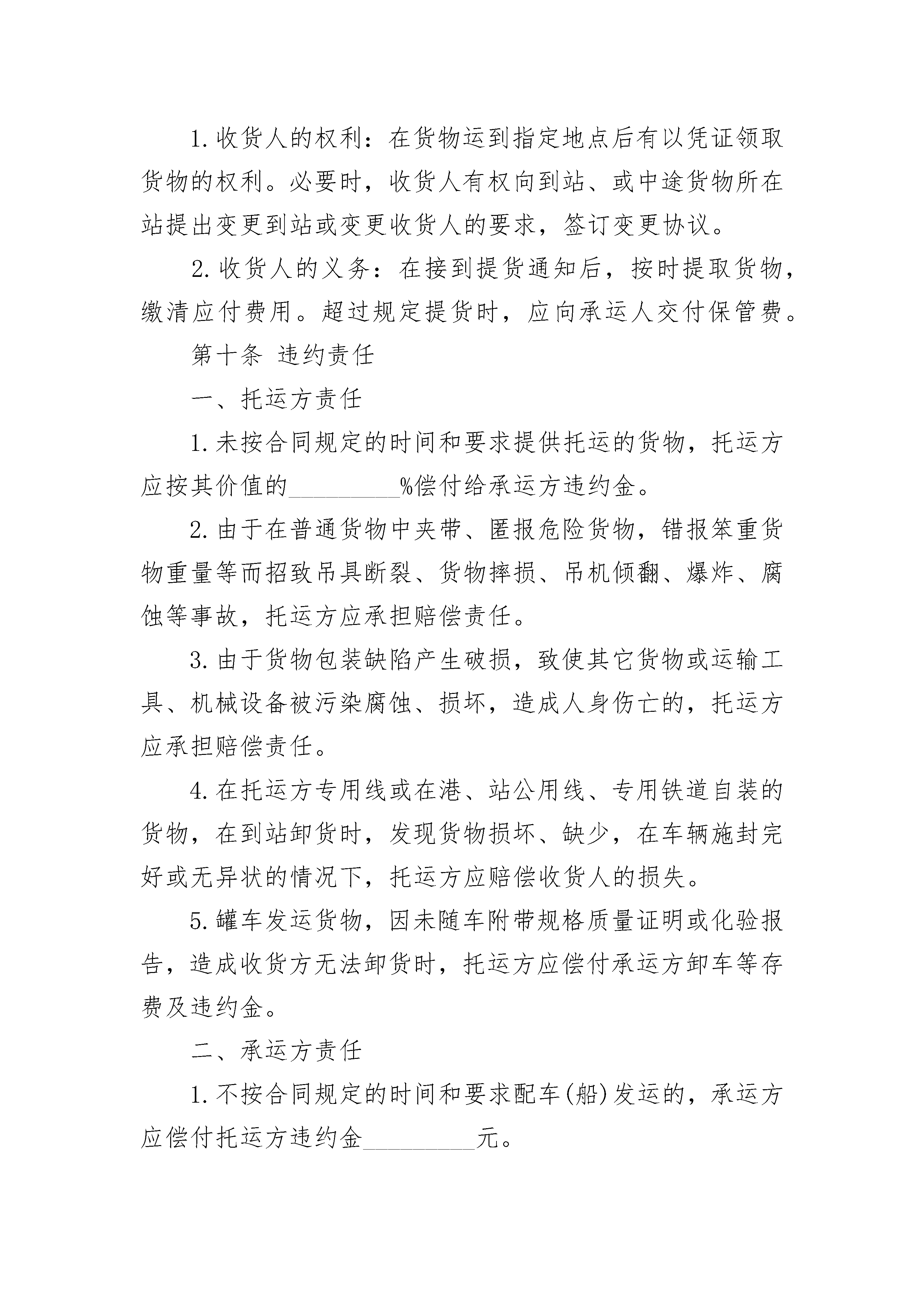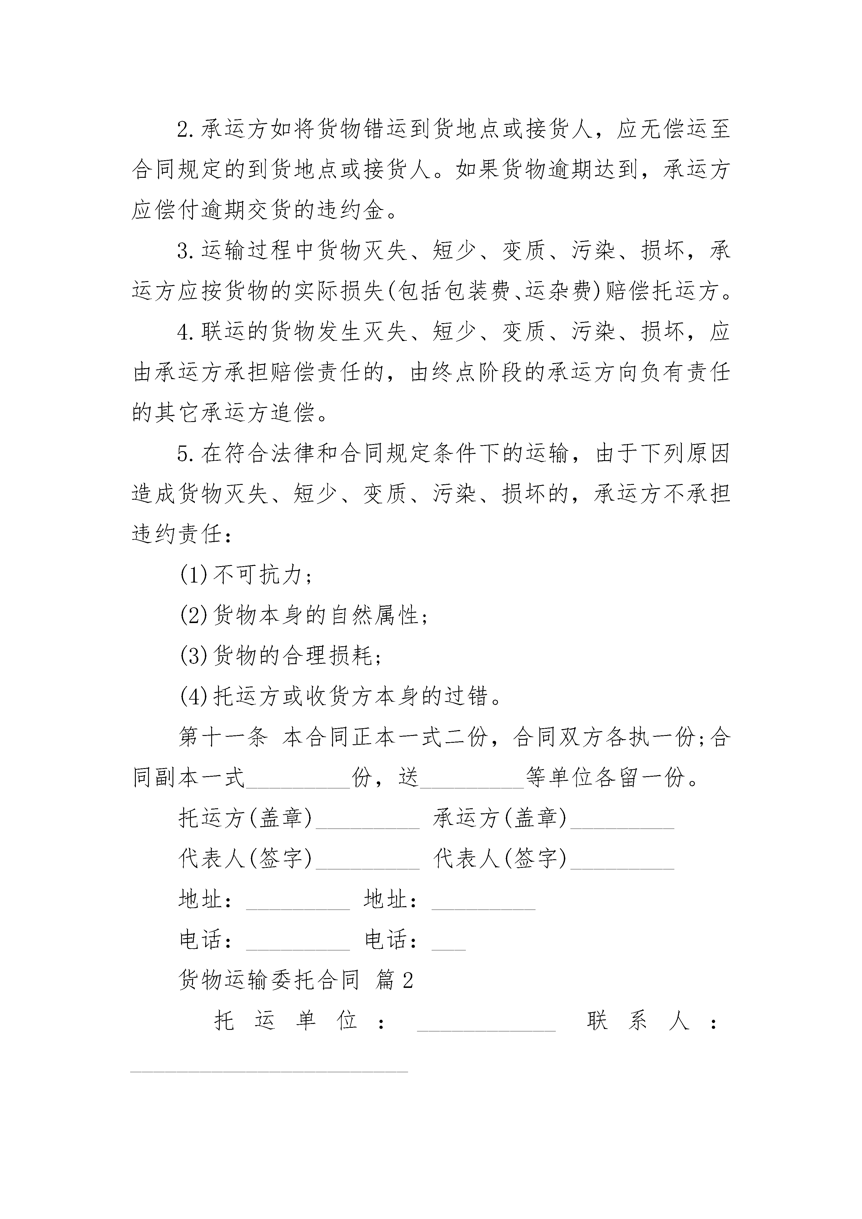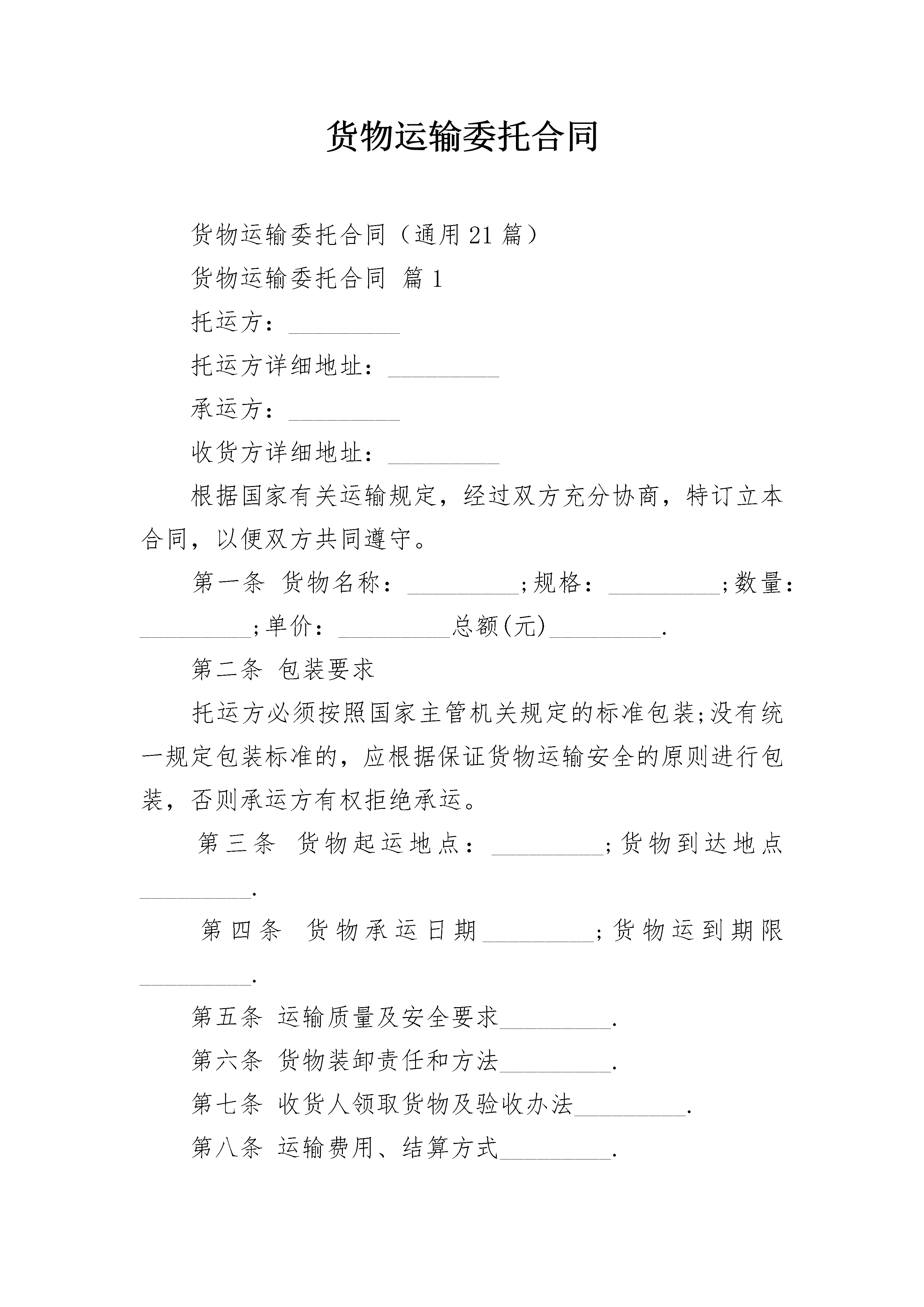 货物运输委托合同货物运输委托合同(通用21篇)货物运输委托合同篇1托运方:_________托运方详细地址:_________承运方:_________收货方详细地址:_________根据国家有关运输规定,经过双方充分协商,特订立本合同,以便双方共同遵守。第一条货物名称:_________;规格:_________;数量:_________;单价:_________总额(元)_________.第二条包装要求托运方必须按照国家主管机关规定的标准包装;没有统一规定包装标准的,应根据保证货物运输安全的原则进行包装,否则承运方有权拒绝承运。第三条货物起运地点:_________;货物到达地点_________.第四条货物承运日期_________;货物运到期限_________.第五条运输质量及安全要求_________.第六条货物装卸责任和方法_________.第七条收货人领取货物及验收办法_________.第八条运输费用、结算方式_________.第九条各方的权利义务一、托运方的权利义务1.托运方的权利:要求承运方按照合同规定的时间、地点,把货物运输到目的地。货物托运后,托运方需要变更到货地点或收货人,或者取消托运时,有权向承运方提出变更合同的内容或解除合同的要求。但必须在货物未运到目的地之前通知承运方,并应按有关规定付给承运方所需费用。2.托运方的义务:按约定向承运方交付运杂费。否则,承运方有权停止运输,并要求对方支付违约金。托运方对托运的货物,应按照规定的标准进行包装,遵守有关危险品运输的规定,按照合同中规定的时间和数量交付托运货物。二、承运方的权利义务1.承运方的权利:向托运方、收货方收取运杂费用。如果收货方不交或不按时交纳规定的各种运杂费用,承运方对其货物有扣压权。查不到收货人或收货人拒绝提取货物,承运方应及时与托运方联系,在规定期限内负责保管并有权收取保管费用,对于超过规定期限仍无法交付的货物,承运方有权按有关规定予以处理。2.承运方的义务:在合同规定的期限内,将货物运到指定的地点,按时向收货人发出货物到达的通知。对托运的货物要负责安全,保证货物无短缺、无损坏、无人为的变质,如有上述问题,应承担赔偿义务。在货物到达以后,按规定的期限,负责保管。三、收货人的权利义务1.收货人的权利:在货物运到指定地点后有以凭证领取货物的权利。必要时,收货人有权向到站、或中途货物所在站提出变更到站或变更收货人的要求,签订变更协议。2.收货人的义务:在接到提货通知后,按时提取货物,缴清应付费用。超过规定提货时,应向承运人交付保管费。第十条违约责任一、托运方责任1.未按合同规定的时间和要求提供托运的货物,托运方应按其价值的_________%偿付给承运方违约金。2.由于在普通货物中夹带、匿报危险货物,错报笨重货物重量等而招致吊具断裂、货物摔损、吊机倾翻、爆炸、腐蚀等事故,托运方应承担赔偿责任。3.由于货物包装缺陷产生破损,致使其它货物或运输工具、机械设备被污染腐蚀、损坏,造成人身伤亡的,托运方应承担赔偿责任。4.在托运方专用线或在港、站公用线、专用铁道自装的货物,在到站卸货时,发现货物损坏、缺少,在车辆施封完好或无异状的情况下,托运方应赔偿收货人的损失。5.罐车发运货物,因未随车附带规格质量证明或化验报告,造成收货方无法卸货时,托运方应偿付承运方卸车等存费及违约金。二、承运方责任1.不按合同规定的时间和要求配车(船)发运的,承运方应偿付托运方违约金_________元。2.承运方如将货物错运到货地点或接货人,应无偿运至合同规定的到货地点或接货人。如果货物逾期达到,承运方应偿付逾期交货的违约金。3.运输过程中货物灭失、短少、变质、污染、损坏,承运方应按货物的实际损失(包括包装费、运杂费)赔偿托运方。4.联运的货物发生灭失、短少、变质、污染、损坏,应由承运方承担赔偿责任的,由终点阶段的承运方向负有责任的其它承运方追偿。5.在符合法律和合同规定条件下的运输,由于下列原因造成货物灭失、短少、变质、污染、损坏的,承运方不承担违约责任:(1)不可抗力;(2)货物本身的自然属性;(3)货物的合理损耗;(4)托运方或收货方本身的过错。第十一条本合同正本一式二份,合同双方各执一份;合同副本一式_________份,送_________等单位各留一份。托运方(盖章)_________承运方(盖章)_________代表人(签字)_________代表人(签字)_________地址:_________地址:_________电话:_________电话:___货物运输委托合同篇2托运单位:____________联系人:________________________电话:________________地址:_______市_______路____
