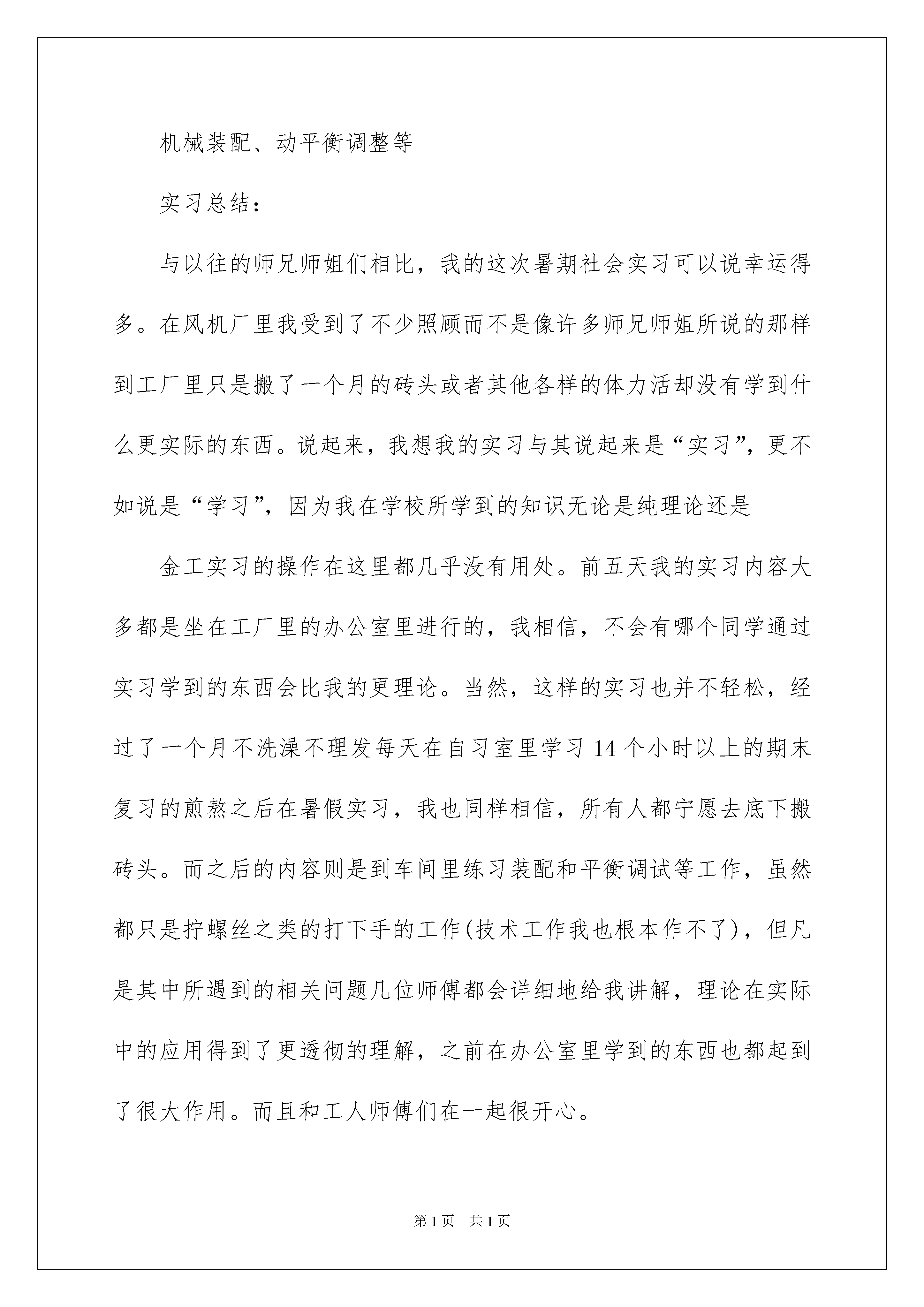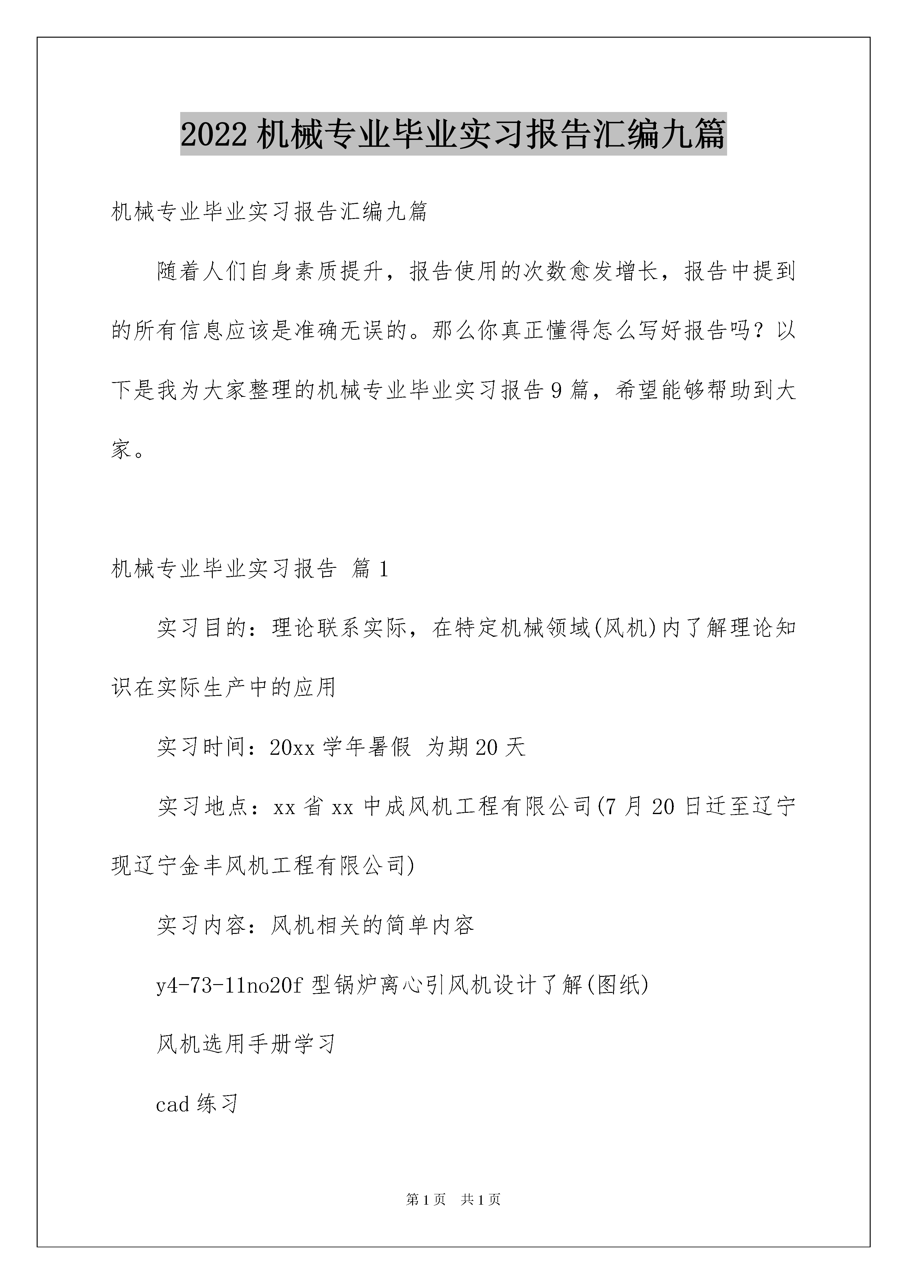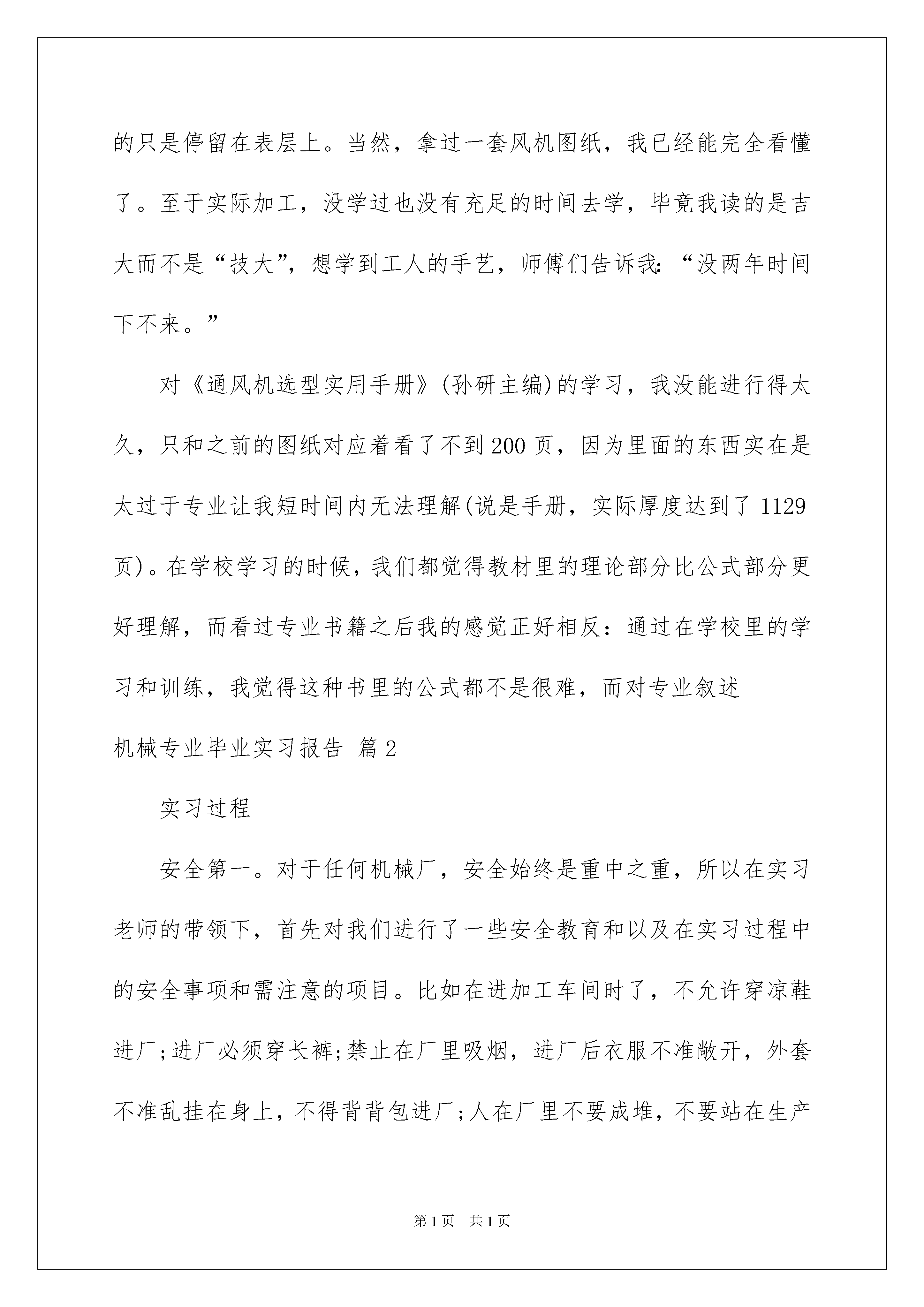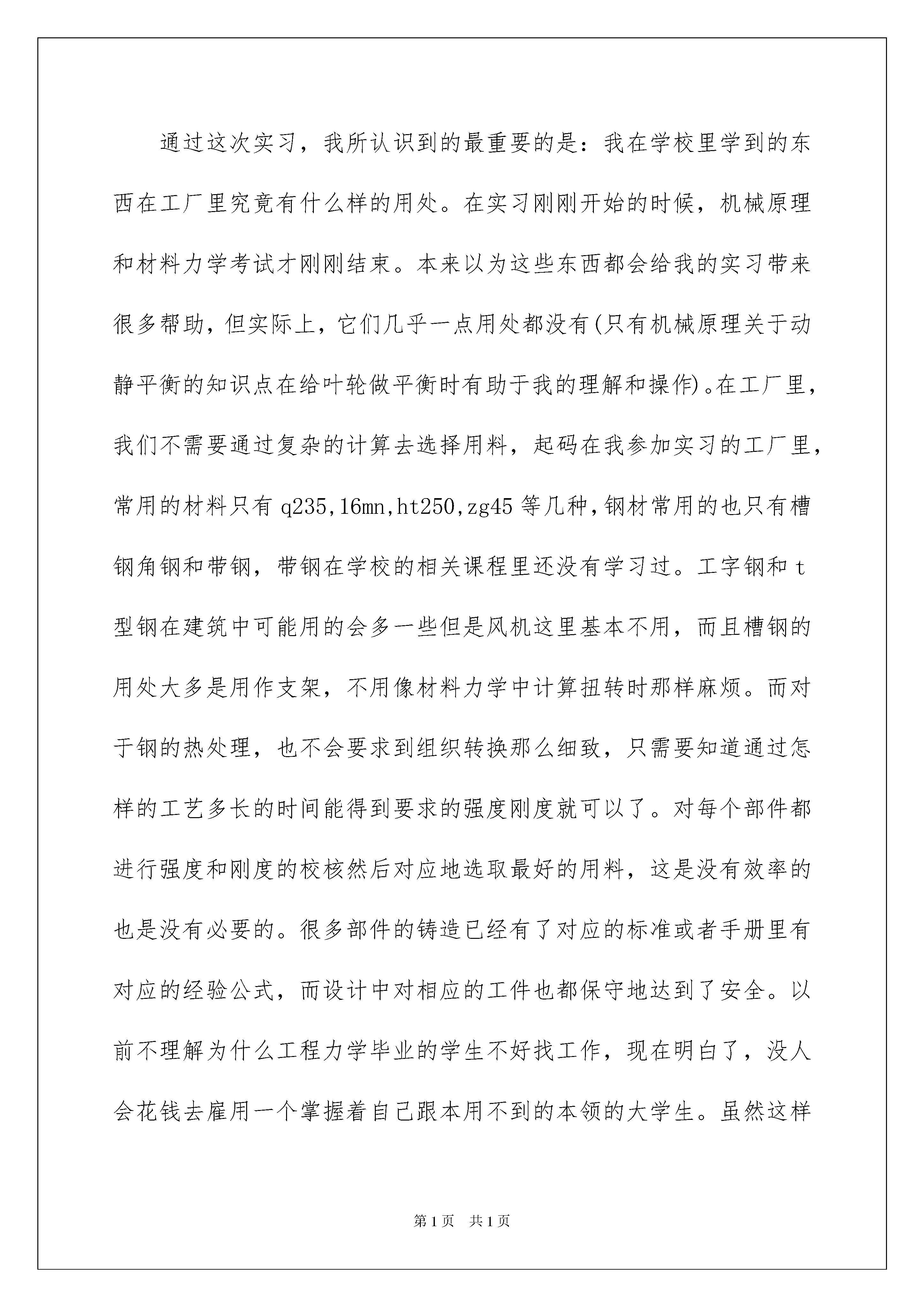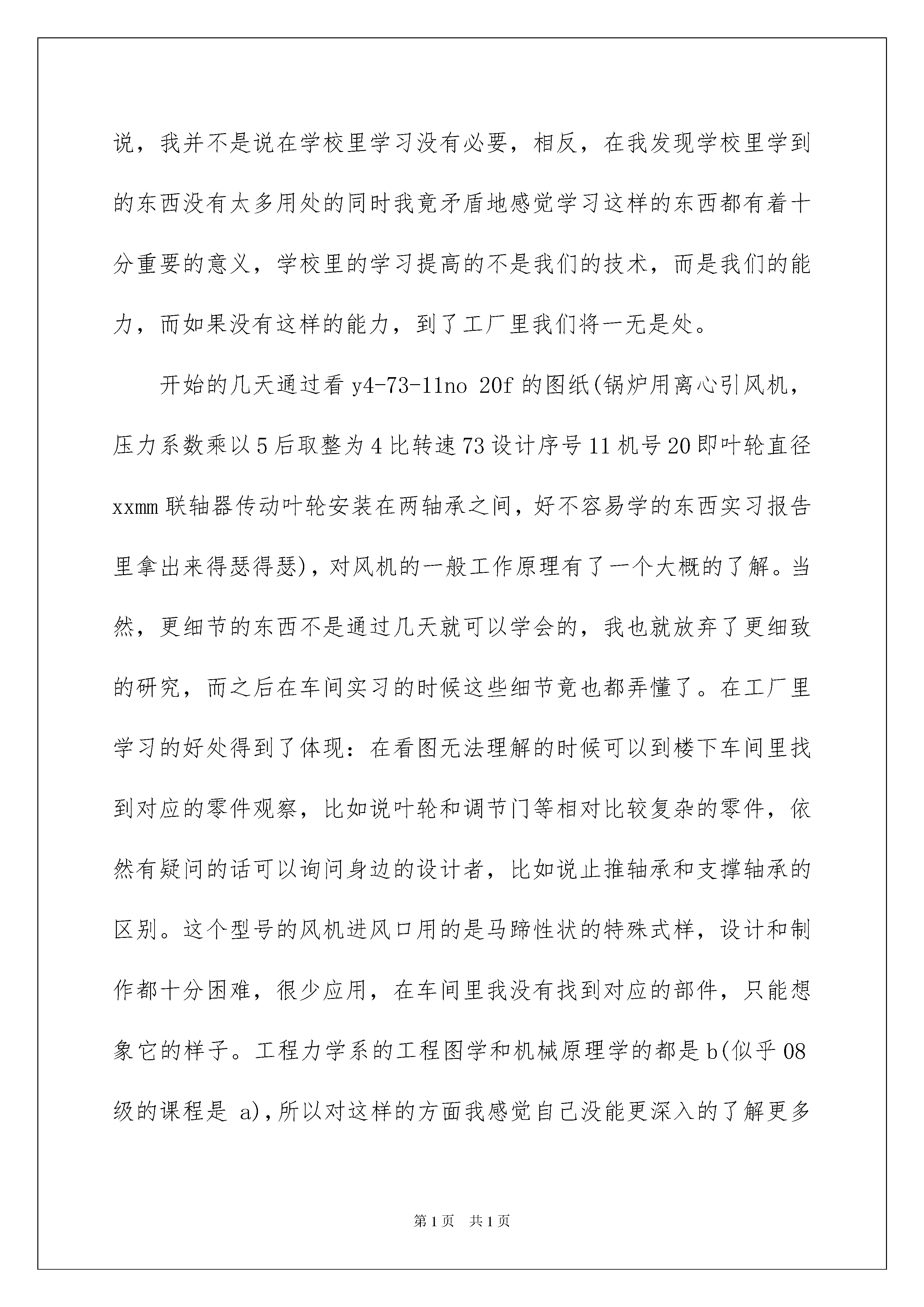 2022机械专业毕业实习报告汇编九篇机械专业毕业实习报告汇编九篇随着人们自身素质提升,报告使用的次数愈发增长,报告中提到的所有信息应该是准确无误的。那么你真正懂得怎么写好报告吗?以下是我为大家整理的机械专业毕业实习报告9篇,希望能够帮助到大家。机械专业毕业实习报告篇1实习目的:理论联系实际,在特定机械领域(风机)内了解理论知识在实际生产中的应用实习时间:20xx学年暑假为期20天实习地点:xx省xx中成风机工程有限公司(7月20日迁至辽宁现辽宁金丰风机工程有限公司)实习内容:风机相关的简单内容y4-73-11no20f型锅炉离心引风机设计了解(图纸)风机选用手册学习cad练习机械装配、动平衡调整等实习总结:与以往的师兄师姐们相比,我的这次暑期社会实习可以说幸运得多。在风机厂里我受到了不少照顾而不是像许多师兄师姐所说的那样到工厂里只是搬了一个月的砖头或者其他各样的体力活却没有学到什么更实际的东西。说起来,我想我的实习与其说起来是“实习”,更不如说是“学习”,因为我在学校所学到的知识无论是纯理论还是金工实习的操作在这里都几乎没有用处。前五天我的实习内容大多都是坐在工厂里的办公室里进行的,我相信,不会有哪个同学通过实习学到的东西会比我的更理论。当然,这样的实习也并不轻松,经过了一个月不洗澡不理发每天在自习室里学习14个小时以上的期末复习的煎熬之后在暑假实习,我也同样相信,所有人都宁愿去底下搬砖头。而之后的内容则是到车间里练习装配和平衡调试等工作,虽然都只是拧螺丝之类的打下手的工作(技术工作我也根本作不了),但凡是其中所遇到的相关问题几位师傅都会详细地给我讲解,理论在实际中的应用得到了更透彻的理解,之前在办公室里学到的东西也都起到了很大作用。而且和工人师傅们在一起很开心。通过这次实习,我所认识到的最重要的是:我在学校里学到的东西在工厂里究竟有什么样的用处。在实习刚刚开始的时候,机械原理和材料力学考试才刚刚结束。本来以为这些东西都会给我的实习带来很多帮助,但实际上,它们几乎一点用处都没有(只有机械原理关于动静平衡的知识点在给叶轮做平衡时有助于我的理解和操作)。在工厂里,我们不需要通过复杂的计算去选择用料,起码在我参加实习的工厂里,常用的材料只有q235,16mn,ht250,zg45等几种,钢材常用的也只有槽钢角钢和带钢,带钢在学校的相关课程里还没有学习过。工字钢和t型钢在建筑中可能用的会多一些但是风机这里基本不用,而且槽钢的用处大多是用作支架,不用像材料力学中计算扭转时那样麻烦。而对于钢的热处理,也不会要求到组织转换那么细致,只需要知道通过怎样的工艺多长的时间能得到要求的强度刚度就可以了。对每个部件都进行强度和刚度的校核然后对应地选取最好的用料,这是没有效率的也是没有必要的。很多部件的铸造已经有了对应的标准或者手册里有对应的经验公式,而设计中对相应的工件也都保守地达到了安全。以前不理解为什么工程力学毕业的学生不好找工作,现在明白了,没人会花钱去雇用一个掌握着自己跟本用不到的本领的大学生。虽然这样说,我并不是说在学校里学习没有必要,相反,在我发现学校里学到的东西没有太多用处的同时我竟矛盾地感觉学习这样的东西都有着十分重要的意义,学校里的学习提高的不是我们的技术,而是我们的能力,而如果没有这样的能力,到了工厂里我们将一无是处。开始的几天通过看y4-73-11no20f的图纸(锅炉用离心引风机,压力系数乘以5后取整为4比转速73设计序号11机号20即叶轮直径xxmm联轴器传动叶轮安装在两轴承之间,好不容易学的东西实习报告里拿出来得瑟得瑟),对风机的一般工作原理有了一个大概的了解。当然,更细节的东西不是通过几天就可以学会的,我也就放弃了更细致的研究,而之后在车间实习的时候这些细节竟也都弄懂了。在工厂里学习的好处得到了体现:在看图无法理解的时候可以到楼下车间里找到对应的零件观察,比如说叶轮和调节门等相对比较复杂的零件,依然有疑问的话可以询问身边的设计者,比如说止推轴承和支撑轴承的区别。这个型号的风机进风口用的是马蹄性状的特殊式样,设计和制作都十分困难,很少应用,在车间里我没有找到对应的部件,只能想象它的样子。工程力学系的工程图学和机械原理学的都是b(似乎08级的课程是a),所以对这样的方面我感觉自己没能更深入的了解更多的只是停留在表层上。当然,拿过一套风机图纸,我已经能完全看懂了。至于实际加工,没学过也没有充足的时间去学,毕竟我读的是吉大而不是“技大”,想学到工人的手艺,师傅们告诉我:“没两年时间下不来。”对《通风机选型实用手册》(孙研主编)的学习,我没能进行得太久,只和之前的图纸对应着看
