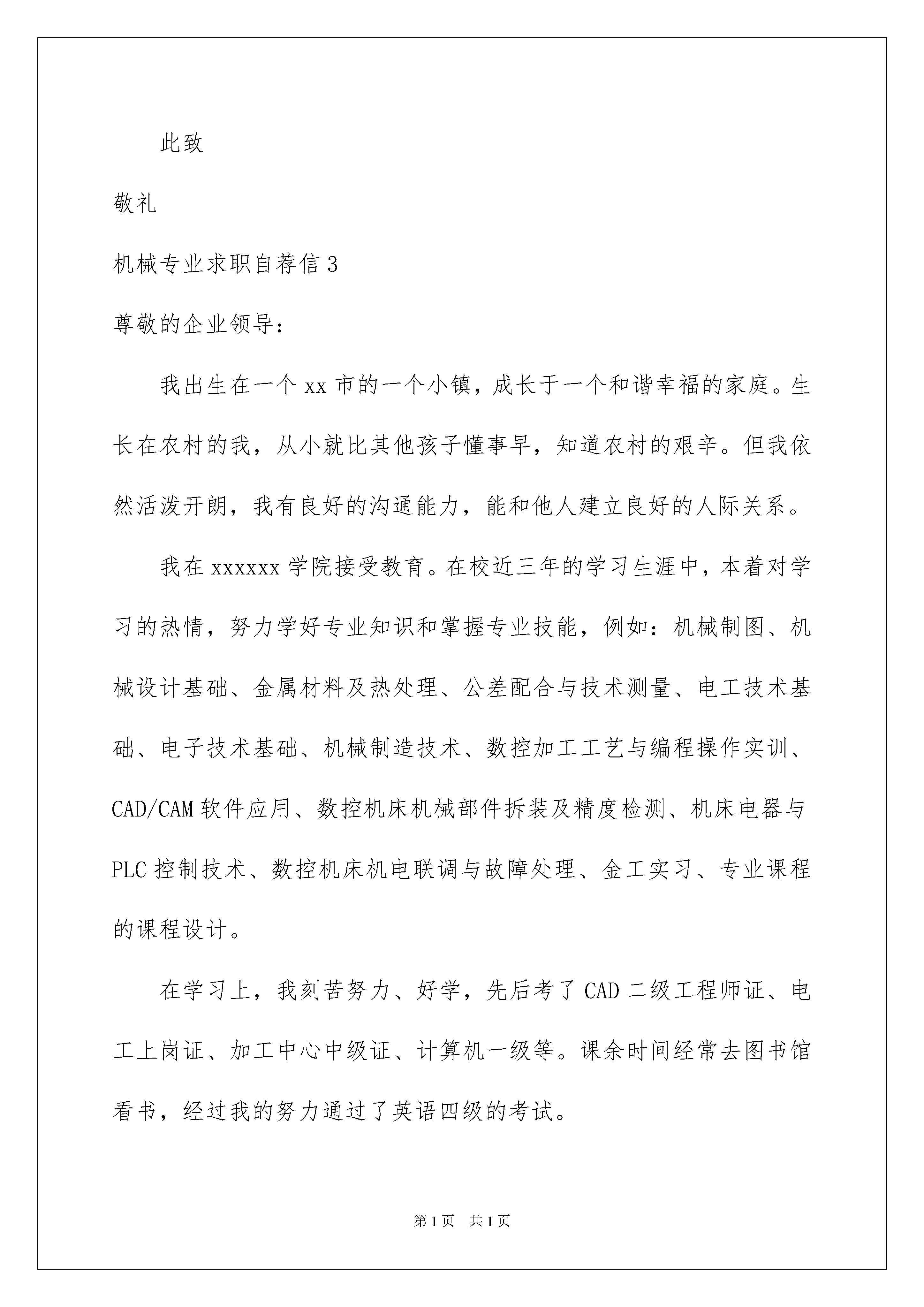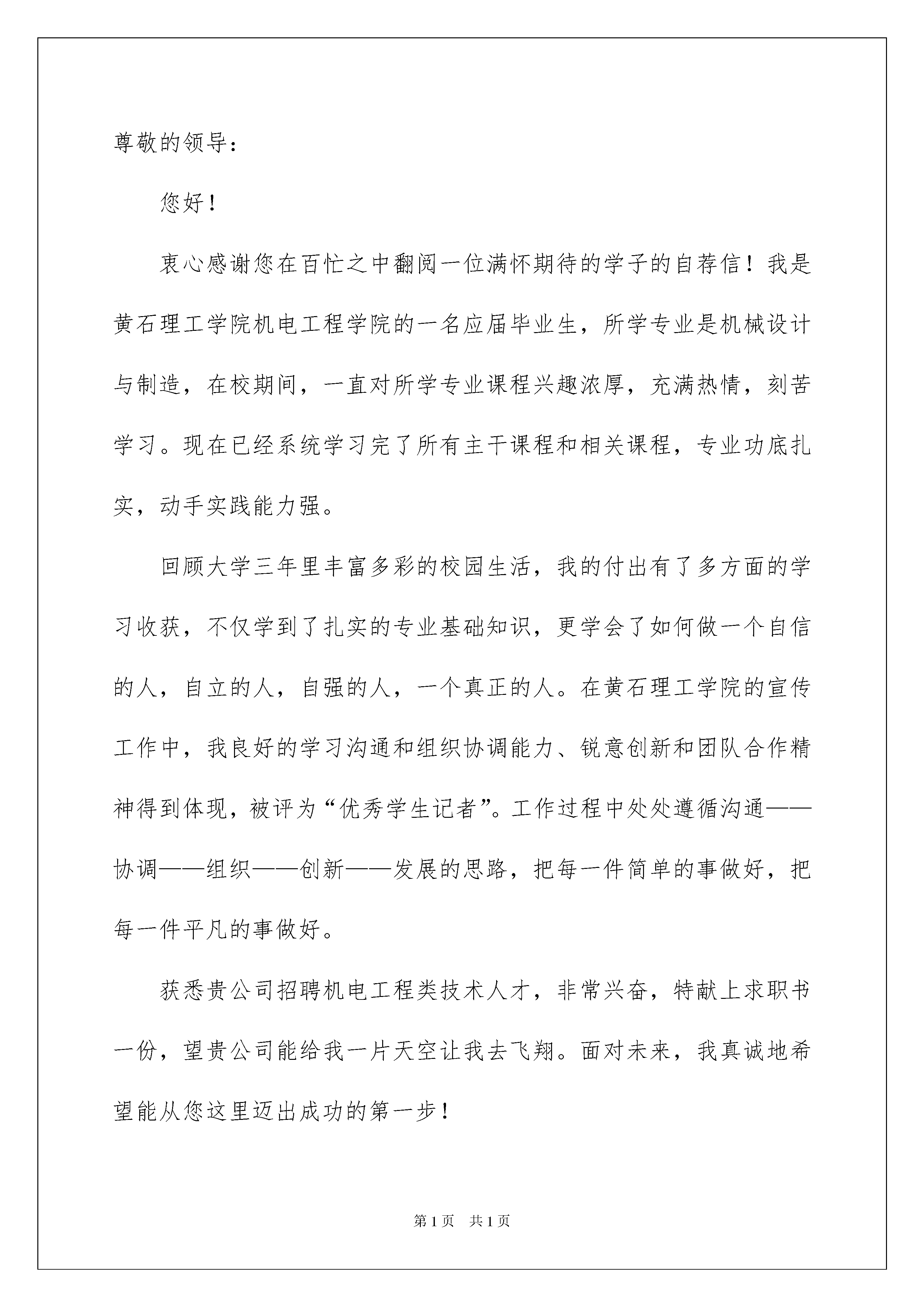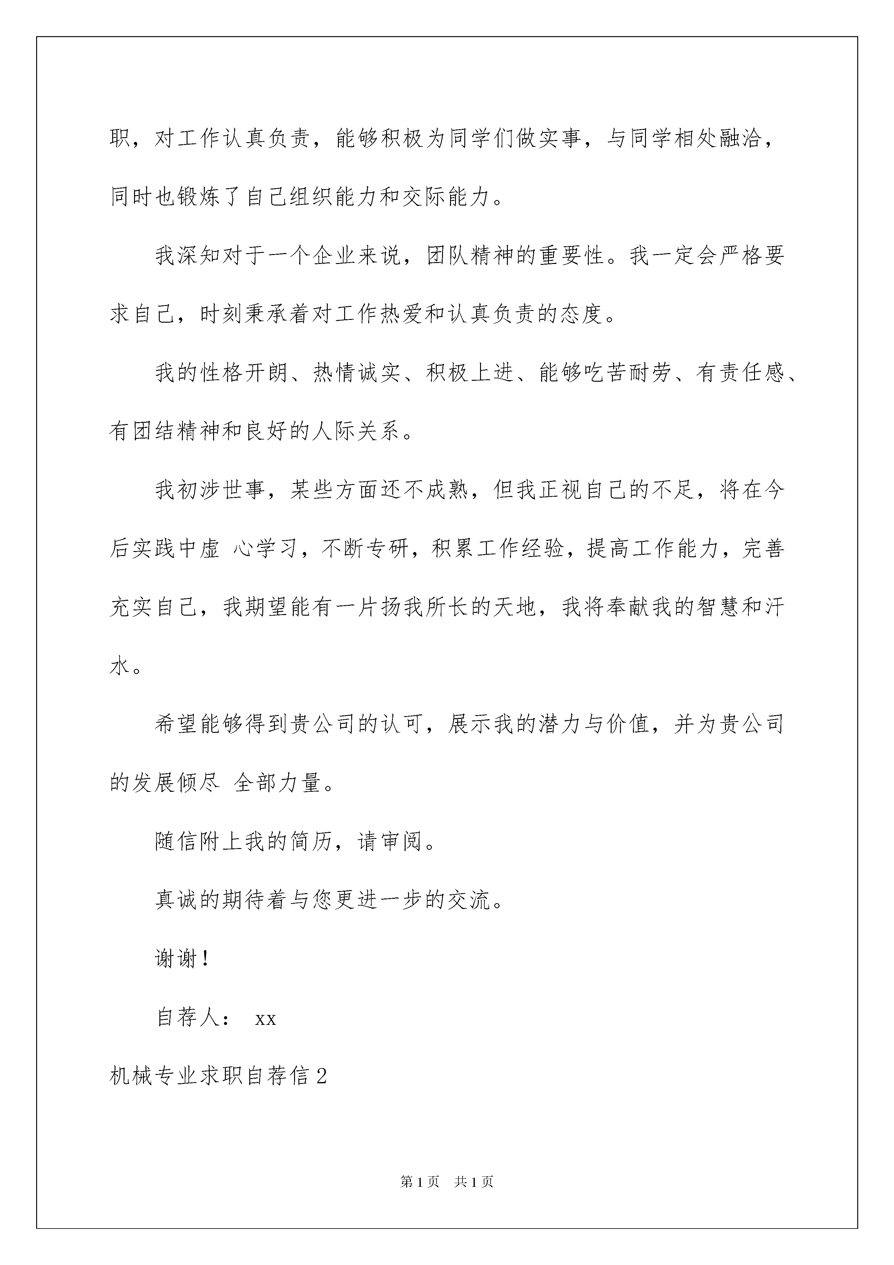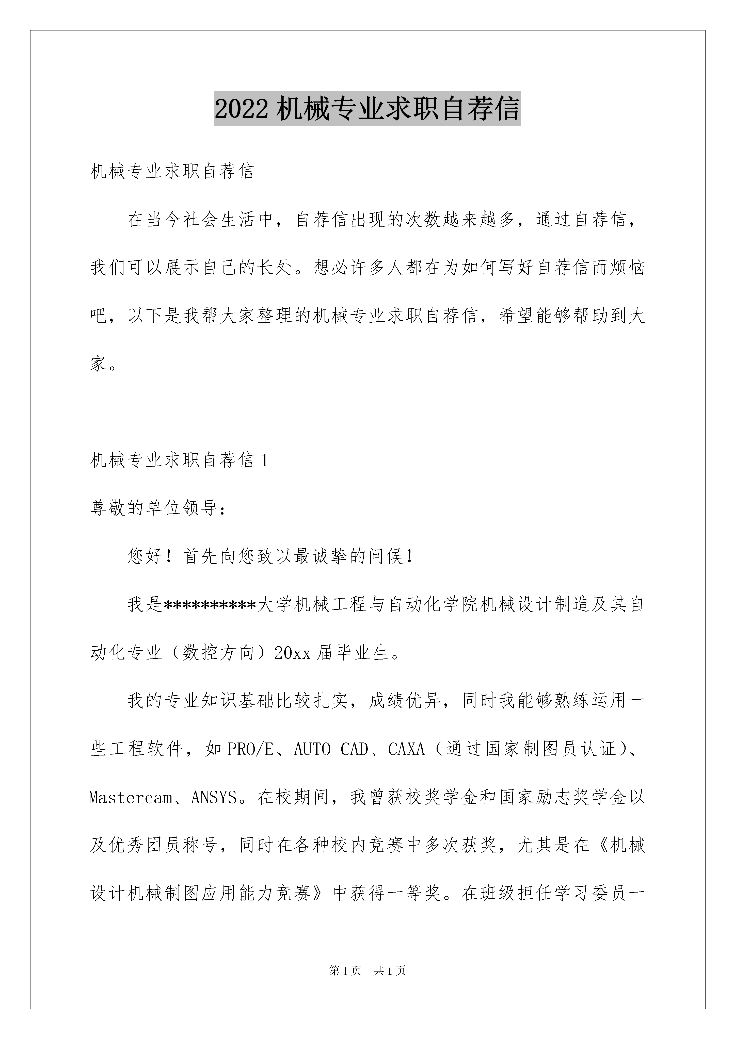 2022机械专业求职自荐信机械专业求职自荐信在当今社会生活中,自荐信出现的次数越来越多,通过自荐信,我们可以展示自己的长处。想必许多人都在为如何写好自荐信而烦恼吧,以下是我帮大家整理的机械专业求职自荐信,希望能够帮助到大家。机械专业求职自荐信1尊敬的单位领导:您好!首先向您致以最诚挚的问候!我是**********大学机械工程与自动化学院机械设计制造及其自动化专业(数控方向)20xx届毕业生。我的专业知识基础比较扎实,成绩优异,同时我能够熟练运用一些工程软件,如PRO/E、AUTOCAD、CAXA(通过国家制图员认证)、Mastercam、ANSYS。在校期间,我曾获校奖学金和国家励志奖学金以及优秀团员称号,同时在各种校内竞赛中多次获奖,尤其是在《机械设计机械制图应用能力竞赛》中获得一等奖。在班级担任学习委员一职,对工作认真负责,能够积极为同学们做实事,与同学相处融洽,同时也锻炼了自己组织能力和交际能力。我深知对于一个企业来说,团队精神的重要性。我一定会严格要求自己,时刻秉承着对工作热爱和认真负责的态度。我的性格开朗、热情诚实、积极上进、能够吃苦耐劳、有责任感、有团结精神和良好的人际关系。我初涉世事,某些方面还不成熟,但我正视自己的不足,将在今后实践中虚心学习,不断专研,积累工作经验,提高工作能力,完善充实自己,我期望能有一片扬我所长的天地,我将奉献我的智慧和汗水。希望能够得到贵公司的认可,展示我的潜力与价值,并为贵公司的发展倾尽全部力量。随信附上我的简历,请审阅。真诚的期待着与您更进一步的交流。谢谢!自荐人:xx机械专业求职自荐信2尊敬的领导:您好!衷心感谢您在百忙之中翻阅一位满怀期待的学子的自荐信!我是黄石理工学院机电工程学院的一名应届毕业生,所学专业是机械设计与制造,在校期间,一直对所学专业课程兴趣浓厚,充满热情,刻苦学习。现在已经系统学习完了所有主干课程和相关课程,专业功底扎实,动手实践能力强。回顾大学三年里丰富多彩的校园生活,我的付出有了多方面的学习收获,不仅学到了扎实的专业基础知识,更学会了如何做一个自信的人,自立的人,自强的人,一个真正的人。在黄石理工学院的宣传工作中,我良好的学习沟通和组织协调能力、锐意创新和团队合作精神得到体现,被评为“优秀学生记者”。工作过程中处处遵循沟通——协调——组织——创新——发展的思路,把每一件简单的事做好,把每一件平凡的事做好。获悉贵公司招聘机电工程类技术人才,非常兴奋,特献上求职书一份,望贵公司能给我一片天空让我去飞翔。面对未来,我真诚地希望能从您这里迈出成功的第一步!此致敬礼机械专业求职自荐信3尊敬的企业领导:我出生在一个xx市的一个小镇,成长于一个和谐幸福的家庭。生长在农村的我,从小就比其他孩子懂事早,知道农村的艰辛。但我依然活泼开朗,我有良好的沟通能力,能和他人建立良好的人际关系。我在xxxxxx学院接受教育。在校近三年的学习生涯中,本着对学习的热情,努力学好专业知识和掌握专业技能,例如:机械制图、机械设计基础、金属材料及热处理、公差配合与技术测量、电工技术基础、电子技术基础、机械制造技术、数控加工工艺与编程操作实训、CAD/CAM软件应用、数控机床机械部件拆装及精度检测、机床电器与PLC控制技术、数控机床机电联调与故障处理、金工实习、专业课程的课程设计。在学习上,我刻苦努力、好学,先后考了CAD二级工程师证、电工上岗证、加工中心中级证、计算机一级等。课余时间经常去图书馆看书,经过我的努力通过了英语四级的考试。在学习之余,我积极参与学院举办的团体活动,如拔河比赛、团体趣味竞技比赛等活动;积极参与学院社团组织的管理,担任学院学生自律会会长,本着“为丰富团体生活,培养团体精神”的理念,组织会员义务献爱心活动,如:去敬老院探望老人,去邕江边捡垃圾等;组织策划会员举办“饺子宴”晚会、烧烤等活动。从中我们相互学习共同进步,同时培养了我良好的组织能力、协调能力和团队精神,增强了我的团队意识。除此之外,还担任了班里的团支书,积极配合老师帮助有困难的同学。同时,也在很多方面提升了自我。包括工作上,交际中和学习上。思想上,在学校的生活里,我积极乐观、诚实守信。对专业知识的学习努力上进,熟练掌握专业技能。面对学习、工作和生活上的挫折,我选择勇敢面对,而不是退缩。在学校和同学友好相处,广交朋友,交友的首要原则是诚实守信,我做到了,我希望我的诚实可以交到更多的朋友。通过近三年的大专学习,我深感自己的不足,我会在以后的工作学习中更加努力,取长补短,虚心求教。相信自己会在以后的工作中更加得心应手,表现更加出色!为实现自己的梦想而努力,更加完善自己