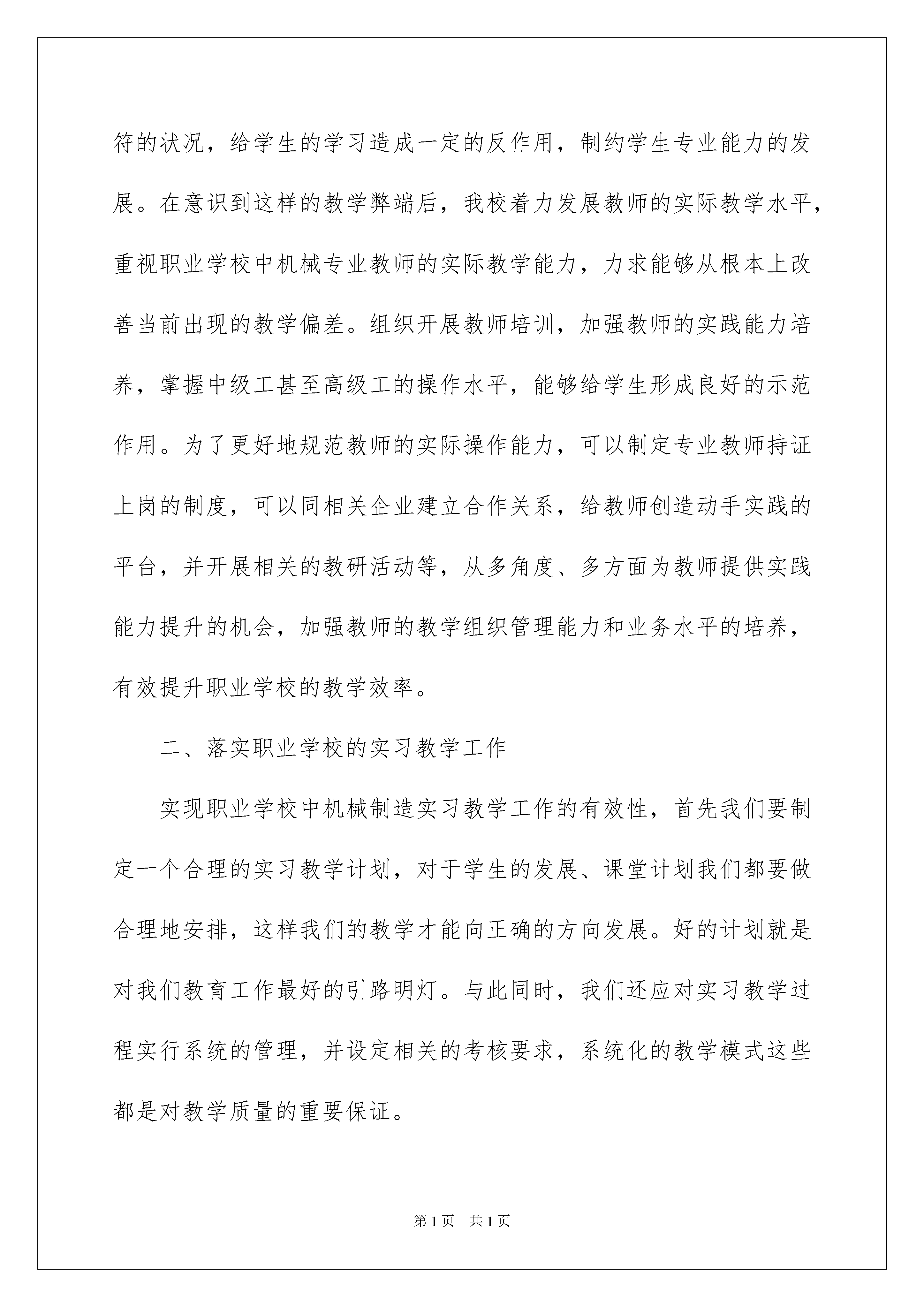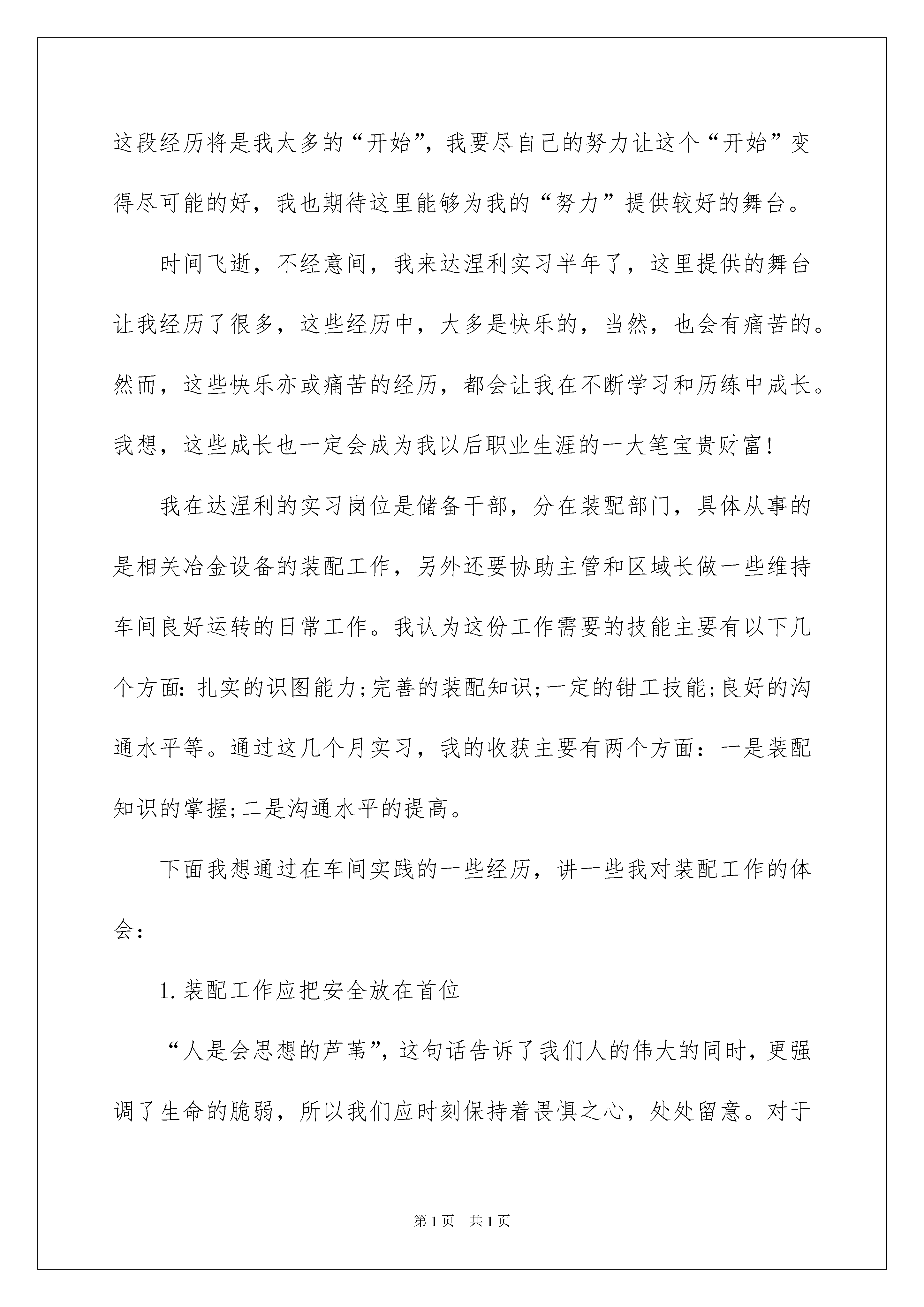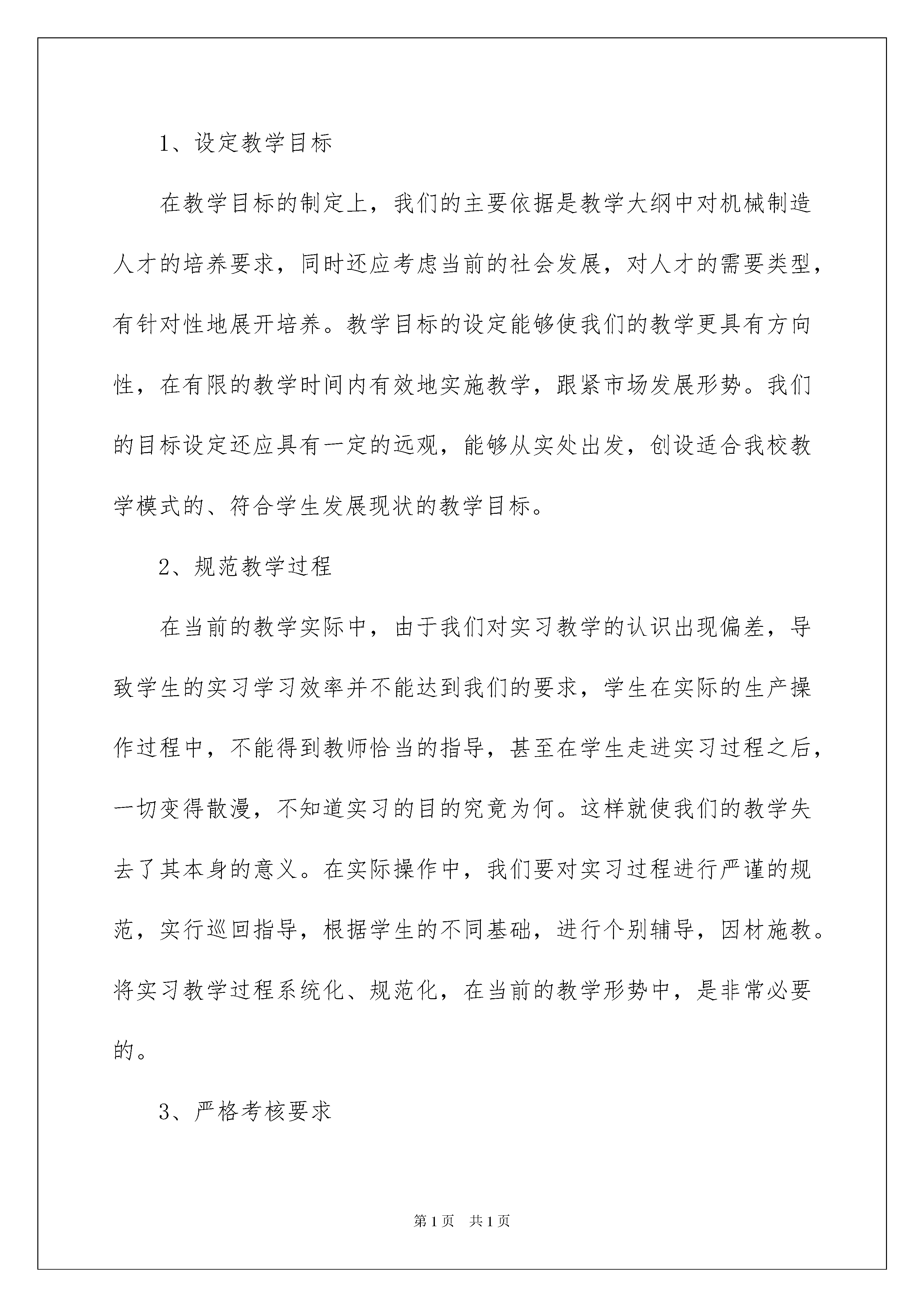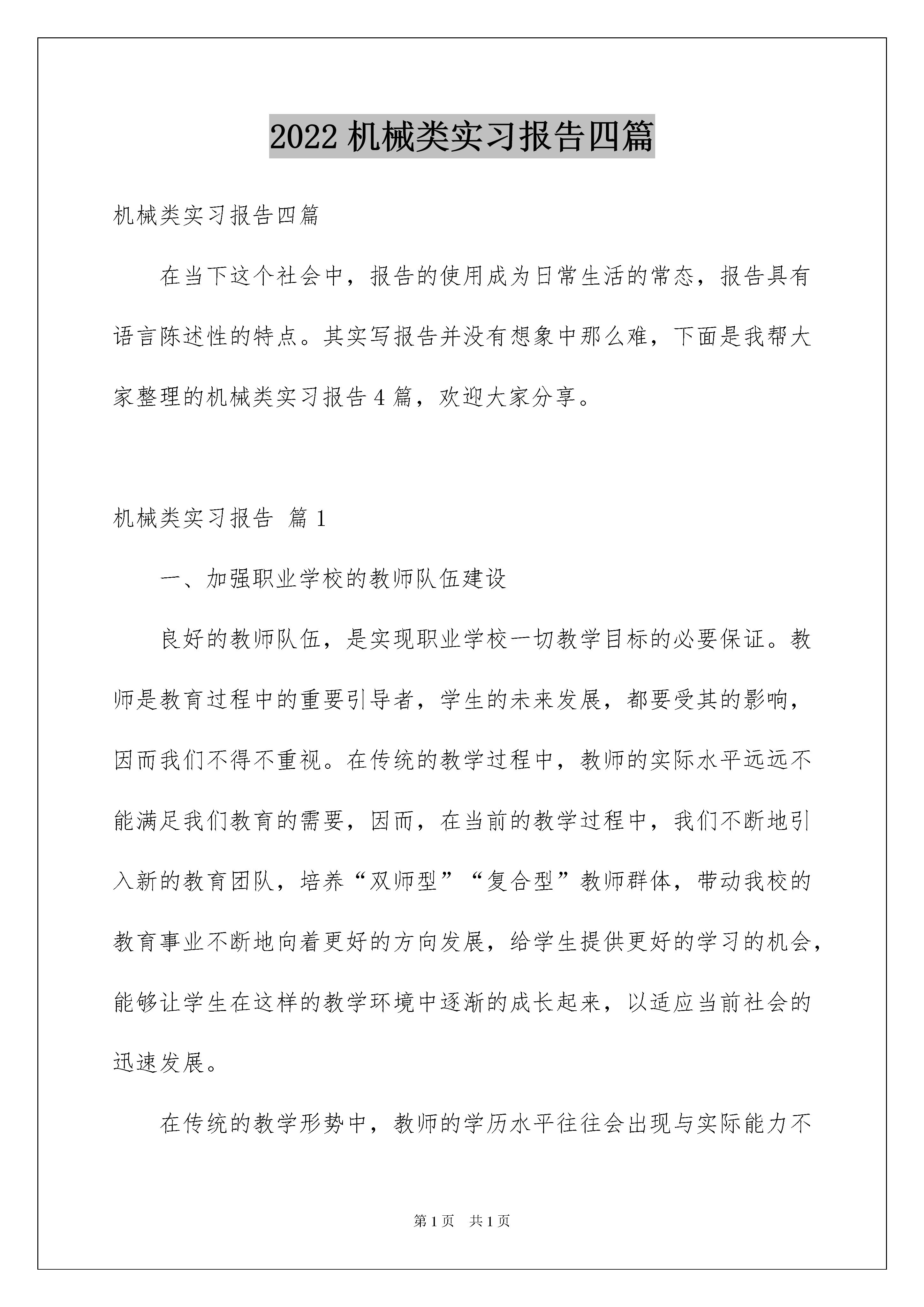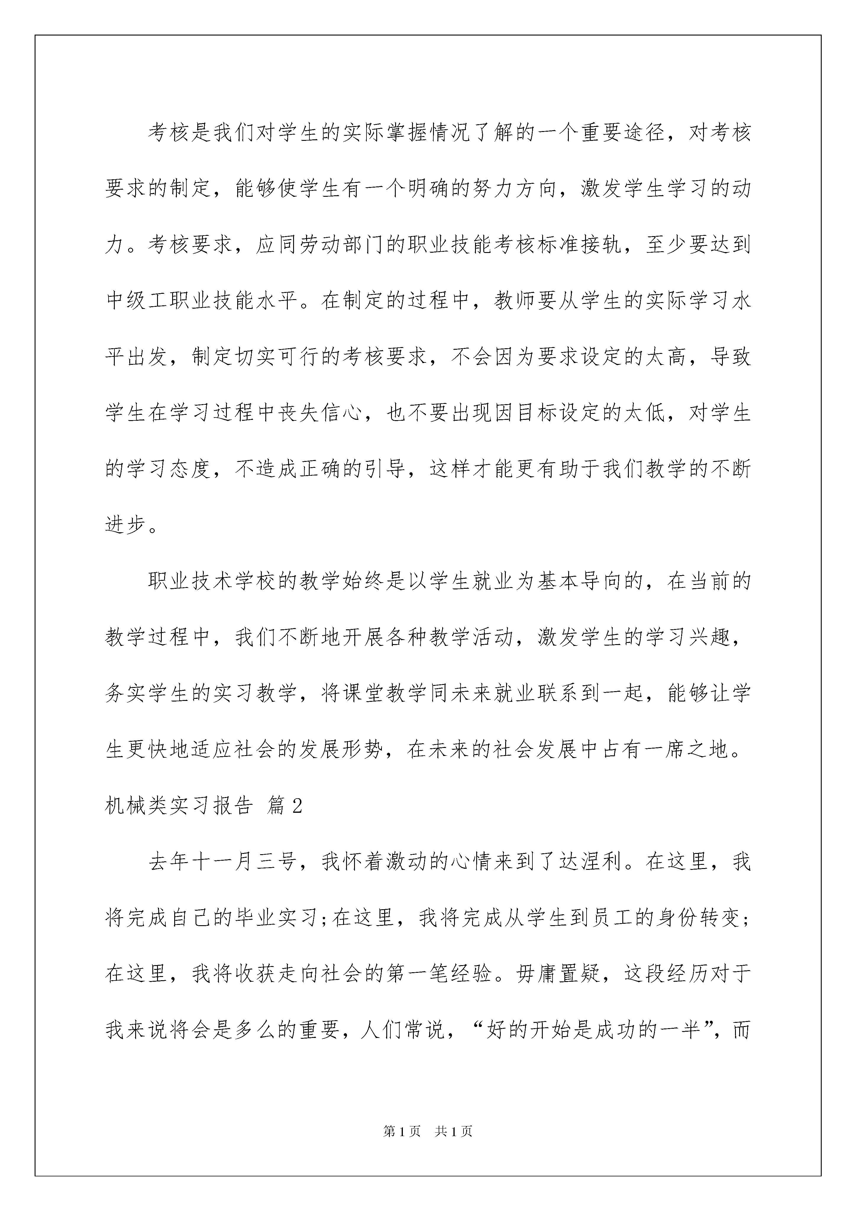 2022机械类实习报告四篇机械类实习报告四篇在当下这个社会中,报告的使用成为日常生活的常态,报告具有语言陈述性的特点。其实写报告并没有想象中那么难,下面是我帮大家整理的机械类实习报告4篇,欢迎大家分享。机械类实习报告篇1一、加强职业学校的教师队伍建设良好的教师队伍,是实现职业学校一切教学目标的必要保证。教师是教育过程中的重要引导者,学生的未来发展,都要受其的影响,因而我们不得不重视。在传统的教学过程中,教师的实际水平远远不能满足我们教育的需要,因而,在当前的教学过程中,我们不断地引入新的教育团队,培养“双师型”“复合型”教师群体,带动我校的教育事业不断地向着更好的方向发展,给学生提供更好的学习的机会,能够让学生在这样的教学环境中逐渐的成长起来,以适应当前社会的迅速发展。在传统的教学形势中,教师的学历水平往往会出现与实际能力不符的状况,给学生的学习造成一定的反作用,制约学生专业能力的发展。在意识到这样的教学弊端后,我校着力发展教师的实际教学水平,重视职业学校中机械专业教师的实际教学能力,力求能够从根本上改善当前出现的教学偏差。组织开展教师培训,加强教师的实践能力培养,掌握中级工甚至高级工的操作水平,能够给学生形成良好的示范作用。为了更好地规范教师的实际操作能力,可以制定专业教师持证上岗的制度,可以同相关企业建立合作关系,给教师创造动手实践的平台,并开展相关的教研活动等,从多角度、多方面为教师提供实践能力提升的机会,加强教师的教学组织管理能力和业务水平的培养,有效提升职业学校的教学效率。二、落实职业学校的实习教学工作实现职业学校中机械制造实习教学工作的有效性,首先我们要制定一个合理的实习教学计划,对于学生的发展、课堂计划我们都要做合理地安排,这样我们的教学才能向正确的方向发展。好的计划就是对我们教育工作最好的引路明灯。与此同时,我们还应对实习教学过程实行系统的管理,并设定相关的考核要求,系统化的教学模式这些都是对教学质量的重要保证。1、设定教学目标在教学目标的制定上,我们的主要依据是教学大纲中对机械制造人才的培养要求,同时还应考虑当前的社会发展,对人才的需要类型,有针对性地展开培养。教学目标的设定能够使我们的教学更具有方向性,在有限的教学时间内有效地实施教学,跟紧市场发展形势。我们的目标设定还应具有一定的远观,能够从实处出发,创设适合我校教学模式的、符合学生发展现状的教学目标。2、规范教学过程在当前的教学实际中,由于我们对实习教学的认识出现偏差,导致学生的实习学习效率并不能达到我们的要求,学生在实际的生产操作过程中,不能得到教师恰当的指导,甚至在学生走进实习过程之后,一切变得散漫,不知道实习的目的究竟为何。这样就使我们的教学失去了其本身的意义。在实际操作中,我们要对实习过程进行严谨的规范,实行巡回指导,根据学生的不同基础,进行个别辅导,因材施教。将实习教学过程系统化、规范化,在当前的教学形势中,是非常必要的。3、严格考核要求考核是我们对学生的实际掌握情况了解的一个重要途径,对考核要求的制定,能够使学生有一个明确的努力方向,激发学生学习的动力。考核要求,应同劳动部门的职业技能考核标准接轨,至少要达到中级工职业技能水平。在制定的过程中,教师要从学生的实际学习水平出发,制定切实可行的考核要求,不会因为要求设定的太高,导致学生在学习过程中丧失信心,也不要出现因目标设定的太低,对学生的学习态度,不造成正确的引导,这样才能更有助于我们教学的不断进步。职业技术学校的教学始终是以学生就业为基本导向的,在当前的教学过程中,我们不断地开展各种教学活动,激发学生的学习兴趣,务实学生的实习教学,将课堂教学同未来就业联系到一起,能够让学生更快地适应社会的发展形势,在未来的社会发展中占有一席之地。机械类实习报告篇2去年十一月三号,我怀着激动的心情来到了达涅利。在这里,我将完成自己的毕业实习;在这里,我将完成从学生到员工的身份转变;在这里,我将收获走向社会的第一笔经验。毋庸置疑,这段经历对于我来说将会是多么的重要,人们常说,“好的开始是成功的一半”,而这段经历将是我太多的“开始”,我要尽自己的努力让这个“开始”变得尽可能的好,我也期待这里能够为我的“努力”提供较好的舞台。时间飞逝,不经意间,我来达涅利实习半年了,这里提供的舞台让我经历了很多,这些经历中,大多是快乐的,当然,也会有痛苦的。然而,这些快乐亦或痛苦的经历,都会让我在不断学习和历练中成长。我想,这些成长也一定会成为我以后职业生涯的一大笔宝贵财富!我在达涅利的实习岗位是储备干部,分在装配部门,具体从事的是相关冶金设备的装配工作,另外还要协助主管和区