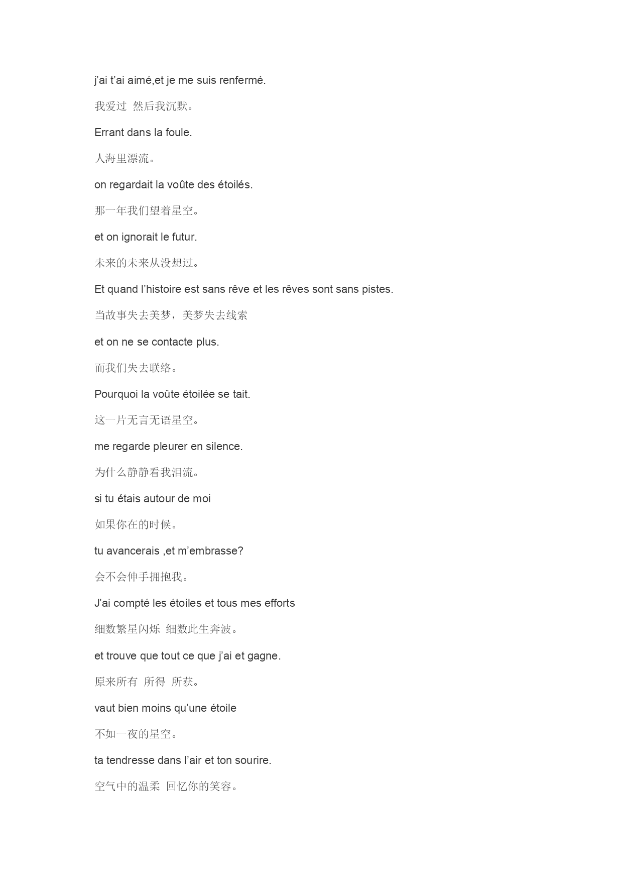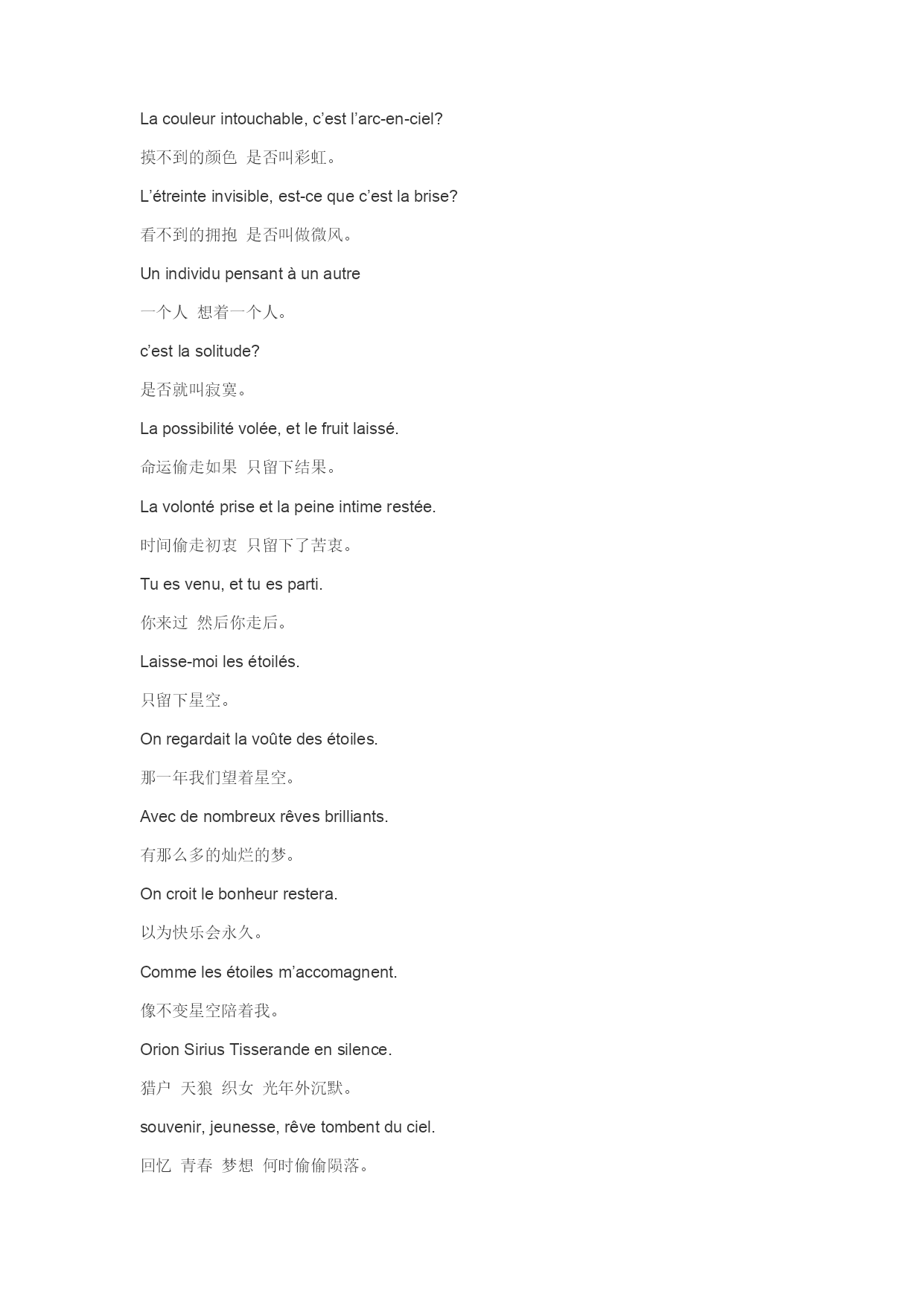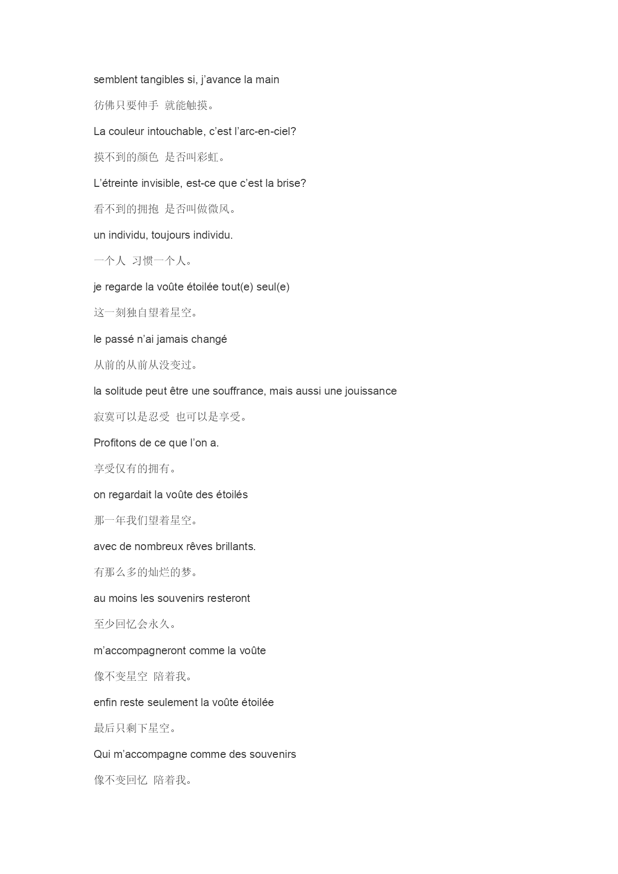 Lacouleurintouchable,c’estl’arc-en-ciel? 摸不到的颜色是否叫彩虹。 L’étreinteinvisible,est-cequec’estlabrise? 看不到的拥抱是否叫做微风。 Unindividupensantàunautre 一个人想着一个人。 c’estlasolitude? 是否就叫寂寞。 Lapossibilitévolée,etlefruitlaissé. 命运偷走如果只留下结果。 Lavolontépriseetlapeineintimerestée. 时间偷走初衷只留下了苦衷。 Tuesvenu,ettuesparti. 你来过然后你走后。 Laisse-moilesétoilés. 只留下星空。 Onregardaitlavoûtedesétoiles. 那一年我们望着星空。 Avecdenombreuxrêvesbrilliants. 有那么多的灿烂的梦。 Oncroitlebonheurrestera. 以为快乐会永久。 Commelesétoilesm’accomagnent. 像不变星空陪着我。 OrionSiriusTisserandeensilence. 猎户天狼织女光年外沉默。 souvenir,jeunesse,rêvetombentduciel. 回忆青春梦想何时偷偷陨落。 j’ait’aiaimé,etjemesuisrenfermé. 我爱过然后我沉默。 Errantdanslafoule. 人海里漂流。 onregardaitlavoûtedesétoilés. 那一年我们望着星空。 etonignoraitlefutur. 未来的未来从没想过。 Etquandl’histoireestsansrêveetlesrêvessontsanspistes. 当故事失去美梦,美梦失去线索 etonnesecontacteplus. 而我们失去联络。 Pourquoilavoûteétoiléesetait. 这一片无言无语星空。 meregardepleurerensilence. 为什么静静看我泪流。 situétaisautourdemoi 如果你在的时候。 tuavancerais,etm’embrasse? 会不会伸手拥抱我。 J’aicomptélesétoilesettousmesefforts 细数繁星闪烁细数此生奔波。 ettrouvequetoutcequej’aietgagne. 原来所有所得所获。 vautbienmoinsqu’uneétoile 不如一夜的星空。 tatendressedansl’airettonsourire. 空气中的温柔回忆你的笑容。 semblenttangiblessi,j’avancelamain 彷佛只要伸手就能触摸。 Lacouleurintouchable,c’estl’arc-en-ciel? 摸不到的颜色是否叫彩虹。 L’étreinteinvisible,est-cequec’estlabrise? 看不到的拥抱是否叫做微风。 unindividu,toujoursindividu. 一个人习惯一个人。 jeregardelavoûteétoiléetout(e)seul(e) 这一刻独自望着星空。 lepassén’aijamaischangé 从前的从前从没变过。 lasolitudepeutêtreunesouffrance,maisaussiunejouissance 寂寞可以是忍受也可以是享受。 Profitonsdecequel’ona. 享受仅有的拥有。 onregardaitlavoûtedesétoilés 那一年我们望着星空。 avecdenombreuxrêvesbrillants. 有那么多的灿烂的梦。 aumoinslessouvenirsresteront 至少回忆会永久。 m’accompagnerontcommelavoûte 像不变星空陪着我。 enfinresteseulementlavoûteétoilée 最后只剩下星空。 Quim’accompagnecommedessouvenirs 像不变回忆陪着我。