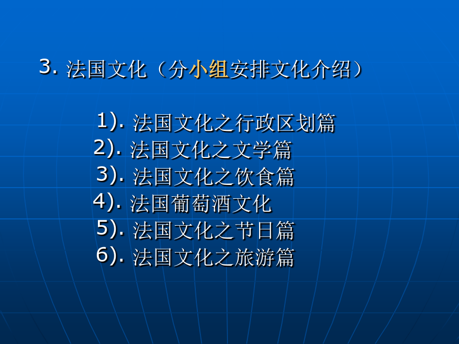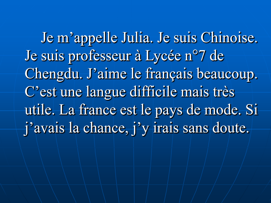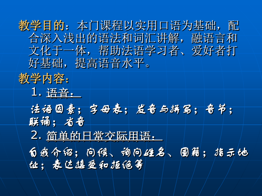 《法语入门》FrançaisJem’appelleJulia.JesuisChinoise.JesuisprofesseuràLycéen°7deChengdu.J’aimelefrançaisbeaucoup.C’estunelanguedifficilemaistrèsutile.Lafranceestlepaysdemode.Sij’avaislachance,j’yiraissansdoute.教学目的:本门课程以实用口语为基础,配合深入浅出的语法和词汇讲解,融语言和文化于一体,帮助法语学习者、爱好者打好基础,提高语音水平。 教学内容: 1.语音: 法语因素;字母表;发音与拼写;音节;联诵;省音 2.简单的日常交际用语: 自我介绍;问候、询问姓名、国籍;指示地址;表达接受和拒绝等 3.法国文化(分小组安排文化介绍) 1).法国文化之行政区划篇 2).法国文化之文学篇 3).法国文化之饮食篇 4).法国葡萄酒文化 5).法国文化之节日篇 6).法国文化之旅游篇REVISION2.音素phonèmes 【i】【e】【ε】【a】 口腔开口度极小,舌头紧抵下齿,唇形扁平,嘴角要用力向两边拉。与汉语拼音中的i相似。但口腔部位的肌肉更加紧张。 【i】 常见拼写方式(例词) i il(他),si(如果),lire(读),riz(大米) Î Île(岛屿),dÎner(晚饭) Ï naïf(天然的),maïs(但是),égoïste(自私自利的) y type(类型),style(风格),cycle(循环)【e】【ε】开口度大于【e】,舌位略高于【e】,舌尖平抵下齿,舌前部略微隆起。注意保持口型稳定,尤其不要与汉语拼音的ai混淆。舌头平放,嘴自然张开,口型略微紧张。与汉语拼音中的a相似,但发音时舌位靠前。比较【i】-【e】-【ε】-【a】 Lefrançaisestdifficile.法语很难。 Quelestleprixduriz?这米多少钱? Vousbuvezduthé?Ducafé?喝什么?茶还是咖啡? Vouspourriezrépéter?你能重复一下吗? Jesuisdésolé.我很悲伤。 Jevoudraisunebaguette,s’ilvousplaît. 我想要一个法式长棍面包。 Tuaimesfairedusport? 你喜欢做运动吗? Enmai,faiscequ’ilteplaît.四月不减衣,五月乱穿衣 Silesjeûnessavaient,silesvieuxpouvaient. 但愿年少者经验丰富,年老者行动方便! Aurevoir,madame.再见,女士。 Nathalieestunecamaradedeclasseàmoi. Nathalie是我班上的同学。 àPâques,tuvasvoyager?复活节时你要去旅行吗? MarilynMonroeestunefemmefatale. MarilynMonroe是我命中注定的女孩。 【p】【d】【t】【d】【k】【g】【d】发音方式基本同[p],但发音时声带震动并只有极少量的气流冲出口腔【t】舌尖抵上齿形成阻塞,气流突然从口腔冲出,形成爆破音。声带不振动,类似于汉语拼音中的d.在元音前不送气,在音节末或与l,r构成辅音群时送气,此时发音同英语中的t.【d】发音方式与[t]相同,但声带必须振动并只有极少量的气流冲出口腔。【k】舌面抬起硬腭后部形成阻塞,气流突然从口腔冲出,形成爆破音。声带不振动,类似于汉语拼音中的g.在元音前不送气,在音节末或与l,r构成辅音群时送气,此时发音同英语中的k.【g】发音方式同[k],但声带必须振动并只有极少量的气流冲出口腔。比较【p】-【b】,【t】-【d】,【k】-【g】比较下列几组单词,感受清辅音和浊辅音发音的不同比较送气和不送气的[p]、[t]、[k]