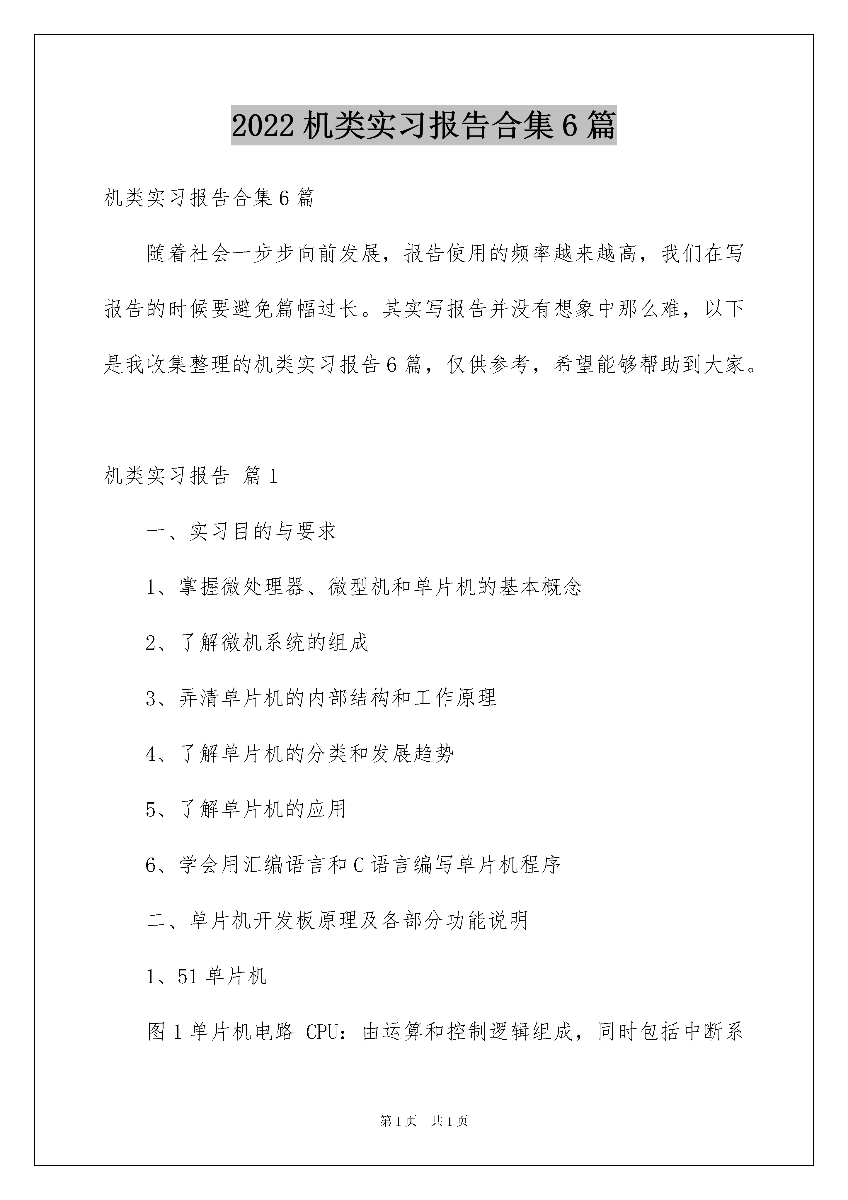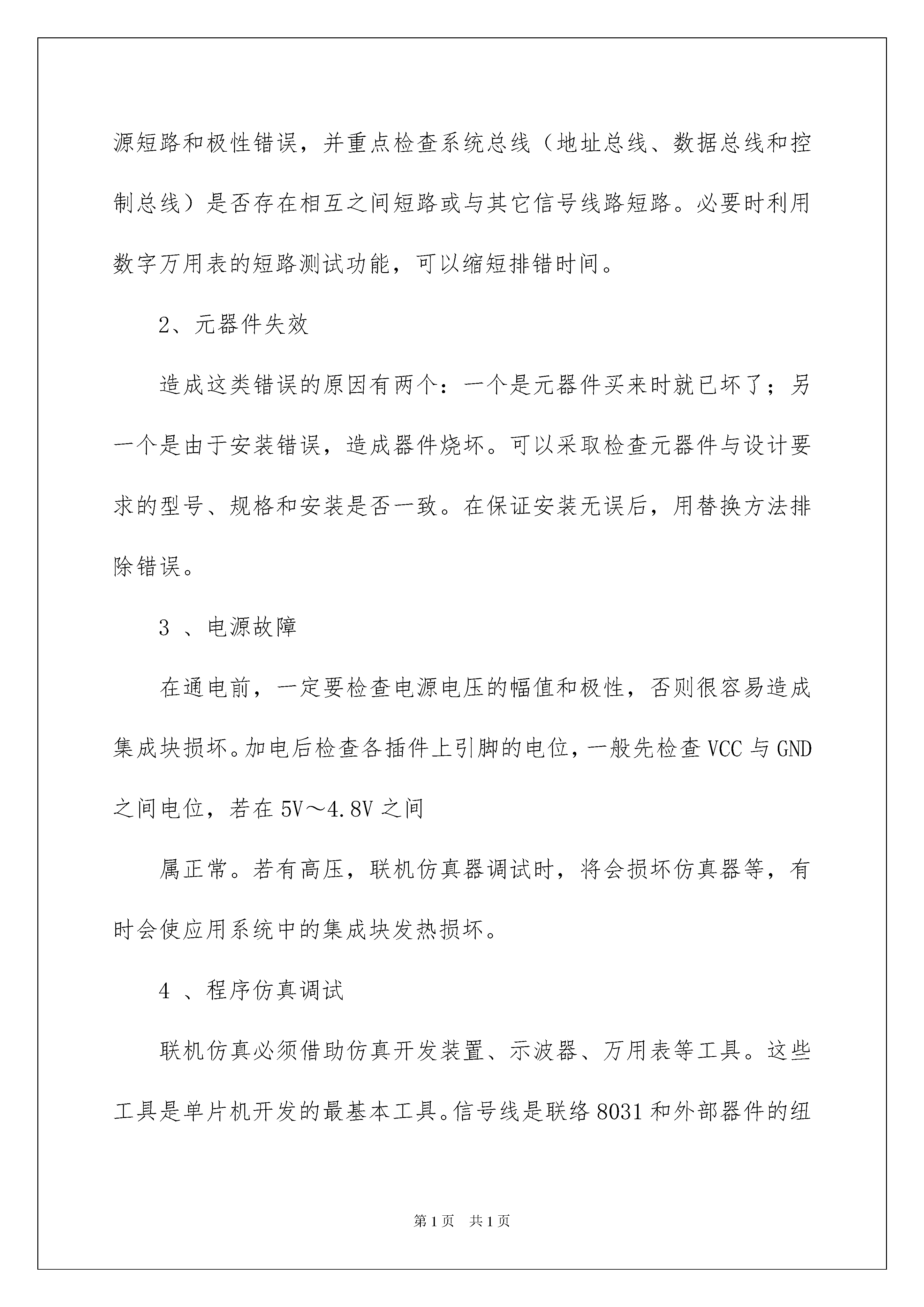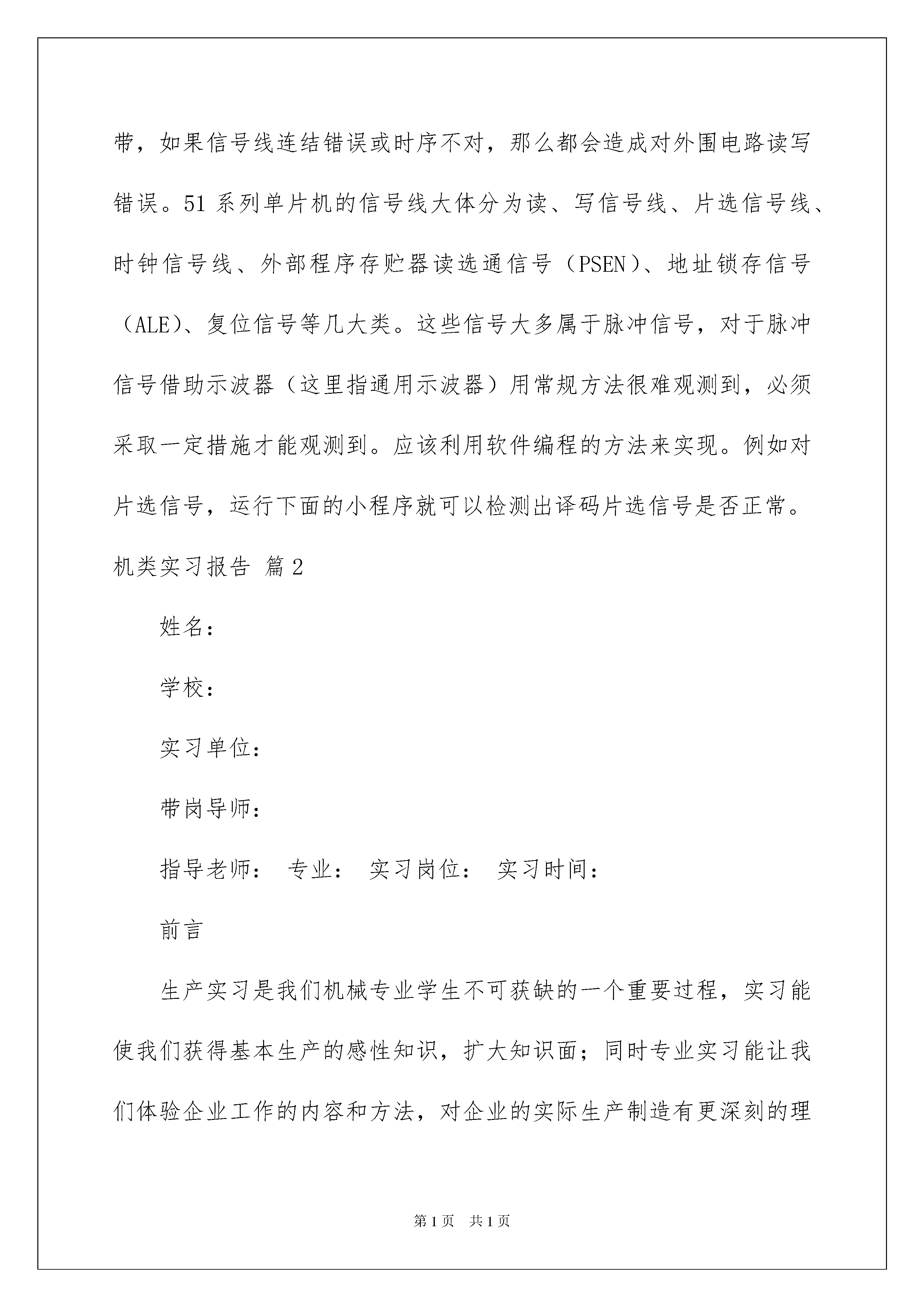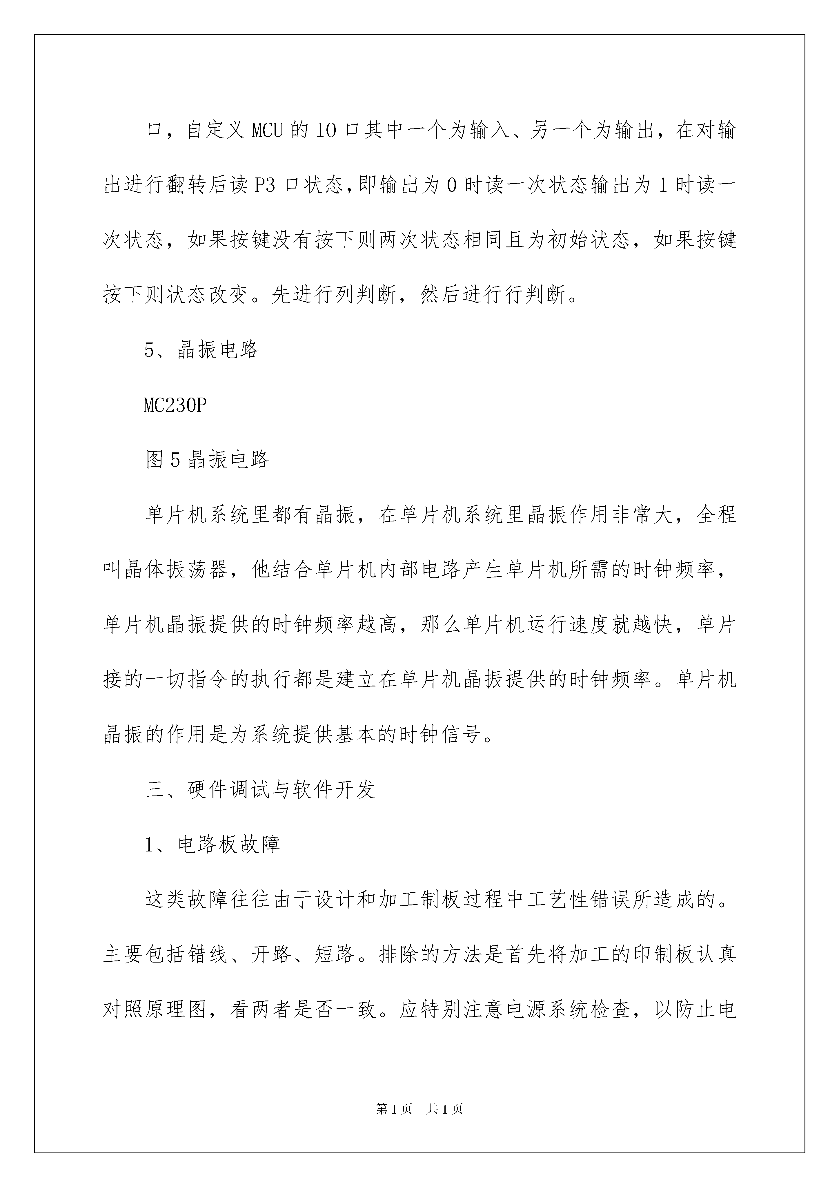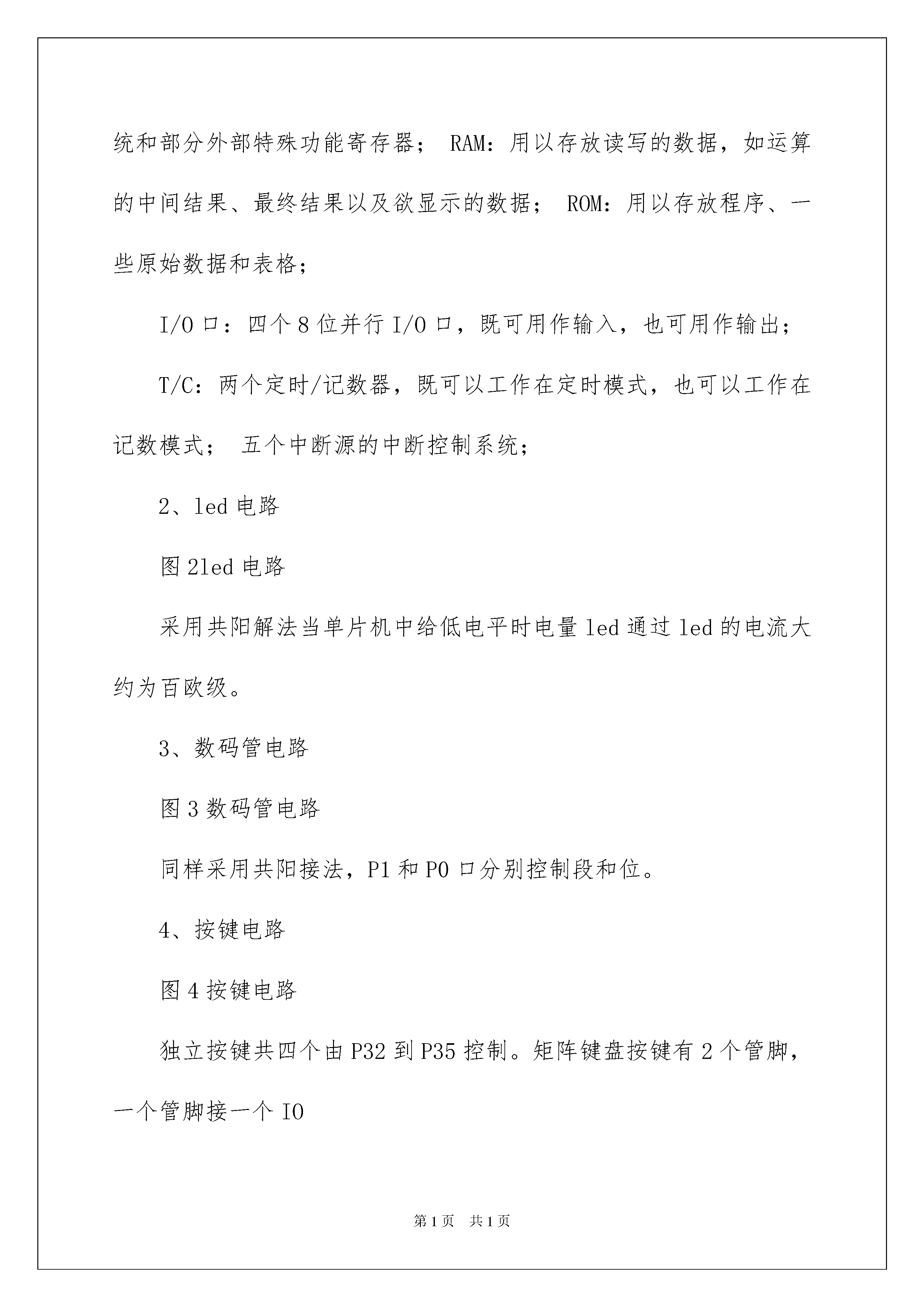 2022机类实习报告合集6篇机类实习报告合集6篇随着社会一步步向前发展,报告使用的频率越来越高,我们在写报告的时候要避免篇幅过长。其实写报告并没有想象中那么难,以下是我收集整理的机类实习报告6篇,仅供参考,希望能够帮助到大家。机类实习报告篇1一、实习目的与要求1、掌握微处理器、微型机和单片机的基本概念2、了解微机系统的组成3、弄清单片机的内部结构和工作原理4、了解单片机的分类和发展趋势5、了解单片机的应用6、学会用汇编语言和C语言编写单片机程序二、单片机开发板原理及各部分功能说明1、51单片机图1单片机电路CPU:由运算和控制逻辑组成,同时包括中断系统和部分外部特殊功能寄存器;RAM:用以存放读写的数据,如运算的中间结果、最终结果以及欲显示的数据;ROM:用以存放程序、一些原始数据和表格;I/O口:四个8位并行I/O口,既可用作输入,也可用作输出;T/C:两个定时/记数器,既可以工作在定时模式,也可以工作在记数模式;五个中断源的中断控制系统;2、led电路图2led电路采用共阳解法当单片机中给低电平时电量led通过led的电流大约为百欧级。3、数码管电路图3数码管电路同样采用共阳接法,P1和P0口分别控制段和位。4、按键电路图4按键电路独立按键共四个由P32到P35控制。矩阵键盘按键有2个管脚,一个管脚接一个IO口,自定义MCU的IO口其中一个为输入、另一个为输出,在对输出进行翻转后读P3口状态,即输出为0时读一次状态输出为1时读一次状态,如果按键没有按下则两次状态相同且为初始状态,如果按键按下则状态改变。先进行列判断,然后进行行判断。5、晶振电路MC230P图5晶振电路单片机系统里都有晶振,在单片机系统里晶振作用非常大,全程叫晶体振荡器,他结合单片机内部电路产生单片机所需的时钟频率,单片机晶振提供的时钟频率越高,那么单片机运行速度就越快,单片接的一切指令的执行都是建立在单片机晶振提供的时钟频率。单片机晶振的作用是为系统提供基本的时钟信号。三、硬件调试与软件开发1、电路板故障这类故障往往由于设计和加工制板过程中工艺性错误所造成的。主要包括错线、开路、短路。排除的方法是首先将加工的印制板认真对照原理图,看两者是否一致。应特别注意电源系统检查,以防止电源短路和极性错误,并重点检查系统总线(地址总线、数据总线和控制总线)是否存在相互之间短路或与其它信号线路短路。必要时利用数字万用表的短路测试功能,可以缩短排错时间。2、元器件失效造成这类错误的原因有两个:一个是元器件买来时就已坏了;另一个是由于安装错误,造成器件烧坏。可以采取检查元器件与设计要求的型号、规格和安装是否一致。在保证安装无误后,用替换方法排除错误。3、电源故障在通电前,一定要检查电源电压的幅值和极性,否则很容易造成集成块损坏。加电后检查各插件上引脚的电位,一般先检查VCC与GND之间电位,若在5V~4.8V之间属正常。若有高压,联机仿真器调试时,将会损坏仿真器等,有时会使应用系统中的集成块发热损坏。4、程序仿真调试联机仿真必须借助仿真开发装置、示波器、万用表等工具。这些工具是单片机开发的最基本工具。信号线是联络8031和外部器件的纽带,如果信号线连结错误或时序不对,那么都会造成对外围电路读写错误。51系列单片机的信号线大体分为读、写信号线、片选信号线、时钟信号线、外部程序存贮器读选通信号(PSEN)、地址锁存信号(ALE)、复位信号等几大类。这些信号大多属于脉冲信号,对于脉冲信号借助示波器(这里指通用示波器)用常规方法很难观测到,必须采取一定措施才能观测到。应该利用软件编程的方法来实现。例如对片选信号,运行下面的小程序就可以检测出译码片选信号是否正常。机类实习报告篇2姓名:学校:实习单位:带岗导师:指导老师:专业:实习岗位:实习时间:前言生产实习是我们机械专业学生不可获缺的一个重要过程,实习能使我们获得基本生产的感性知识,扩大知识面;同时专业实习能让我们体验企业工作的内容和方法,对企业的实际生产制造有更深刻的理解。这些实际知识,对我们学习后面的课程乃至以后的工作,都是十分必要的基础。实习目的1.了解三一重工,学习并理解三一的企业文化,了解企业文化的重点所在,并结合实习培养自己吃苦耐劳、疾慢如仇的作风。2.通过书本知识掌握压路机的基本工作原理、主体结构和系统以及生产种类。3.通过在厂房的学习掌握整机制造的工艺过程,将理论与实际相结合,通过所学的理论知识思考实际工艺,多向指导老师提问,多与工人师傅交流,学习他们的生产制造经验,了解他们的工作条件。实习内容7月14日—7月17日这三天的时间我们在三一总部长沙产业园的三一工学