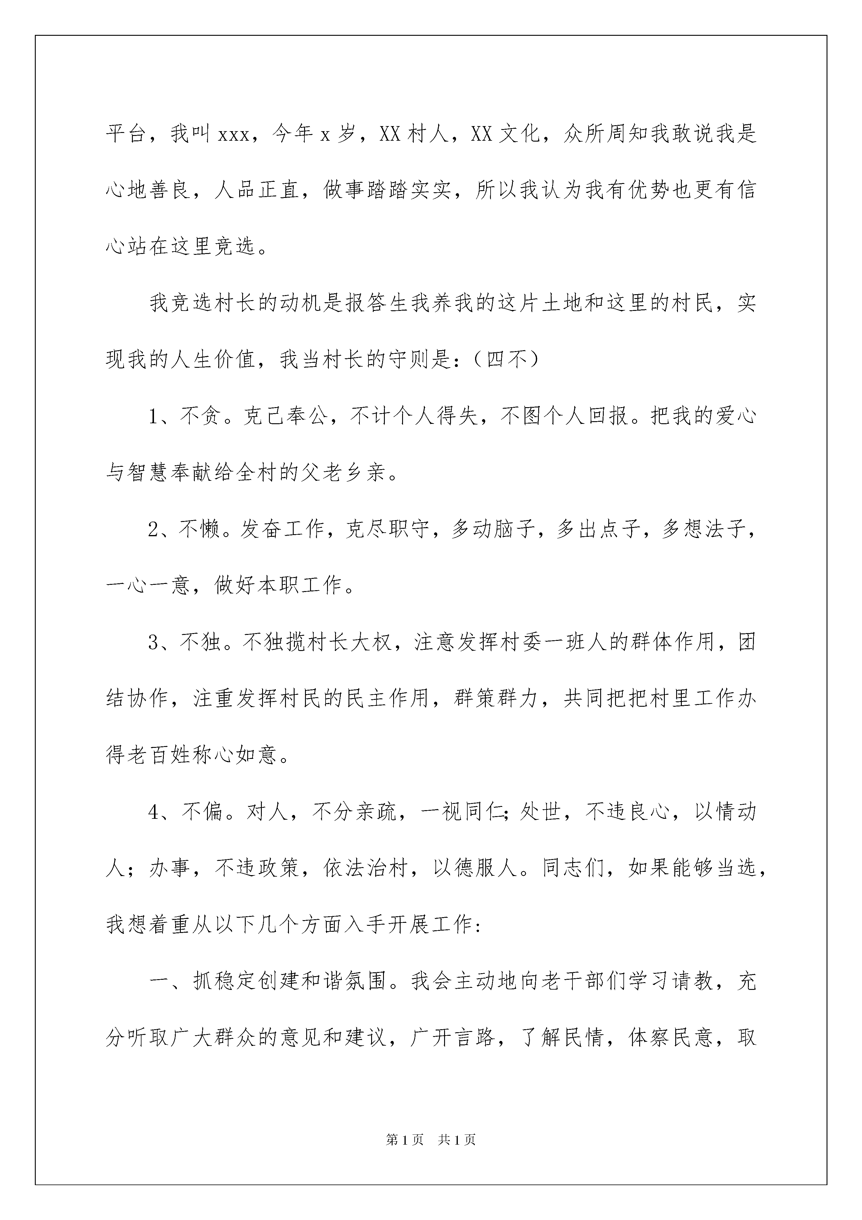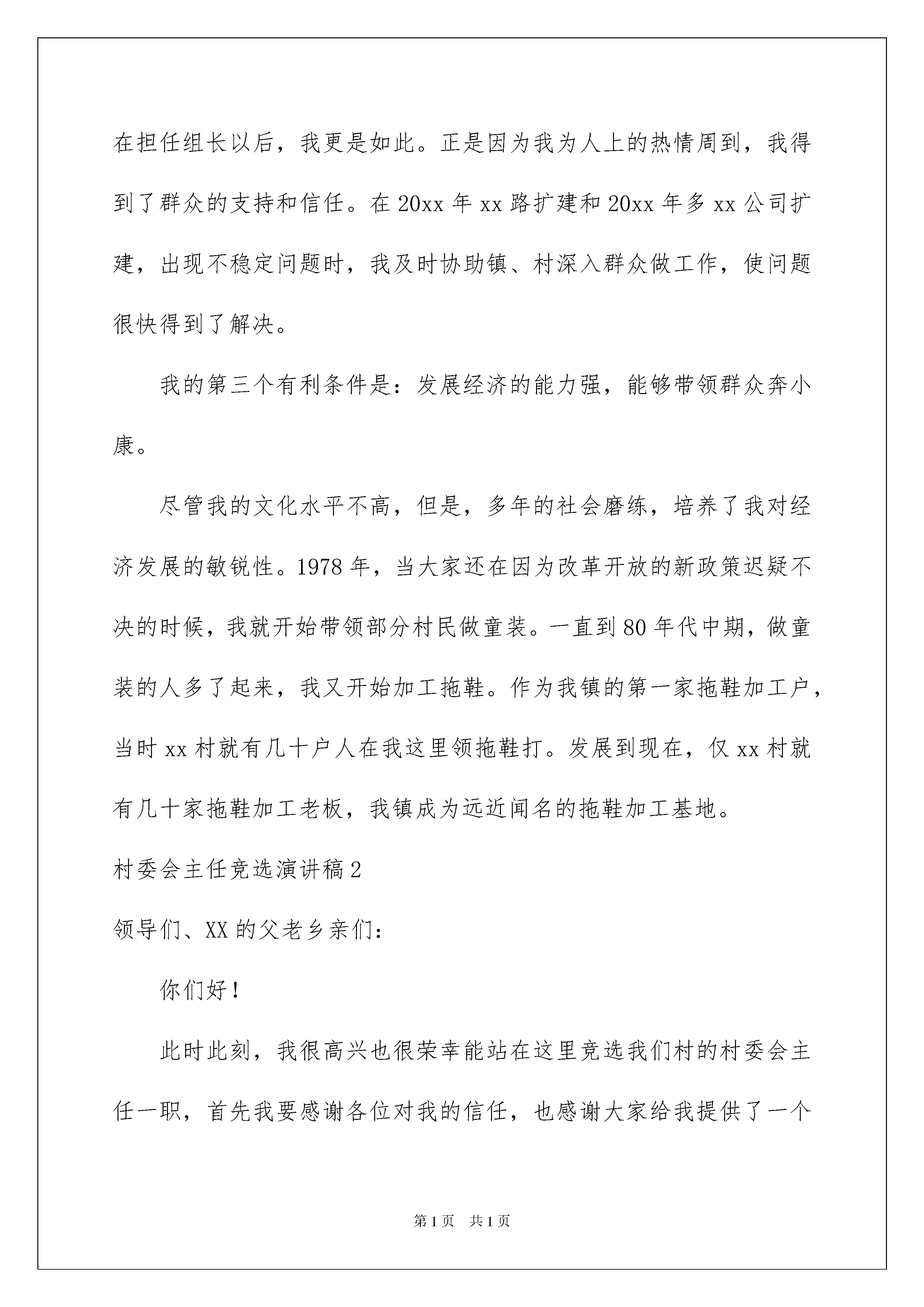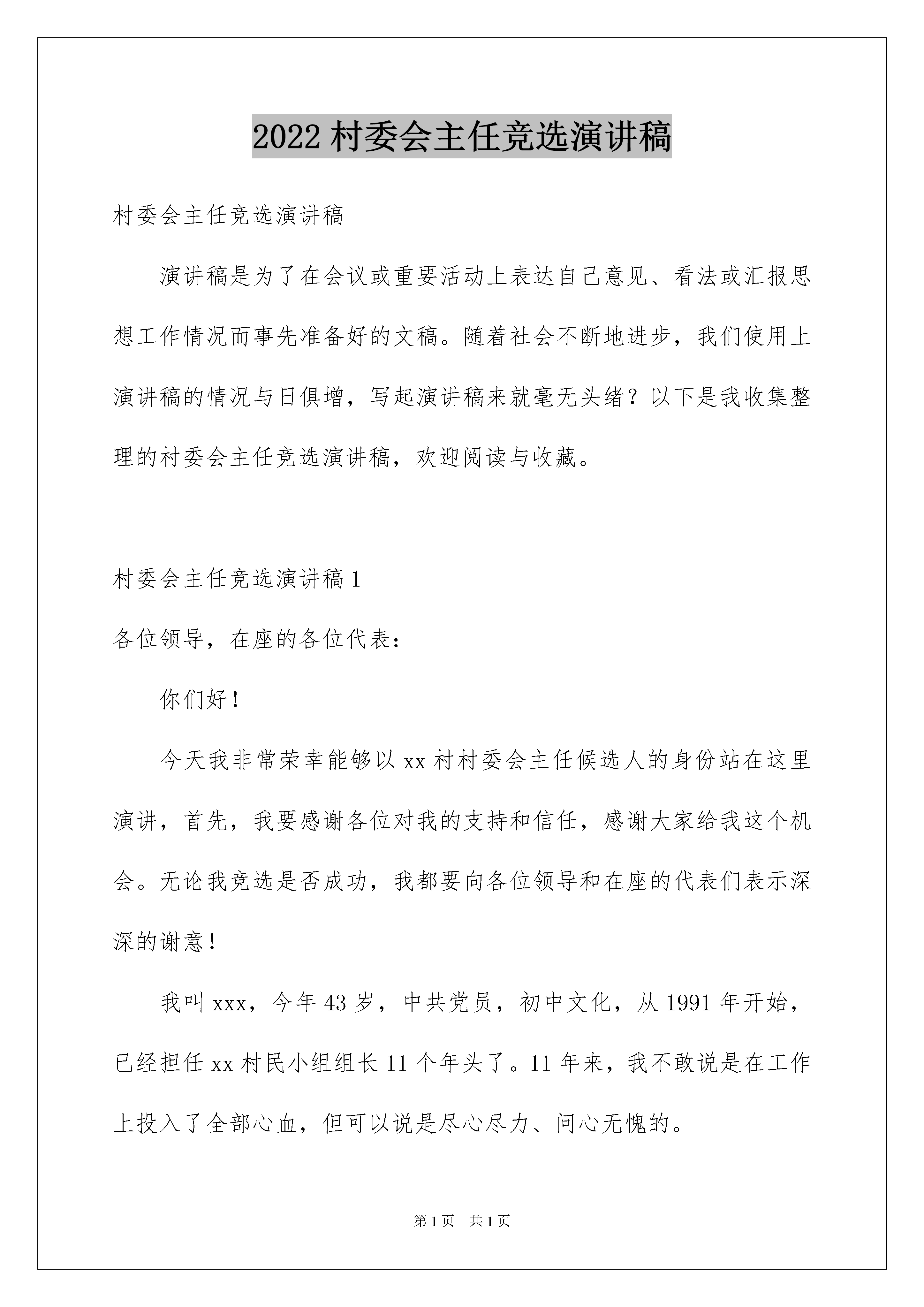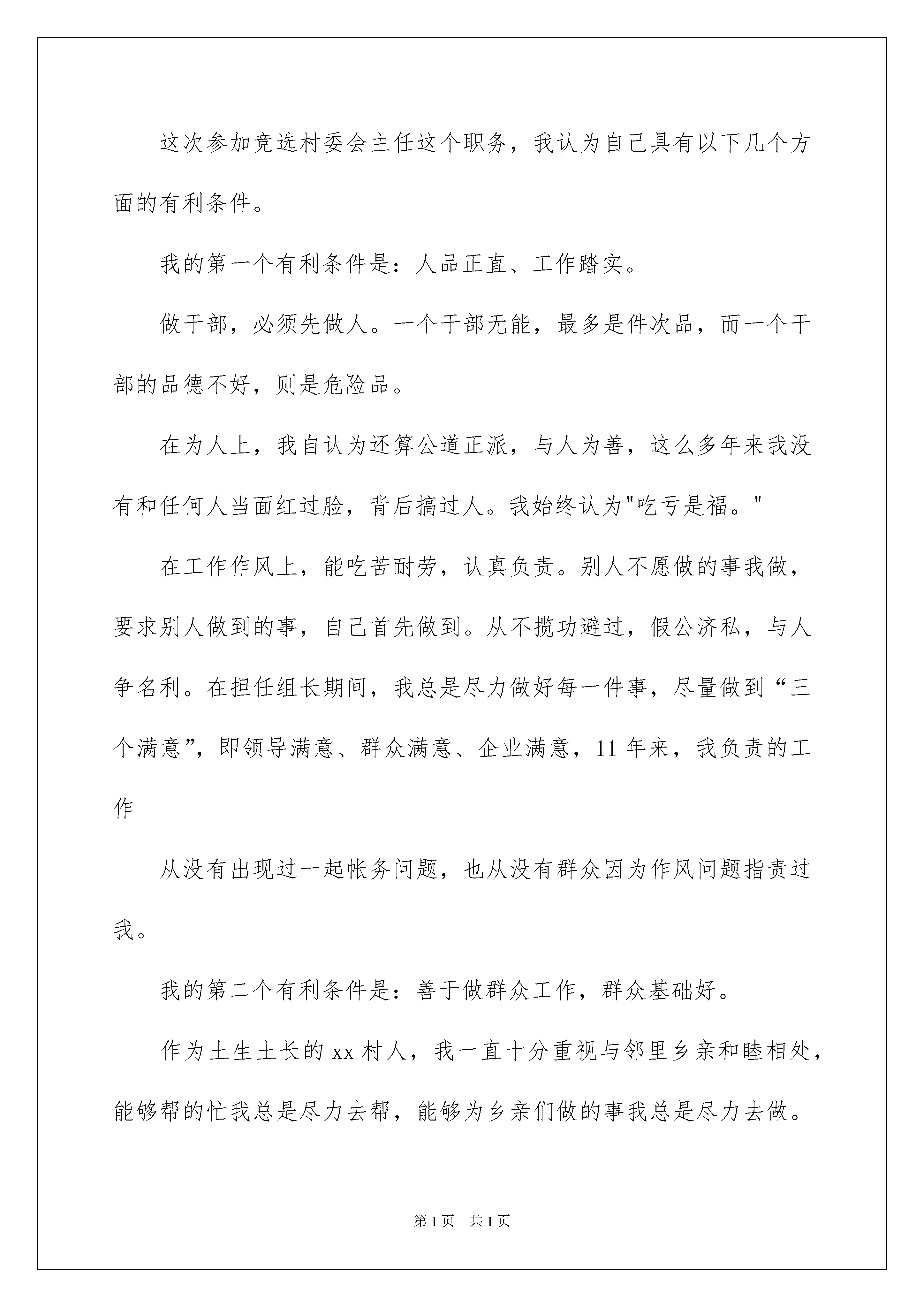 2022村委会主任竞选演讲稿村委会主任竞选演讲稿演讲稿是为了在会议或重要活动上表达自己意见、看法或汇报思想工作情况而事先准备好的文稿。随着社会不断地进步,我们使用上演讲稿的情况与日俱增,写起演讲稿来就毫无头绪?以下是我收集整理的村委会主任竞选演讲稿,欢迎阅读与收藏。村委会主任竞选演讲稿1各位领导,在座的各位代表:你们好!今天我非常荣幸能够以xx村村委会主任候选人的身份站在这里演讲,首先,我要感谢各位对我的支持和信任,感谢大家给我这个机会。无论我竞选是否成功,我都要向各位领导和在座的代表们表示深深的谢意!我叫xxx,今年43岁,中共党员,初中文化,从1991年开始,已经担任xx村民小组组长11个年头了。11年来,我不敢说是在工作上投入了全部心血,但可以说是尽心尽力、问心无愧的。这次参加竞选村委会主任这个职务,我认为自己具有以下几个方面的有利条件。我的第一个有利条件是:人品正直、工作踏实。做干部,必须先做人。一个干部无能,最多是件次品,而一个干部的品德不好,则是危险品。在为人上,我自认为还算公道正派,与人为善,这么多年来我没有和任何人当面红过脸,背后搞过人。我始终认为"吃亏是福。"在工作作风上,能吃苦耐劳,认真负责。别人不愿做的事我做,要求别人做到的事,自己首先做到。从不揽功避过,假公济私,与人争名利。在担任组长期间,我总是尽力做好每一件事,尽量做到“三个满意”,即领导满意、群众满意、企业满意,11年来,我负责的工作从没有出现过一起帐务问题,也从没有群众因为作风问题指责过我。我的第二个有利条件是:善于做群众工作,群众基础好。作为土生土长的xx村人,我一直十分重视与邻里乡亲和睦相处,能够帮的忙我总是尽力去帮,能够为乡亲们做的事我总是尽力去做。在担任组长以后,我更是如此。正是因为我为人上的热情周到,我得到了群众的支持和信任。在20xx年xx路扩建和20xx年多xx公司扩建,出现不稳定问题时,我及时协助镇、村深入群众做工作,使问题很快得到了解决。我的第三个有利条件是:发展经济的能力强,能够带领群众奔小康。尽管我的文化水平不高,但是,多年的社会磨练,培养了我对经济发展的敏锐性。1978年,当大家还在因为改革开放的新政策迟疑不决的时候,我就开始带领部分村民做童装。一直到80年代中期,做童装的人多了起来,我又开始加工拖鞋。作为我镇的第一家拖鞋加工户,当时xx村就有几十户人在我这里领拖鞋打。发展到现在,仅xx村就有几十家拖鞋加工老板,我镇成为远近闻名的拖鞋加工基地。村委会主任竞选演讲稿2领导们、XX的父老乡亲们:你们好!此时此刻,我很高兴也很荣幸能站在这里竞选我们村的村委会主任一职,首先我要感谢各位对我的信任,也感谢大家给我提供了一个平台,我叫xxx,今年x岁,XX村人,XX文化,众所周知我敢说我是心地善良,人品正直,做事踏踏实实,所以我认为我有优势也更有信心站在这里竞选。我竞选村长的动机是报答生我养我的这片土地和这里的村民,实现我的人生价值,我当村长的守则是:(四不)1、不贪。克己奉公,不计个人得失,不图个人回报。把我的爱心与智慧奉献给全村的父老乡亲。2、不懒。发奋工作,克尽职守,多动脑子,多出点子,多想法子,一心一意,做好本职工作。3、不独。不独揽村长大权,注意发挥村委一班人的群体作用,团结协作,注重发挥村民的民主作用,群策群力,共同把把村里工作办得老百姓称心如意。4、不偏。对人,不分亲疏,一视同仁;处世,不违良心,以情动人;办事,不违政策,依法治村,以德服人。同志们,如果能够当选,我想着重从以下几个方面入手开展工作:一、抓稳定创建和谐氛围。我会主动地向老干部们学习请教,充分听取广大群众的意见和建议,广开言路,了解民情,体察民意,取长补短,不断充实、调整、完善和提高自己。要把全村干部群众团结起来,思想认识上形成共识,行动上形成一致,营造一种和谐向上的氛围,按照法制、有序的轨道开展各项工作,村干部身先士卒、一心为公,干部群众心往一处想,劲往一处使,共同把我们xx村建设得更加美好!二、做表率建设务实班子。在思想上、行动上与上级党组织保持高度一致,一切工作以广大群众的根本利益为出发点,想村民所想,急村民所急,办村民所需,当好广大村民的代言人和带头人,建设一个凝聚人心、务实求真的坚强班子。三、抓公开打造透明村务。在村党支部的领导监督下,在全体村民的支持和监督下,进一步地规范和完善村民自治组织的各项规章制度,推行并真正落实好以财务公开为主要内容的村务公开制度,用干部自身的清白,给百姓一个明白。四、引资金构筑多元经济。想方设法创造宽松的投资环境,积极吸引外来资金,并为村民投资办厂、开店、发展种植、