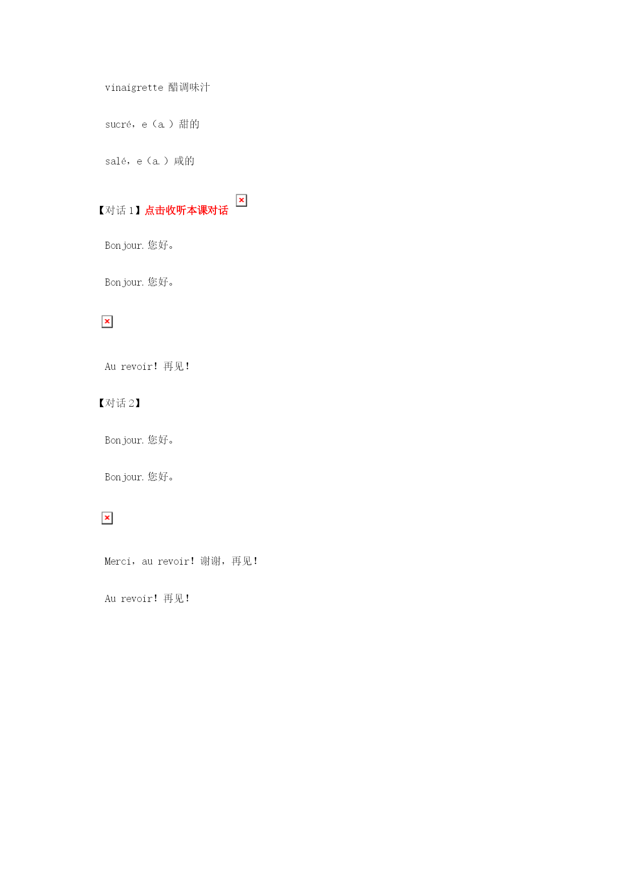 第九课法国的午餐 点击收听整课内容 【单词】点击收听本课单词 salade(n.f.)生菜,沙拉 oeuf(n.m.)鸡蛋 tomate(n.f.)西红柿 thon(n.m.)金枪鱼 poulet(n.m.)鸡肉,小鸡 champignon(n.m.)蘑菇 unsandwichcrudité三明治(右上图) unjamboncrudité火腿三明治 unthoncrudité金枪鱼三明治 unpouletcrudité鸡肉三明治 unecrêpe(n.f.)鸡蛋薄饼(右中下图) unecrêpeauchocolat巧克力蛋饼 unecrêpeàlaconfiture果酱蛋饼 lasauce(n.f.)调味汁 mayonnaise蛋黄酱(蛋黄和油等混合调制成的调味汁) moutarde芥末(黄油和芥末调制的调味汁) vinaigrette醋调味汁 sucré,e(a.)甜的 salé,e(a.)咸的 【对话1】点击收听本课对话 Bonjour.您好。 Bonjour.您好。 Aurevoir!再见! 【对话2】 Bonjour.您好。 Bonjour.您好。 Merci,aurevoir!谢谢,再见! Aurevoir!再见!
