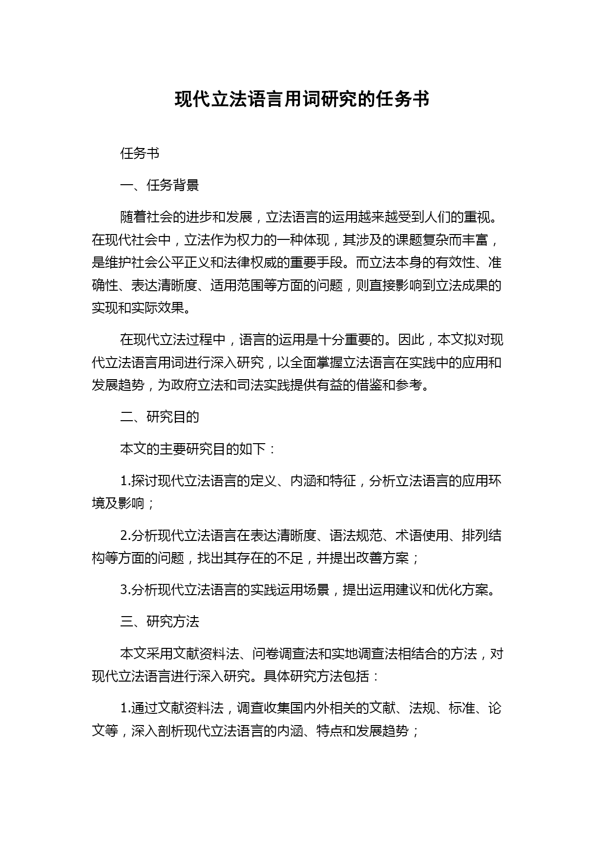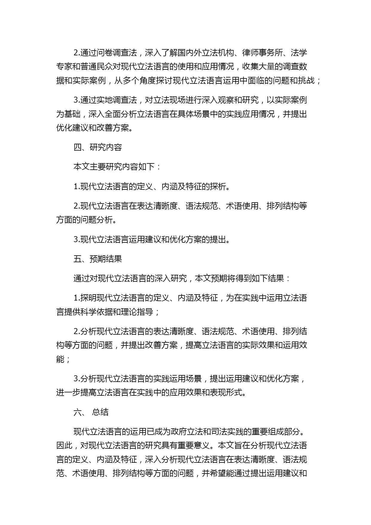 现代立法语言用词研究的任务书 任务书 一、任务背景 随着社会的进步和发展,立法语言的运用越来越受到人们的重视。在现代社会中,立法作为权力的一种体现,其涉及的课题复杂而丰富,是维护社会公平正义和法律权威的重要手段。而立法本身的有效性、准确性、表达清晰度、适用范围等方面的问题,则直接影响到立法成果的实现和实际效果。 在现代立法过程中,语言的运用是十分重要的。因此,本文拟对现代立法语言用词进行深入研究,以全面掌握立法语言在实践中的应用和发展趋势,为政府立法和司法实践提供有益的借鉴和参考。 二、研究目的 本文的主要研究目的如下: 1.探讨现代立法语言的定义、内涵和特征,分析立法语言的应用环境及影响; 2.分析现代立法语言在表达清晰度、语法规范、术语使用、排列结构等方面的问题,找出其存在的不足,并提出改善方案; 3.分析现代立法语言的实践运用场景,提出运用建议和优化方案。 三、研究方法 本文采用文献资料法、问卷调查法和实地调查法相结合的方法,对现代立法语言进行深入研究。具体研究方法包括: 1.通过文献资料法,调查收集国内外相关的文献、法规、标准、论文等,深入剖析现代立法语言的内涵、特点和发展趋势; 2.通过问卷调查法,深入了解国内外立法机构、律师事务所、法学专家和普通民众对现代立法语言的使用和应用情况,收集大量的调查数据和实际案例,从多个角度探讨现代立法语言运用中面临的问题和挑战; 3.通过实地调查法,对立法现场进行深入观察和研究,以实际案例为基础,深入全面分析立法语言在具体场景中的实践应用情况,并提出优化建议和改善方案。 四、研究内容 本文主要研究内容如下: 1.现代立法语言的定义、内涵及特征的探析。 2.现代立法语言在表达清晰度、语法规范、术语使用、排列结构等方面的问题分析。 3.现代立法语言运用建议和优化方案的提出。 五、预期结果 通过对现代立法语言的深入研究,本文预期将得到如下结果: 1.探明现代立法语言的定义、内涵及特征,为在实践中运用立法语言提供科学依据和理论指导; 2.分析现代立法语言的表达清晰度、语法规范、术语使用、排列结构等方面的问题,并提出改善方案,提高立法语言的实际效果和运用效能; 3.分析现代立法语言的实践运用场景,提出运用建议和优化方案,进一步提高立法语言在实践中的应用效果和表现形式。 六、总结 现代立法语言的运用已成为政府立法和司法实践的重要组成部分。因此,对现代立法语言的研究具有重要意义。本文旨在分析现代立法语言的定义、内涵及特征,深入分析现代立法语言在表达清晰度、语法规范、术语使用、排列结构等方面的问题,并希望能通过提出运用建议和优化方案,推动履行法律规则的效果和实际效能提高,实现社会公平正义和法律权威的进一步强化和巩固。