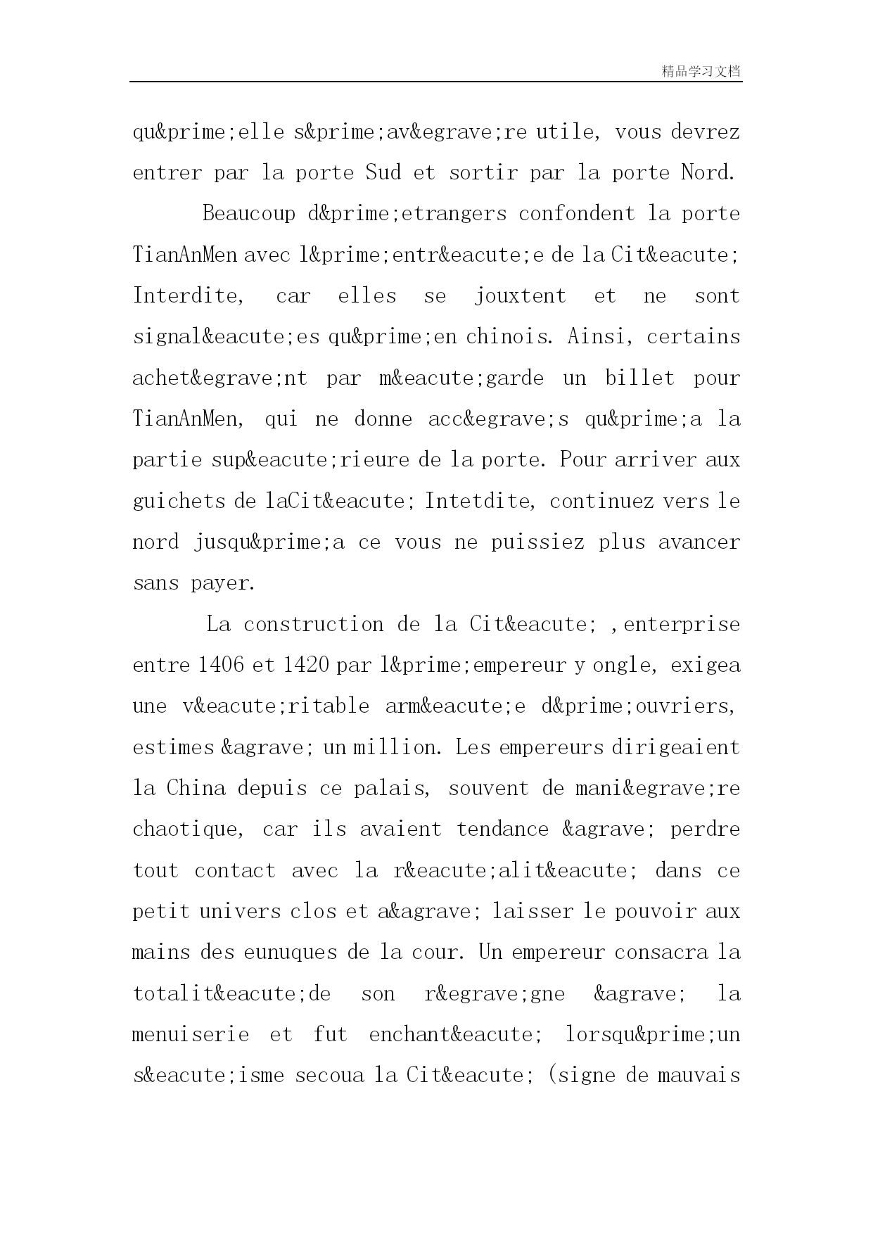 精品学习文档 北京法语导游词 故宫博物院Batimentsnationauxetmonuments LaCitéInterdite(故宫紫禁城) LaCitéInterdite(ZiJinCheng)ainsinomméeparceque,pendantcinqsiécles,raresfurentceuxquipurentypénétrer–estleplusgigantesqueetlemieuxpréservédesensemblesarchitecturauxchinois.Elleservitderésidenceàdeuxdynastiesimpérials,lesMingetlesQing,quin′ensortaientqu′encasdenécessitéabsolue. Lesqutoritésinsistentpourl′appelerlePalaisMusée(GuGong).Quelquesoitsonnom,lecompiexeouvretouslesjoursde8h30à17h,lesguichetsfermentà15h30.ilyadeuxsiécles,onauraitpayédesaviel′entreedanslaCitéIntetdite;aujoud′hui,30ysuffisentpourobtenirceprivilège,ou50ysivousvoulezvisitertouteslessallesd′exposicaution.Moyennant30ysupplémentairesetunecaution(votrepasseportparexemple),unecassette(enregistréeenplusieurslangues)guideravotreexploration.Pourqu′elles′avèreutile,vousdevrezentrerparlaporteSudetsortirparlaporteNord. Beaucoupd′etrangersconfondentlaporteTianAnMenavecl′entréedelaCitéInterdite,carellessejouxtentetnesontsignaléesqu′enchinois.Ainsi,certainsachetèntparmégardeunbilletpourTianAnMen,quinedonneaccèsqu′alapartiesupérieuredelaporte.PourarriverauxguichetsdelaCitéIntetdite,continuezverslenordjusqu′acevousnepuissiezplusavancersanspayer. LaconstructiondelaCité,enterpriseentre1406et1420parl′empereuryongle,exigeaunevéritablearméed′ouvriers,estimesàunmillion.LesempereursdirigeaientlaChinadepuiscepalais,souventdemanièrechaotique,carilsavaienttendanceàperdretoutcontactaveclaréalitédanscepetituniversclosetaàlaisserlepouvoirauxmainsdeseunuquesdelacour.Unempereurconsacralatotalitédesonrègneàlamenuiserieetfutenchantélorsqu′uns&ea
