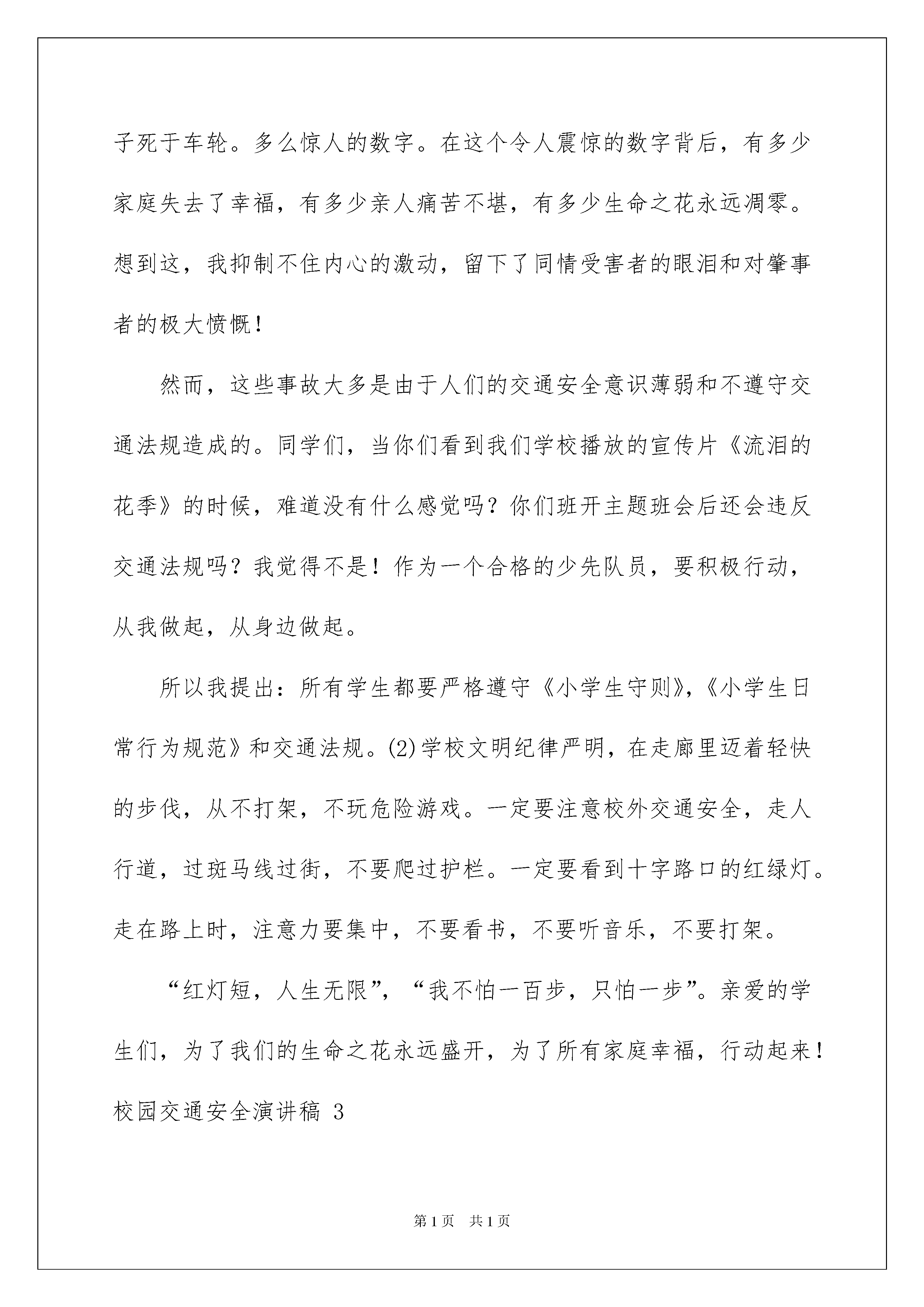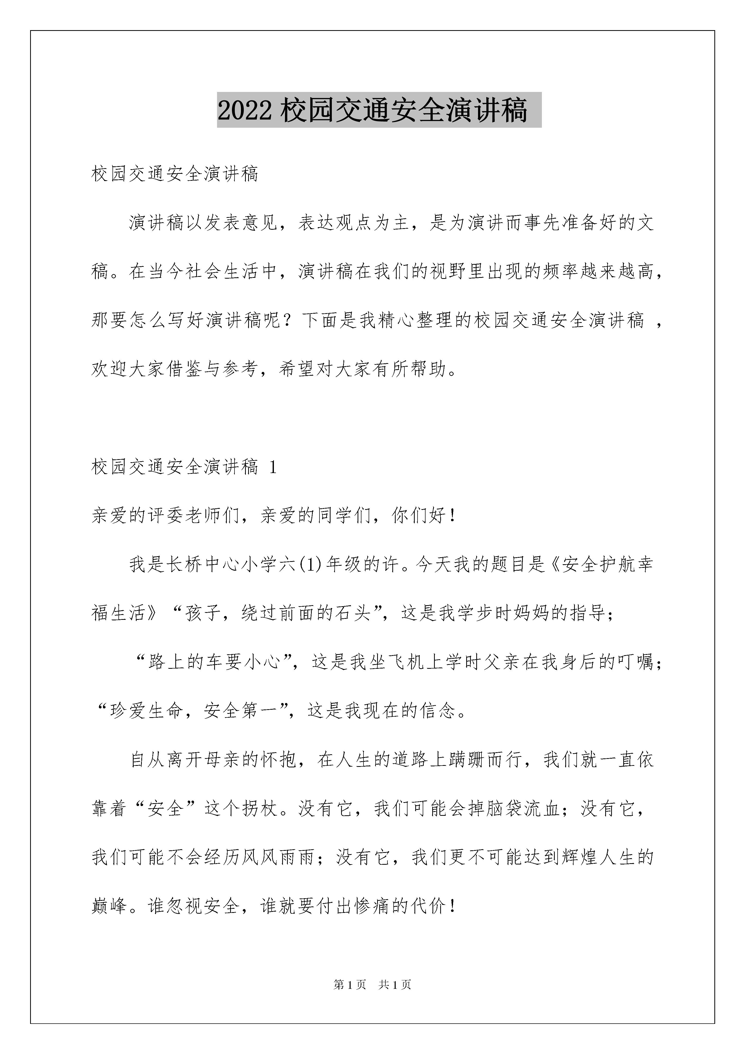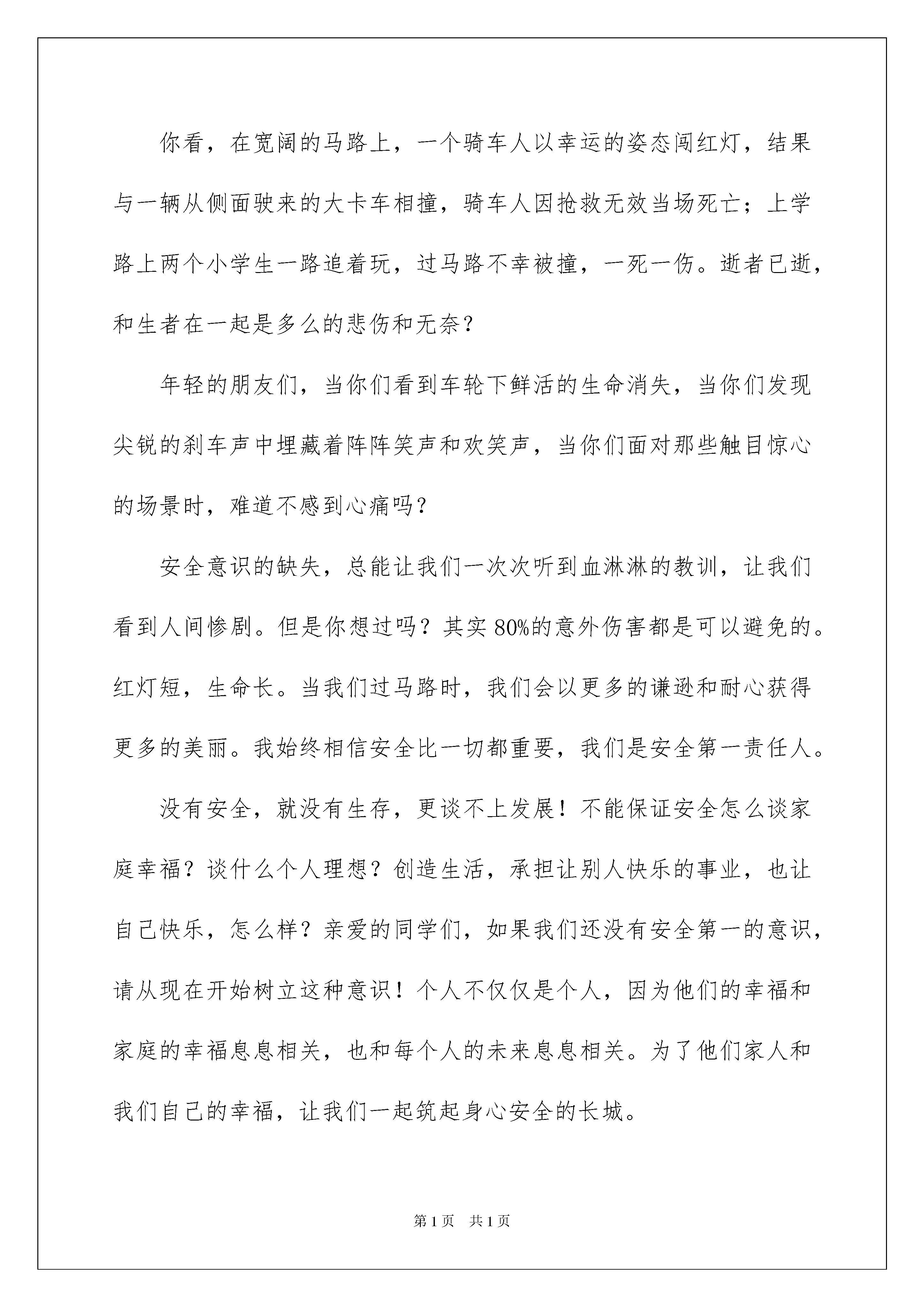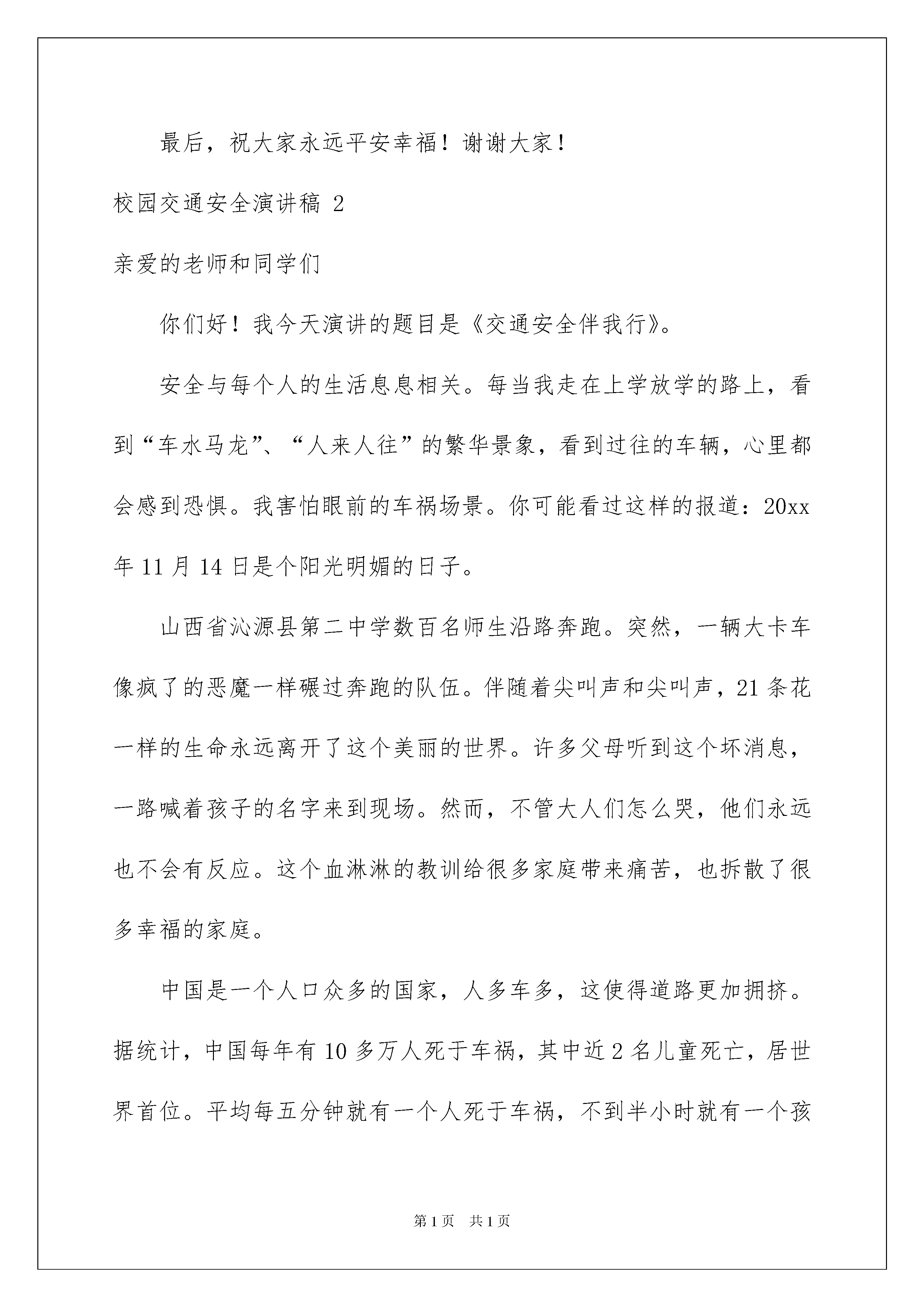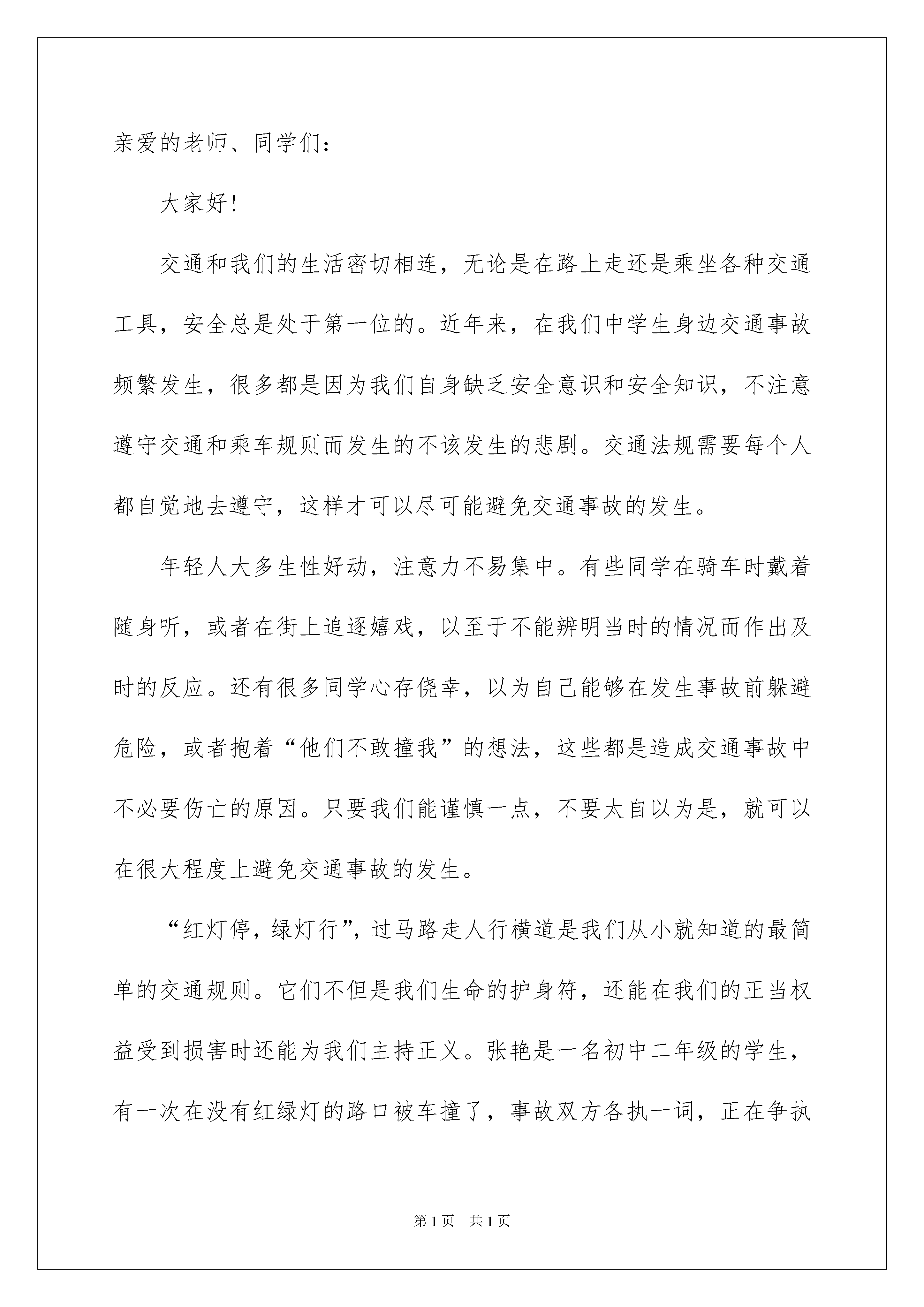 2022校园交通安全演讲稿校园交通安全演讲稿演讲稿以发表意见,表达观点为主,是为演讲而事先准备好的文稿。在当今社会生活中,演讲稿在我们的视野里出现的频率越来越高,那要怎么写好演讲稿呢?下面是我精心整理的校园交通安全演讲稿,欢迎大家借鉴与参考,希望对大家有所帮助。校园交通安全演讲稿1亲爱的评委老师们,亲爱的同学们,你们好!我是长桥中心小学六(1)年级的许。今天我的题目是《安全护航幸福生活》“孩子,绕过前面的石头”,这是我学步时妈妈的指导;“路上的车要小心”,这是我坐飞机上学时父亲在我身后的叮嘱;“珍爱生命,安全第一”,这是我现在的信念。自从离开母亲的怀抱,在人生的道路上蹒跚而行,我们就一直依靠着“安全”这个拐杖。没有它,我们可能会掉脑袋流血;没有它,我们可能不会经历风风雨雨;没有它,我们更不可能达到辉煌人生的巅峰。谁忽视安全,谁就要付出惨痛的代价!你看,在宽阔的马路上,一个骑车人以幸运的姿态闯红灯,结果与一辆从侧面驶来的大卡车相撞,骑车人因抢救无效当场死亡;上学路上两个小学生一路追着玩,过马路不幸被撞,一死一伤。逝者已逝,和生者在一起是多么的悲伤和无奈?年轻的朋友们,当你们看到车轮下鲜活的生命消失,当你们发现尖锐的刹车声中埋藏着阵阵笑声和欢笑声,当你们面对那些触目惊心的场景时,难道不感到心痛吗?安全意识的缺失,总能让我们一次次听到血淋淋的教训,让我们看到人间惨剧。但是你想过吗?其实80%的意外伤害都是可以避免的。红灯短,生命长。当我们过马路时,我们会以更多的谦逊和耐心获得更多的美丽。我始终相信安全比一切都重要,我们是安全第一责任人。没有安全,就没有生存,更谈不上发展!不能保证安全怎么谈家庭幸福?谈什么个人理想?创造生活,承担让别人快乐的事业,也让自己快乐,怎么样?亲爱的同学们,如果我们还没有安全第一的意识,请从现在开始树立这种意识!个人不仅仅是个人,因为他们的幸福和家庭的幸福息息相关,也和每个人的未来息息相关。为了他们家人和我们自己的幸福,让我们一起筑起身心安全的长城。最后,祝大家永远平安幸福!谢谢大家!校园交通安全演讲稿2亲爱的老师和同学们你们好!我今天演讲的题目是《交通安全伴我行》。安全与每个人的生活息息相关。每当我走在上学放学的路上,看到“车水马龙”、“人来人往”的繁华景象,看到过往的车辆,心里都会感到恐惧。我害怕眼前的车祸场景。你可能看过这样的报道:20xx年11月14日是个阳光明媚的日子。山西省沁源县第二中学数百名师生沿路奔跑。突然,一辆大卡车像疯了的恶魔一样碾过奔跑的队伍。伴随着尖叫声和尖叫声,21条花一样的生命永远离开了这个美丽的世界。许多父母听到这个坏消息,一路喊着孩子的名字来到现场。然而,不管大人们怎么哭,他们永远也不会有反应。这个血淋淋的教训给很多家庭带来痛苦,也拆散了很多幸福的家庭。中国是一个人口众多的国家,人多车多,这使得道路更加拥挤。据统计,中国每年有10多万人死于车祸,其中近2名儿童死亡,居世界首位。平均每五分钟就有一个人死于车祸,不到半小时就有一个孩子死于车轮。多么惊人的数字。在这个令人震惊的数字背后,有多少家庭失去了幸福,有多少亲人痛苦不堪,有多少生命之花永远凋零。想到这,我抑制不住内心的激动,留下了同情受害者的眼泪和对肇事者的极大愤慨!然而,这些事故大多是由于人们的交通安全意识薄弱和不遵守交通法规造成的。同学们,当你们看到我们学校播放的宣传片《流泪的花季》的时候,难道没有什么感觉吗?你们班开主题班会后还会违反交通法规吗?我觉得不是!作为一个合格的少先队员,要积极行动,从我做起,从身边做起。所以我提出:所有学生都要严格遵守《小学生守则》,《小学生日常行为规范》和交通法规。(2)学校文明纪律严明,在走廊里迈着轻快的步伐,从不打架,不玩危险游戏。一定要注意校外交通安全,走人行道,过斑马线过街,不要爬过护栏。一定要看到十字路口的红绿灯。走在路上时,注意力要集中,不要看书,不要听音乐,不要打架。“红灯短,人生无限”,“我不怕一百步,只怕一步”。亲爱的学生们,为了我们的生命之花永远盛开,为了所有家庭幸福,行动起来!校园交通安全演讲稿3亲爱的老师、同学们:大家好!交通和我们的生活密切相连,无论是在路上走还是乘坐各种交通工具,安全总是处于第一位的。近年来,在我们中学生身边交通事故频繁发生,很多都是因为我们自身缺乏安全意识和安全知识,不注意遵守交通和乘车规则而发生的不该发生的悲剧。交通法规需要每个人都自觉地去遵守,这样才可以尽可能避免交通事故的发生。年轻人大多生性好动,注意力不易集中。有些同学在骑车时戴着随身听,或者在街上追逐嬉戏,以至于不能辨明当时的情况而