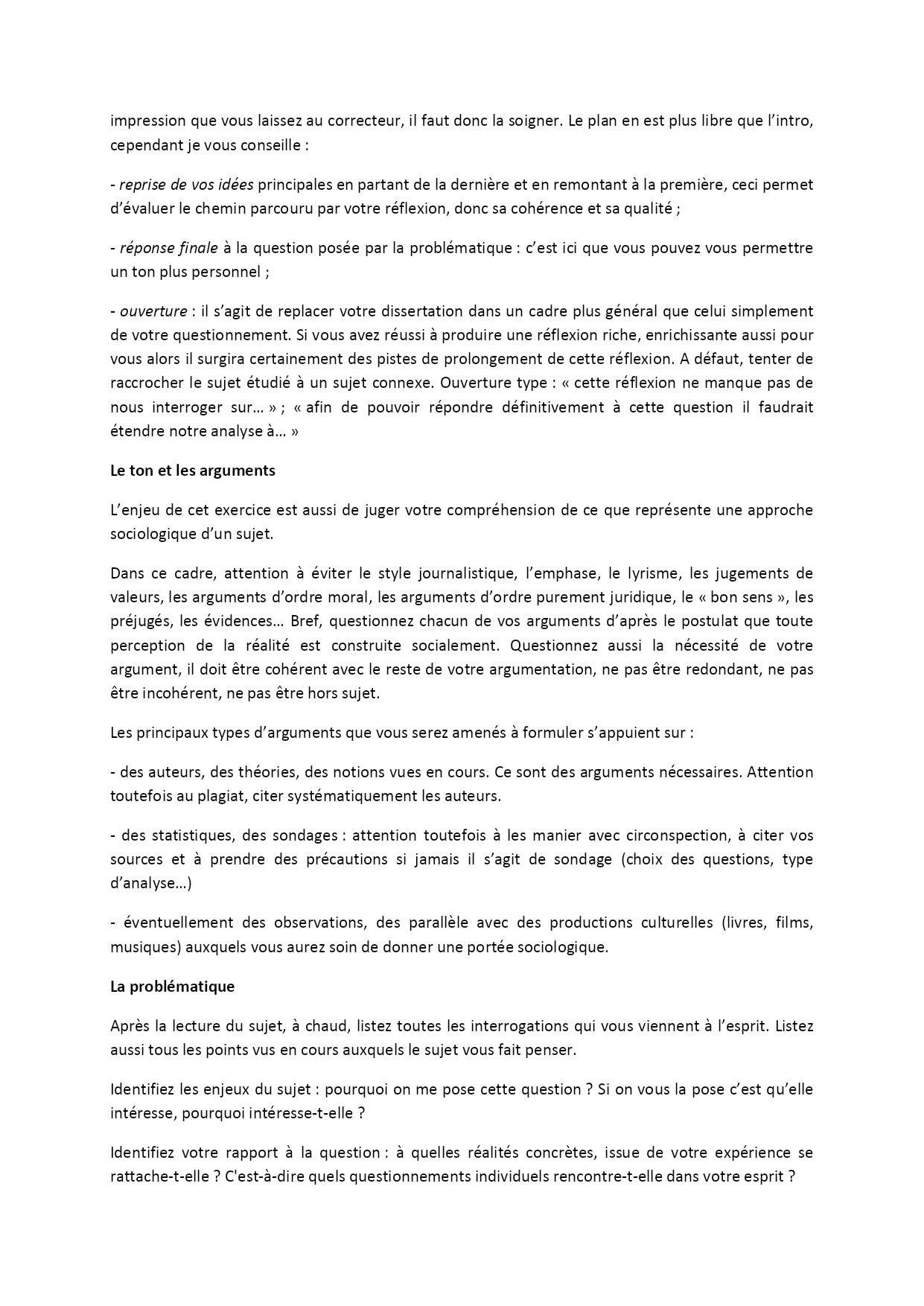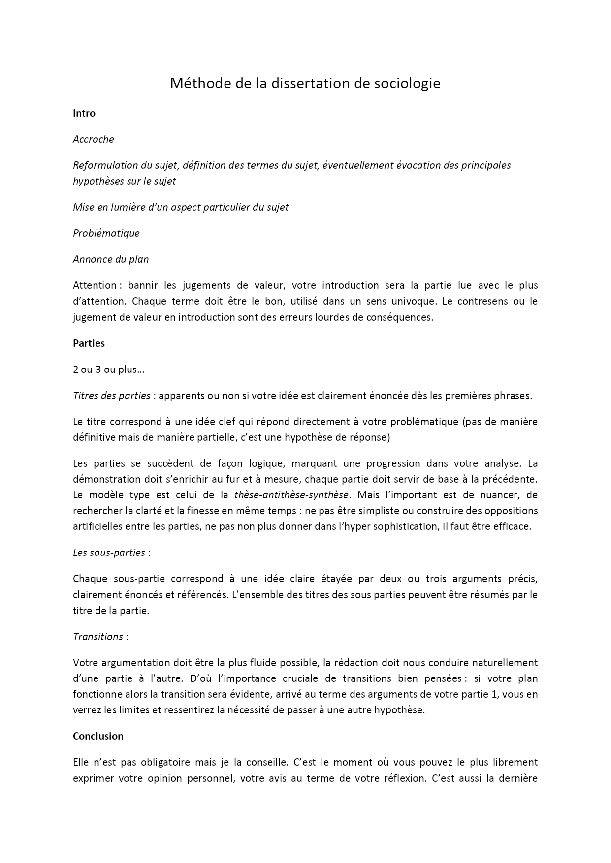 Méthodedeladissertationdesociologie Intro Accroche Reformulationdusujet,définitiondestermesdusujet,éventuellementévocationdesprincipaleshypothèsessurlesujet Miseenlumièred’unaspectparticulierdusujet Problématique Annonceduplan Attention:bannirlesjugementsdevaleur,votreintroductionseralapartielueavecleplusd’attention.Chaquetermedoitêtrelebon,utilisédansunsensunivoque.Lecontresensoulejugementdevaleurenintroductionsontdeserreurslourdesdeconséquences. Parties 2ou3ouplus… Titresdesparties:apparentsounonsivotreidéeestclairementénoncéedèslespremièresphrases. Letitrecorrespondàuneidéeclefquiréponddirectementàvotreproblématique(pasdemanièredéfinitivemaisdemanièrepartielle,c’estunehypothèsederéponse) Lespartiessesuccèdentdefaçonlogique,marquantuneprogressiondansvotreanalyse.Ladémonstrationdoits’enrichiraufuretàmesure,chaquepartiedoitservirdebaseàlaprécédente.Lemodèletypeestceluidelathèse-antithèse-synthèse.Maisl’importantestdenuancer,derechercherlaclartéetlafinesseenmêmetemps:nepasêtresimplisteouconstruiredesoppositionsartificiellesentrelesparties,nepasnonplusdonnerdansl’hypersophistication,ilfautêtreefficace. Lessous-parties: Chaquesous-partiecorrespondàuneidéeclaireétayéepardeuxoutroisargumentsprécis,clairementénoncésetréférencés.L’ensembledestitresdessouspartiespeuventêtrerésumésparletitredelapartie. Transitions: Votreargumentationdoitêtrelaplusfluidepossible,larédactiondoitnousconduirenaturellementd’unepartieàl’autre.D’oùl’importancecrucialedetransitionsbienpensées:sivotreplanfonctionnealorslatransitionseraévidente,arrivéautermedesargumentsdevotrepartie1,vousenverrezleslimitesetressentirezlanécessitédepasseràuneautrehypothèse. Conclusion Ellen’estpasobligatoiremaisjelaconseille.C’estlemomentoùvouspouvezlepluslibrementexprimervotreopinionpersonnel,votreavisautermedevotreréflexion.C’estaussiladernièreimpressionquevouslaissezaucorrecteur,ilfautdonclasoigner.Leplanenestpluslibrequel’intro,cependantjevousconseille: -reprisedevosidéesprincipalesenpartantdeladernièreetenremontan