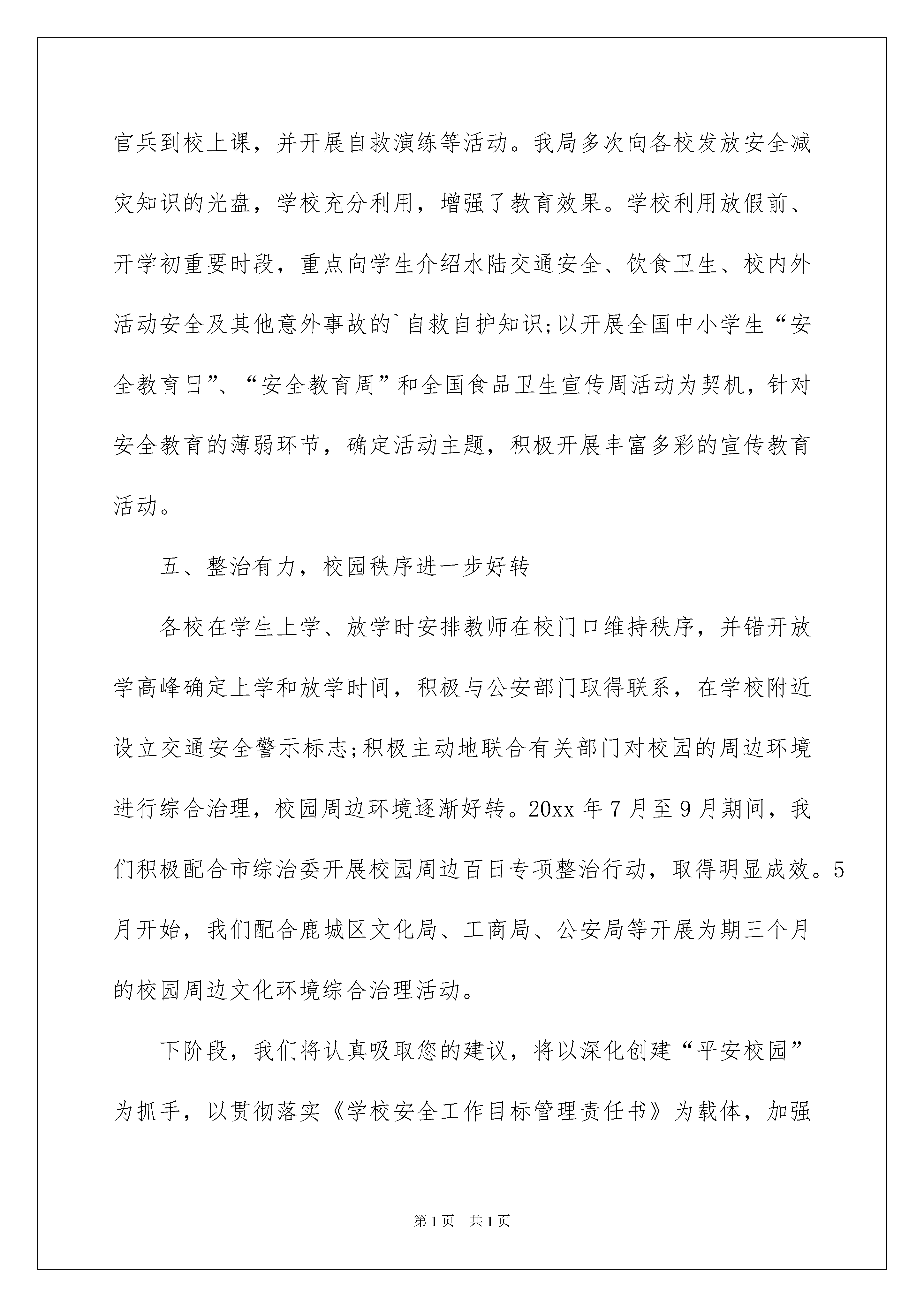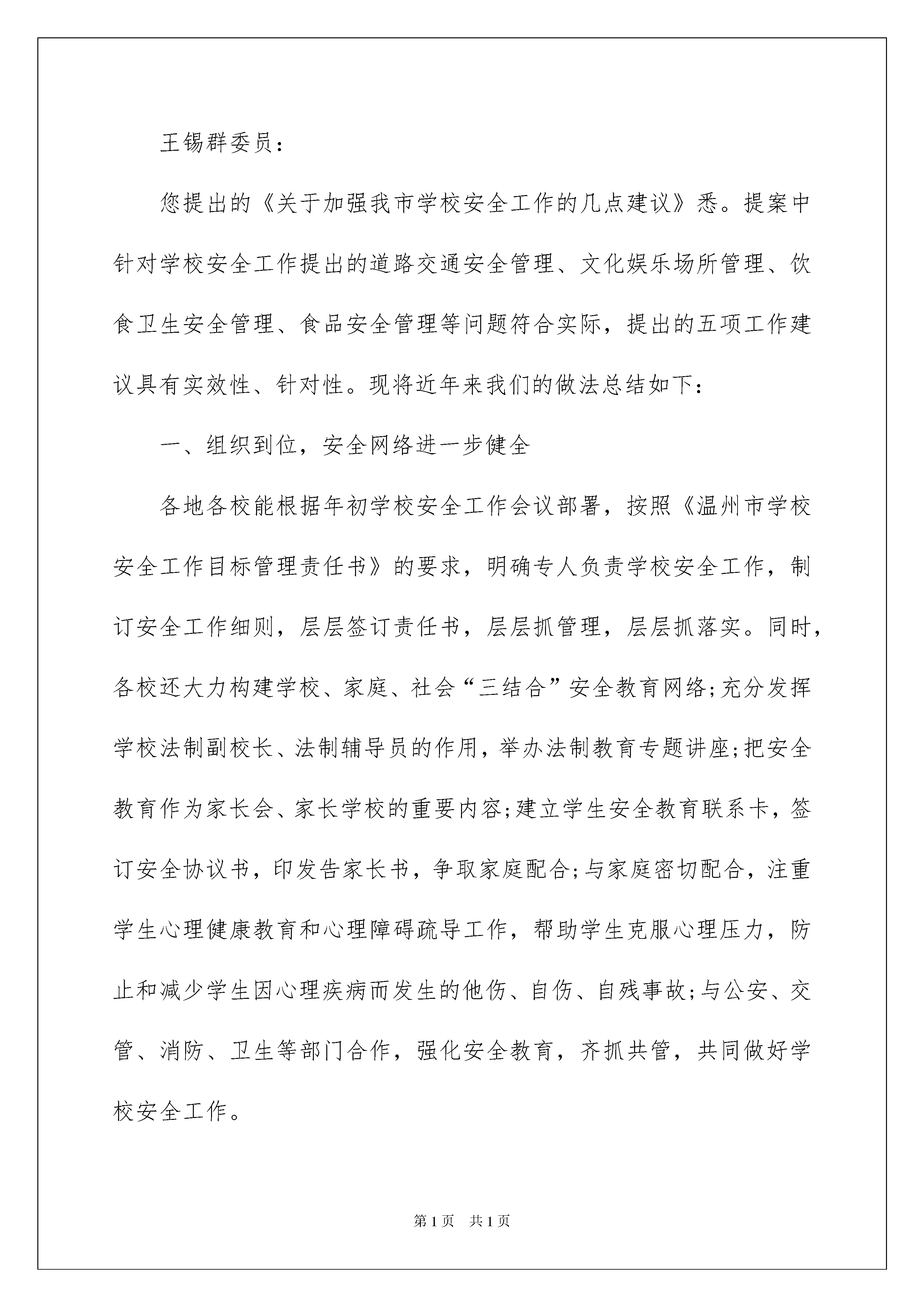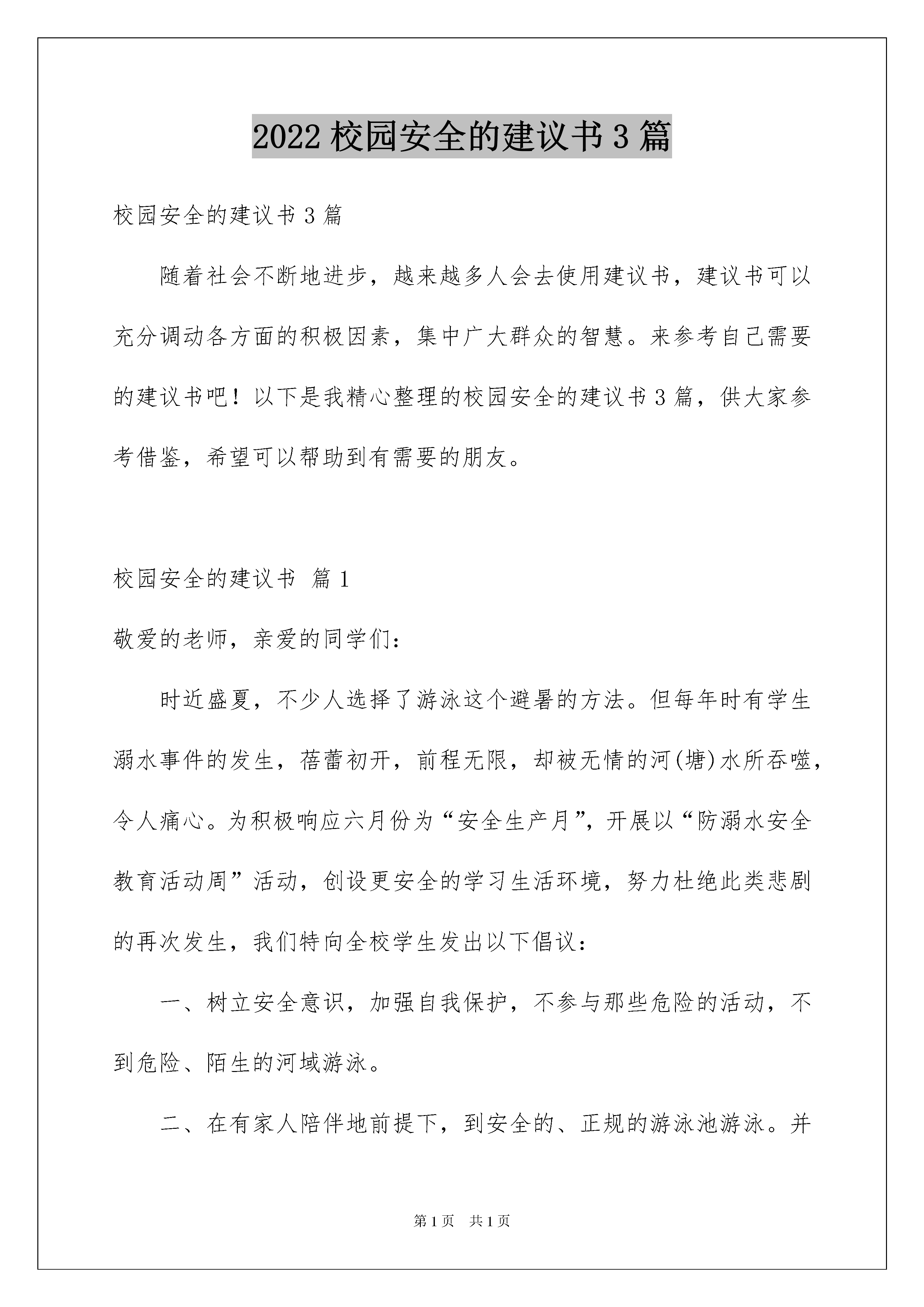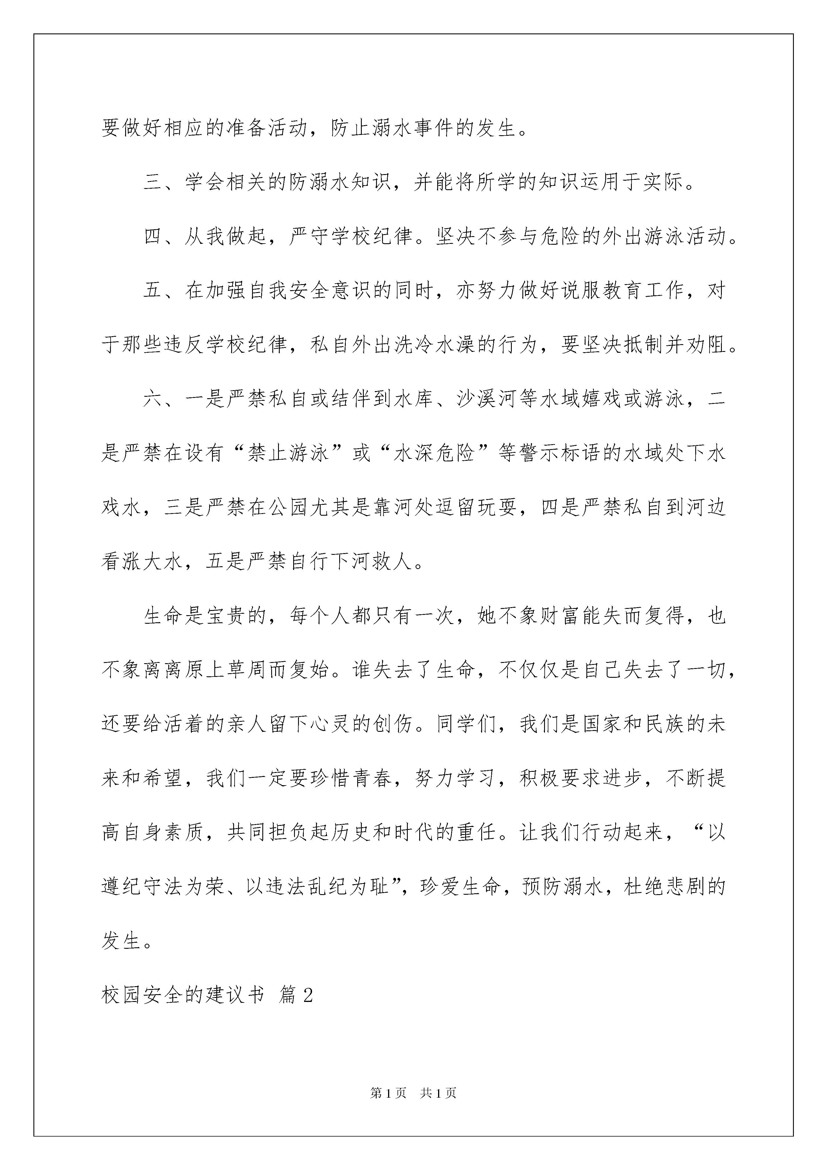 2022校园安全的建议书3篇校园安全的建议书3篇随着社会不断地进步,越来越多人会去使用建议书,建议书可以充分调动各方面的积极因素,集中广大群众的智慧。来参考自己需要的建议书吧!以下是我精心整理的校园安全的建议书3篇,供大家参考借鉴,希望可以帮助到有需要的朋友。校园安全的建议书篇1敬爱的老师,亲爱的同学们:时近盛夏,不少人选择了游泳这个避暑的方法。但每年时有学生溺水事件的发生,蓓蕾初开,前程无限,却被无情的河(塘)水所吞噬,令人痛心。为积极响应六月份为“安全生产月”,开展以“防溺水安全教育活动周”活动,创设更安全的学习生活环境,努力杜绝此类悲剧的再次发生,我们特向全校学生发出以下倡议:一、树立安全意识,加强自我保护,不参与那些危险的活动,不到危险、陌生的河域游泳。二、在有家人陪伴地前提下,到安全的、正规的游泳池游泳。并要做好相应的准备活动,防止溺水事件的发生。三、学会相关的防溺水知识,并能将所学的知识运用于实际。四、从我做起,严守学校纪律。坚决不参与危险的外出游泳活动。五、在加强自我安全意识的同时,亦努力做好说服教育工作,对于那些违反学校纪律,私自外出洗冷水澡的行为,要坚决抵制并劝阻。六、一是严禁私自或结伴到水库、沙溪河等水域嬉戏或游泳,二是严禁在设有“禁止游泳”或“水深危险”等警示标语的水域处下水戏水,三是严禁在公园尤其是靠河处逗留玩耍,四是严禁私自到河边看涨大水,五是严禁自行下河救人。生命是宝贵的,每个人都只有一次,她不象财富能失而复得,也不象离离原上草周而复始。谁失去了生命,不仅仅是自己失去了一切,还要给活着的亲人留下心灵的创伤。同学们,我们是国家和民族的未来和希望,我们一定要珍惜青春,努力学习,积极要求进步,不断提高自身素质,共同担负起历史和时代的重任。让我们行动起来,“以遵纪守法为荣、以违法乱纪为耻”,珍爱生命,预防溺水,杜绝悲剧的发生。校园安全的建议书篇2王锡群委员:您提出的《关于加强我市学校安全工作的几点建议》悉。提案中针对学校安全工作提出的道路交通安全管理、文化娱乐场所管理、饮食卫生安全管理、食品安全管理等问题符合实际,提出的五项工作建议具有实效性、针对性。现将近年来我们的做法总结如下:一、组织到位,安全网络进一步健全各地各校能根据年初学校安全工作会议部署,按照《温州市学校安全工作目标管理责任书》的要求,明确专人负责学校安全工作,制订安全工作细则,层层签订责任书,层层抓管理,层层抓落实。同时,各校还大力构建学校、家庭、社会“三结合”安全教育网络;充分发挥学校法制副校长、法制辅导员的作用,举办法制教育专题讲座;把安全教育作为家长会、家长学校的重要内容;建立学生安全教育联系卡,签订安全协议书,印发告家长书,争取家庭配合;与家庭密切配合,注重学生心理健康教育和心理障碍疏导工作,帮助学生克服心理压力,防止和减少学生因心理疾病而发生的他伤、自伤、自残事故;与公安、交管、消防、卫生等部门合作,强化安全教育,齐抓共管,共同做好学校安全工作。二、完善机制,安全管理进一步强化各校普遍建立学校安全定期检查和日常防范相结合的管理制度;建立安全工作信息报送、安全值班、防火防灾等规章制度;建立健全学校安全工作领导责任制等,学校安全工作有章可循,日益规范。同时,各地各校定期、不定期对学校安全工作进行自查与互查,对存在的问题及时整改,及时消除安全隐患。三、宣教到位,安全意识进一步提高各地各校把安全教育作为学校思想政治教育的重要内容,坚持逢会必讲,全面部署,狠抓落实,确保时时刻刻讲安全,人人事事保安全。各学校能积极开展形式多样的安全教育活动,利用会议、广播、黑板报、宣传橱窗、横幅等形式进行安全宣传,加强安全教育,提高安全意识,养成安全习惯。学校安全教育内容丰富,包括交通安全教育、消防安全教育、食品卫生安全教育、用电安全教育、实验、实习及社会实践安全教育、体育运动安全教育、网络安全教育、劳动及日常生活安全教育。四、措施落实,防范意识进一步增强各校每年至少组织开展一次师生消防演习活动,有的还聘请消防官兵到校上课,并开展自救演练等活动。我局多次向各校发放安全减灾知识的光盘,学校充分利用,增强了教育效果。学校利用放假前、开学初重要时段,重点向学生介绍水陆交通安全、饮食卫生、校内外活动安全及其他意外事故的`自救自护知识;以开展全国中小学生“安全教育日”、“安全教育周”和全国食品卫生宣传周活动为契机,针对安全教育的薄弱环节,确定活动主题,积极开展丰富多彩的宣传教育活动。五、整治有力,校园秩序进一步好转各校在学生上学、放学时安排教师在校门口维持秩序,并错开放学高峰确定上学和放学时间,积极与公安部门取得联
