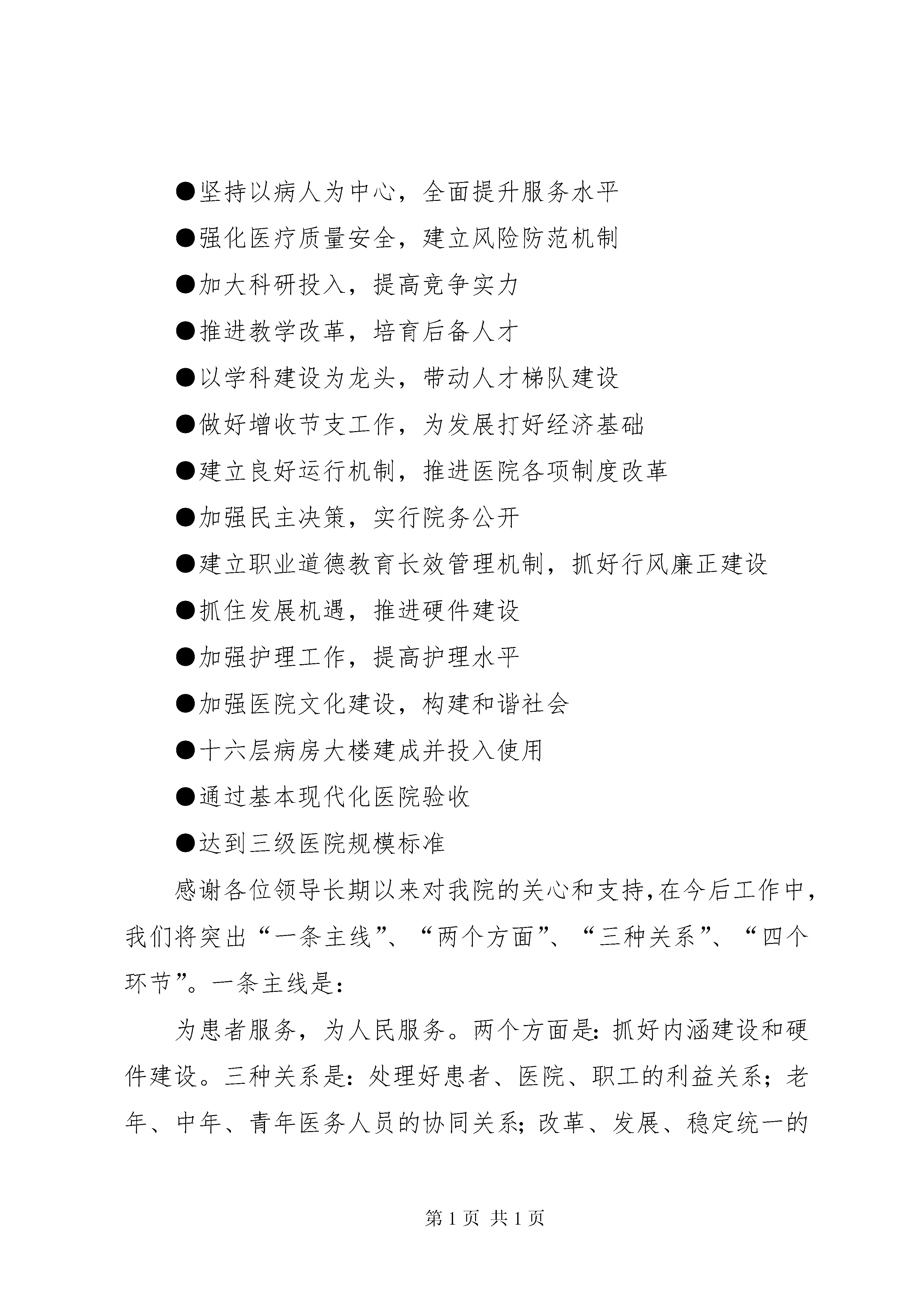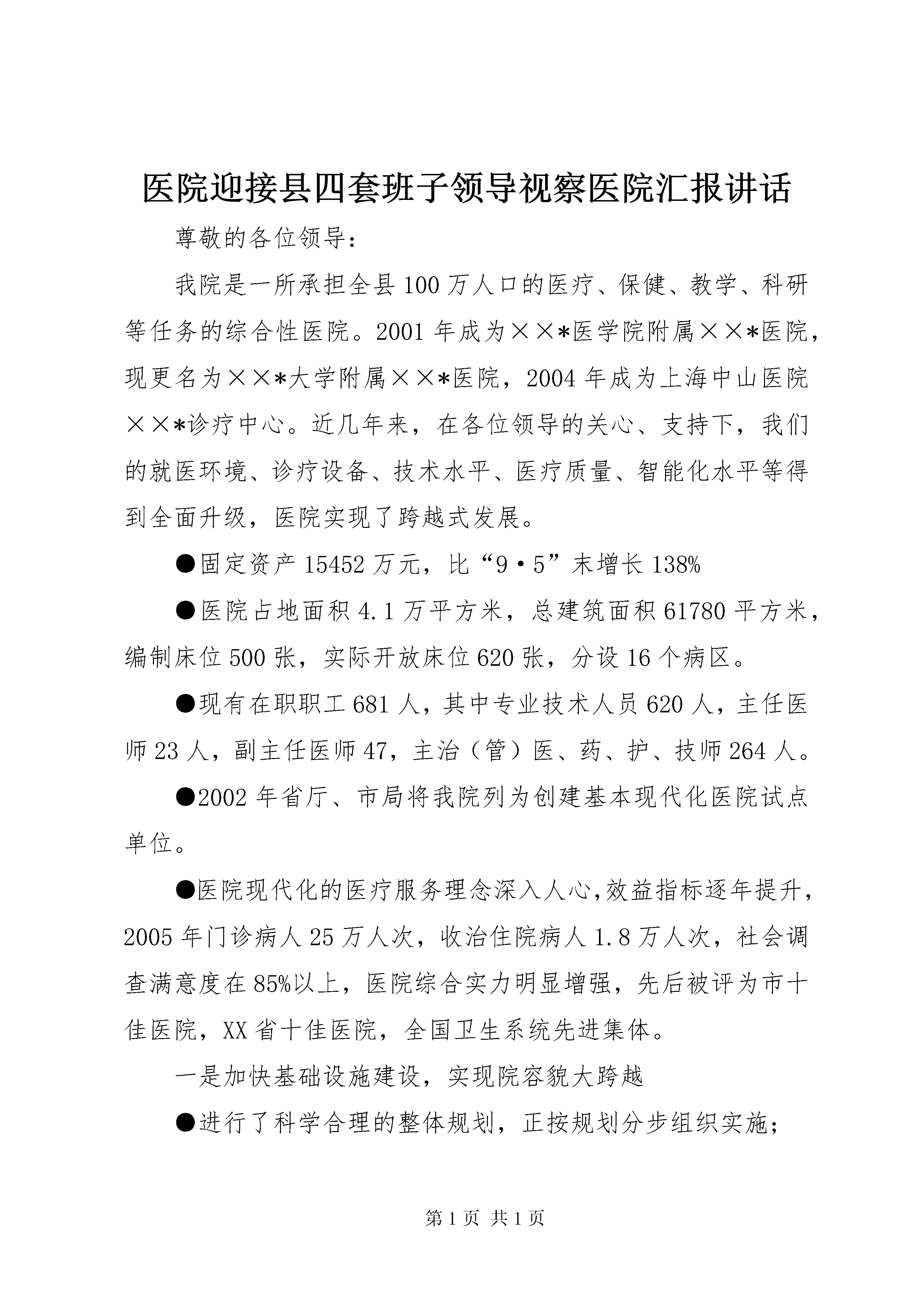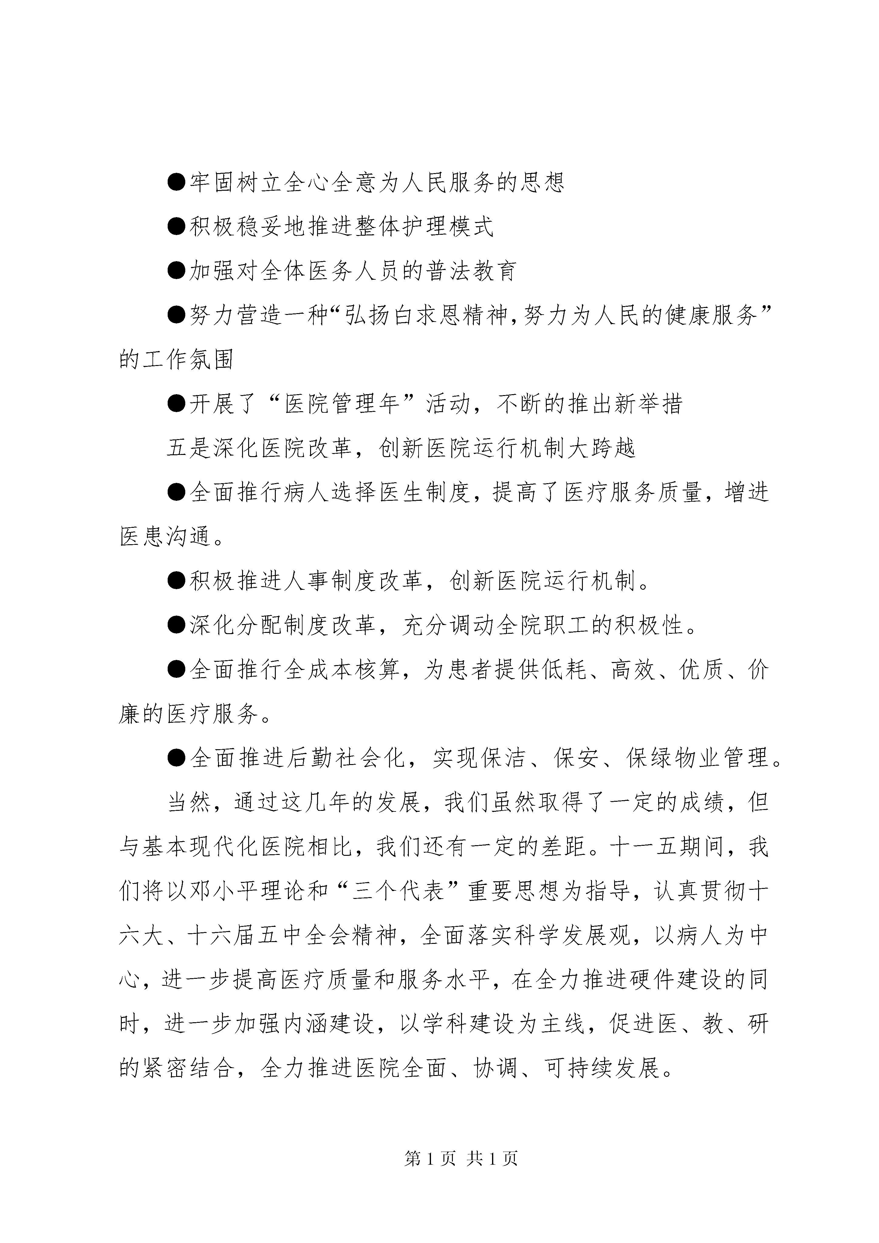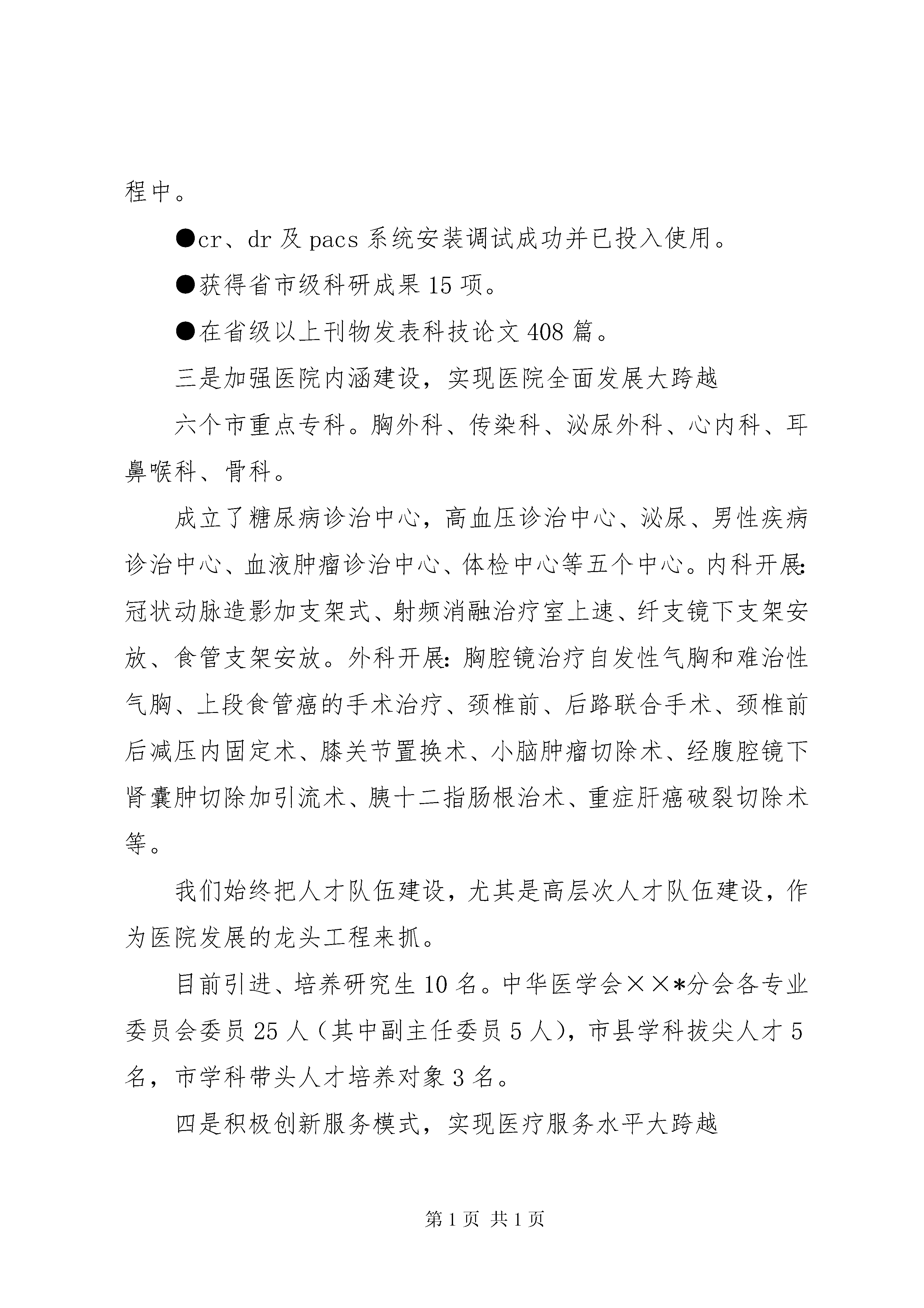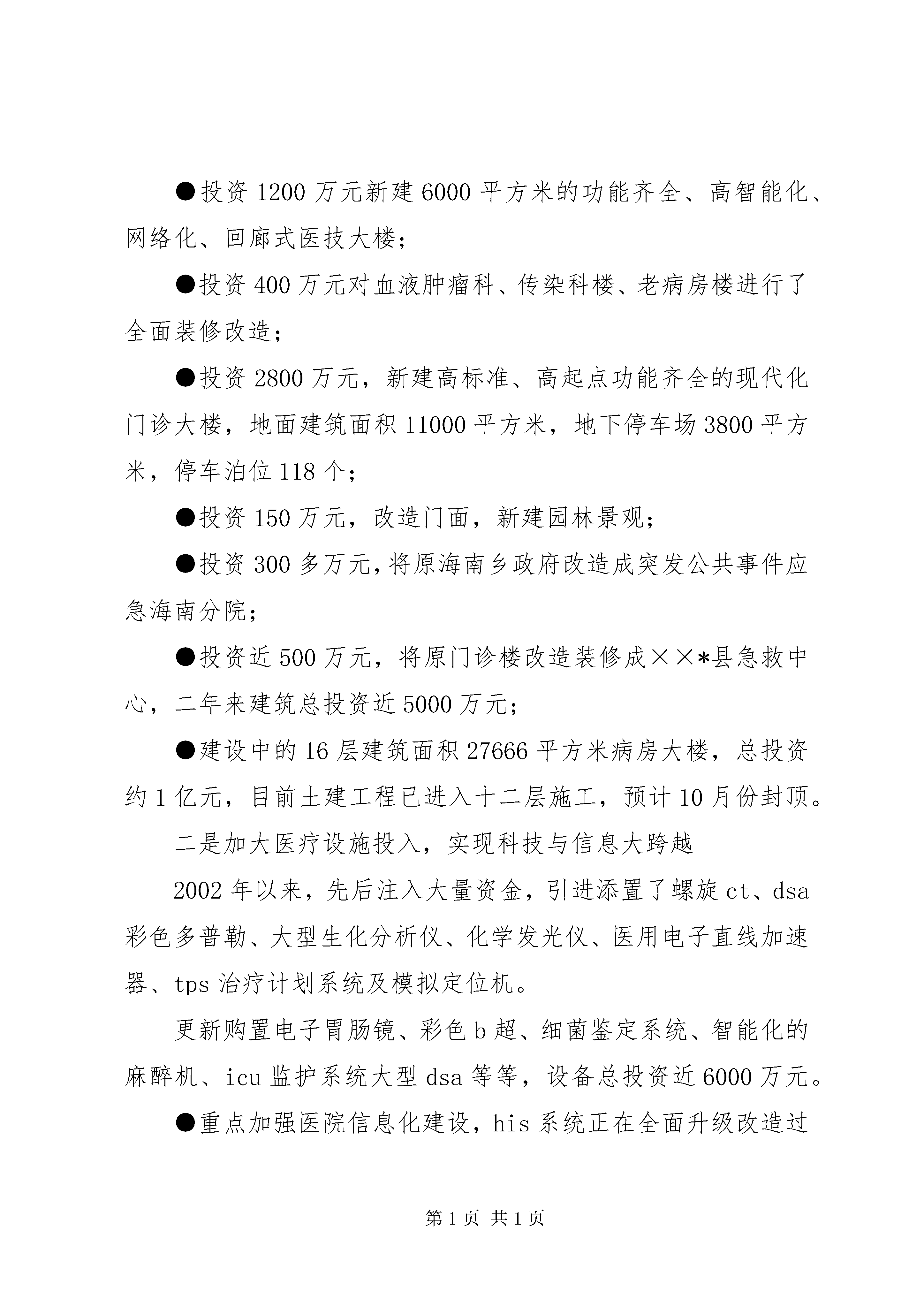 医院迎接县四套班子领导视察医院汇报讲话尊敬的各位领导:我院是一所承担全县100万人口的医疗、保健、教学、科研等任务的综合性医院。2001年成为××*医学院附属××*医院,现更名为××*大学附属××*医院,2004年成为上海中山医院××*诊疗中心。近几年来,在各位领导的关心、支持下,我们的就医环境、诊疗设备、技术水平、医疗质量、智能化水平等得到全面升级,医院实现了跨越式发展。●固定资产15452万元,比“9·5”末增长138%●医院占地面积4.1万平方米,总建筑面积61780平方米,编制床位500张,实际开放床位620张,分设16个病区。●现有在职职工681人,其中专业技术人员620人,主任医师23人,副主任医师47,主治(管)医、药、护、技师264人。●2002年省厅、市局将我院列为创建基本现代化医院试点单位。●医院现代化的医疗服务理念深入人心,效益指标逐年提升,2005年门诊病人25万人次,收治住院病人1.8万人次,社会调查满意度在85%以上,医院综合实力明显增强,先后被评为市十佳医院,XX省十佳医院,全国卫生系统先进集体。一是加快基础设施建设,实现院容貌大跨越●进行了科学合理的整体规划,正按规划分步组织实施;●投资1200万元新建6000平方米的功能齐全、高智能化、网络化、回廊式医技大楼;●投资400万元对血液肿瘤科、传染科楼、老病房楼进行了全面装修改造;●投资2800万元,新建高标准、高起点功能齐全的现代化门诊大楼,地面建筑面积11000平方米,地下停车场3800平方米,停车泊位118个;●投资150万元,改造门面,新建园林景观;●投资300多万元,将原海南乡政府改造成突发公共事件应急海南分院;●投资近500万元,将原门诊楼改造装修成××*县急救中心,二年来建筑总投资近5000万元;●建设中的16层建筑面积27666平方米病房大楼,总投资约1亿元,目前土建工程已进入十二层施工,预计10月份封顶。二是加大医疗设施投入,实现科技与信息大跨越2002年以来,先后注入大量资金,引进添置了螺旋ct、dsa彩色多普勒、大型生化分析仪、化学发光仪、医用电子直线加速器、tps治疗计划系统及模拟定位机。更新购置电子胃肠镜、彩色b超、细菌鉴定系统、智能化的麻醉机、icu监护系统大型dsa等等,设备总投资近6000万元。●重点加强医院信息化建设,his系统正在全面升级改造过程中。●cr、dr及pacs系统安装调试成功并已投入使用。●获得省市级科研成果15项。●在省级以上刊物发表科技论文408篇。三是加强医院内涵建设,实现医院全面发展大跨越六个市重点专科。胸外科、传染科、泌尿外科、心内科、耳鼻喉科、骨科。成立了糖尿病诊治中心,高血压诊治中心、泌尿、男性疾病诊治中心、血液肿瘤诊治中心、体检中心等五个中心。内科开展:冠状动脉造影加支架式、射频消融治疗室上速、纤支镜下支架安放、食管支架安放。外科开展:胸腔镜治疗自发性气胸和难治性气胸、上段食管癌的手术治疗、颈椎前、后路联合手术、颈椎前后减压内固定术、膝关节置换术、小脑肿瘤切除术、经腹腔镜下肾囊肿切除加引流术、胰十二指肠根治术、重症肝癌破裂切除术等。我们始终把人才队伍建设,尤其是高层次人才队伍建设,作为医院发展的龙头工程来抓。目前引进、培养研究生10名。中华医学会××*分会各专业委员会委员25人(其中副主任委员5人),市县学科拔尖人才5名,市学科带头人才培养对象3名。四是积极创新服务模式,实现医疗服务水平大跨越●牢固树立全心全意为人民服务的思想●积极稳妥地推进整体护理模式●加强对全体医务人员的普法教育●努力营造一种“弘扬白求恩精神,努力为人民的健康服务”的工作氛围●开展了“医院管理年”活动,不断的推出新举措五是深化医院改革,创新医院运行机制大跨越●全面推行病人选择医生制度,提高了医疗服务质量,增进医患沟通。●积极推进人事制度改革,创新医院运行机制。●深化分配制度改革,充分调动全院职工的积极性。●全面推行全成本核算,为患者提供低耗、高效、优质、价廉的医疗服务。●全面推进后勤社会化,实现保洁、保安、保绿物业管理。当然,通过这几年的发展,我们虽然取得了一定的成绩,但与基本现代化医院相比,我们还有一定的差距。十一五期间,我们将以邓小平理论和“三个代表”重要思想为指导,认真贯彻十六大、十六届五中全会精神,全面落实科学发展观,以病人为中心,进一步提高医疗质量和服务水平,在全力推进硬件建设的同时,进一步加强内涵建设,以学科建设为主线,促进医、教、研的紧密结合,全力推进医院全面、协调、可持续发展。●坚持以病人为中心,全面提升服务水平●强化医疗质量安全,建立风险防范机制●加大科研投入,提高竞争实力●推进教学改革,培育后备人才●以学科建设为龙头,带动人才梯队建设●做好增收节支工作,为发展打好经济基