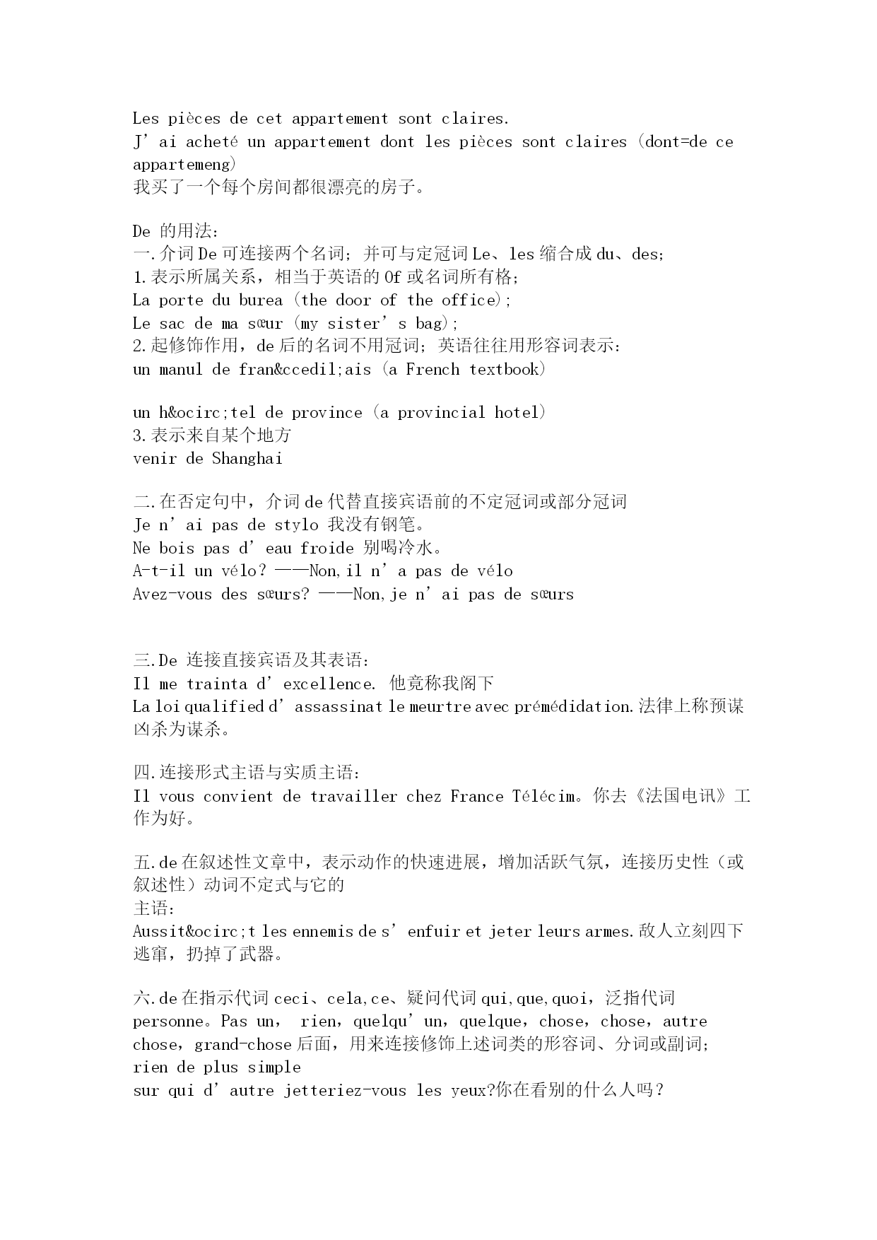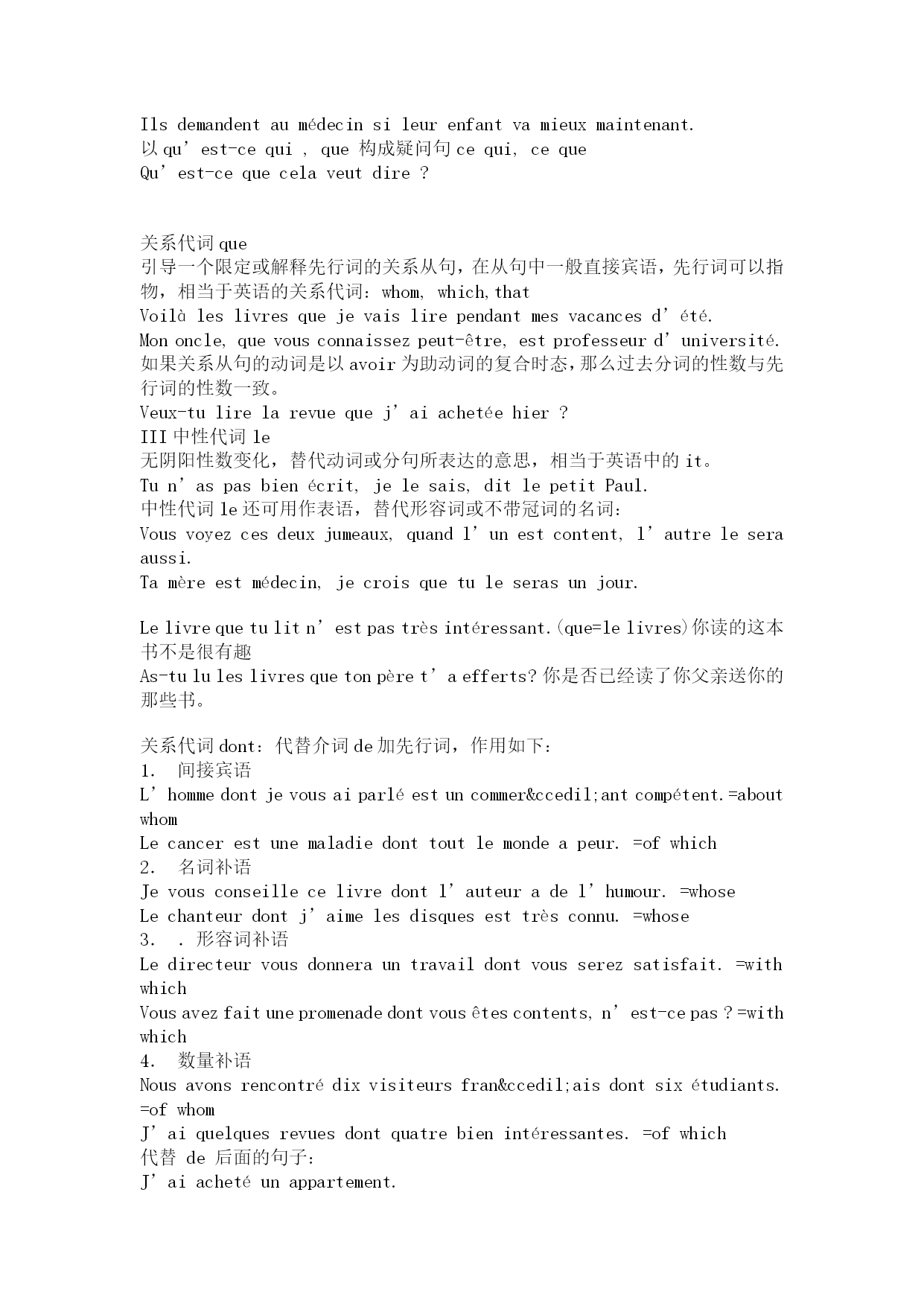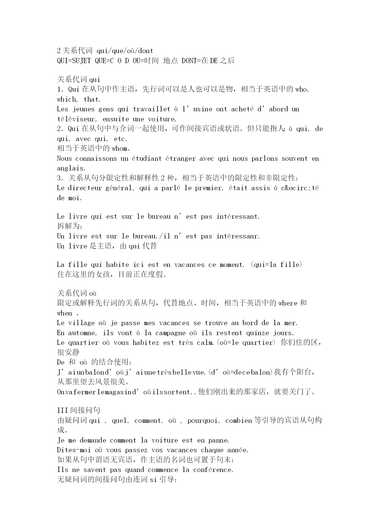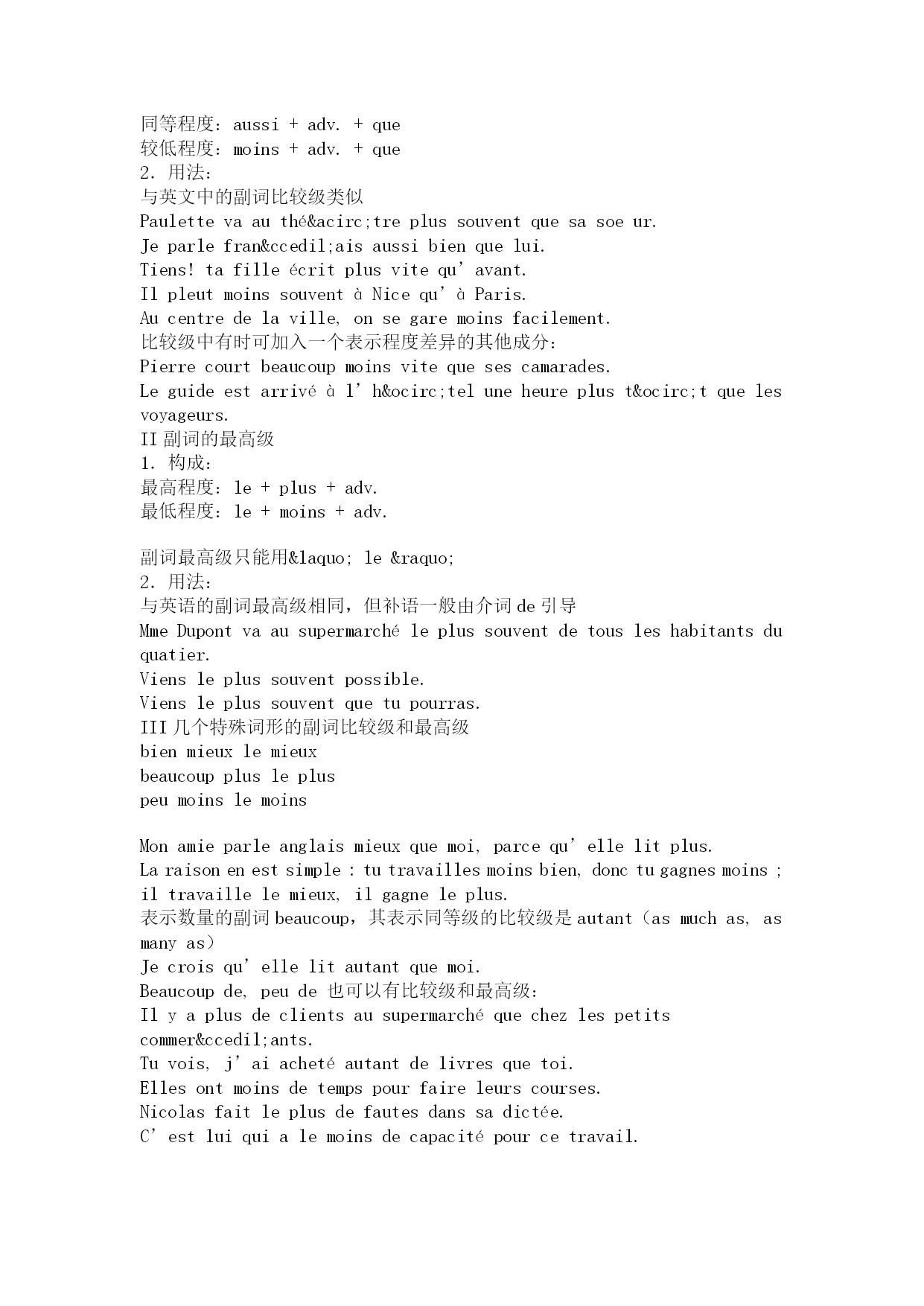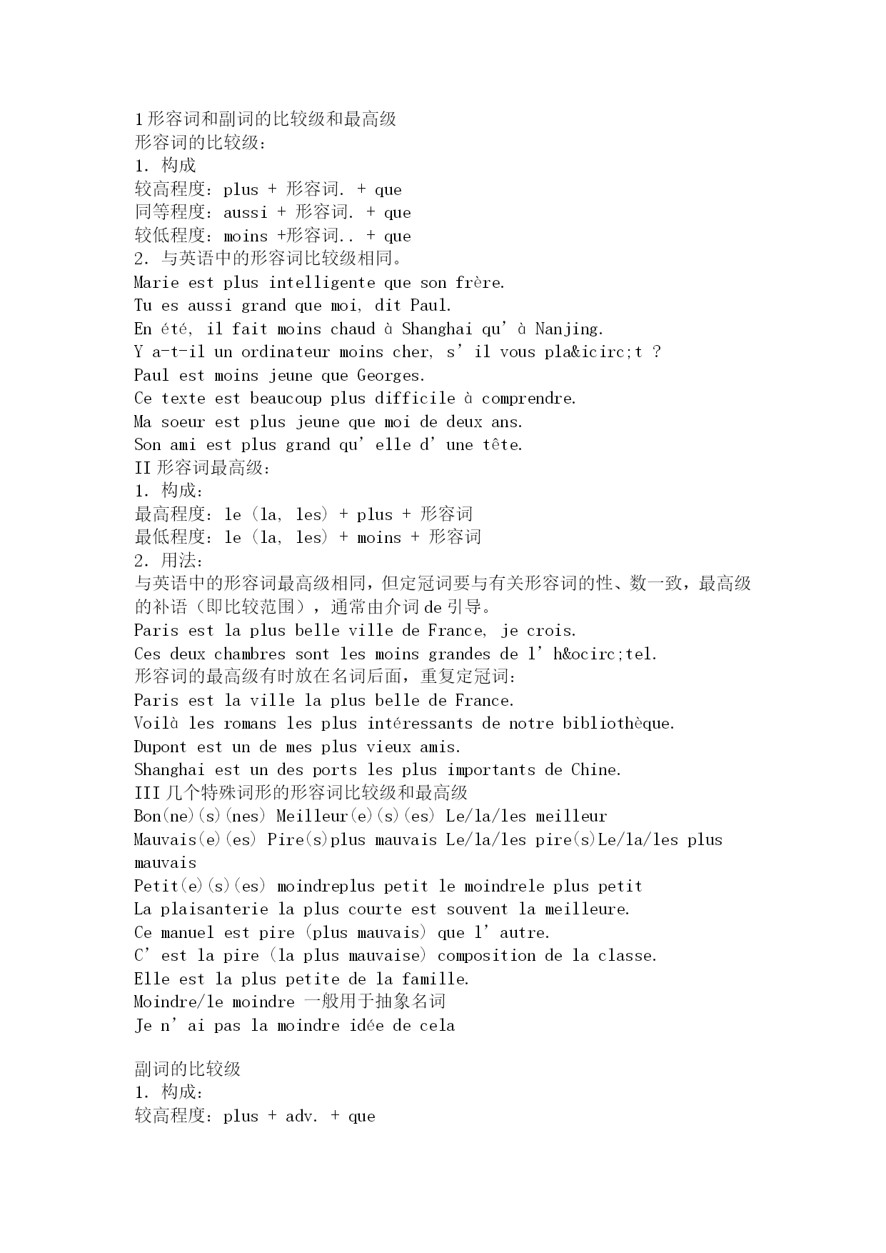 1形容词和副词的比较级和最高级形容词的比较级:1.构成较高程度:plus+形容词.+que同等程度:aussi+形容词.+que较低程度:moins+形容词..+que2.与英语中的形容词比较级相同。Marieestplusintelligentequesonfrère.Tuesaussigrandquemoi,ditPaul.Enété,ilfaitmoinschaudàShanghaiqu’àNanjing.Ya-t-ilunordinateurmoinscher,s’ilvousplaît?PaulestmoinsjeunequeGeorges.Cetexteestbeaucoupplusdifficileàcomprendre.Masoeurestplusjeunequemoidedeuxans.Sonamiestplusgrandqu’elled’unetête.II形容词最高级:1.构成:最高程度:le(la,les)+plus+形容词最低程度:le(la,les)+moins+形容词2.用法:与英语中的形容词最高级相同,但定冠词要与有关形容词的性、数一致,最高级的补语(即比较范围),通常由介词de引导。ParisestlaplusbellevilledeFrance,jecrois.Cesdeuxchambressontlesmoinsgrandesdel’hôtel.形容词的最高级有时放在名词后面,重复定冠词:ParisestlavillelaplusbelledeFrance.Voilàlesromanslesplusintéressantsdenotrebibliothèque.Dupontestundemesplusvieuxamis.ShanghaiestundesportslesplusimportantsdeChine.III几个特殊词形的形容词比较级和最高级Bon(ne)(s)(nes)Meilleur(e)(s)(es)Le/la/lesmeilleurMauvais(e)(es)Pire(s)plusmauvaisLe/la/lespire(s)Le/la/lesplusmauvaisPetit(e)(s)(es)moindrepluspetitlemoindrelepluspetitLaplaisanterielapluscourteestsouventlameilleure.Cemanuelestpire(plusmauvais)quel’autre.C’estlapire(laplusmauvaise)compositiondelaclasse.Elleestlapluspetitedelafamille.Moindre/lemoindre一般用于抽象名词Jen’aipaslamoindreidéedecela 副词的比较级1.构成:较高程度:plus+adv.+que同等程度:aussi+adv.+que较低程度:moins+adv.+que2.用法:与英文中的副词比较级类似Paulettevaauthéâtreplussouventquesasoeur.Jeparlefrançaisaussibienquelui.Tiens!tafilleécritplusvitequ’avant.IlpleutmoinssouventàNicequ’àParis.Aucentredelaville,onsegaremoinsfacilement.比较级中有时可加入一个表示程度差异的其他成分:Pierrecourtbeaucoupmoinsvitequesescamarades.Leguideestarrivéàl’hôteluneheureplustôtquelesvoyageurs.II副词的最高级1.构成:最高程度:le+plus+adv.最低程度:le+moins+adv. 副词最高级只能用«le»2.用法:与英语的副词最高级相同,但补语一般由介词de引导MmeDupontvaausupermarchéleplussouventdetousleshabitantsduquatier.Viensleplussouventpossible.Viensleplussouventquetupourras.III几个特殊词形的副词比较级和最高级bienmieuxlemieuxbeaucouppluslepluspeumoinslemoins Monamieparleanglaismieuxquemoi,parcequ’ellelitplus.Laraisonenestsimple:tutravailles