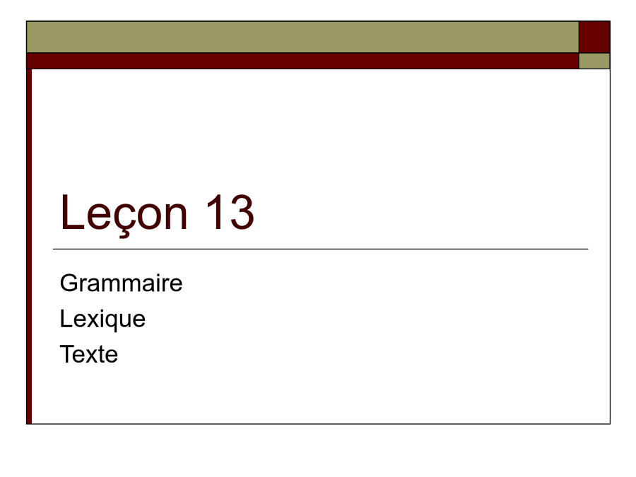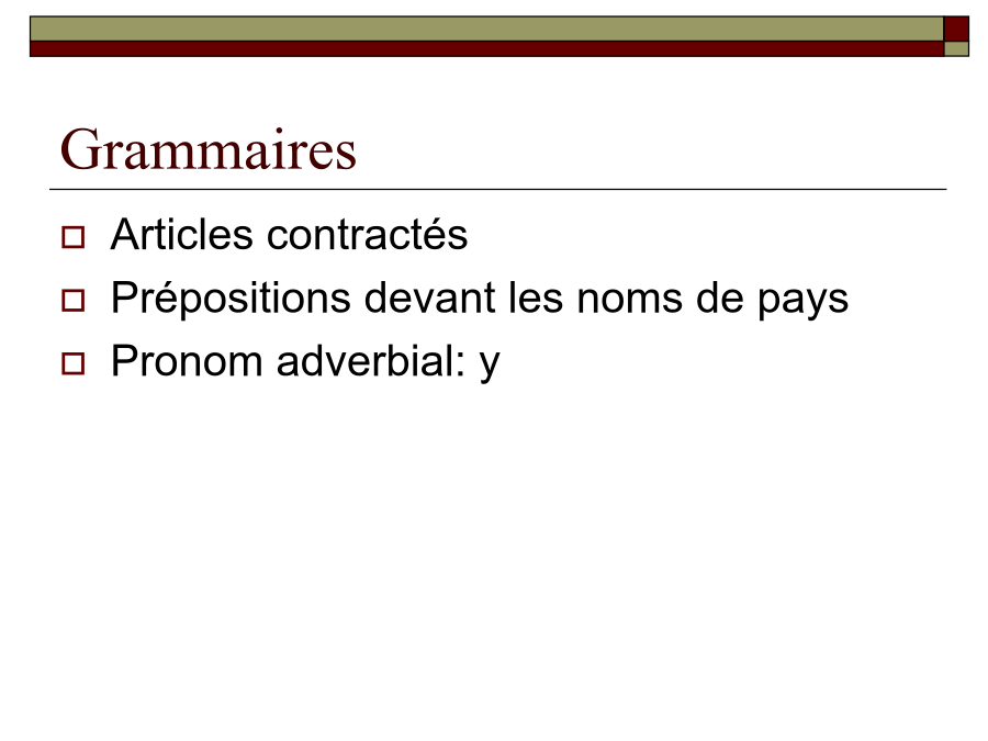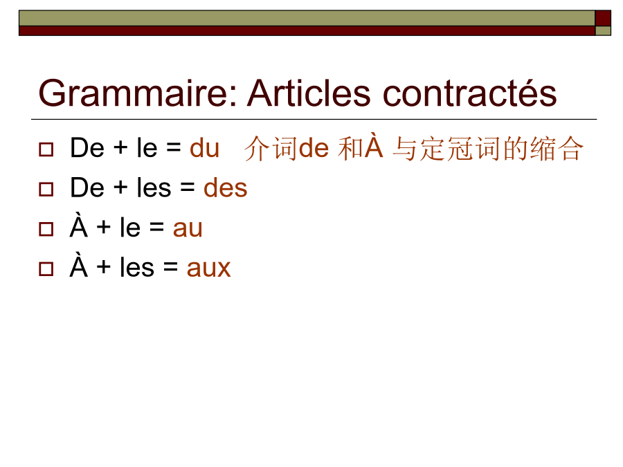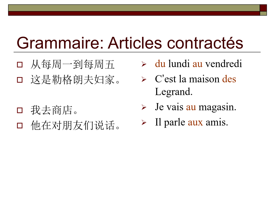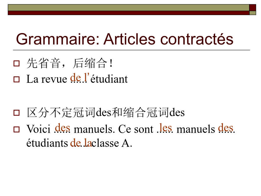 Leçon13GrammairesGrammaire:ArticlescontractésGrammaire:Articlescontractés先省音,后缩合! Larevue......étudiantGrammaire:prépositionsdevantlesnomsdepaysÀ代替除介词de以外的介词(尤其以à,dans,sur最为常见)加地点,在句中地点状语 放在相关动词前Tuhabitesau3eétage? Oui,j’yhabite. Pierreestdanslaclasse? Non,iln’yestpas. TuveuxalleràParis? Oui,jeveuxyaller. Non,jeneveuxpasyaller肯定命令式中,放在相关动词命令式之后,用连字符连接,第一组动词和aller第二人称单数的命令式保留s Oùvas-tu? Jevaisàl’école. Bon,vas-y! N’yvapas! Grammaire:pronomadverbial:yIllit(unlivre). Qu’est-cequetulis? Jelisdesjournaux. Lirelarevue Lirelespetitesannonces Lireunroman 租:louerqch. Illoueunepetitechambreprèsdesonécole. Maintenantlesétrangersaimentbeaucouplouerunevoiturepourvoyager. 出租:louerqch.àqn.(有间接宾语) Illouecetappartementauxétudiantsàpetitprix. Ilneveutpaslouercettechambreauxautres. 相关词汇: leloyer(租金);locataire(租户);propriétaire(出租人)v.i Iltéléphone. v.t.ind.téléphoneràqn.(有间接宾语) Iltéléphoneàsesamis. 相关词汇: letéléphone(电话) Aujourd’huionnepeutpasvivresanstéléphone.(今天人们没有电话没办法生活。)v.i Maintenantonaimebeaucoupvoyager. Ilveutvoyagerenvoiture. 相关词汇: levoyage IlparledesonvoyageenFrance. Bonvoyage!Combiende+名词(无冠词)多少个 Ilyacombiendepommes? Combiend’étudiantsya-t-ildansvotreclasse? Êtredecombien多少钱 Cespommessontdecombien?这些苹果多少钱? Leprixestdecombien?价格是多少? Êtrecombien多少人(主语为复数) Vousêtescombien?你们是多少人? Combiensont-ilsdansleurfamille?他们家有多少人?Pouvez-vousfairecetexercice? Oui,d’accord. Êtred’accord(avecqn.) Jesuisd’accord. Iln’estpasd’accordavecmoi.做疑问副词,提问时间,“什么时候” Quandest-cequ’ilvient? Tufaistesdevoirsquand? 做连词,引导一个和主句同时进行的时间状语从句,“当......的时候” Quandjelis,ilfaitsesdevoirs. Quandleprofesseurn’estpaslà,lesétudiantsnetravaillentpas.Prépositionsutiliséesaveclesmoyensdetransports:voyager/alleràPrépositionsutiliséesaveclesmoyensdetransports:voyager/allerenPrépositionsutiliséesaveclesmoyensdetransports:voyager/allerenPrépositionsutiliséesaveclesmoyensdetransports:voyager/alleren