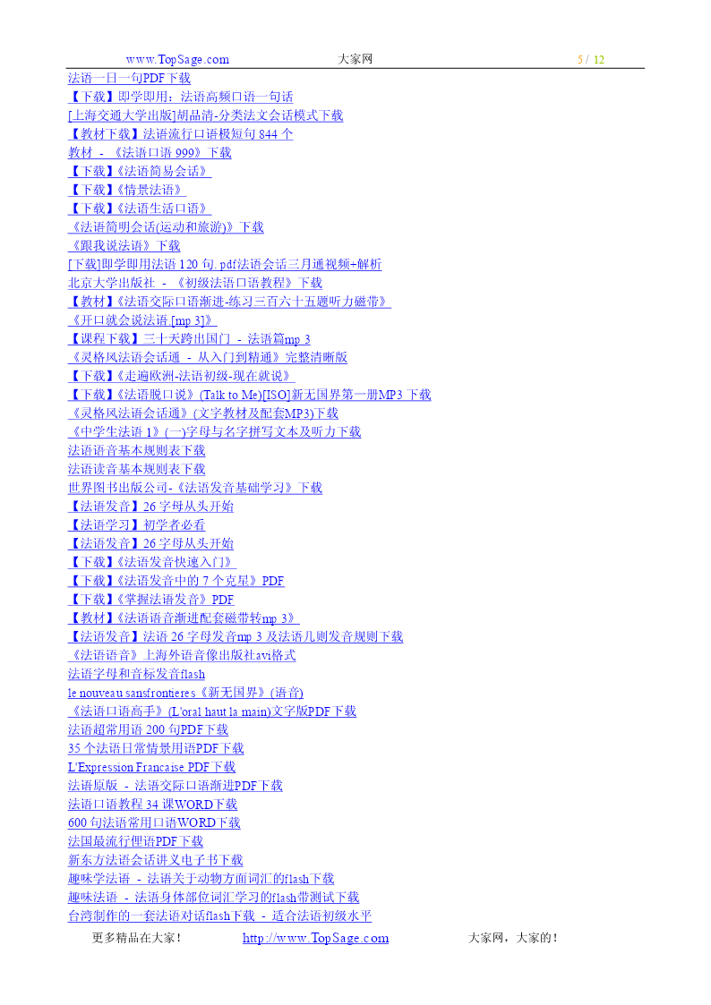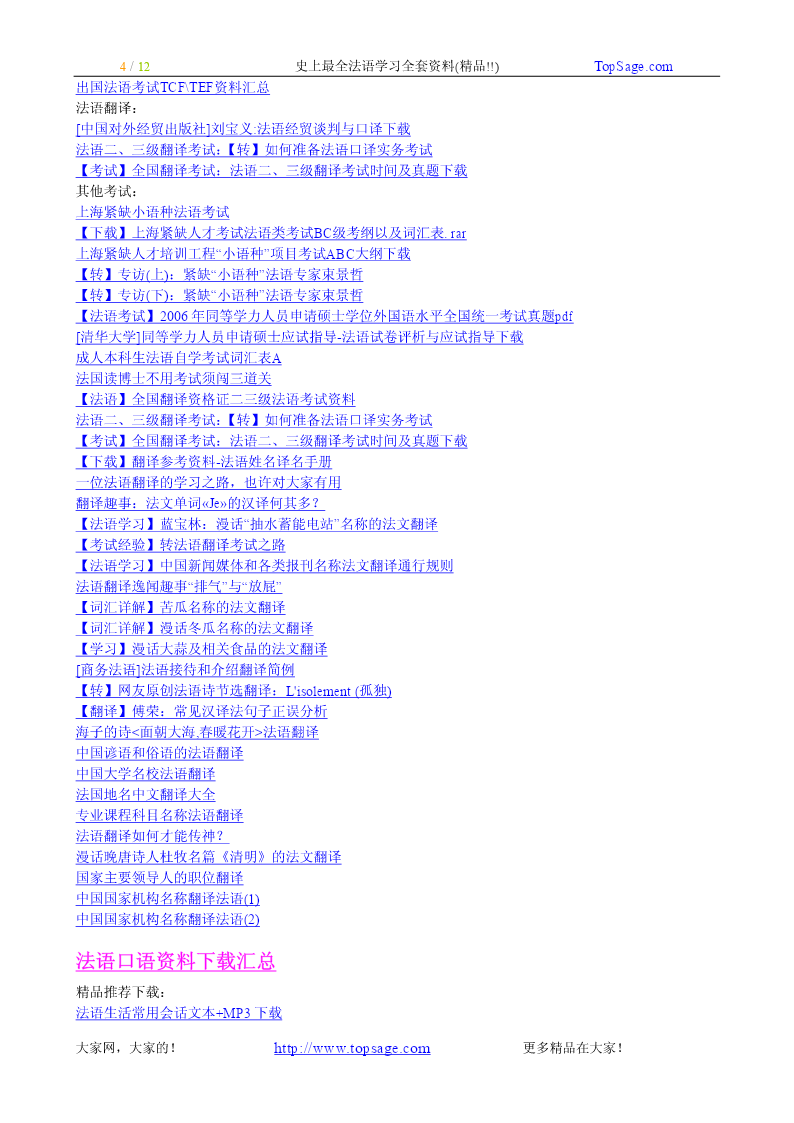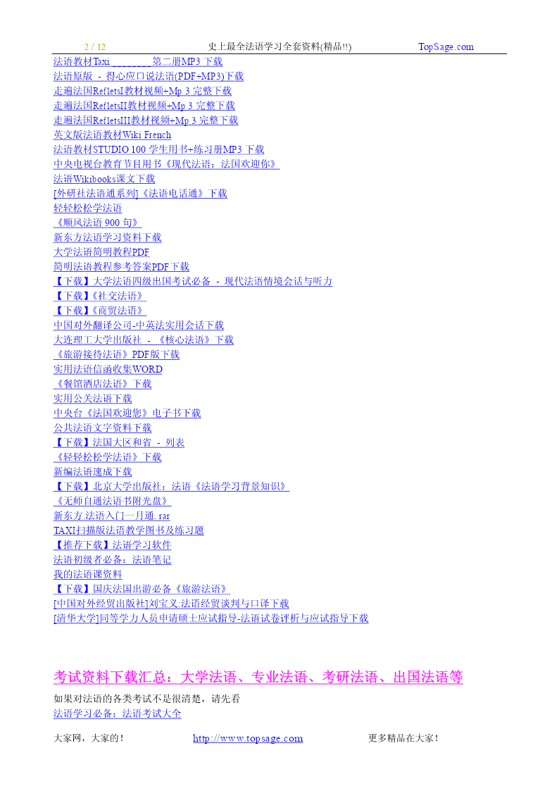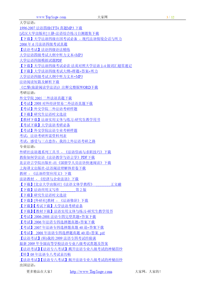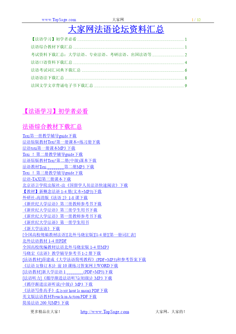 www.TopSage.com大家网1/12 大家网法语论坛资料汇总 【法语学习】初学者必看......................................................................................................1 法语综合教材下载汇总..........................................................................................................1 考试资料下载汇总:大学法语、专业法语、考研法语、出国法语等...............................2 法语口语资料下载汇总..........................................................................................................4 法语考试词汇词典下载汇总..................................................................................................6 法语语法下载汇总..................................................................................................................8 法国文学文章背诵电子书下载汇总......................................................................................9 【法语学习】初学者必看 法语综合教材下载汇总 Taxi第一册教学辅导guide下载 法语原版教材Taxi!第一册课本+练习册下载 i法语tax第一册课本MP3下载 Taxi!第二册教学辅导guide下载 法语原版教材Taxi!第二册(中级)课本下载 法语教材Taxi________第二册MP3下载 Taxi!第三册教学辅导guide下载 法语-TAXI第三册课本下载 北京语言学院出版社-出《国留学人员法语快速阅读》下载 【教材】新概念法语1-4册(文本+MP3)下载 外研社-高清版《法语2》1-8课下载 《新世纪大学法语》第三册教师参考书下载 《新世纪大学法语》第三册学生用书下载 《新世纪大学法语》第一册教师参考书下载 《新世纪大学法语》第一册学生用书 《新大学法语》下载 [全国高校统编教材法语][北外马晓宏版][1-4册][第一册词汇表] 北外法语教材1-4册PDF 全国高校统编教材法语北外马晓宏版1-4册MP3 马晓宏《法语》教学辅导参考书1-2册下载 [法语教材]薛建成《大学法语简明教程》(PDF+MP3)和参考答案下载 《法语1(修订本)》前10课练习答案网上WORD下载 [法语教材]新大学法语1________(PDF+MP3)下载 [法语听力]《循序渐进法语听写(初级)》MP3下载 《循序渐进法语听说(中级)》MP3下载 《法语写作高手》(L'écrithautlamain)PDF下载 英文版法语教材FrenchinActionPDF下载 简易法语200句MP3下载 更多精品在大家!http://www.TopSage.com大家网,大家的! 2/12史上最全法语学习全套资料(精品!!)TopSage.com 法语教材Taxi________第二册MP3下载 法语原版-得心应口说法语(PDF+MP3)下载 走遍法国RefletsI教材视频+Mp3完整下载 走遍法国RefletsII教材视频+Mp3完整下载 走遍法国RefletsIII教材视频+Mp3完整下载 英文版法语教材WikiFrench 法语教材STUDIO100学生用书+练习册MP3下载 中央电视台教育节目用书《现代法语:法国欢迎你》 法语Wikibooks课文下载 [外研社法语通系列]《法语电话通》下载 轻轻松松学法语 《顺风法语900句》 新东方法语学习资料下载 大学法语简明教程PDF 简明法语教程参考答案PDF下载 【下载】大学法语四级出国考试必备-现代法语情境会话与听力 【下载】《社交法语》 【下载】《商贸法语》 中国对外翻译公司-中英法实用会话下载 大连理工大学出版社-《核心法语》下载 《旅游接待法语》PDF版下载 实用法语信函收集WORD 《餐馆酒店法语》下载 实用公关法语下载 中央台《法国欢迎您》电子书下载 公共法语文字资料下载 【下载】法国大区和省-列表 《轻轻松松学法语》下载 新编