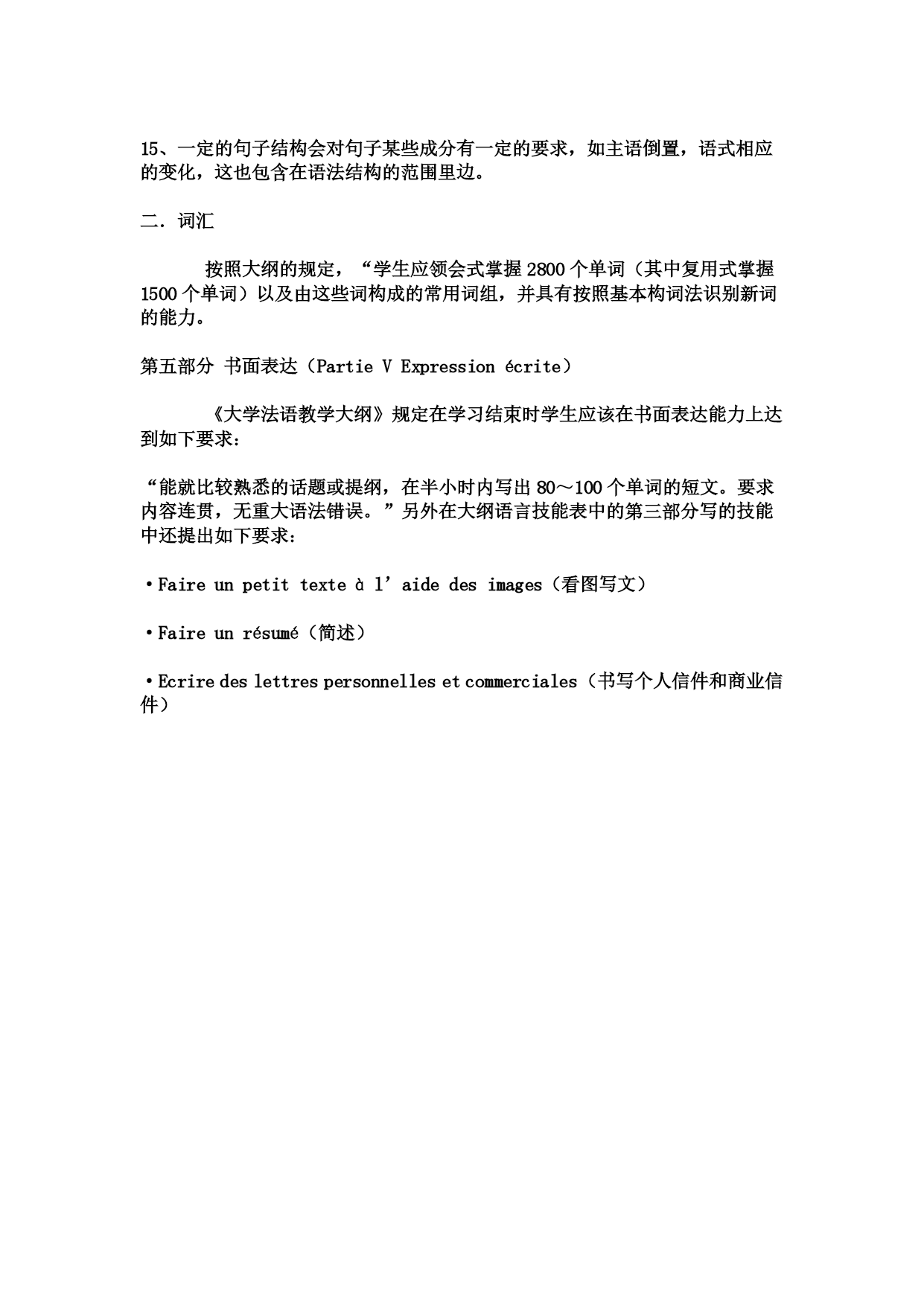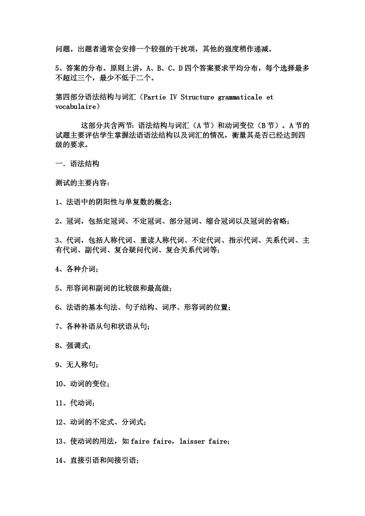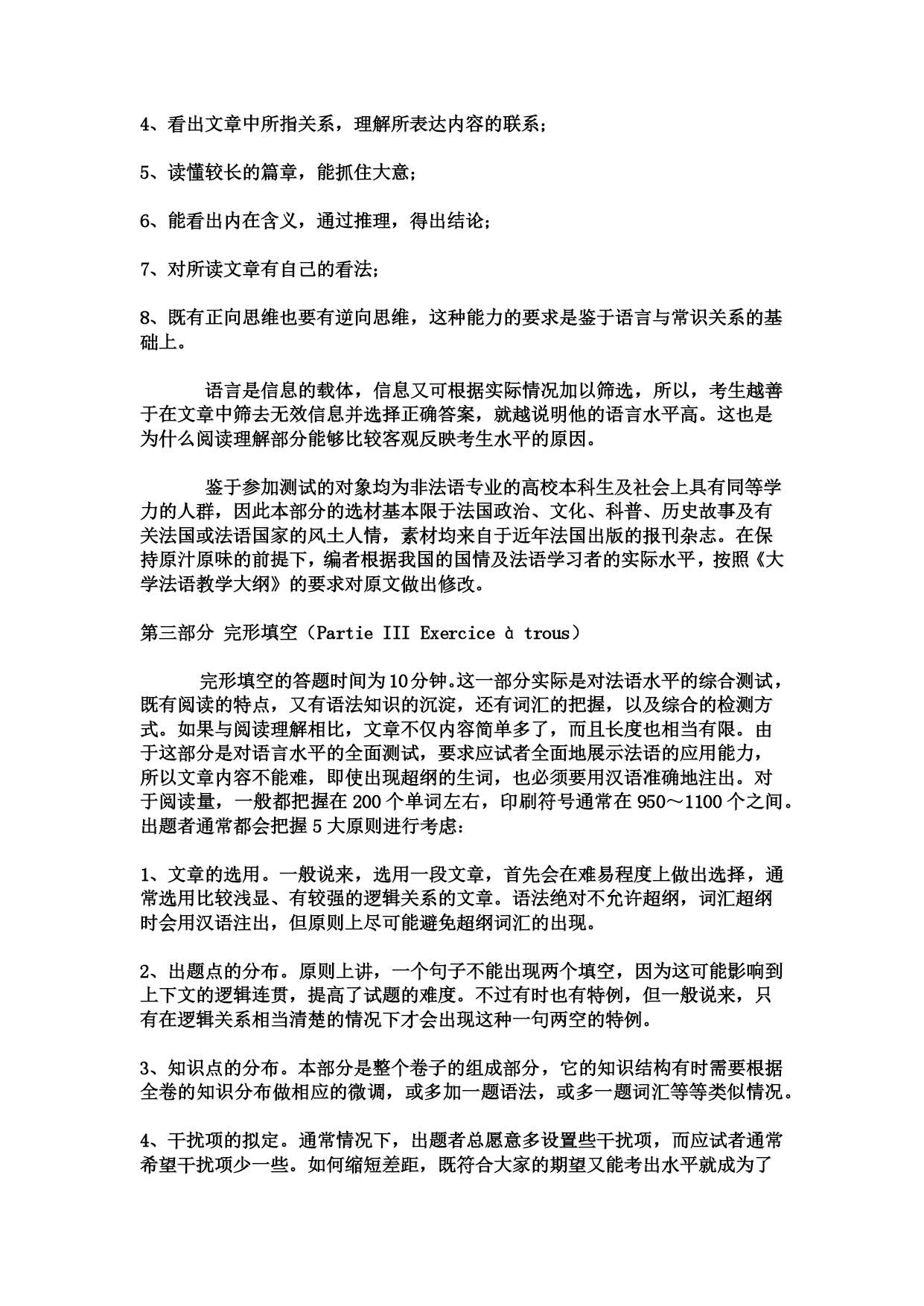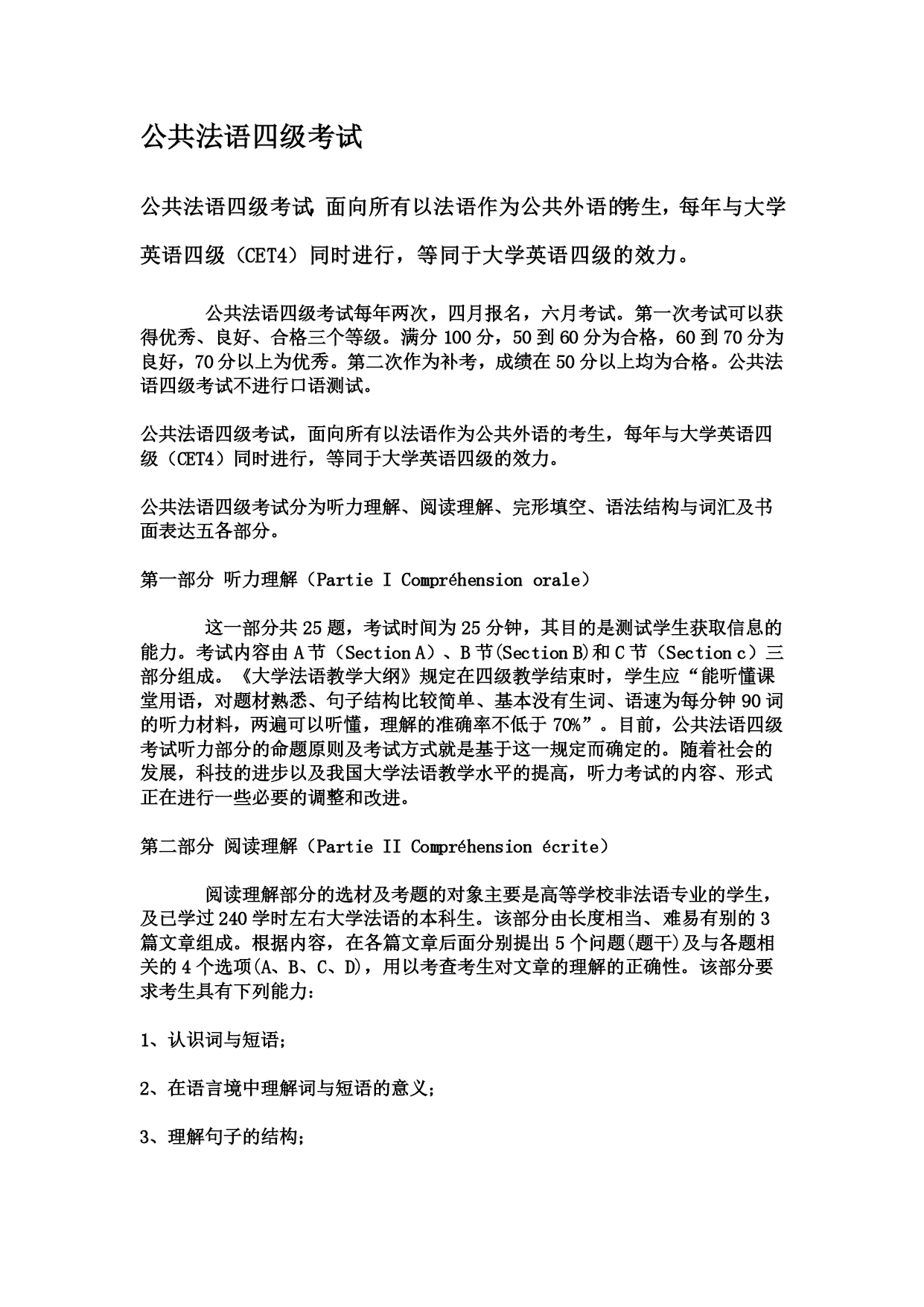 公共法语四级考试 公共法语四级考试,面向所有以法语作为公共外语的考生,每年与大学英语四级(CET4)同时进行,等同于大学英语四级的效力。 公共法语四级考试每年两次,四月报名,六月考试。第一次考试可以获得优秀、良好、合格三个等级。满分100分,50到60分为合格,60到70分为良好,70分以上为优秀。第二次作为补考,成绩在50分以上均为合格。公共法语四级考试不进行口语测试。公共法语四级考试,面向所有以法语作为公共外语的考生,每年与大学英语四级(CET4)同时进行,等同于大学英语四级的效力。公共法语四级考试分为听力理解、阅读理解、完形填空、语法结构与词汇及书面表达五各部分。第一部分听力理解(PartieICompréhensionorale)这一部分共25题,考试时间为25分钟,其目的是测试学生获取信息的能力。考试内容由A节(SectionA)、B节(SectionB)和C节(Sectionc)三部分组成。《大学法语教学大纲》规定在四级教学结束时,学生应“能听懂课堂用语,对题材熟悉、句子结构比较简单、基本没有生词、语速为每分钟90词的听力材料,两遍可以听懂,理解的准确率不低于70%”。目前,公共法语四级考试听力部分的命题原则及考试方式就是基于这一规定而确定的。随着社会的发展,科技的进步以及我国大学法语教学水平的提高,听力考试的内容、形式正在进行一些必要的调整和改进。第二部分阅读理解(PartieIICompréhensionécrite)阅读理解部分的选材及考题的对象主要是高等学校非法语专业的学生,及已学过240学时左右大学法语的本科生。该部分由长度相当、难易有别的3篇文章组成。根据内容,在各篇文章后面分别提出5个问题(题干)及与各题相关的4个选项(A、B、C、D),用以考查考生对文章的理解的正确性。该部分要求考生具有下列能力:1、认识词与短语;2、在语言境中理解词与短语的意义;3、理解句子的结构;4、看出文章中所指关系,理解所表达内容的联系;5、读懂较长的篇章,能抓住大意;6、能看出内在含义,通过推理,得出结论;7、对所读文章有自己的看法;8、既有正向思维也要有逆向思维,这种能力的要求是鉴于语言与常识关系的基础上。语言是信息的载体,信息又可根据实际情况加以筛选,所以,考生越善于在文章中筛去无效信息并选择正确答案,就越说明他的语言水平高。这也是为什么阅读理解部分能够比较客观反映考生水平的原因。鉴于参加测试的对象均为非法语专业的高校本科生及社会上具有同等学力的人群,因此本部分的选材基本限于法国政治、文化、科普、历史故事及有关法国或法语国家的风土人情,素材均来自于近年法国出版的报刊杂志。在保持原汁原味的前提下,编者根据我国的国情及法语学习者的实际水平,按照《大学法语教学大纲》的要求对原文做出修改。第三部分完形填空(PartieIIIExerciceàtrous)完形填空的答题时间为10分钟。这一部分实际是对法语水平的综合测试,既有阅读的特点,又有语法知识的沉淀,还有词汇的把握,以及综合的检测方式。如果与阅读理解相比,文章不仅内容简单多了,而且长度也相当有限。由于这部分是对语言水平的全面测试,要求应试者全面地展示法语的应用能力,所以文章内容不能难,即使出现超纲的生词,也必须要用汉语准确地注出。对于阅读量,一般都把握在200个单词左右,印刷符号通常在950~1100个之间。出题者通常都会把握5大原则进行考虑:1、文章的选用。一般说来,选用一段文章,首先会在难易程度上做出选择,通常选用比较浅显、有较强的逻辑关系的文章。语法绝对不允许超纲,词汇超纲时会用汉语注出,但原则上尽可能避免超纲词汇的出现。2、出题点的分布。原则上讲,一个句子不能出现两个填空,因为这可能影响到上下文的逻辑连贯,提高了试题的难度。不过有时也有特例,但一般说来,只有在逻辑关系相当清楚的情况下才会出现这种一句两空的特例。3、知识点的分布。本部分是整个卷子的组成部分,它的知识结构有时需要根据全卷的知识分布做相应的微调,或多加一题语法,或多一题词汇等等类似情况。4、干扰项的拟定。通常情况下,出题者总愿意多设置些干扰项,而应试者通常希望干扰项少一些。如何缩短差距,既符合大家的期望又能考出水平就成为了问题。出题者通常会安排一个较强的干扰项,其他的强度稍作递减。5、答案的分布。原则上讲,A、B、C、D四个答案要求平均分布,每个选择最多不超过三个,最少不低于二个。第四部分语法结构与词汇(PartieIVStructuregrammaticaleetvocabulaire)这部分共含两节:语法结构与词汇(A节)和动词变位(B节)。A节的试题主要评估学生掌握法语语法结构以及词汇的情况,衡量其是否已经达到四级的要求。一.语法结构测试的主要内容:1、法语中的阴阳性与单复数的概念;2、冠词,包括定