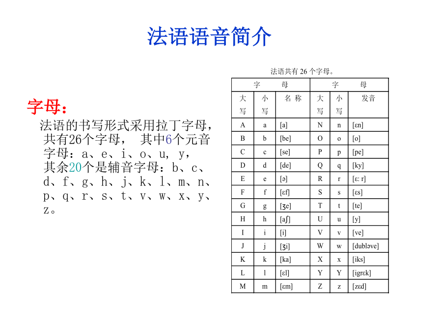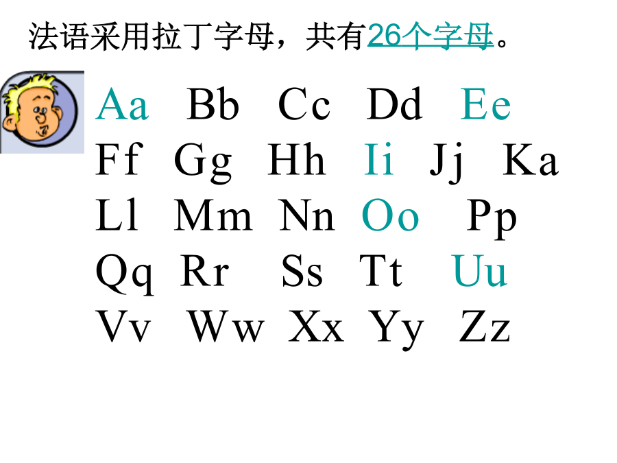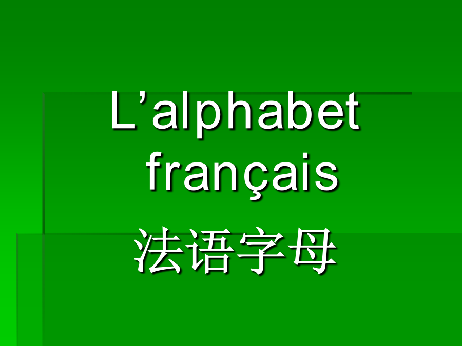 基础法语(一)leçon1Bonsoiràtous!L’alphabetfrançais 法语字母法语语音简介法语采用拉丁字母,共有26个字母。Lesaccents 法语中的音符letréma分音符ï,ë:naïf,noëll’accentcirconflexe长音符ô,â,î,ê,û注意: 这些符号与单词的词形以及字母在单词中的读音都有关系,而且关系到单词的词义,换句话说,这些符号是单词本身所固有的。 大写字母的音符可以省略。sons 音法语语音简介辅音是指发音时气流经过口腔受到其他发音器官阻碍的音素。其分为两类:发音时声带不振动的辅音称为清辅音,如[s]、[k]、[t];声带振动的称为浊辅音,如[z]、[d]。 法语的音素比较清楚、响亮和有力,因而在练习发音时,要求舌、唇、口腔的动作比较明显,肌肉紧张。 音节: 单词的发音由音节组成,一般来说,一个单词里有几个元音就有几个音节;辅音须与元音组合才构成音节。 法语共有36个音素。有16个元音(voyelles)。但元音[a]现在已不常用,逐步被[a]所代替。17个辅音(consonnes)。3个半元音(半辅音)semi-voyelles。sons元音(voyelles)元音[a]元音[ε]Parexemple: lit,nid,midi, naïf,maïs île, physique...辅音(consonnes)同英语[f]。字母f,字母组合ph发[f]。attention辅音[l]近似英语[l],但舌尖抵上齿龈。字母l发[l]。la,les,lait,lit半元音[w],但肌肉紧张,有摩擦音。Expressionsutilesstructuredephrase 句型C’estAnne.texteLeçonUn–Premièreleçon---Quiest-ce? ---C’estPascal. ---Est-cequec’estPascal? ---Oui,c’estPascal. ---Quiest-ce? ---C’estFanny. ---Est-cequec’estFanny? ---Oui,c’estFanny. Devoir作业