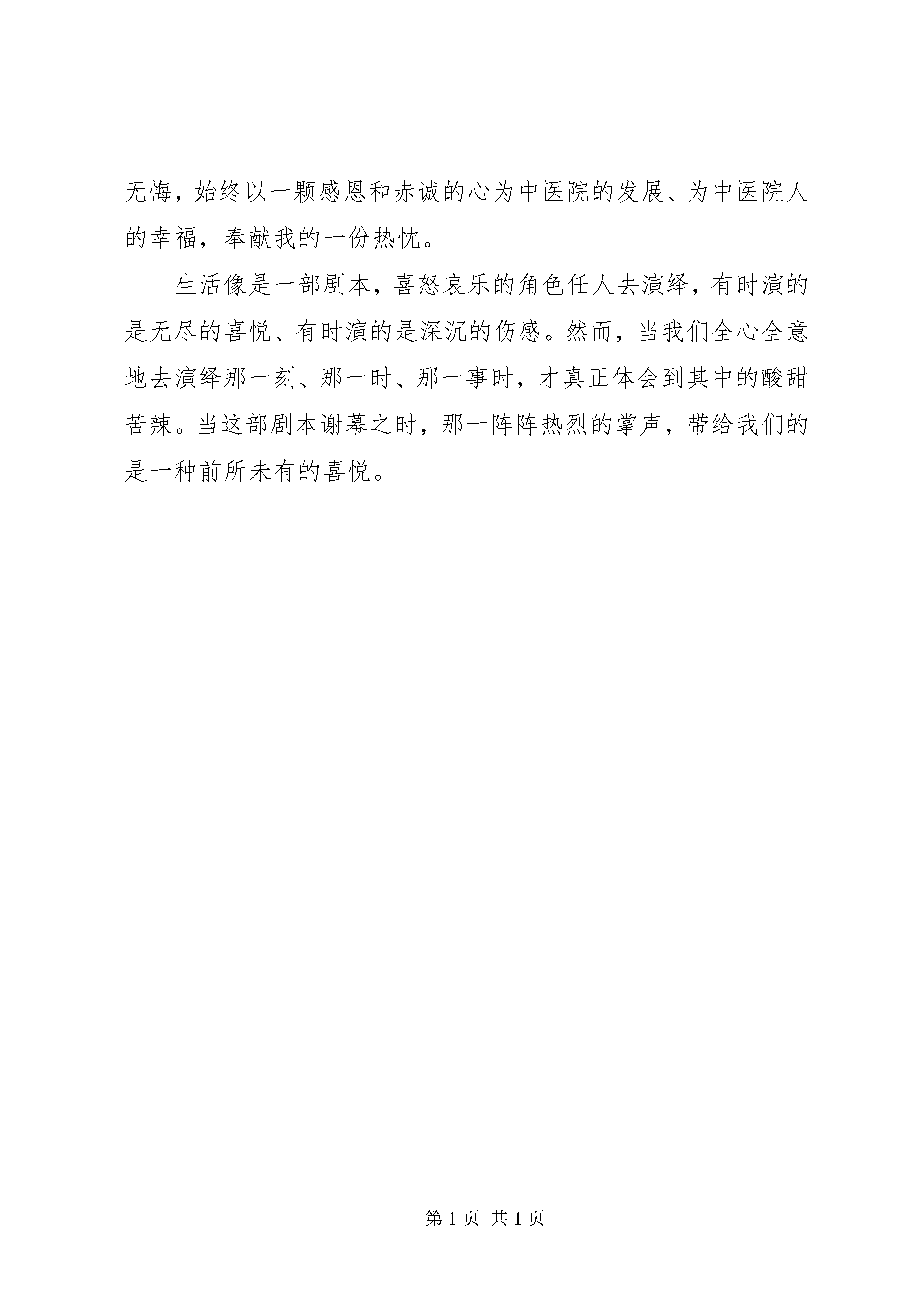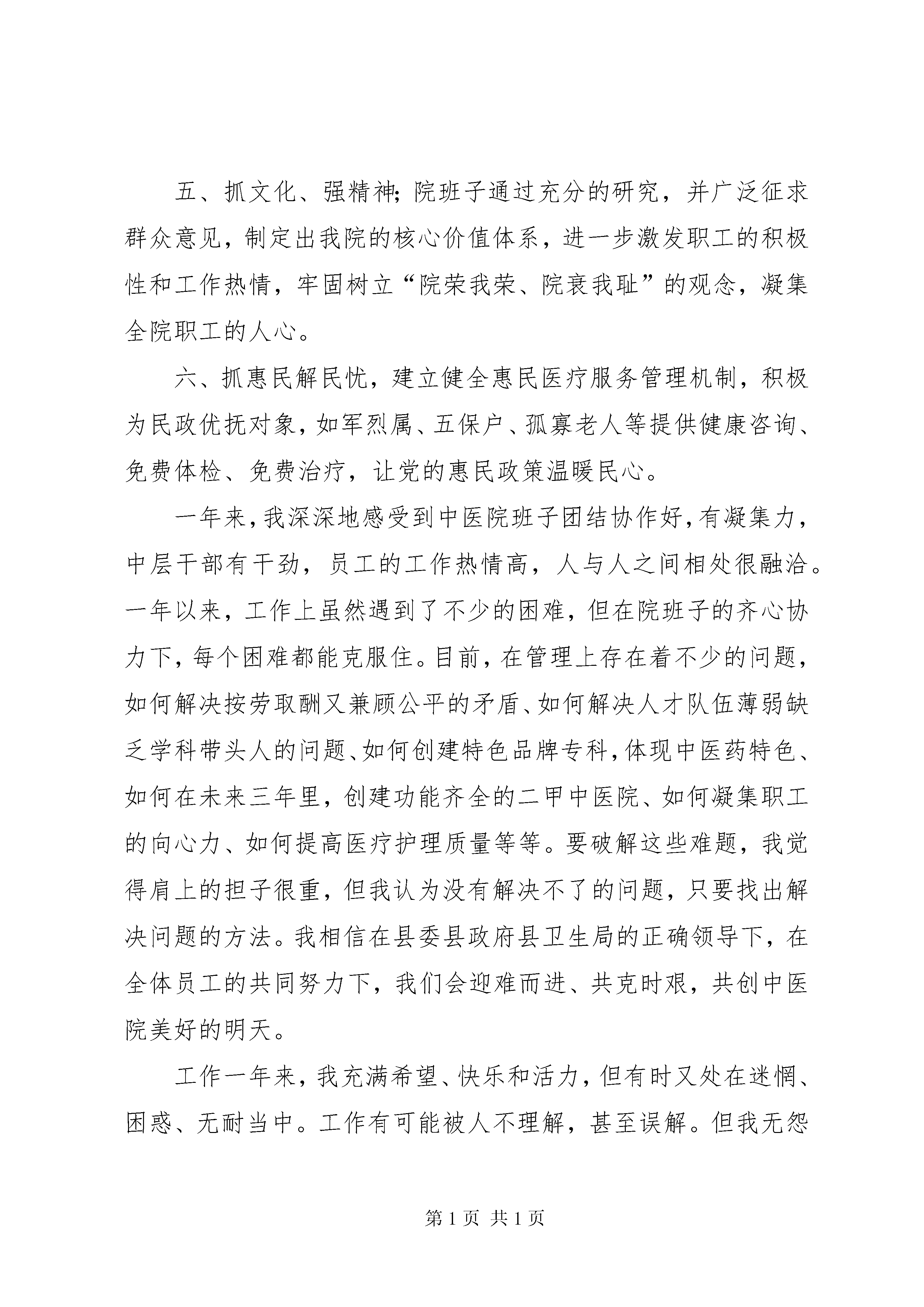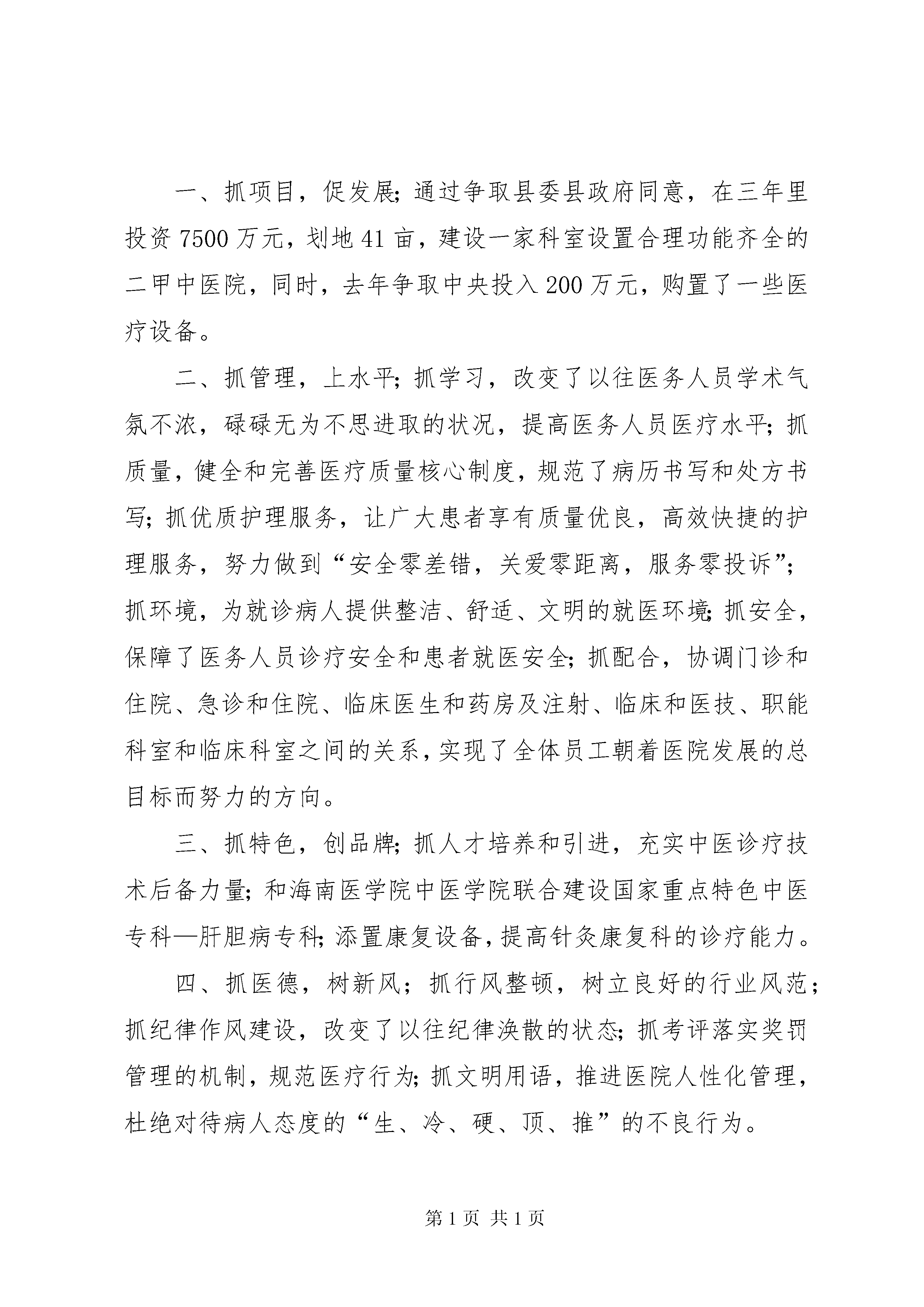 医院院长工作汇报向长医院院长工作感想2011年6月21日上午,在县委组织部常务副部长林xx的带领下我到xx县中医院报到,在县中医院多功能会议厅里,我做了以下几点简短的就职发言:一、感谢县委县政府对我的信任,任命我为县中医院的院长。二、感谢自1988年以来历届院班子为中医院的发展所作出的贡献,尤其是李百良院长八年来为中医院的发展呕心沥血以及辛勤的付出,把中医院建设成为一家初具规模的功能齐全的县级中医院。三、希望中医院全体员工在新一届院班子的领导下,继续团结协作、同舟共济,为医院的发展奉献自己的智慧和汗水。四、我会时刻牢记使命,虚心学习、恪尽职守、廉洁勤政,为医院的可持续发展奉献自己的力量。回顾过去,一年的历程、一年的艰辛、一年的发展、我们共同见证了医院的波澜起伏。在发展目标上坚持“中西医并重,中医特色突出,互相补充”的方针,以提高中医药学术水平和防病治病能力为主线,以科技创新和深化改革为动力,在未来五年建立起布局合理、功能完善、技术先进、竞争有序、服务便捷高效的创新型二甲中医医院。一年来,通过六抓,取得了六个明显改变。一、抓项目,促发展;通过争取县委县政府同意,在三年里投资7500万元,划地41亩,建设一家科室设置合理功能齐全的二甲中医院,同时,去年争取中央投入200万元,购置了一些医疗设备。二、抓管理,上水平;抓学习,改变了以往医务人员学术气氛不浓,碌碌无为不思进取的状况,提高医务人员医疗水平;抓质量,健全和完善医疗质量核心制度,规范了病历书写和处方书写;抓优质护理服务,让广大患者享有质量优良,高效快捷的护理服务,努力做到“安全零差错,关爱零距离,服务零投诉”;抓环境,为就诊病人提供整洁、舒适、文明的就医环境;抓安全,保障了医务人员诊疗安全和患者就医安全;抓配合,协调门诊和住院、急诊和住院、临床医生和药房及注射、临床和医技、职能科室和临床科室之间的关系,实现了全体员工朝着医院发展的总目标而努力的方向。三、抓特色,创品牌;抓人才培养和引进,充实中医诊疗技术后备力量;和海南医学院中医学院联合建设国家重点特色中医专科—肝胆病专科;添置康复设备,提高针灸康复科的诊疗能力。四、抓医德,树新风;抓行风整顿,树立良好的行业风范;抓纪律作风建设,改变了以往纪律涣散的状态;抓考评落实奖罚管理的机制,规范医疗行为;抓文明用语,推进医院人性化管理,杜绝对待病人态度的“生、冷、硬、顶、推”的不良行为。五、抓文化、强精神;院班子通过充分的研究,并广泛征求群众意见,制定出我院的核心价值体系,进一步激发职工的积极性和工作热情,牢固树立“院荣我荣、院衰我耻”的观念,凝集全院职工的人心。六、抓惠民解民忧,建立健全惠民医疗服务管理机制,积极为民政优抚对象,如军烈属、五保户、孤寡老人等提供健康咨询、免费体检、免费治疗,让党的惠民政策温暖民心。一年来,我深深地感受到中医院班子团结协作好,有凝集力,中层干部有干劲,员工的工作热情高,人与人之间相处很融洽。一年以来,工作上虽然遇到了不少的困难,但在院班子的齐心协力下,每个困难都能克服住。目前,在管理上存在着不少的问题,如何解决按劳取酬又兼顾公平的矛盾、如何解决人才队伍薄弱缺乏学科带头人的问题、如何创建特色品牌专科,体现中医药特色、如何在未来三年里,创建功能齐全的二甲中医院、如何凝集职工的向心力、如何提高医疗护理质量等等。要破解这些难题,我觉得肩上的担子很重,但我认为没有解决不了的问题,只要找出解决问题的方法。我相信在县委县政府县卫生局的正确领导下,在全体员工的共同努力下,我们会迎难而进、共克时艰,共创中医院美好的明天。工作一年来,我充满希望、快乐和活力,但有时又处在迷惘、困惑、无耐当中。工作有可能被人不理解,甚至误解。但我无怨无悔,始终以一颗感恩和赤诚的心为中医院的发展、为中医院人的幸福,奉献我的一份热忱。生活像是一部剧本,喜怒哀乐的角色任人去演绎,有时演的是无尽的喜悦、有时演的是深沉的伤感。然而,当我们全心全意地去演绎那一刻、那一时、那一事时,才真正体会到其中的酸甜苦辣。当这部剧本谢幕之时,那一阵阵热烈的掌声,带给我们的是一种前所未有的喜悦。