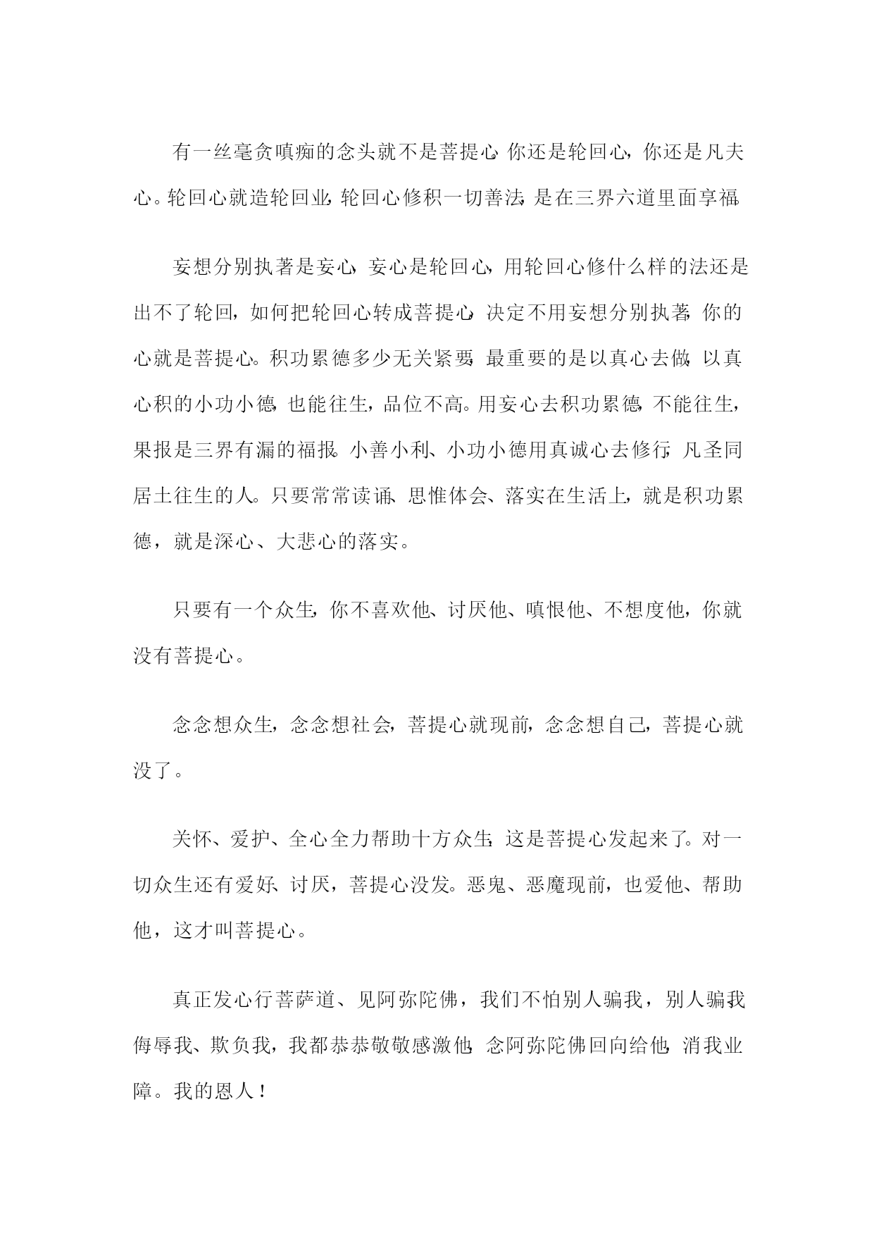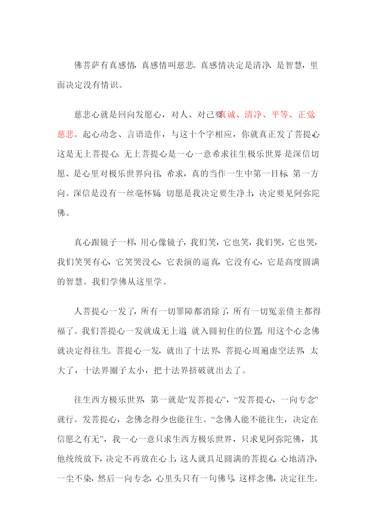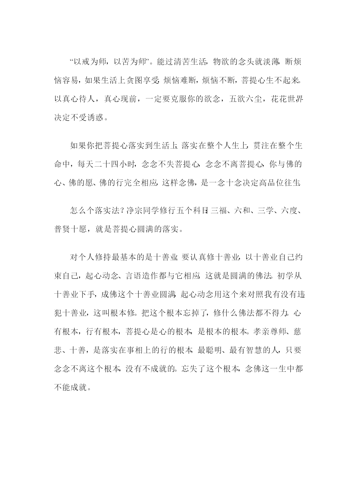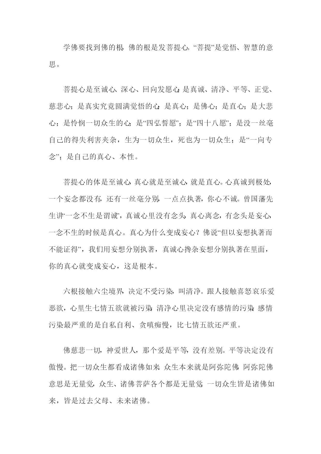 学佛要找到佛的根,佛的根是发菩提心。“菩提”是觉悟、智慧的意思。菩提心是至诚心、深心、回向发愿心;是真诚、清净、平等、正觉、慈悲心;是真实究竟圆满觉悟的心;是真心;是佛心;是直心;是大悲心;是怜悯一切众生的心;是“四弘誓愿”;是“四十八愿”;是没一丝毫自己的得失利害夹杂,生为一切众生,死也为一切众生;是“一向专念”;是自己的真心、本性。菩提心的体是至诚心,真心就是至诚心,就是直心。心真诚到极处,一个妄念都没有,还有一丝毫分别,一点点执著,你心不诚。曾国藩先生讲“一念不生是谓诚”,真诚心里没有念头,真心离念,有念头是妄心,一念不生的时候是真心。真心为什么变成妄心?佛说“但以妄想执著而不能证得”,我们用妄想分别执著,真诚心搀杂妄想分别执著在里面,你的真心就变成妄心,这是根本。六根接触六尘境界,决定不受污染,叫清净。跟人接触喜怒哀乐爱恶欲,心里生七情五欲就被污染,清净心里决定没有感情的污染,感情污染最严重的是自私自利、贪嗔痴慢,比七情五欲还严重。佛慈悲一切,神爱世人,那个爱是平等,没有差别。平等决定没有傲慢。把一切众生都看成诸佛如来。众生本来就是阿弥陀佛,阿弥陀佛意思是无量觉,众生、诸佛菩萨各个都是无量觉,一切众生皆是诸佛如来,皆是过去父母、未来诸佛。佛菩萨有真感情,真感情叫慈悲。真感情决定是清净、是智慧,里面决定没有情识。慈悲心就是回向发愿心,对人、对己要真诚、清净、平等、正觉、慈悲。起心动念、言语造作,与这十个字相应,你就真正发了菩提心,这是无上菩提心。无上菩提心是一心一意希求往生极乐世界、是深信切愿、是心里对极乐世界向往、希求,真的当作一生中第一目标、第一方向。深信是没有一丝毫怀疑,切愿是我决定要生净土,决定要见阿弥陀佛。真心跟镜子一样,用心像镜子,我们笑,它也笑,我们哭,它也哭,我们笑哭有心,它笑哭没心,它表演的逼真,它没有心,它是高度圆满的智慧。我们学佛从这里学。人菩提心一发了,所有一切罪障都消除了,所有一切冤亲债主都得福了。我们菩提心一发就成无上道,就入圆初住的位置,用这个心念佛就决定得往生。菩提心一发,就出了十法界,菩提心周遍虚空法界,太大了,十法界圈子太小,把十法界挤破就出去了。往生西方极乐世界,第一就是“发菩提心”,“发菩提心,一向专念”就行。发菩提心,念佛念得少也能往生。“念佛人能不能往生,决定在信愿之有无”,我一心一意只求生西方极乐世界,只求见阿弥陀佛,其他统统放下,决定不再放在心上,这人就具足圆满的菩提心。心地清净,一尘不染,然后一向专念,心里头只有一句佛号,这样念佛,决定往生。有一丝毫贪嗔痴的念头就不是菩提心。你还是轮回心,你还是凡夫心。轮回心就造轮回业,轮回心修积一切善法,是在三界六道里面享福。妄想分别执著是妄心,妄心是轮回心,用轮回心修什么样的法还是出不了轮回,如何把轮回心转成菩提心,决定不用妄想分别执著,你的心就是菩提心。积功累德多少无关紧要,最重要的是以真心去做,以真心积的小功小德,也能往生,品位不高。用妄心去积功累德,不能往生,果报是三界有漏的福报。小善小利、小功小德用真诚心去修行,凡圣同居土往生的人。只要常常读诵、思惟体会、落实在生活上,就是积功累德,就是深心、大悲心的落实。只要有一个众生,你不喜欢他、讨厌他、嗔恨他、不想度他,你就没有菩提心。念念想众生,念念想社会,菩提心就现前,念念想自己,菩提心就没了。关怀、爱护、全心全力帮助十方众生,这是菩提心发起来了。对一切众生还有爱好、讨厌,菩提心没发。恶鬼、恶魔现前,也爱他、帮助他,这才叫菩提心。真正发心行菩萨道、见阿弥陀佛,我们不怕别人骗我,别人骗我、侮辱我、欺负我,我都恭恭敬敬感激他,念阿弥陀佛回向给他,消我业障。我的恩人!“以戒为师,以苦为师”。能过清苦生活,物欲的念头就淡薄,断烦恼容易,如果生活上贪图享受,烦恼难断,烦恼不断,菩提心生不起来。以真心待人,真心现前,一定要克服你的欲念,五欲六尘,花花世界,决定不受诱惑。如果你把菩提心落实到生活上,落实在整个人生上,贯注在整个生命中,每天二十四小时,念念不失菩提心,念念不离菩提心,你与佛的心、佛的愿、佛的行完全相应,这样念佛,是一念十念决定高品位往生。怎么个落实法?净宗同学修行五个科目:三福、六和、三学、六度、普贤十愿,就是菩提心圆满的落实。对个人修持最基本的是十善业。要认真修十善业,以十善业自己约束自己,起心动念、言语造作都与它相应,这就是圆满的佛法。初学从十善业下手,成佛这个十善业圆满,起心动念用这个来对照我有没有违犯十善业,这叫根本修。把这个根本忘掉了,修什么佛法都不得力。心有根本,行有根本,菩提心是心的根本,是根本的根本。孝亲尊师、慈悲、十善,是落实在事相上的行的根本。最聪明、最有智慧的人,只要念念不离这个根本,没有不成就的。忘失了这个根本,念佛这一生中都不能成就。