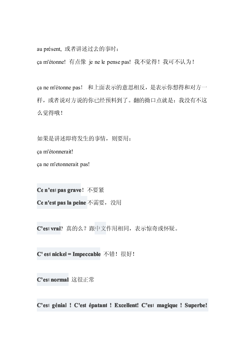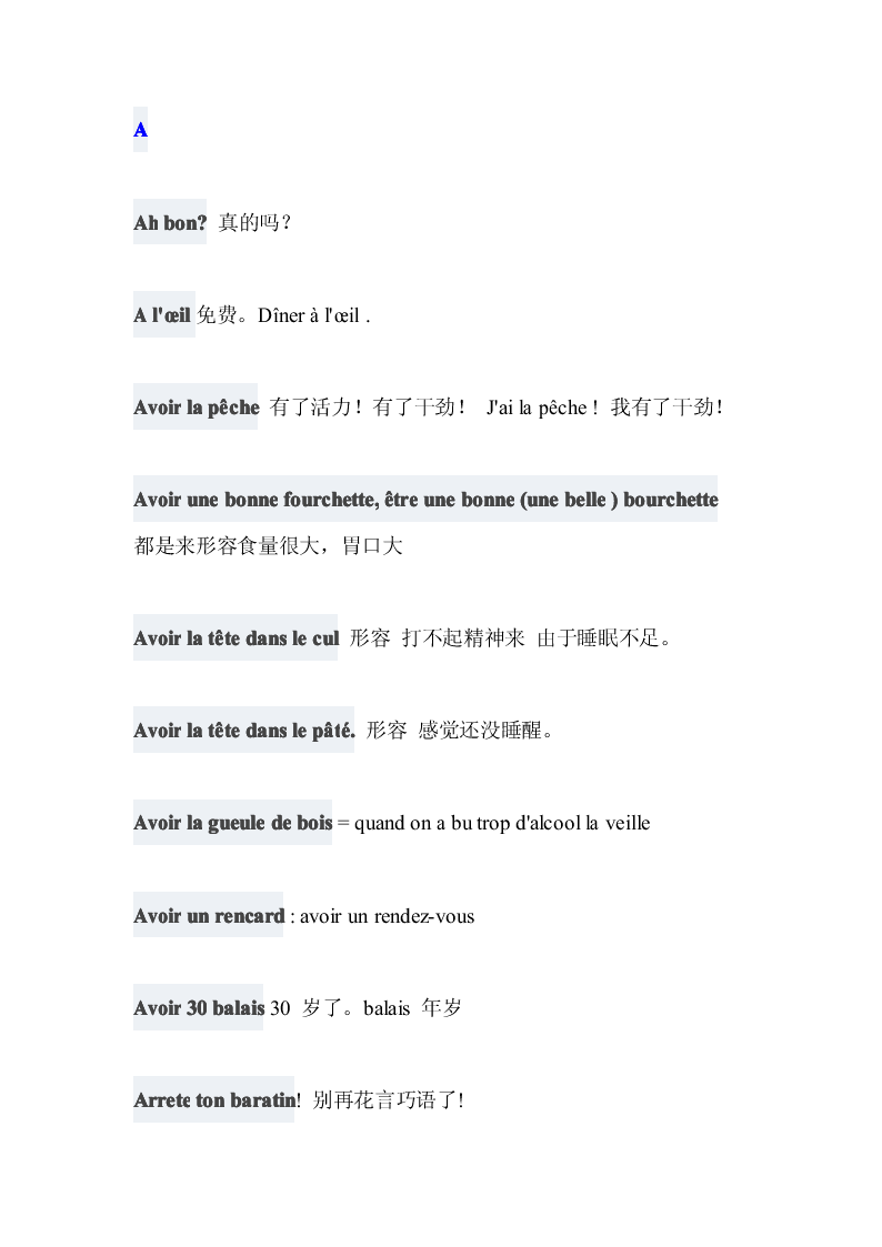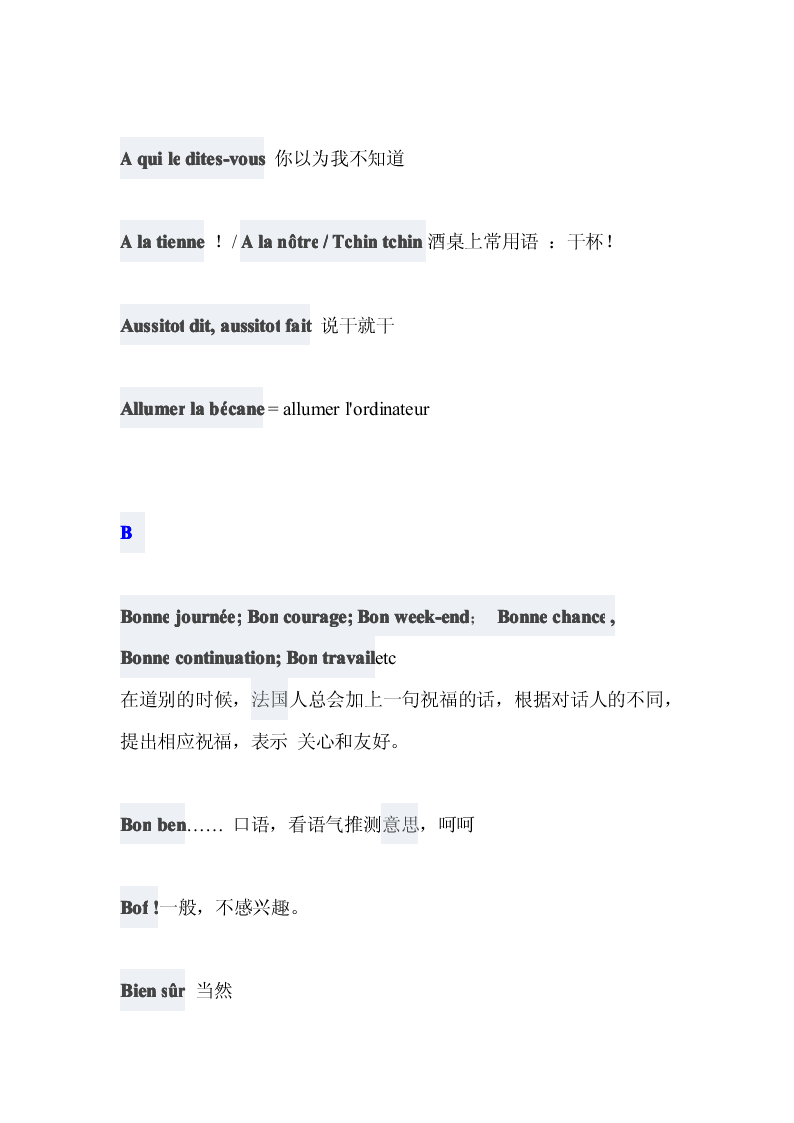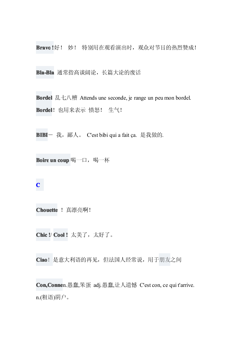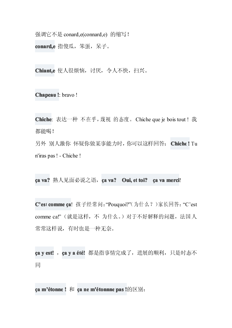A Ahbon?真的吗? Al'œil免费。Dîneràl'œil. Avoirlapêche有了活力!有了干劲!J'ailapêche!我有了干劲! Avoirunebonnefourchette,êtreunebonne(unebelle)bourchette 都是来形容食量很大,胃口大 Avoirlatêtedanslecul形容打不起精神来由于睡眠不足。 Avoirlatêtedanslepâté.形容感觉还没睡醒。 Avoirlagueuledebois=quandonabutropd'alcoollaveille Avoirunrencard:avoirunrendez-vous Avoir30balais30岁了。balais年岁 Arretetonbaratin!别再花言巧语了! Aquiledites-vous你以为我不知道 Alatienne!/Alanôtre/Tchintchin酒桌上常用语:干杯! Aussitotdit,aussitotfait说干就干 Allumerlabécane=allumerl'ordinateur Bw Bonnejournée;Boncourage;Bonweek-end;Bonnechance, Bonnecontinuation;Bontravailetc 在道别的时候,法国人总会加上一句祝福的话,根据对话人的不同, 提出相应祝福,表示关心和友好。 Bonben……口语,看语气推测意思,呵呵 Bof!一般,不感兴趣。 Biensûr当然 Bravo!好!妙!特别用在观看演出时,观众对节目的热烈赞成! Bla-Bla通常指高谈阔论,长篇大论的废话 Bordel乱七八糟Attendsuneseconde,jerangeunpeumonbordel. Bordel!也用来表示愤怒!生气! BIBI-我,鄙人。C'estbibiquiafaitça.是我做的. Boireuncoup喝一口,喝一杯 Cw Chouette!真漂亮啊! Chic!/Cool!太美了,太好了。 Ciao!是意大利语的再见,但法国人经常说,用于朋友之间 Con,Connen.愚蠢,笨蛋adj.愚蠢,让人遗憾C'estcon,cequit'arrive. n.(粗语)阴户。 强调它不是conard,e(connard,e)的缩写! conard,e指傻瓜,笨蛋,呆子。 Chiant,e使人很烦恼,讨厌,令人不快,扫兴。 Chapeau!:bravo! Chiche:表达一种不在乎,蔑视的态度。Chichequejeboistout!我 都能喝! 另外别人激你怀疑你做某事能力时,你可以这样回答:Chiche!Tu n'iraspas!-Chiche! çava?熟人见面必说之语,çava?Oui,ettoi?çavamerci! C’estcommeça!孩子经常问:“Pouquoi?(为什么?)家长回答:”“C’est commeca!”(就是这样,不为什么。)对于不好解释的问题,法国人 常常这样说,有时也是一种无奈。 çayest!,çayaété!都是指事情完成了,进展的顺利,只是时态不 同 çam’étonne!和çanem'étonnnepas!的区别: auprésent,或者讲述过去的事时: çam'étonne!有点像jenelepensepas!我不觉得!我可不认为! çanem'étonnepas!和上面表示的意思相反,是表示你想得和对方一 样,或者说对方说的你已经预料到了。翻的拗口点就是:我没有不这 么觉得哦! 如果是讲述即将发生的事情,则要用: çam'étonnerait! çanem'etonneraitpas! Cen’estpasgrave!不要紧 Cen'estpaslapeine不需要,没用 C’estvrai?真的么?跟中文作用相同,表示惊奇或怀疑。 C'estnickel=Impeccable不错!很好! C’estnormal这很正常 C’estgénial!C'estépatant!Excellent!C’estmagique!Superbe! Bravo!一系列用与吹捧的词。 C’estterrible!是说“确实不咋样”直译"太可怕了!"但是法国人更喜 欢用这句表达相反的意思,就是"太棒了!"加个否定词就是"不怎么样 ". C'estàsetordre真笑死人。 C'estmarrant...,C'estrigolo...滑稽的,好