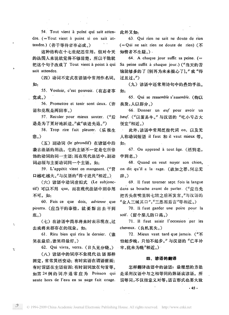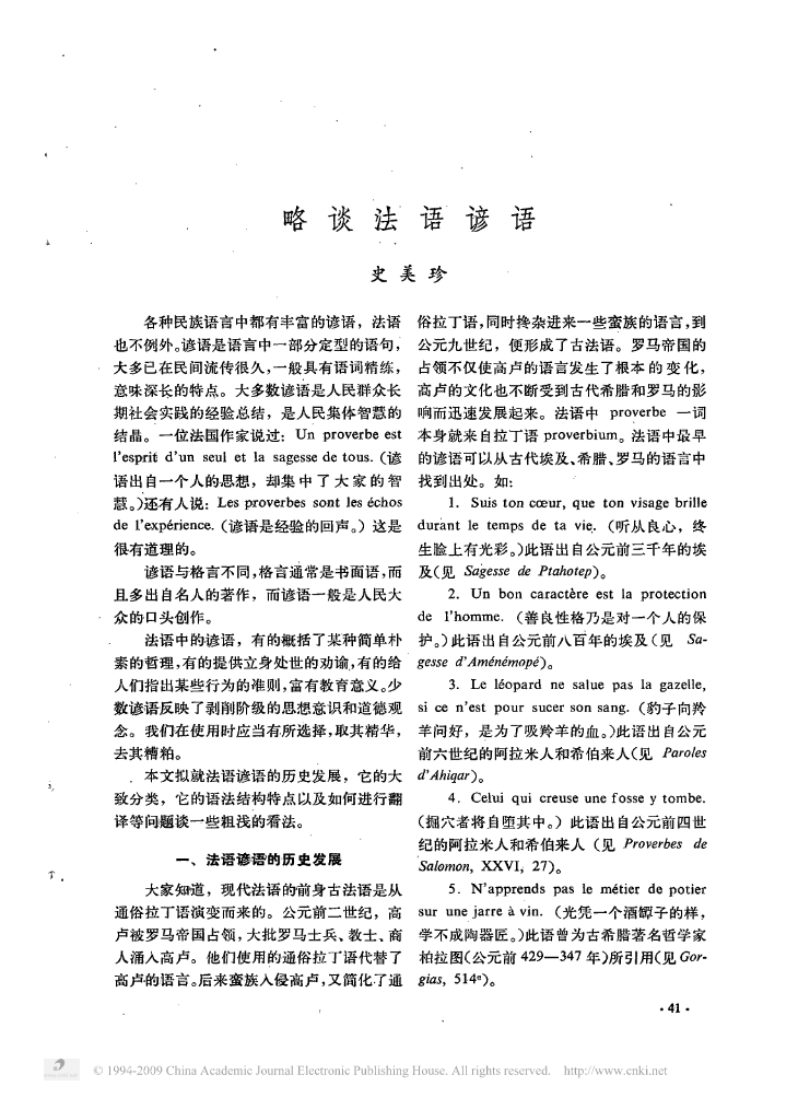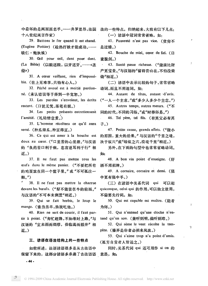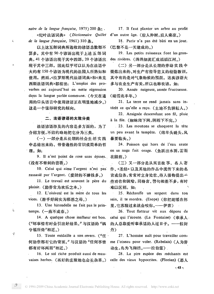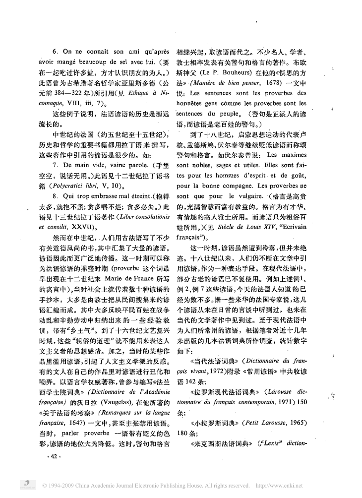’一 略谈法语谚语 史美珍 各种民族语言中都有丰富的谚语,法语俗拉丁语,同时搀杂进来一些蛮族的语言,到 也不例外。谚语是语言中一部分定型的语句,公元九世纪,便形成了古法语。罗马帝国的 大多已在民间流传很久,一般具有语词精练,占领不仅使高卢的语言发生了根本的变化, 意味深长的特点。大多数谚语是人民群众长高卢的文化也不断受到古代希腊和罗马的影 期社会实践的经验总结,是人民集体智慧的响而迅速发展起来。法语中一词 结晶。一位法国作家说过本身就来自拉丁语。法语中最早 ,印,谚的谚语可以从古代埃及、希腊、罗马的语言中 语出自一个人的思想,却集中了大家的智找到出处。如 慧。还有人说少‘比, ’谚语是经验的回声。这是峨听从良心,终 很有道理的。生脸上有光彩。此语出自公元前三千年的埃 谚语与格言不同,格言通常是书面语,而及见孔印。 且多出自名人的著作,而谚语一般是人民大己 众的口头创作。善良性格乃是对一个人的保 法语中的谚语,有的概括了某种简单朴护。此语出自公元前八百年的埃及见 素的哲理,有的提供立身处世的劝谕,有的给“’勿鲡约。 人们指出某些行为的准则,富有教育意义。少峪, 数谚语反映了剥削阶级的思想意识和道德观,豹子向羚 念。我们在使用时应当有所选择,取其精华,羊问好,是为了吸羚羊的血。此语出自公元 去其糟粕。前六世纪的阿拉米人和希伯来人见 本文拟就法语谚语的历史发展,它的大,。 致分类,它的语法结构特点以及如何进行翻 译等问题谈一些粗浅的看法。掘穴者将自堕其中。此语出自公元前四世 纪的阿拉米人和希伯来人见尸口 、 一语的史展,。 法谚语历发勿, 大家知道,现代祛语的前身古法语是从,了 · 通俗拉丁语演变而来的。公元前二世纪,高叙光凭一个酒辉子的样, 卢被罗马帝国占领,大批罗马士兵、教士、商学不成陶器匠。此语曾为古希腊著名哲学家 人涌入高卢。他们使用的通俗拉丁语代替了柏拉图公元前一年所引用见 高卢的语言。后来蛮族入侵高卢,又简化了通,。 ’已相继兴起,取谚语而代之。不少名人、学者、 己要教士相率发表有关警句和格言的著作。布欧 在一起吃过许多盐,方才认识朋友的为人。斯神父,在他的滇思的方 此语曾为古希腊著名哲学家亚里斯多德公法乃夕’刀,一文中 元前一年所引用见说 ,,,。 这些例子说明,法语谚语的历史是源远。警句是正派人的谚 流长的。语,而谚语是老百姓的警句。 中世纪的法国约五世纪至十五世纪,到了十八世纪,启蒙思想运动的代表卢 历史和哲学的重要书籍都用拉丁语来撰写,梭、孟德斯鸿、伏尔泰等继续贬低谚语而称颂 这些著作中引用的谚语是很少的。如警句和格言。如伏尔泰曾说 ,手里, 空空,说话无用。此语见十二世纪拉丁语书’众, 籍,,。刀 抱得二格言是高贵 太多,就抱不紧贪多嚼不烂贪多必失。此的,充满智慧而富有教益的。格言为有才华、 语见十三世纪拉丁语著作动口有情趣的高人雅士所用。而谚语只为粗俗百 ,。姓所用。见户’ 然而在中世纪,人们用古法语写了不少‘刀。 有关道德风尚的书,其中汇集了大量的谚语。这一时期,谚语虽然遭到冷落,但并未绝 谚语因此而更广泛地传播。这一时期可以称迹。十八世纪以来,人们仍不断在文章中引 为法语谚语的鼎盛时期这个词最用谚语,作为一种表达手段。在现代法语中, 早出现在十二世纪末所写部分古老的谚语已不复使用。例如上述例、 的寓言中。当时社会上流传着数十种谚语的例、例这些谚语,今天的法国人知道的已 手抄本,大多是由教士把从民间搜集来的谚经为数不多。据一些来华的法国专家说,这几 语汇编而成。其中大多反映平民百姓在我争个谚语从未在日常的言谈中听到过,也未在 ’ 动乱和辛勤劳动中归纳出来的一些经验教当代的文学著作中见到过。至于现代法语中 训,带有“乡土气刀。到了十六世纪文艺复兴为人们所常用的谚语,根据笔者对近十几年 时期,这些“粗俗的道理刀就不能用来表达人来出版的几本法语词典所作调查,统计数字 文主义者的思想感情。加之,当时的某些作如下 品里滥用谚语,引起了人文主义学派的反感。《当代法语词典》’ 有的文人在自己的作品里对谚语进行丑化和卯’,“,附录《常用谚语》中共收谚 嘲弄。以语言学权威著称,曾参与编写华法兰语条 西学士院词典’而阴《拉罗斯现代法语词典》泳。 户田望’的沃日拉,在他所著的户犷”卫, 《关于法语的考察》‘脚拟“条 。, 户,卯,一文中,甚至主张禁用谚语小拉罗斯词典 当时,一语带有贬义的色条 彩,谚语的地位大为降低。这时,警句和格言《来克西斯法语词典》了” ·。 卯,条 · 《纪叶法语词典》’’’么前人种树,后人乘凉。 ·’· 夕‘,条。冬’‘色 以上这五部词典所选收的谚语总数都不巴黎不是一天建成的。 算多。其中有个谚语出现于上述五部词 · 典,个谚语出现于其中四部,个谚语出已涓涓细流汇成滔