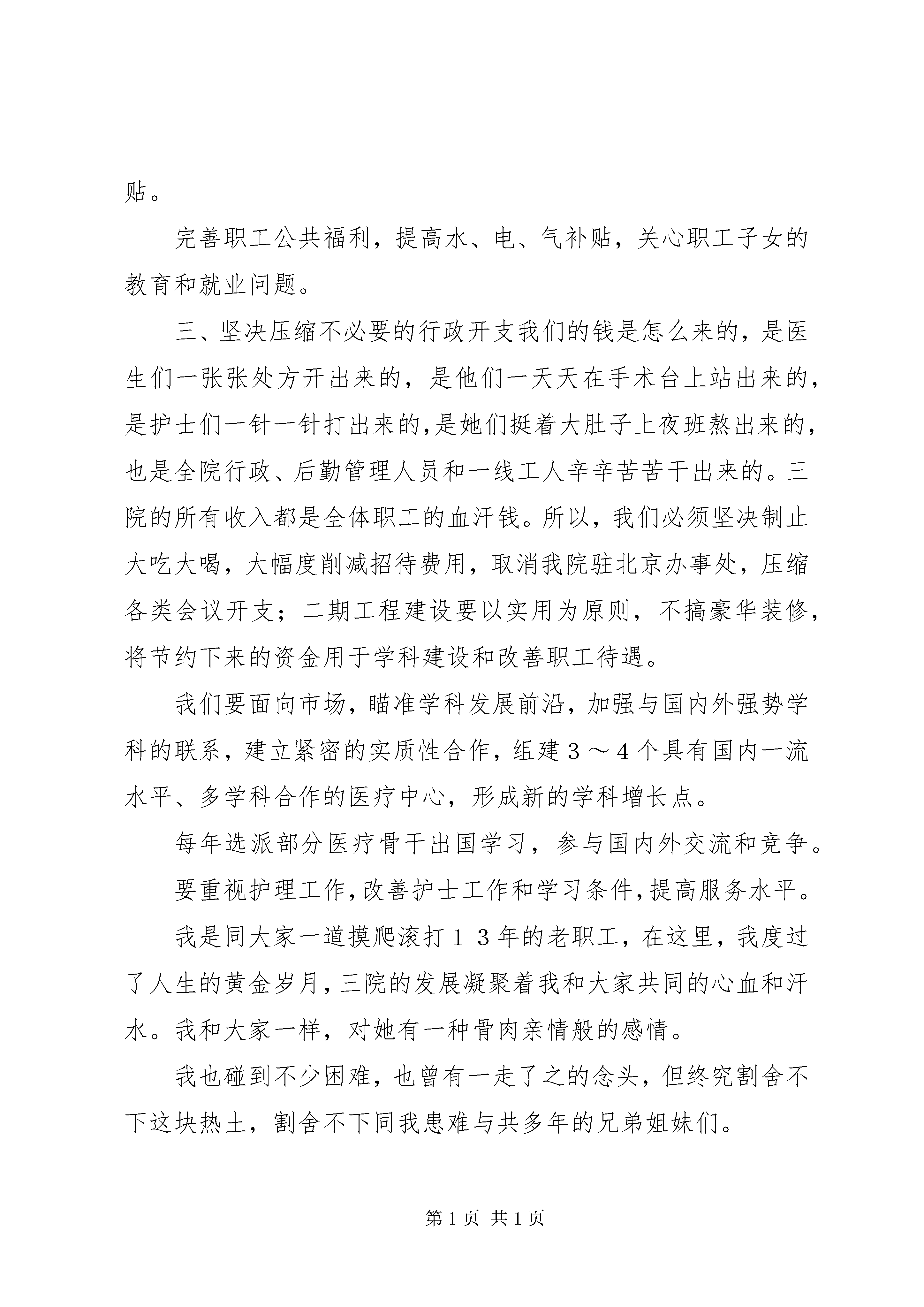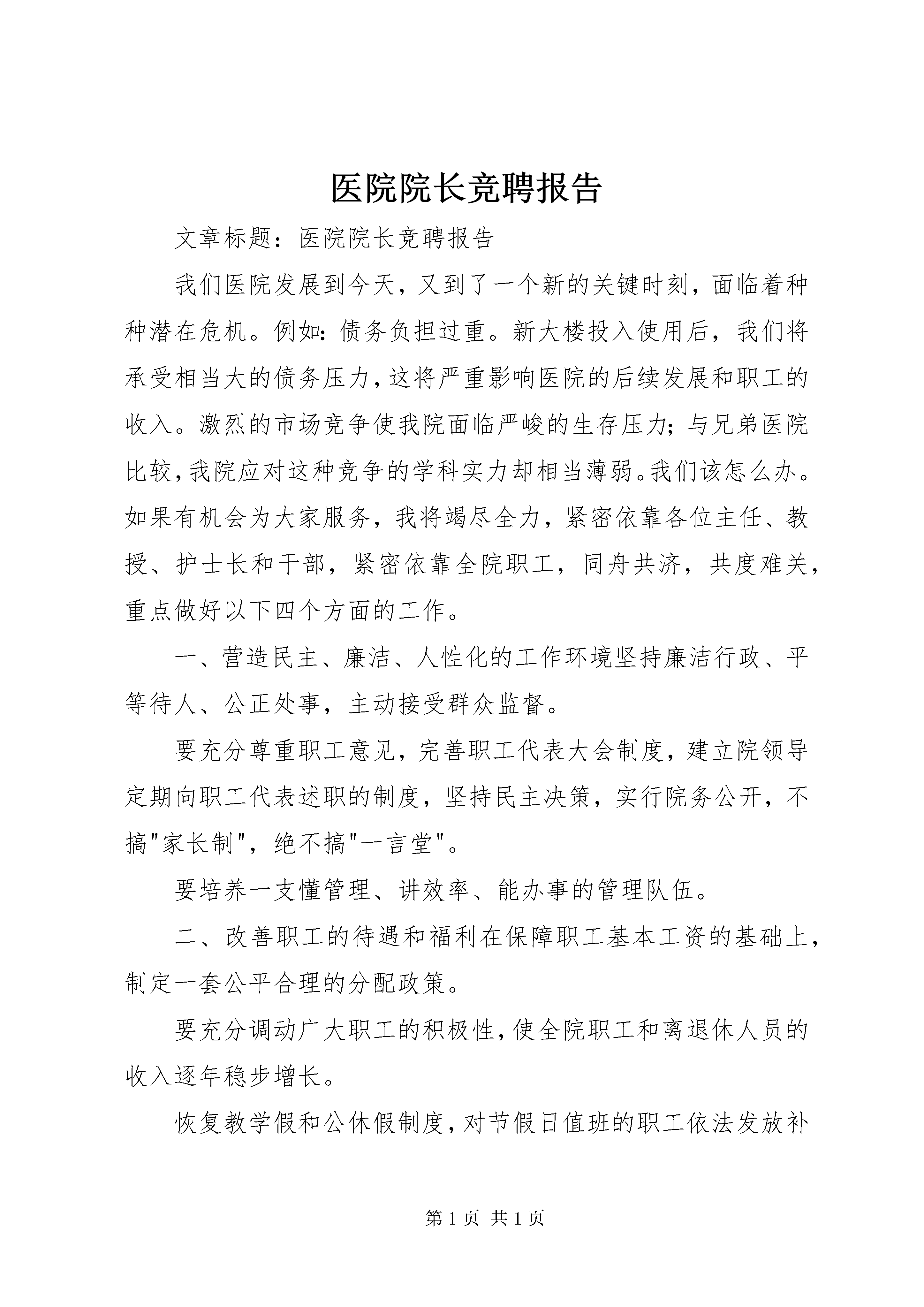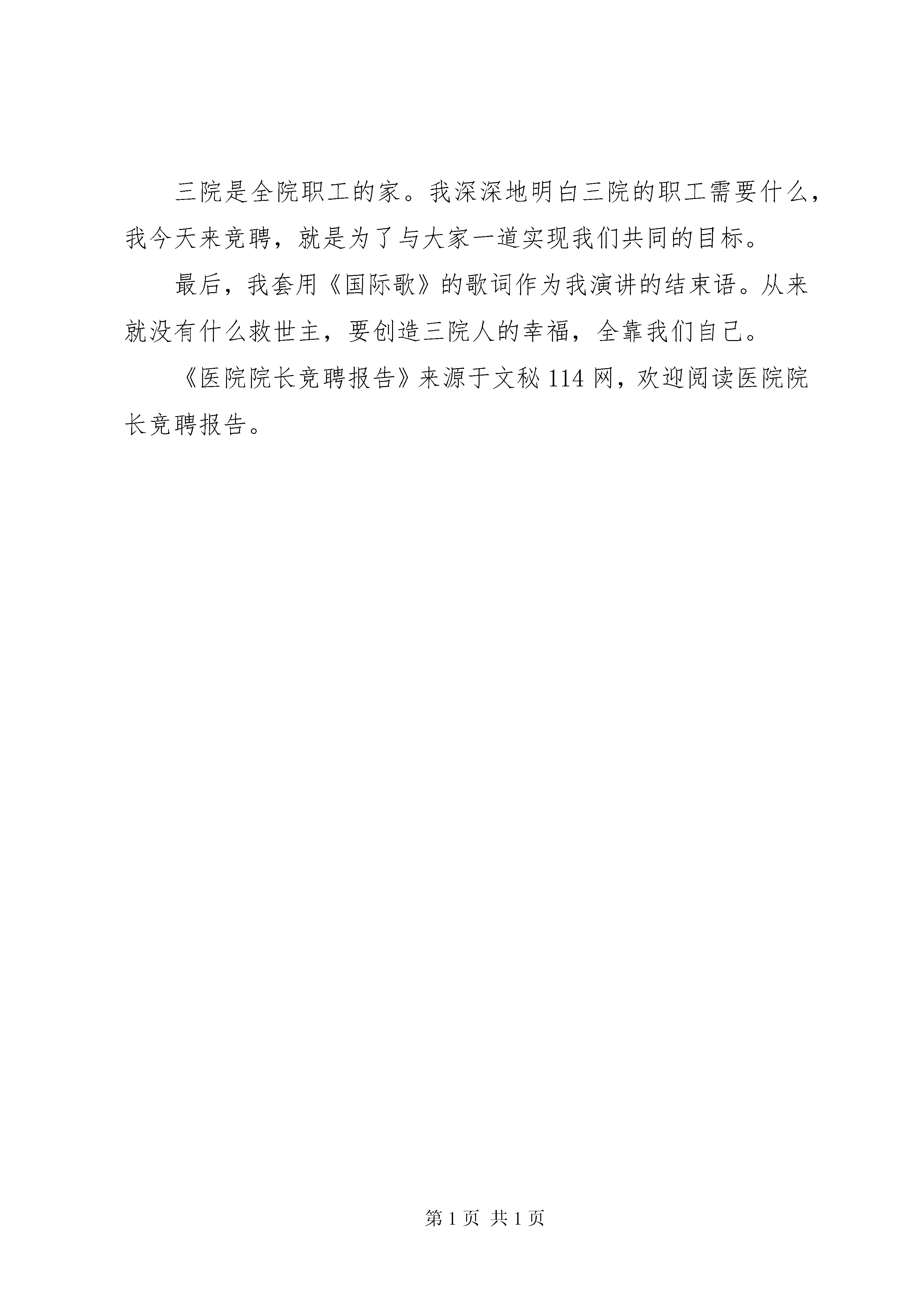 医院院长竞聘报告文章标题:医院院长竞聘报告我们医院发展到今天,又到了一个新的关键时刻,面临着种种潜在危机。例如:债务负担过重。新大楼投入使用后,我们将承受相当大的债务压力,这将严重影响医院的后续发展和职工的收入。激烈的市场竞争使我院面临严峻的生存压力;与兄弟医院比较,我院应对这种竞争的学科实力却相当薄弱。我们该怎么办。如果有机会为大家服务,我将竭尽全力,紧密依靠各位主任、教授、护士长和干部,紧密依靠全院职工,同舟共济,共度难关,重点做好以下四个方面的工作。一、营造民主、廉洁、人性化的工作环境坚持廉洁行政、平等待人、公正处事,主动接受群众监督。要充分尊重职工意见,完善职工代表大会制度,建立院领导定期向职工代表述职的制度,坚持民主决策,实行院务公开,不搞"家长制",绝不搞"一言堂"。要培养一支懂管理、讲效率、能办事的管理队伍。二、改善职工的待遇和福利在保障职工基本工资的基础上,制定一套公平合理的分配政策。要充分调动广大职工的积极性,使全院职工和离退休人员的收入逐年稳步增长。恢复教学假和公休假制度,对节假日值班的职工依法发放补贴。完善职工公共福利,提高水、电、气补贴,关心职工子女的教育和就业问题。三、坚决压缩不必要的行政开支我们的钱是怎么来的,是医生们一张张处方开出来的,是他们一天天在手术台上站出来的,是护士们一针一针打出来的,是她们挺着大肚子上夜班熬出来的,也是全院行政、后勤管理人员和一线工人辛辛苦苦干出来的。三院的所有收入都是全体职工的血汗钱。所以,我们必须坚决制止大吃大喝,大幅度削减招待费用,取消我院驻北京办事处,压缩各类会议开支;二期工程建设要以实用为原则,不搞豪华装修,将节约下来的资金用于学科建设和改善职工待遇。我们要面向市场,瞄准学科发展前沿,加强与国内外强势学科的联系,建立紧密的实质性合作,组建3~4个具有国内一流水平、多学科合作的医疗中心,形成新的学科增长点。每年选派部分医疗骨干出国学习,参与国内外交流和竞争。要重视护理工作,改善护士工作和学习条件,提高服务水平。我是同大家一道摸爬滚打13年的老职工,在这里,我度过了人生的黄金岁月,三院的发展凝聚着我和大家共同的心血和汗水。我和大家一样,对她有一种骨肉亲情般的感情。我也碰到不少困难,也曾有一走了之的念头,但终究割舍不下这块热土,割舍不下同我患难与共多年的兄弟姐妹们。三院是全院职工的家。我深深地明白三院的职工需要什么,我今天来竞聘,就是为了与大家一道实现我们共同的目标。最后,我套用《国际歌》的歌词作为我演讲的结束语。从来就没有什么救世主,要创造三院人的幸福,全靠我们自己。《医院院长竞聘报告》来源于文秘114网,欢迎阅读医院院长竞聘报告。
