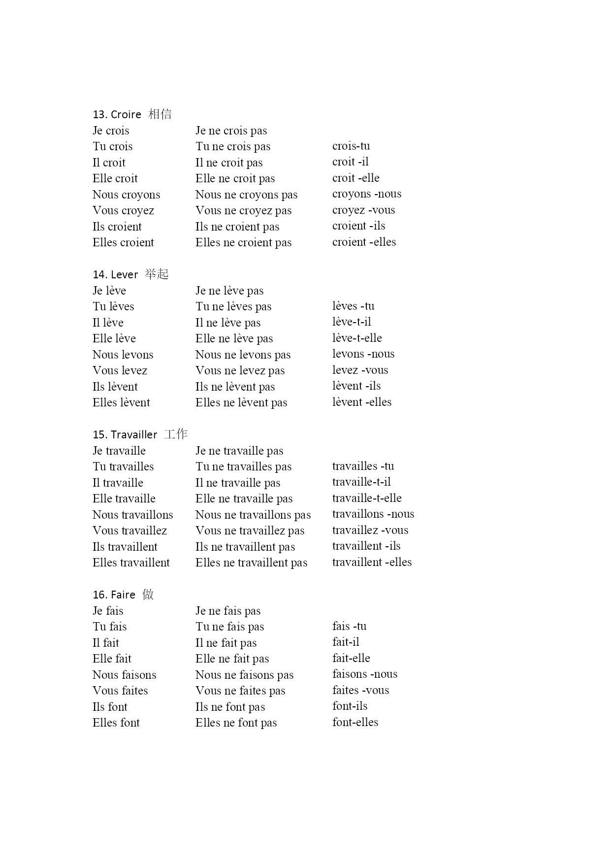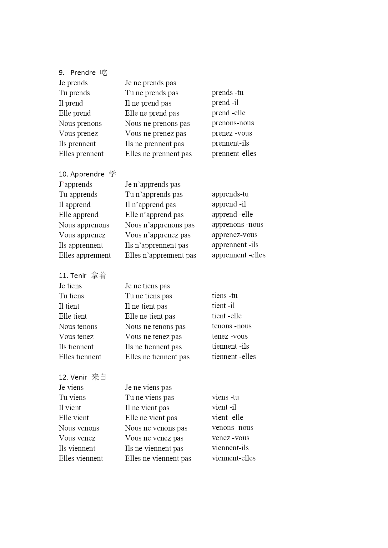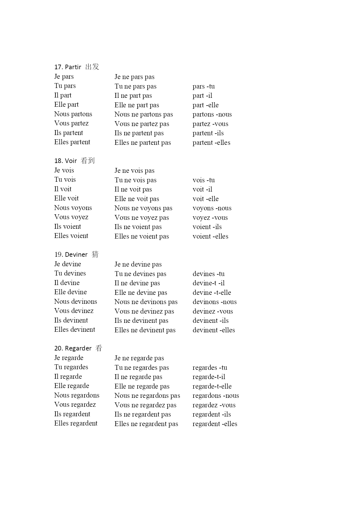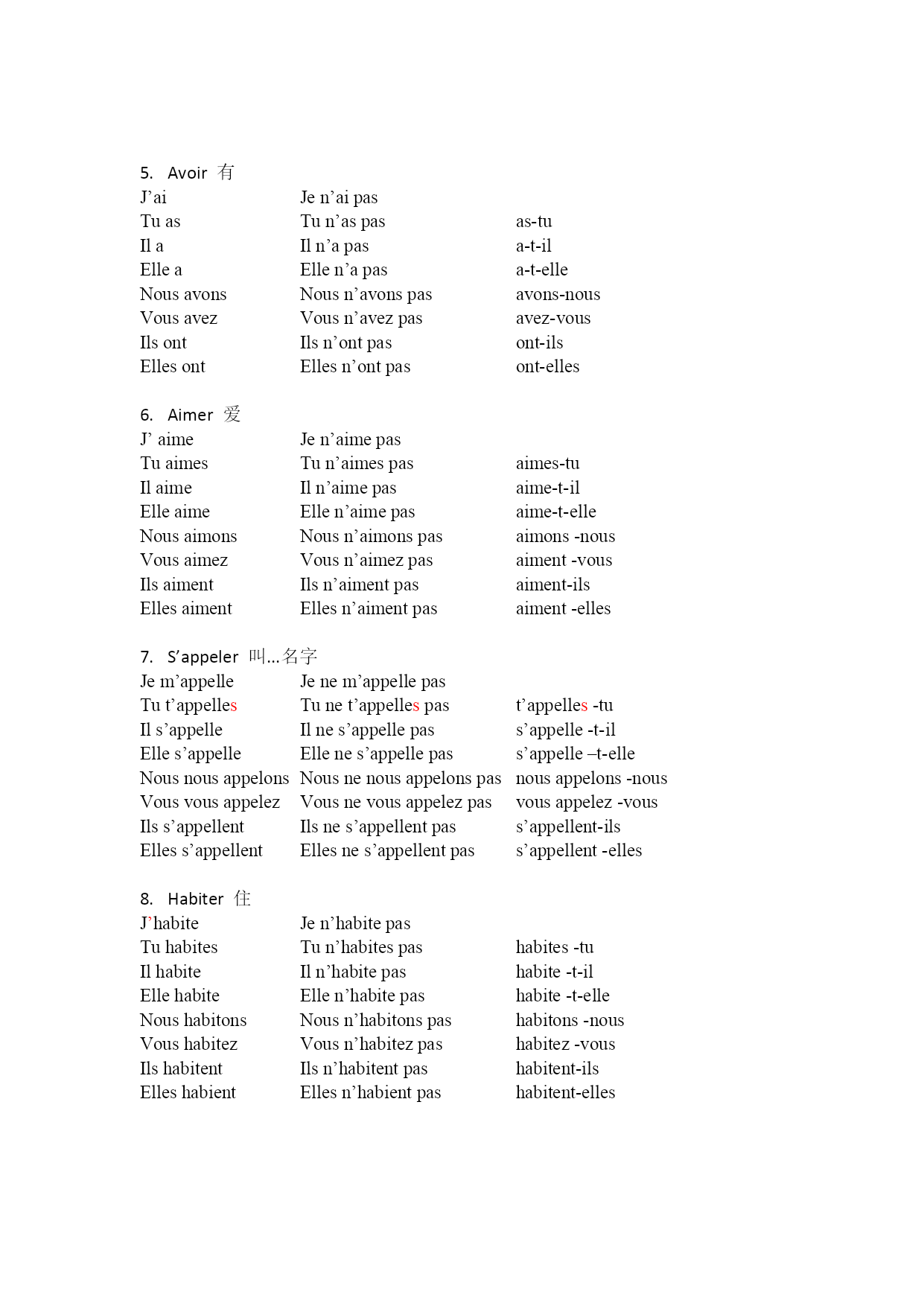 法语总结第一组 一.动词变位 动词的变位、否定和倒装 es-tu est-il est-elle sommes-nous êtes-vous sont-ils sont-elles vas-tu va-t-il va-t-elle allons-nous allez-vous vont-ils vont-elles sais-tu sait-il sait-elle savons-nous savez-vous savent-ils savent-elles présentes-tu présente-t-il présente-t-elle présentons-nous présentez-vous présentent-ils présentent-elles Jenesuispas Tun’espas Iln’estpas Ellen’estpas Nousnesommespas Vousn’êtespas Ilsnesontpas Ellenesontpas Jenevaispas Tunevaspas Ilnevapas Ellenevapas Nousn’allonspas Vousn’allezpas Ilsnevontpas Ellesnevontpas Jenesaispas Tunesaispas Ilnesaitpas Ellenesaitpas Nousnesavonspas Vousnesavezpas Ilsnesaventpas Ellesnesaventpas Jeneprésentepas Tuneprésentespas Ilneprésentepas Elleneprésentepas Nousneprésentonspas Vousneprésentezpas Ilsneprésententpas Ellesneprésententpas Être是 Jesuis Tues Ilest Elleest Noussommes Vousêtes Ilssont Ellesont Aller去 Jevais Tuvas Ilva Elleva Nousallons Vousallez Ilsvont Ellesvont Savoir知道 Jesais Tusais Ilsait Ellesait Noussavons Voussavez Ilssavent Ellessavent Présenter介绍 Jeprésente Tuprésentes Ilprésente Elleprésente Nousprésentons Vousprésentez Ilsprésentent Ellesprésentent as-tu a-t-il a-t-elle avons-nous avez-vous ont-ils ont-elles aimes-tu aime-t-il aime-t-elle aimons-nous aiment-vous aiment-ils aiment-elles t’appelles-tu s’appelle-t-il s’appelle–t-elle nousappelons-nous vousappelez-vous s’appellent-ils s’appellent-elles habites-tu habite-t-il habite-t-elle habitons-nous habitez-vous habitent-ils habitent-elles Jen’aipas Tun’aspas Iln’apas Ellen’apas Nousn’avonspas Vousn’avezpas Ilsn’ontpas Ellesn’ontpas Jen’aimepas Tun’aimespas Iln’aimepas Ellen’aimepas Nousn’aimonspas Vousn’aimezpas Ilsn’aimentpas Ellesn’aimentpas Jenem’appellepas Tunet’appellespas Ilnes’appellepas Ellenes’appellepas Nousnenousappelonspas Vousnevousappelezpas Ilsnes’appellentpas Ellesnes’appellentpas Jen’habitepas Tun’habitespas Iln’habitepas Ellen’habitepas Nousn’habitonspas Vousn’habitezpas Ilsn’habi